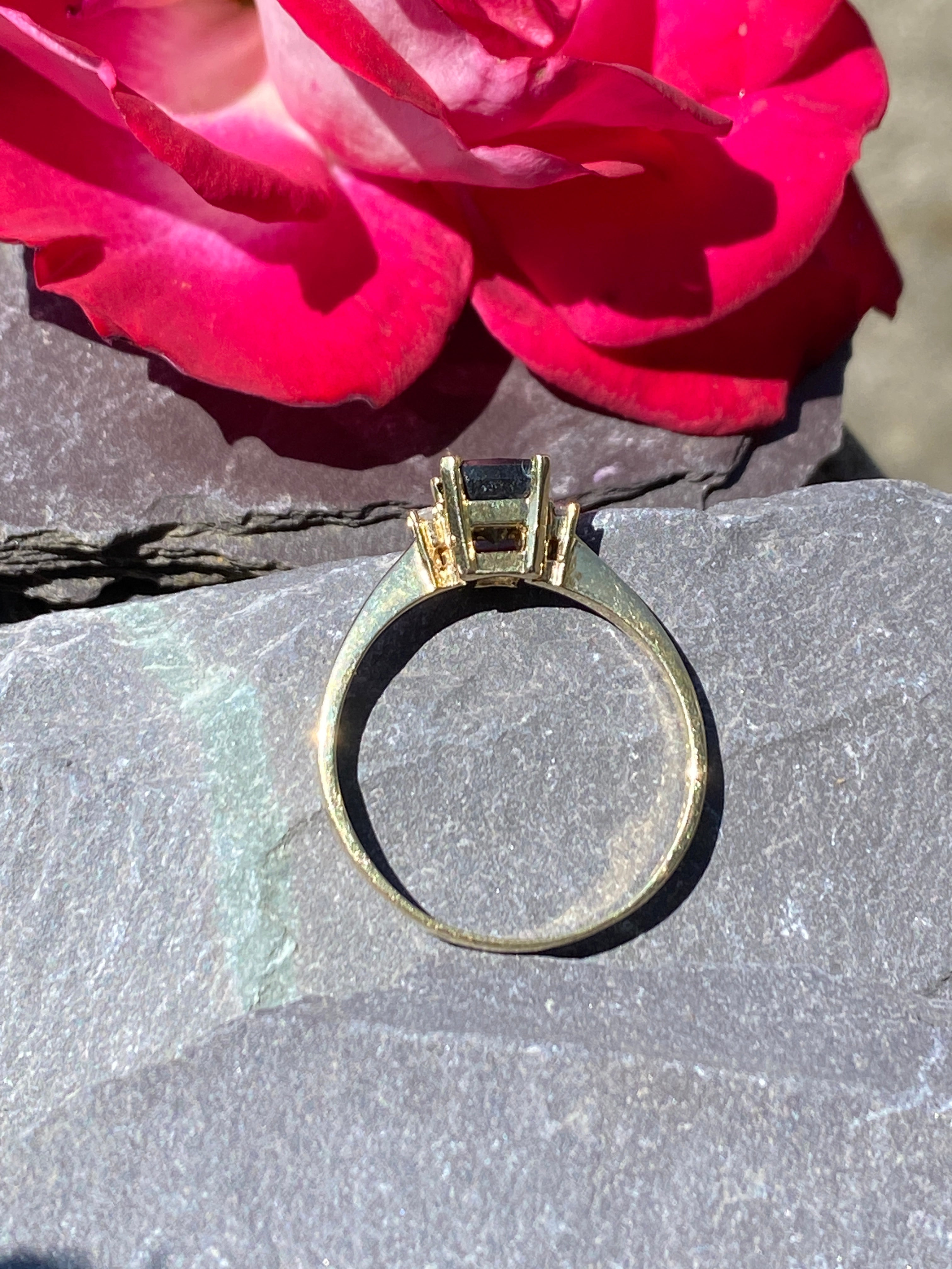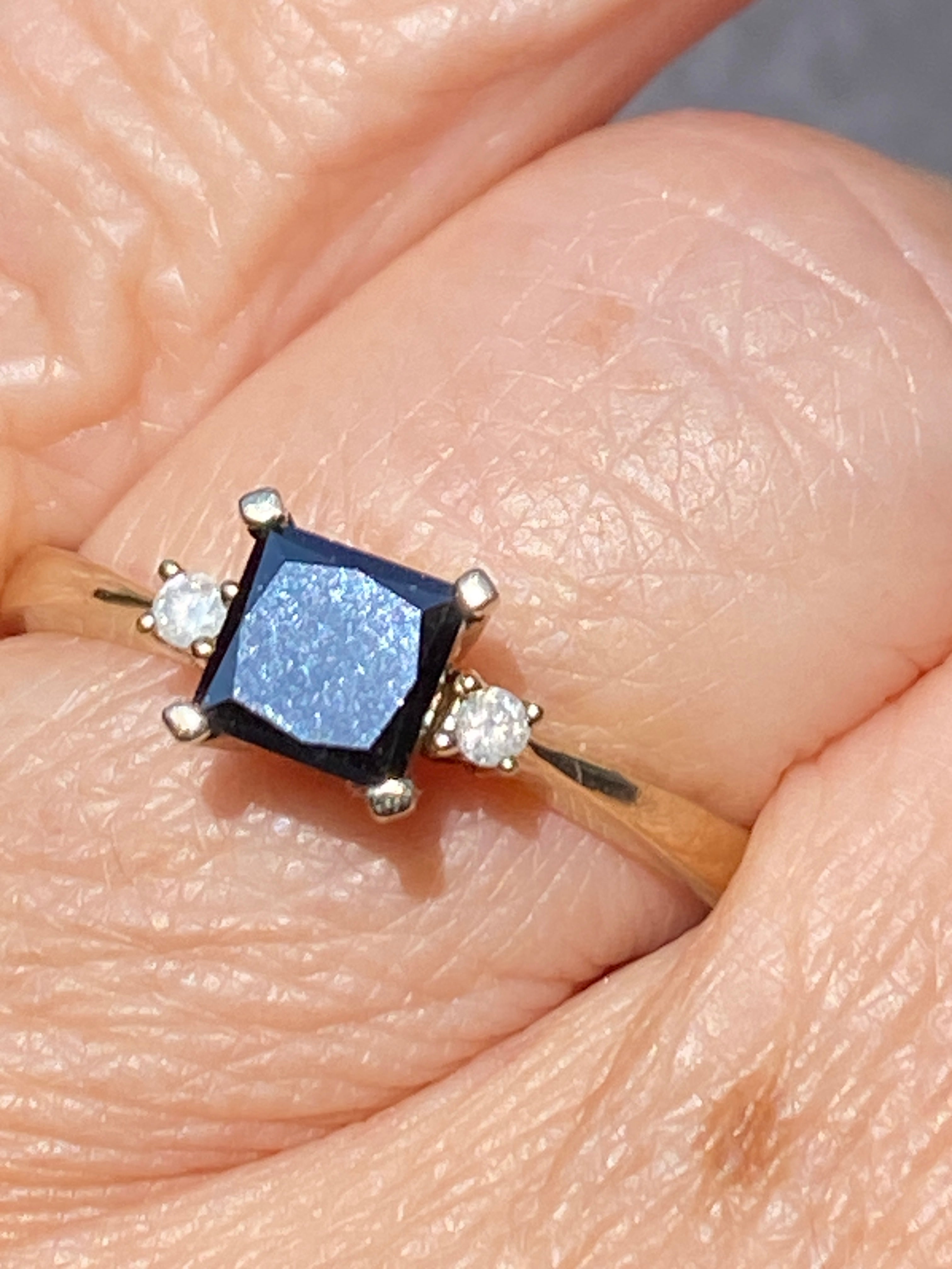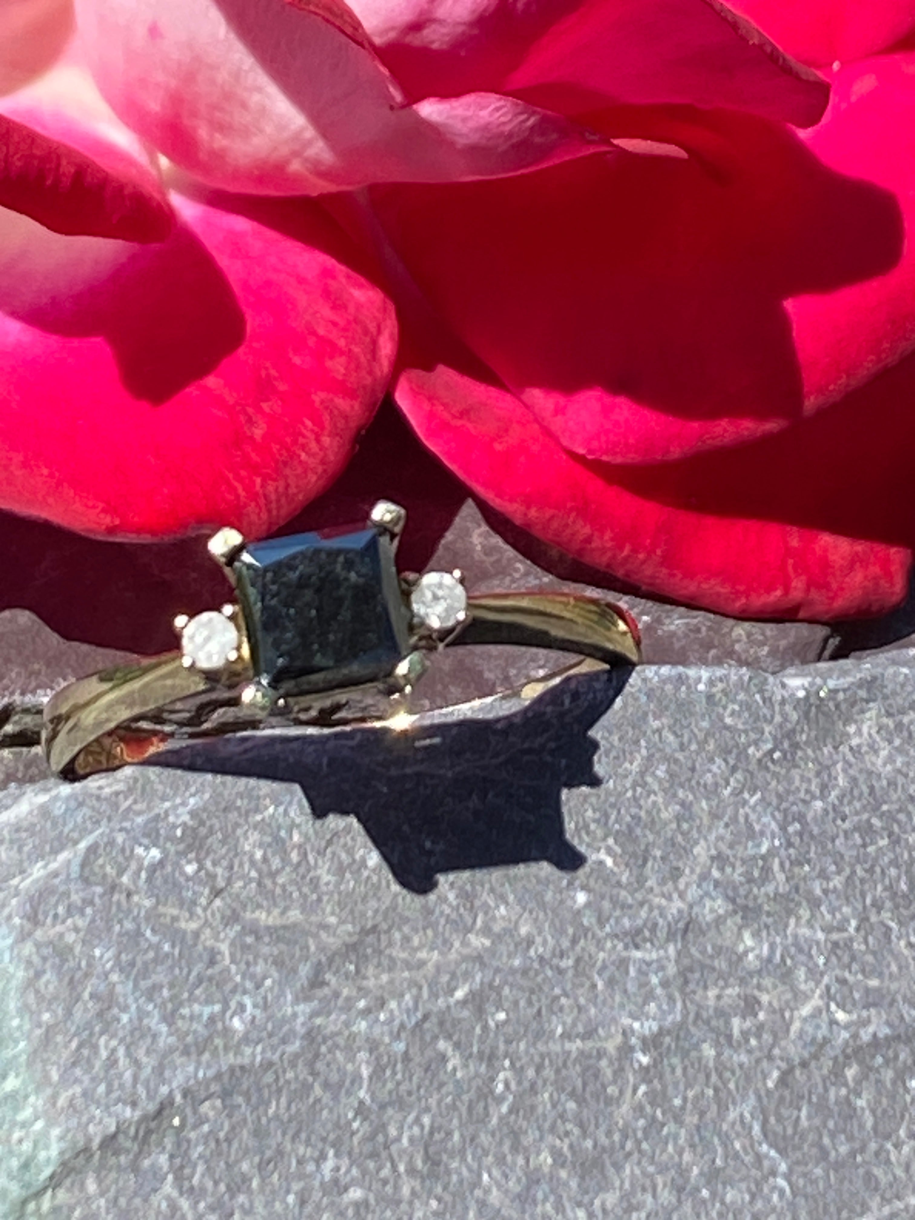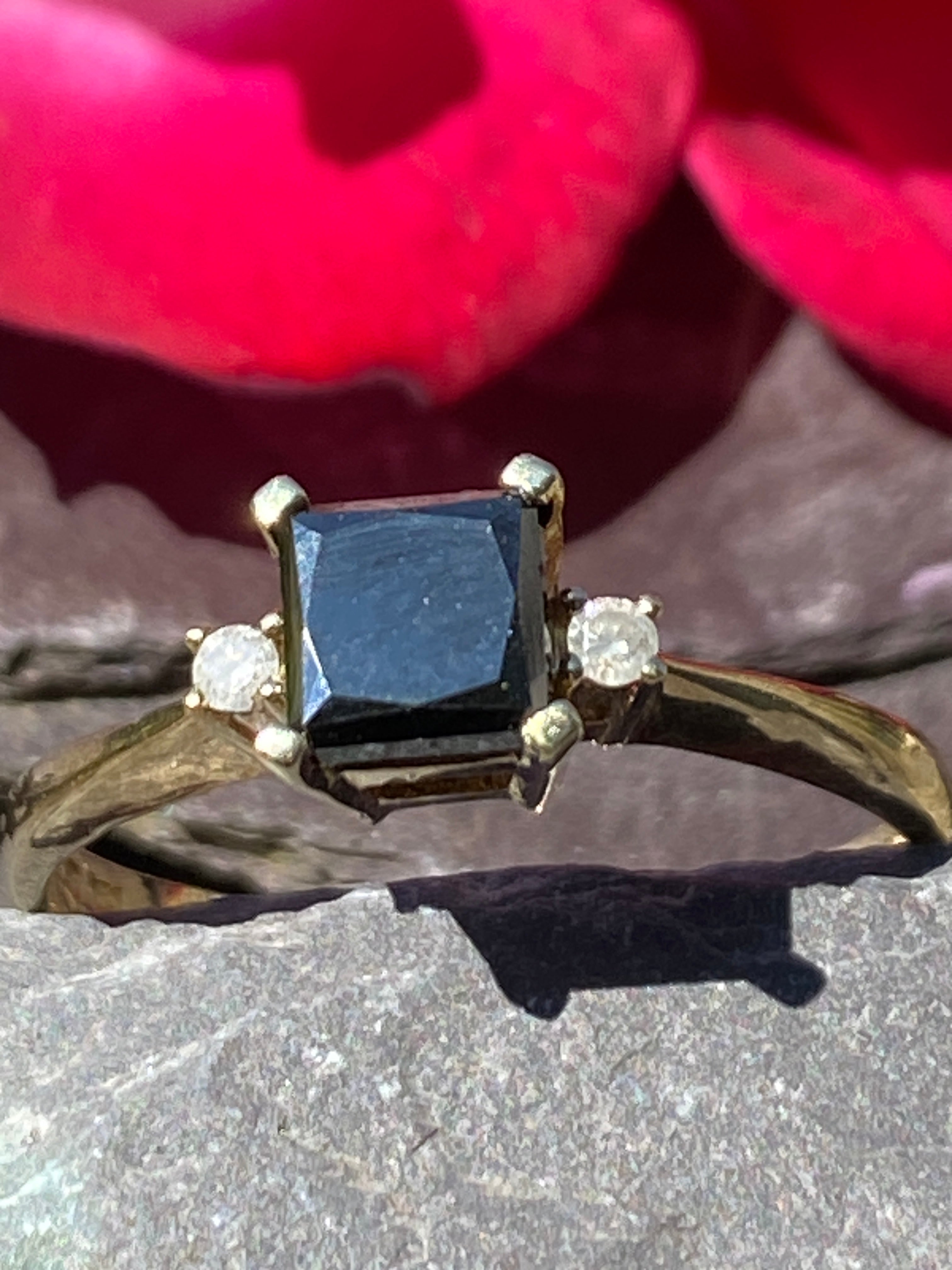 A 9ct Black Diamond Ring Princess Cut Black Diamond With White Diamond Shoulders.