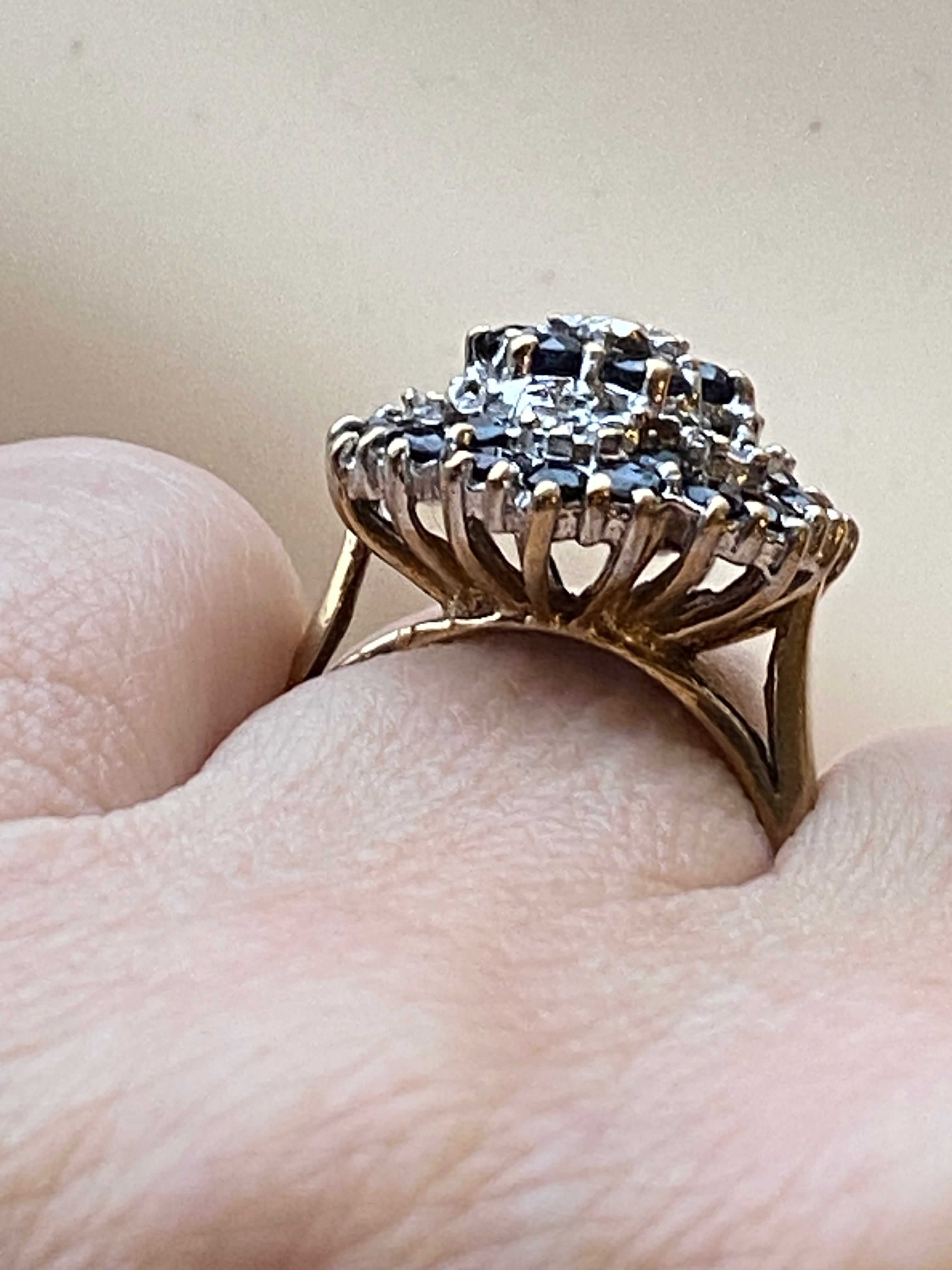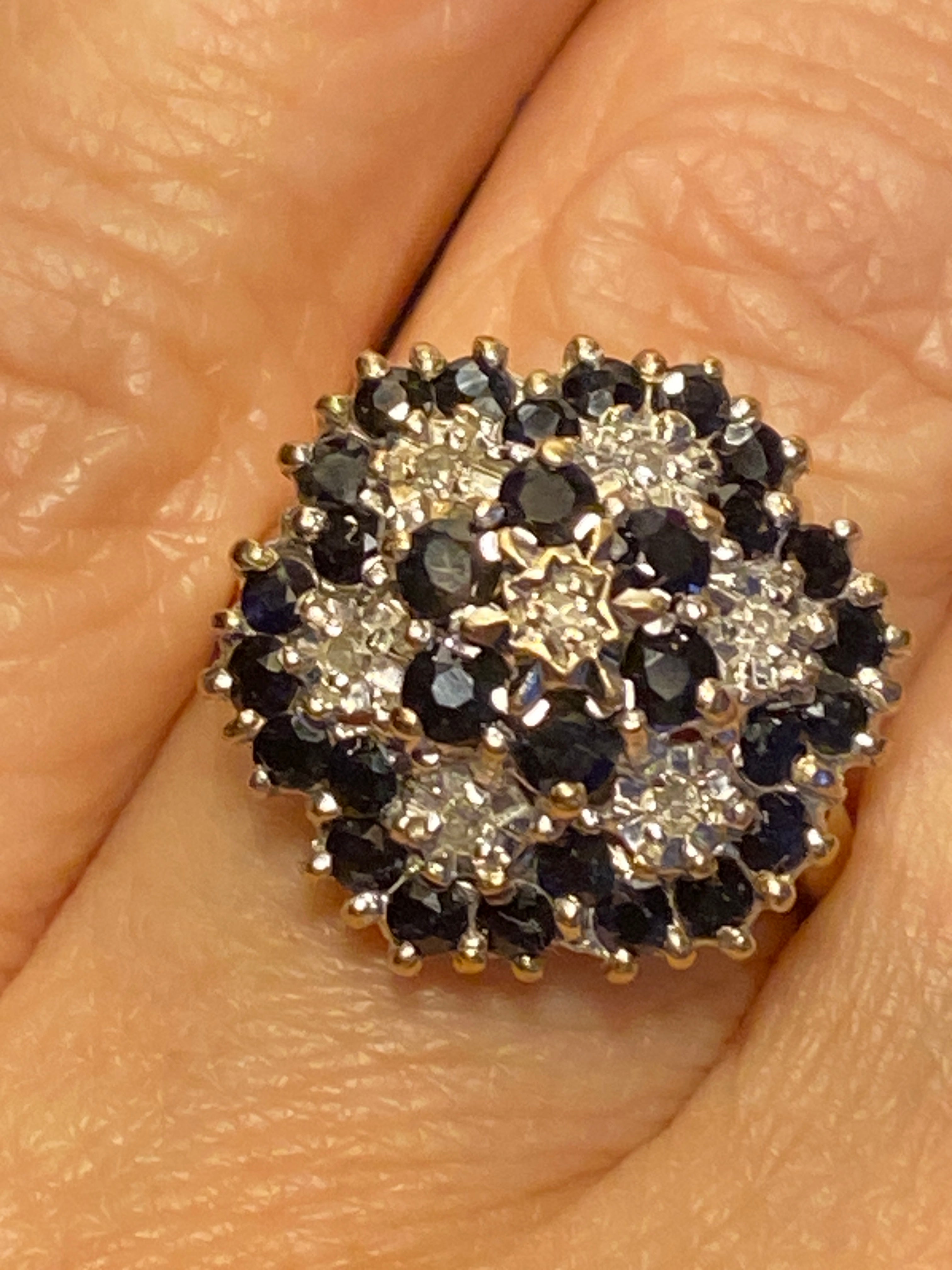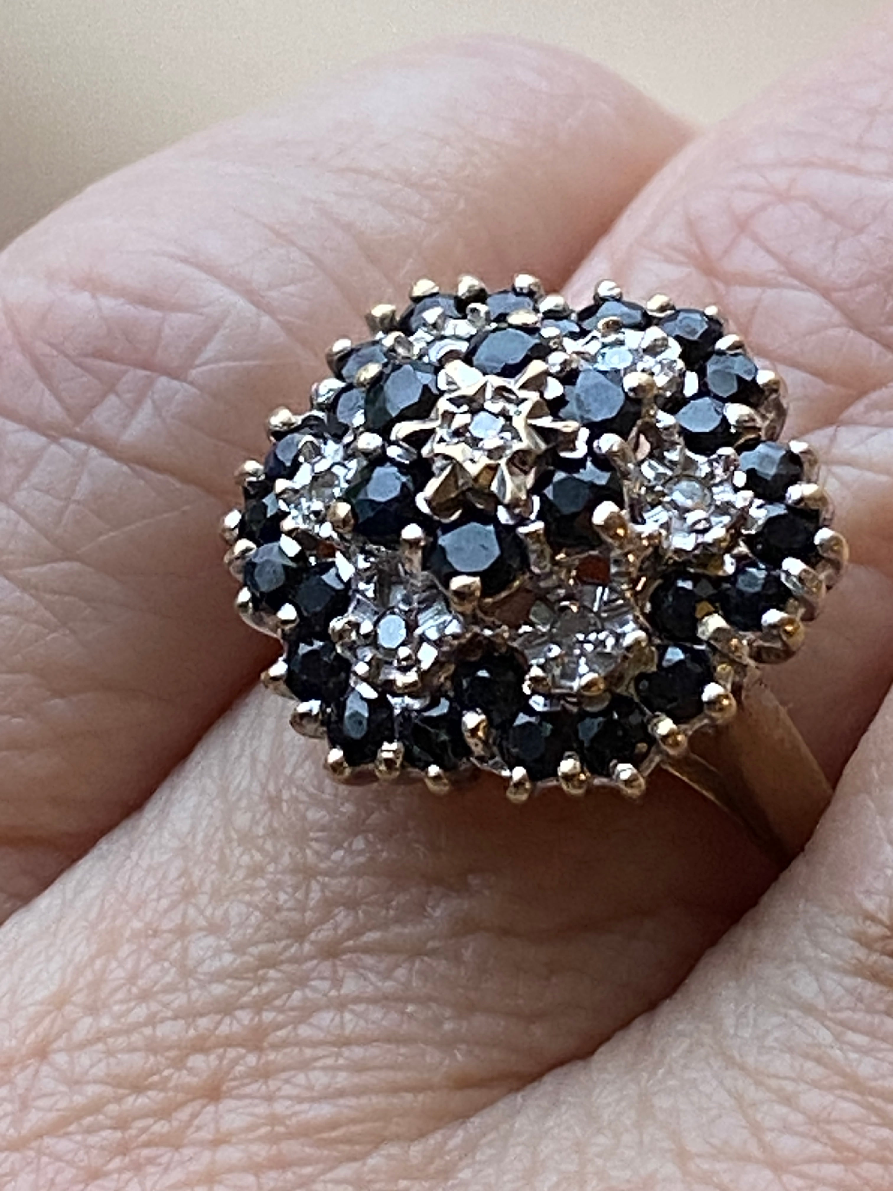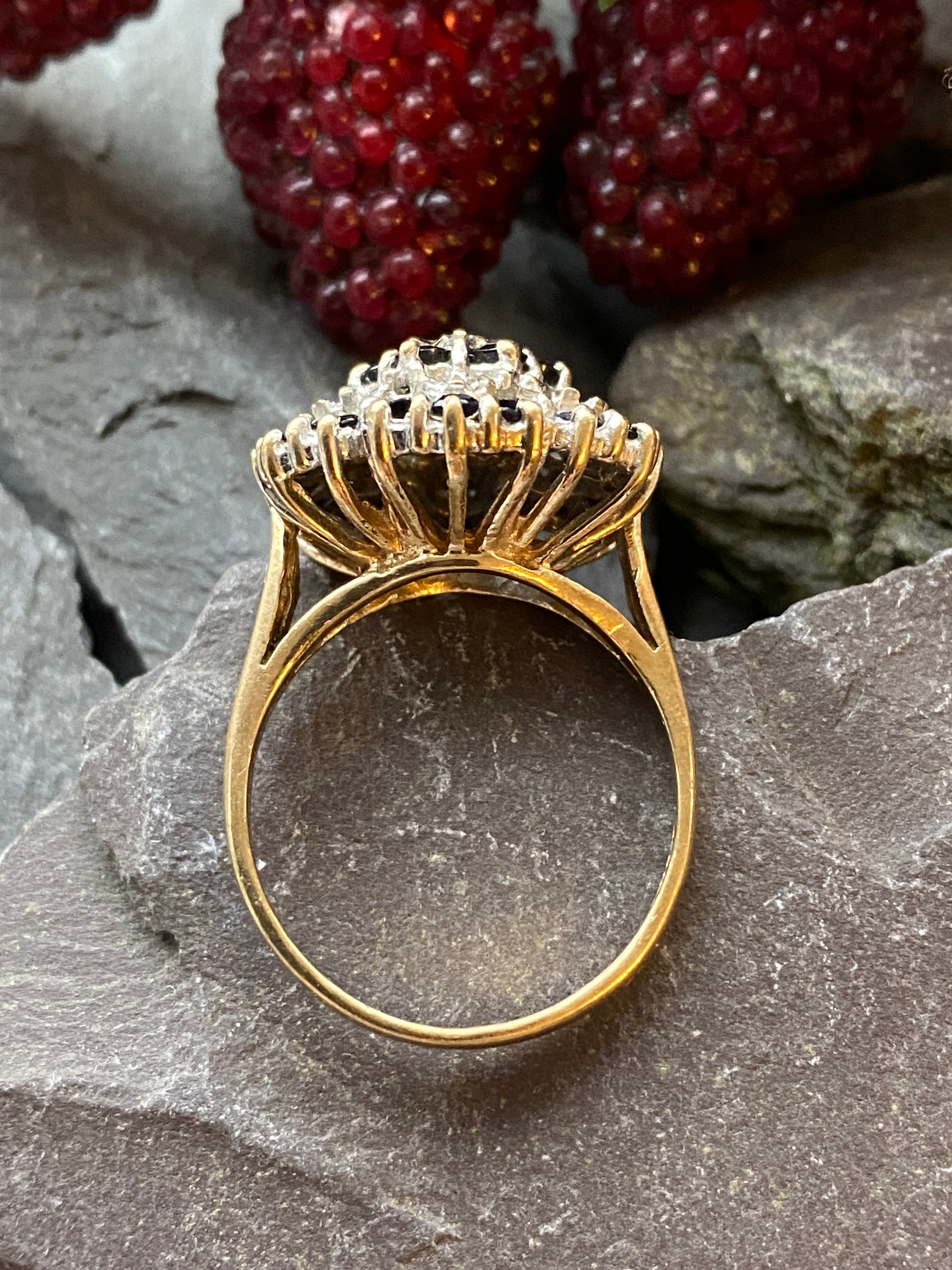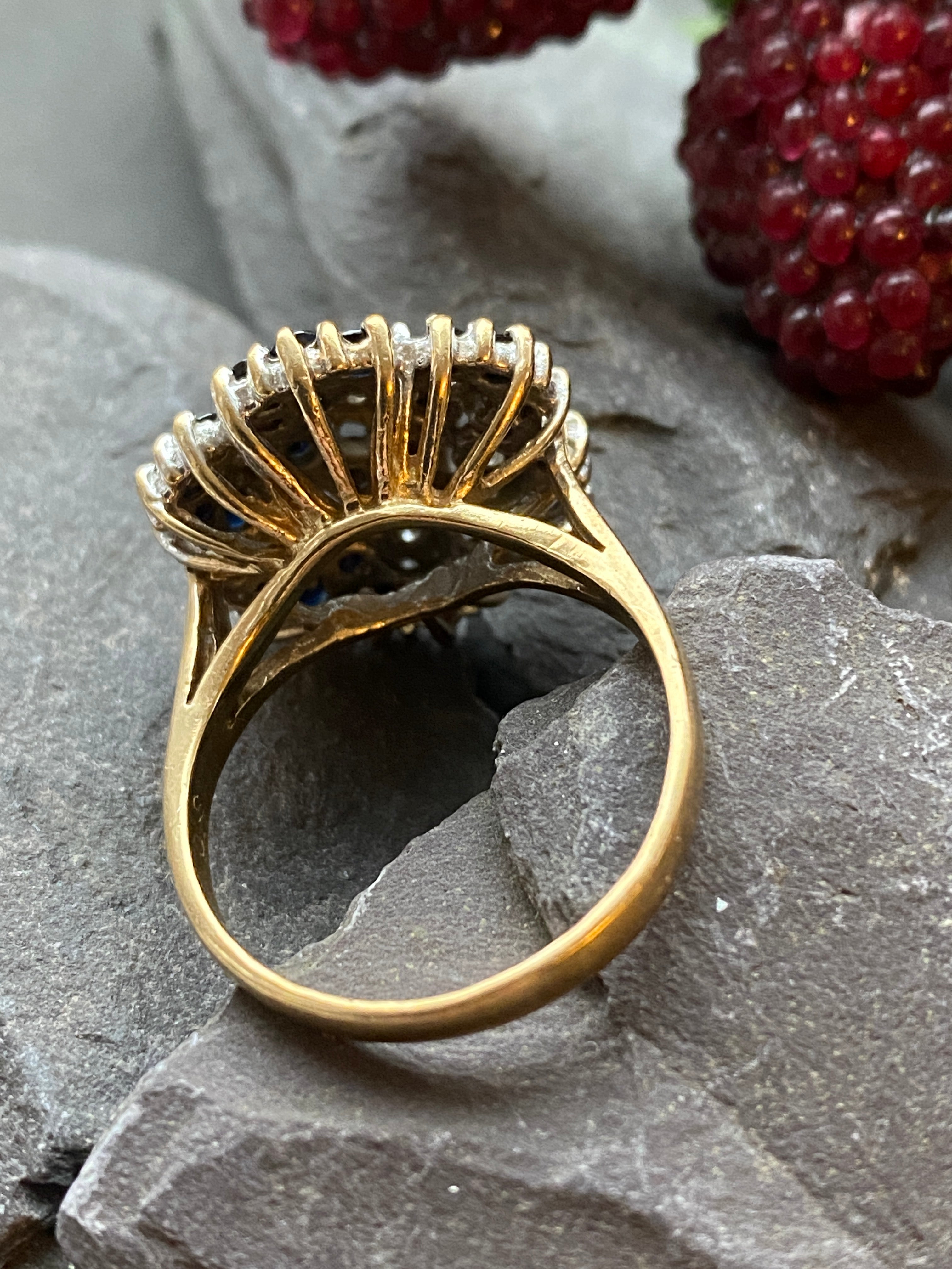 An eye catching statement ring in 9ct yellow gold featuring sapphires and diamonds in a large cluster setting