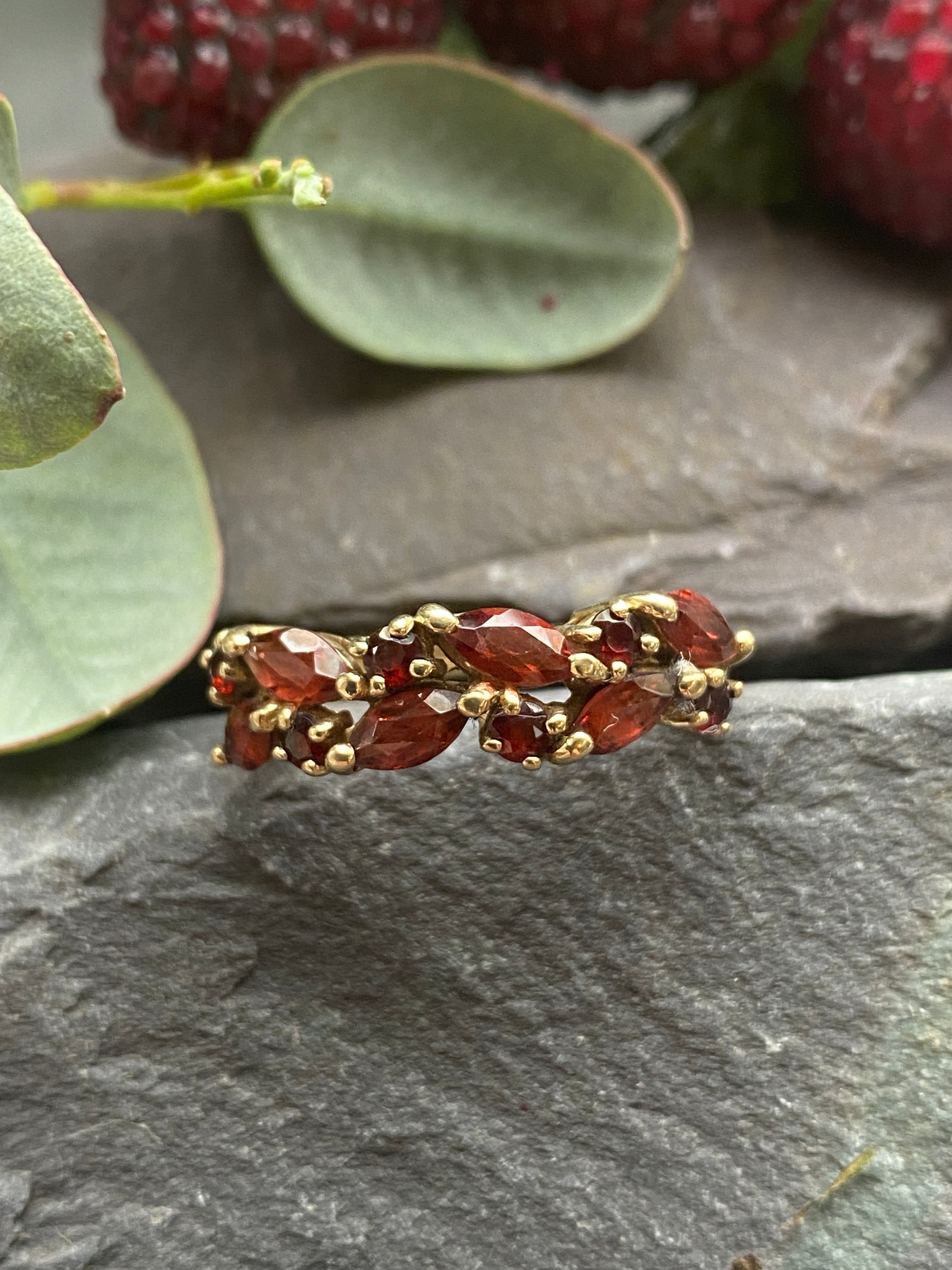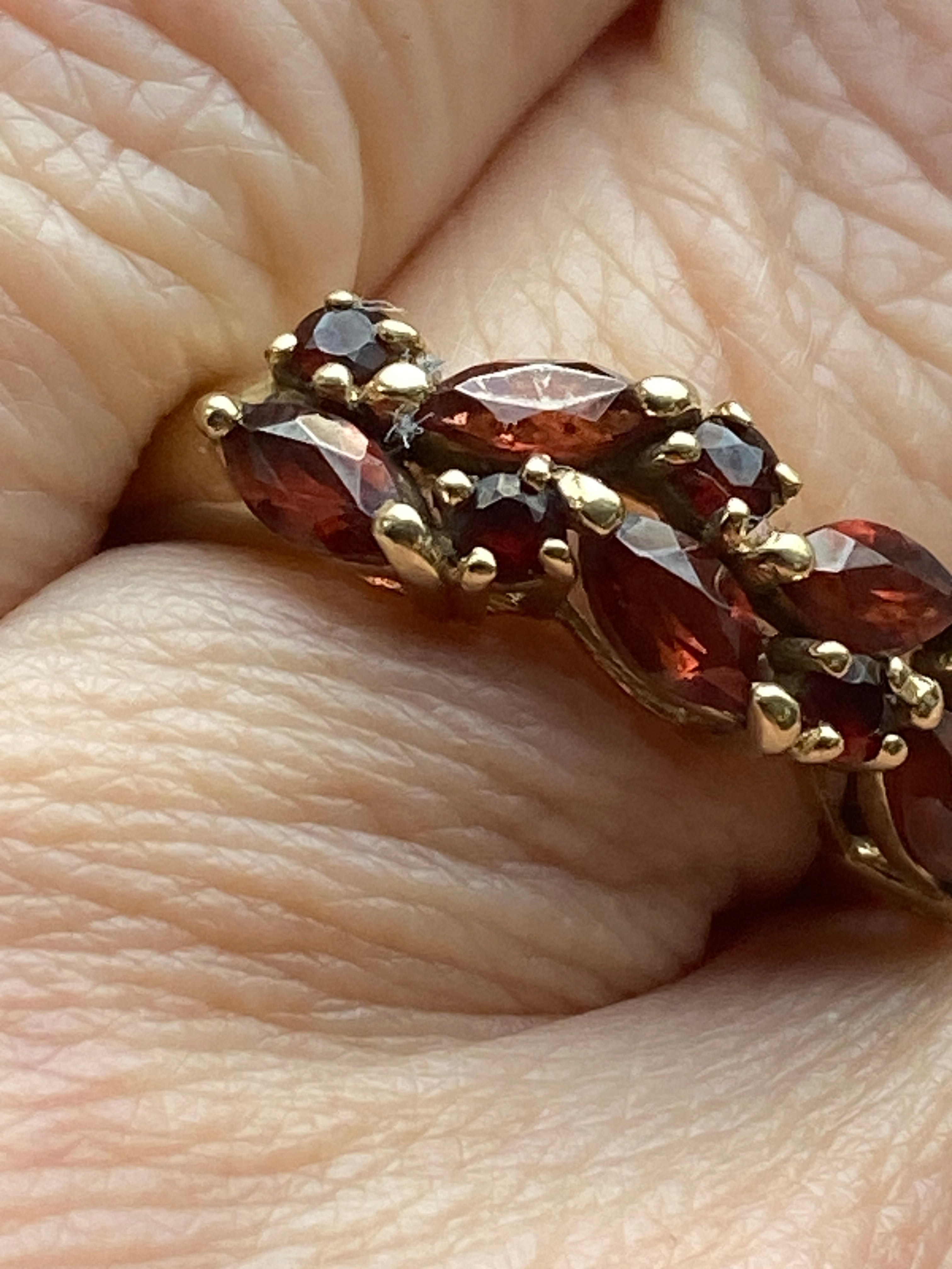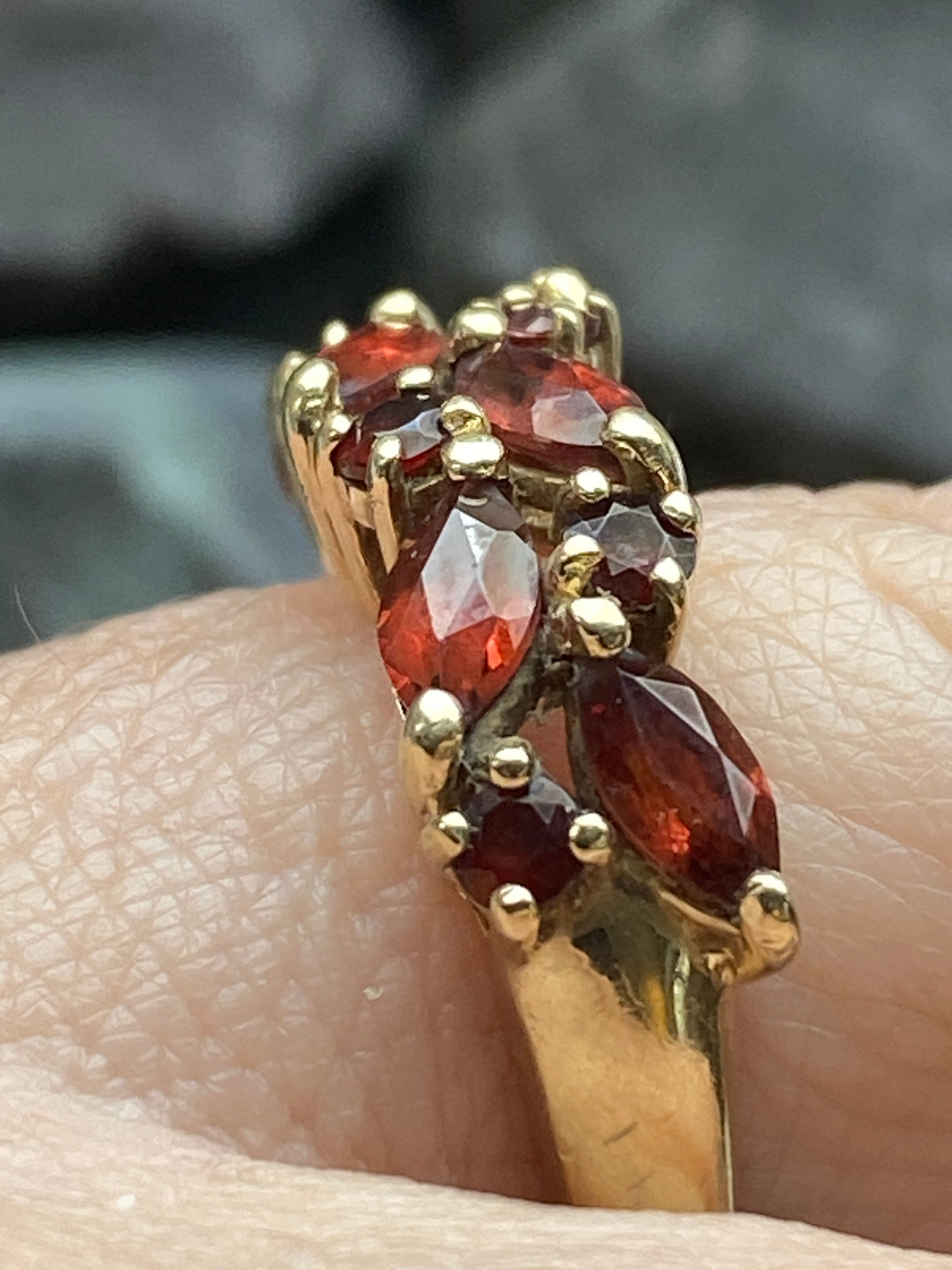 A very smart 9ct gold ring set with a wreath of Garnets in round and Marquis cuts