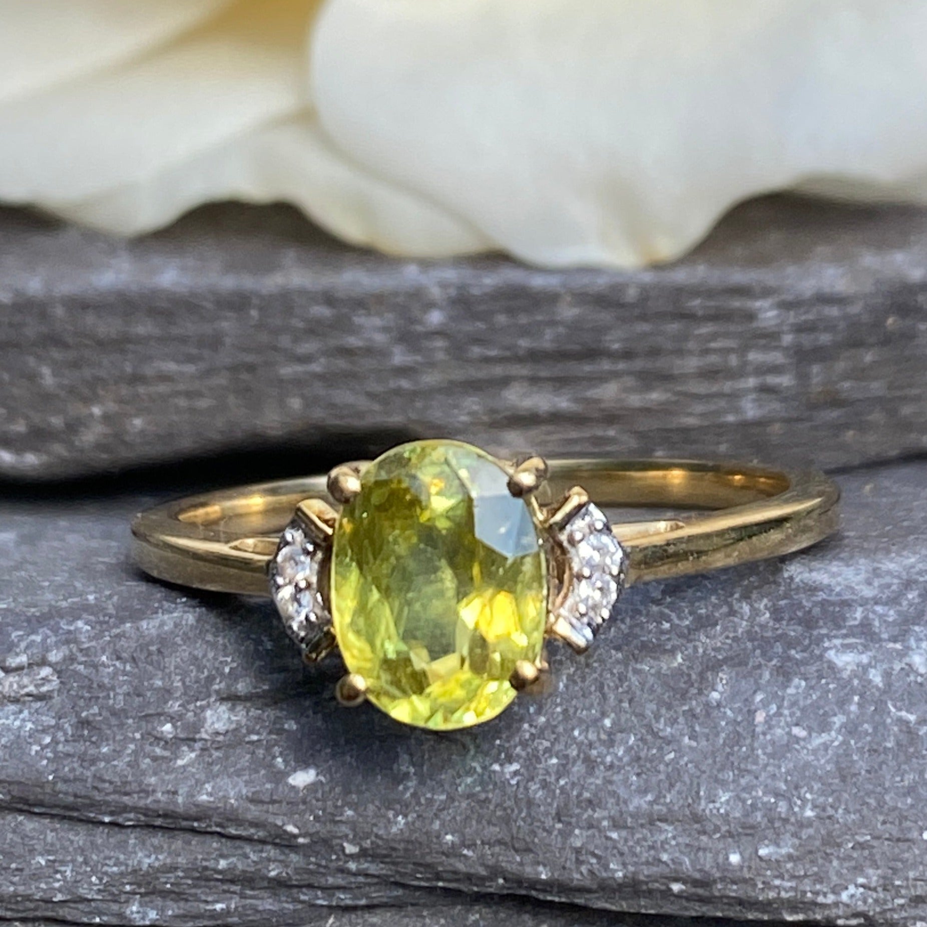 A beautiful 9ct gold ring set with an oval brilliant cut natural Yellow/Green Sphene of 1.13 carats flanked by two white zircon stones.