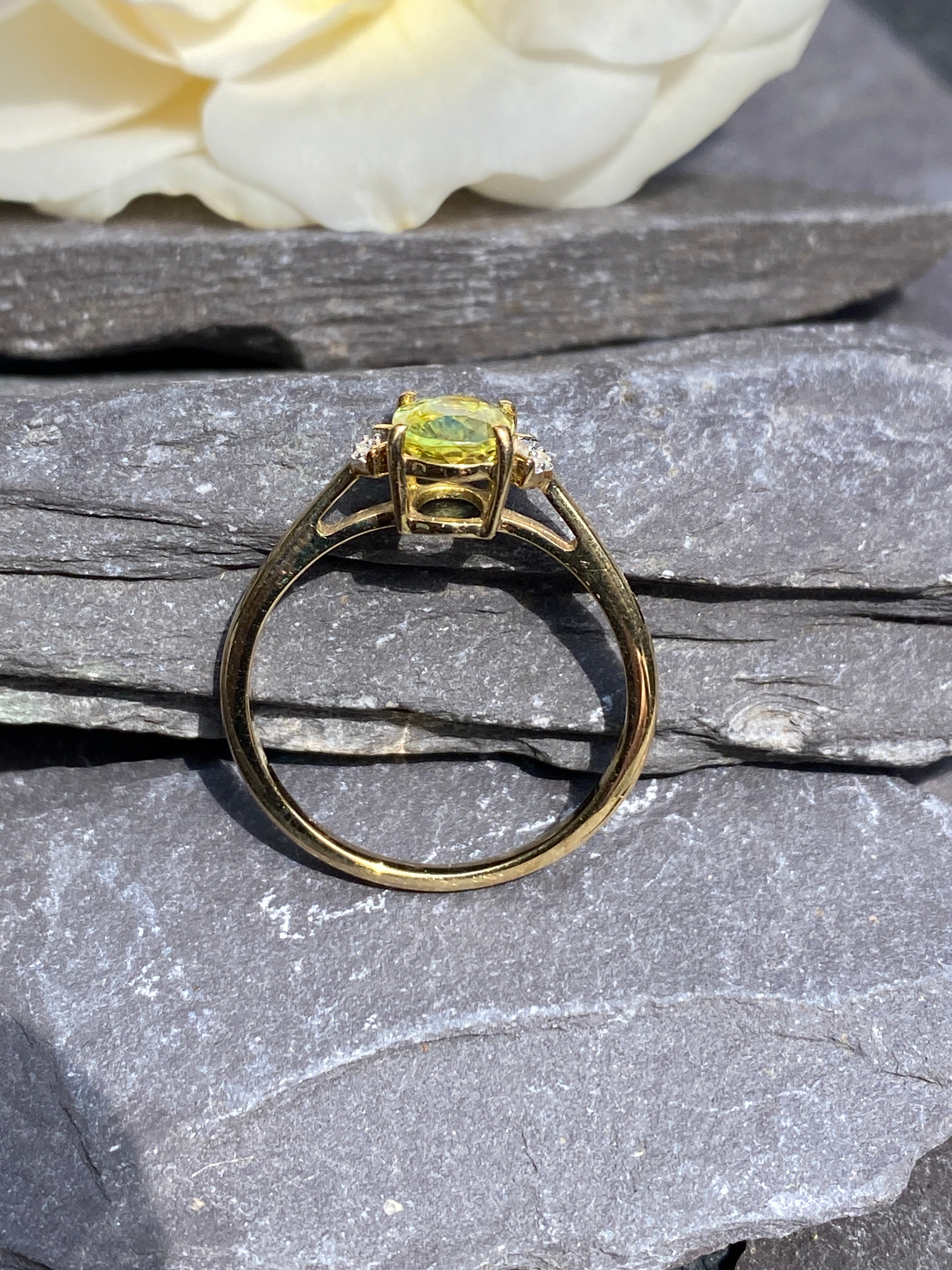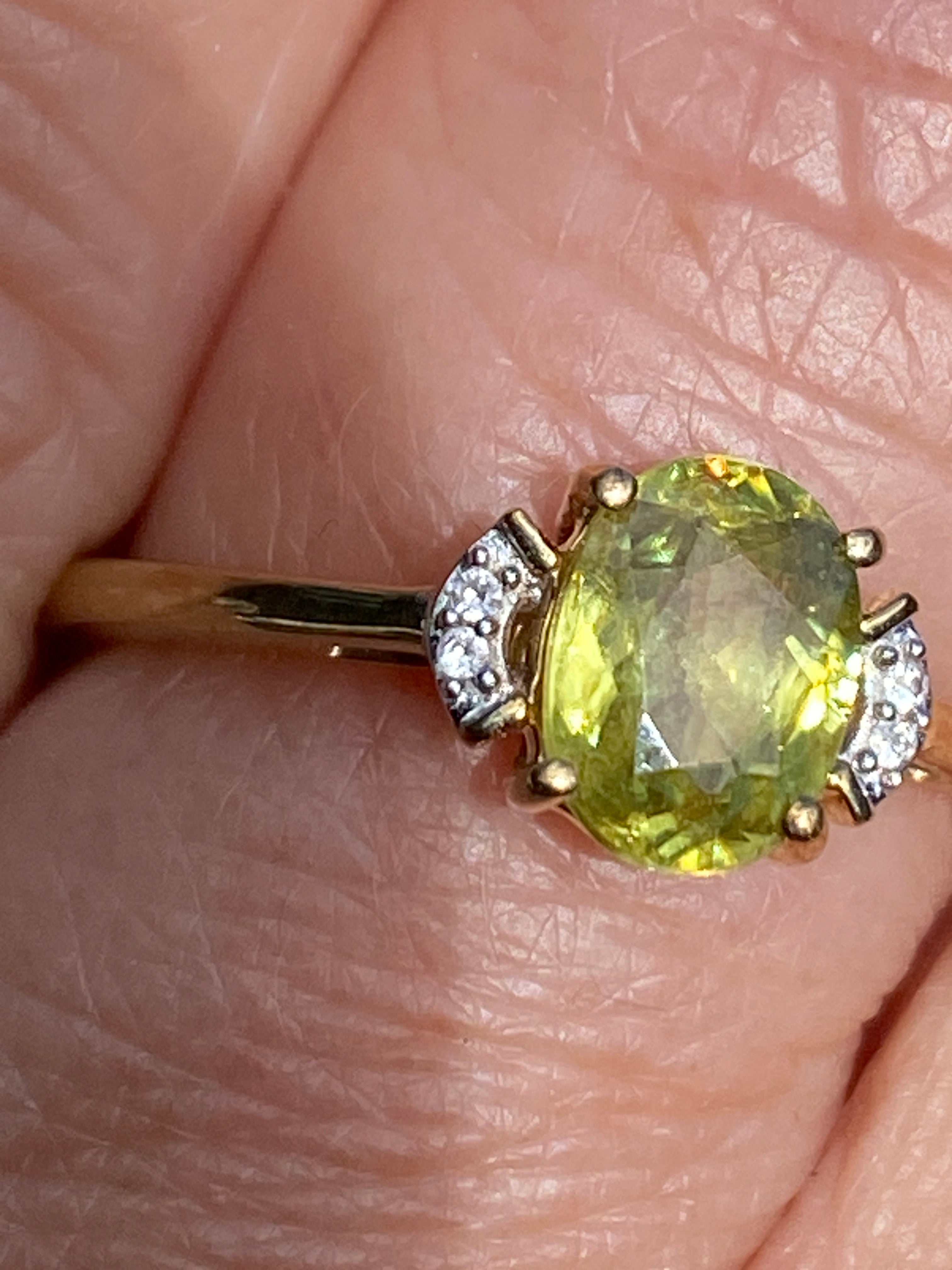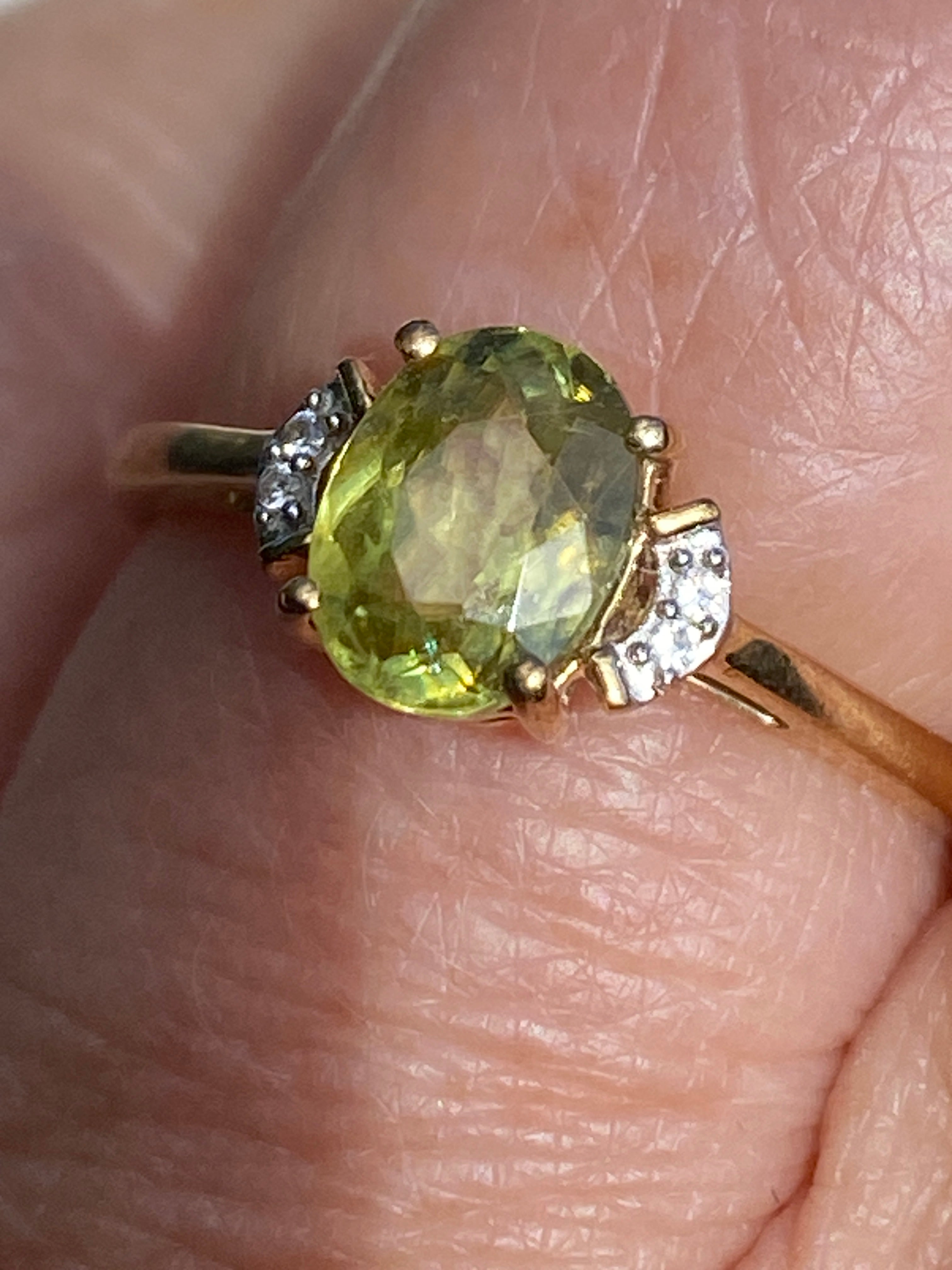 A beautiful 9ct gold ring set with an oval brilliant cut natural Yellow/Green Sphene of 1.13 carats flanked by two white zircon stones.In immaculate condition.Finger size N or...