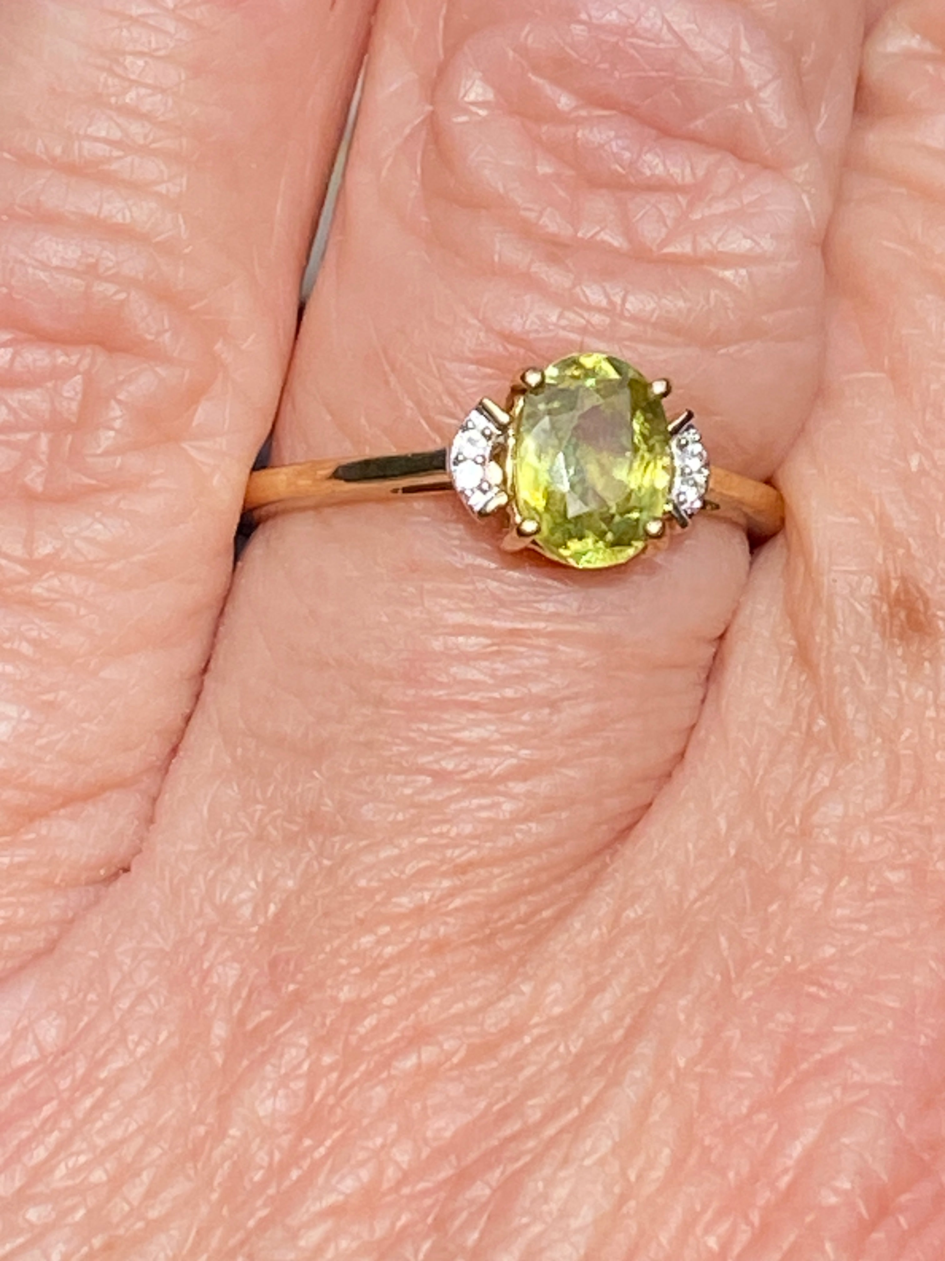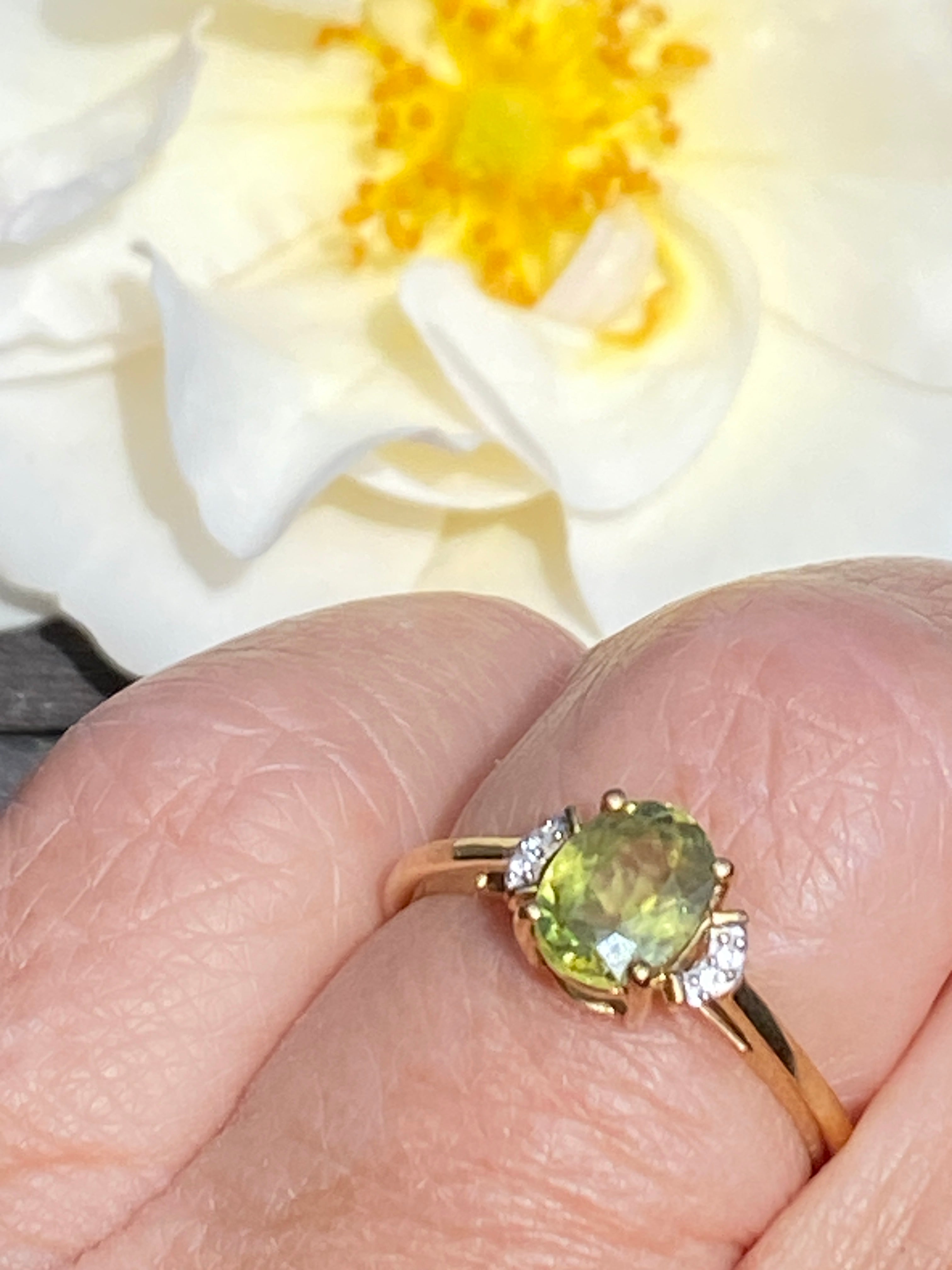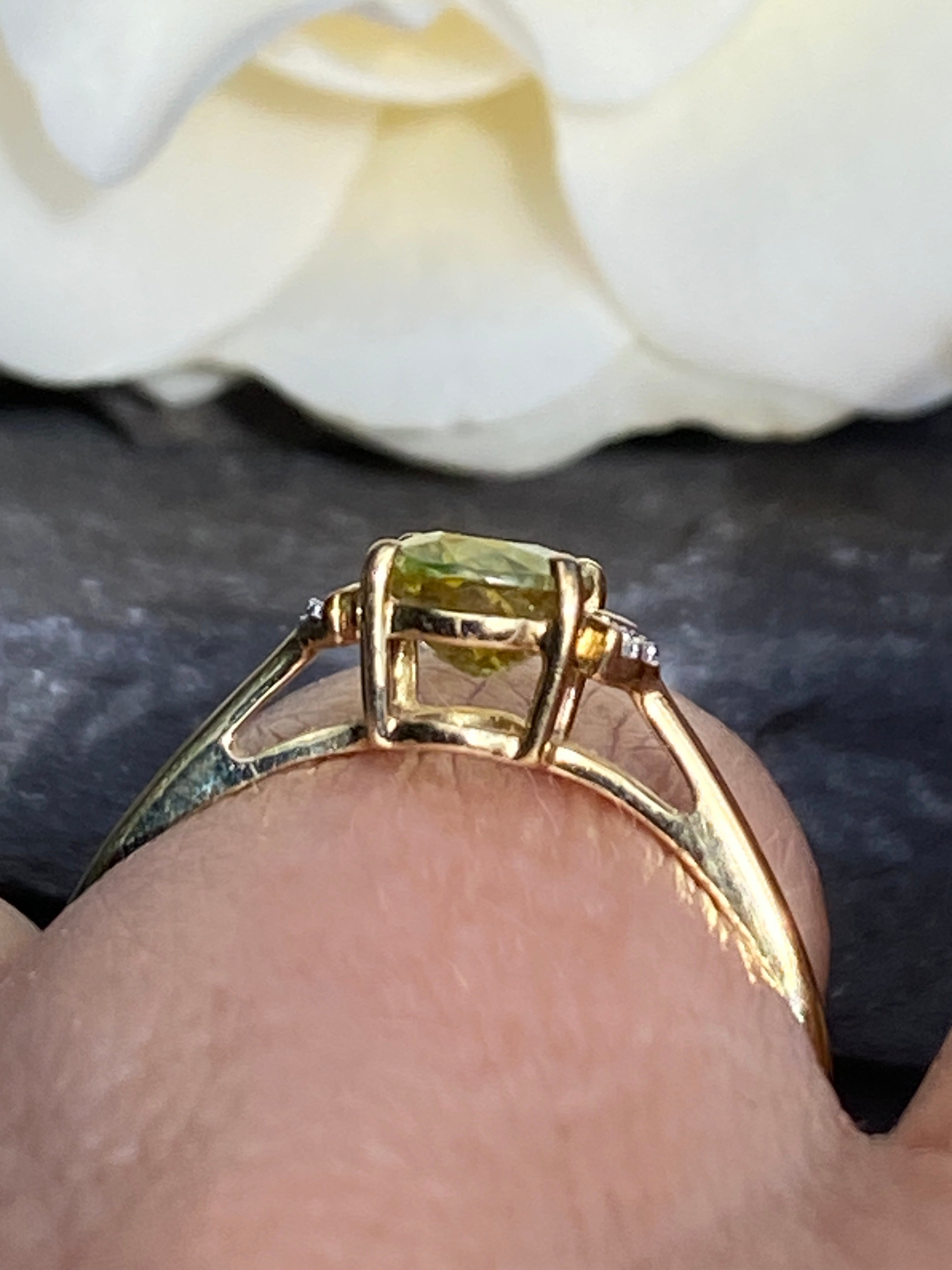 A beautiful 9ct gold ring set with an oval brilliant cut natural Yellow/Green Sphene of 1.13 carats flanked by two white zircon stones.In immaculate condition.Finger size N or...