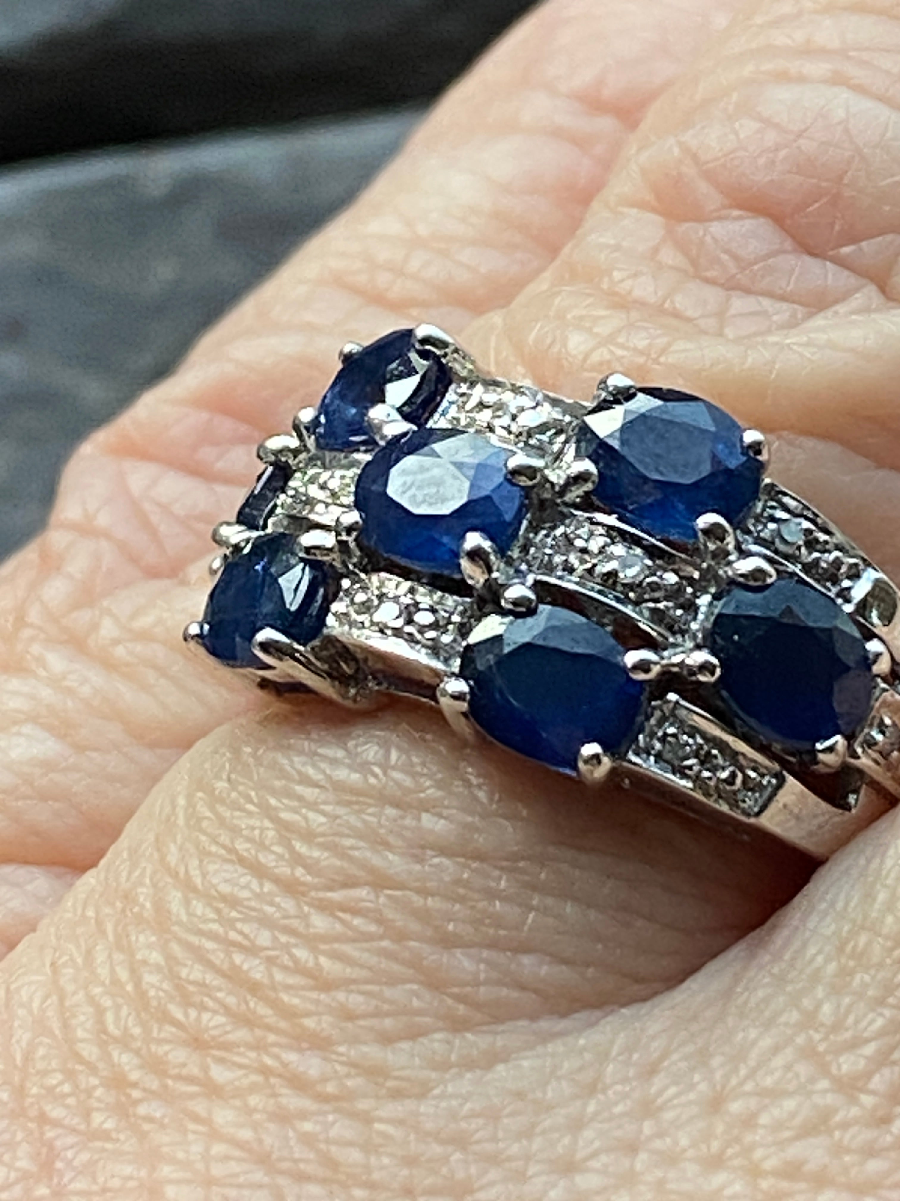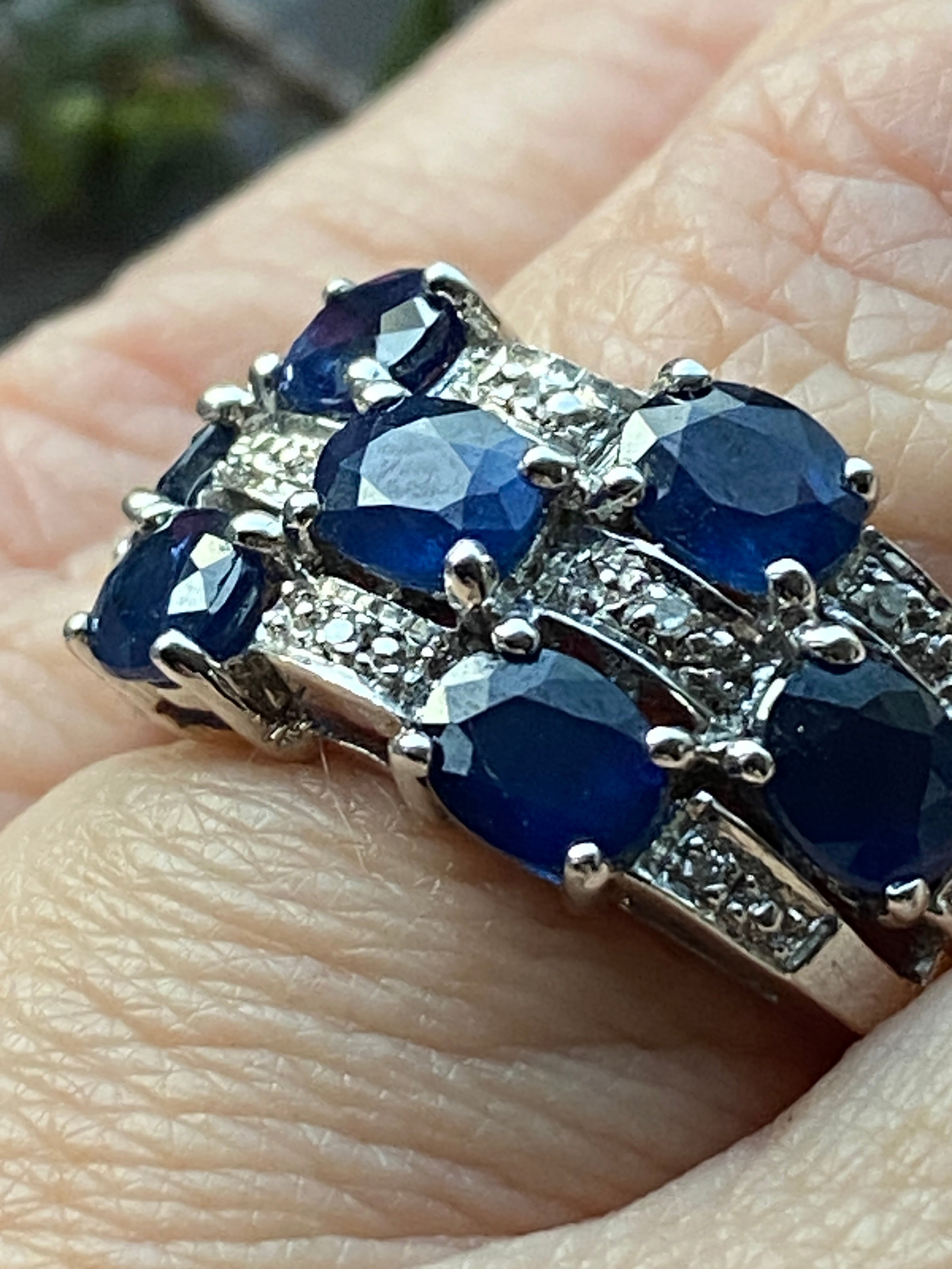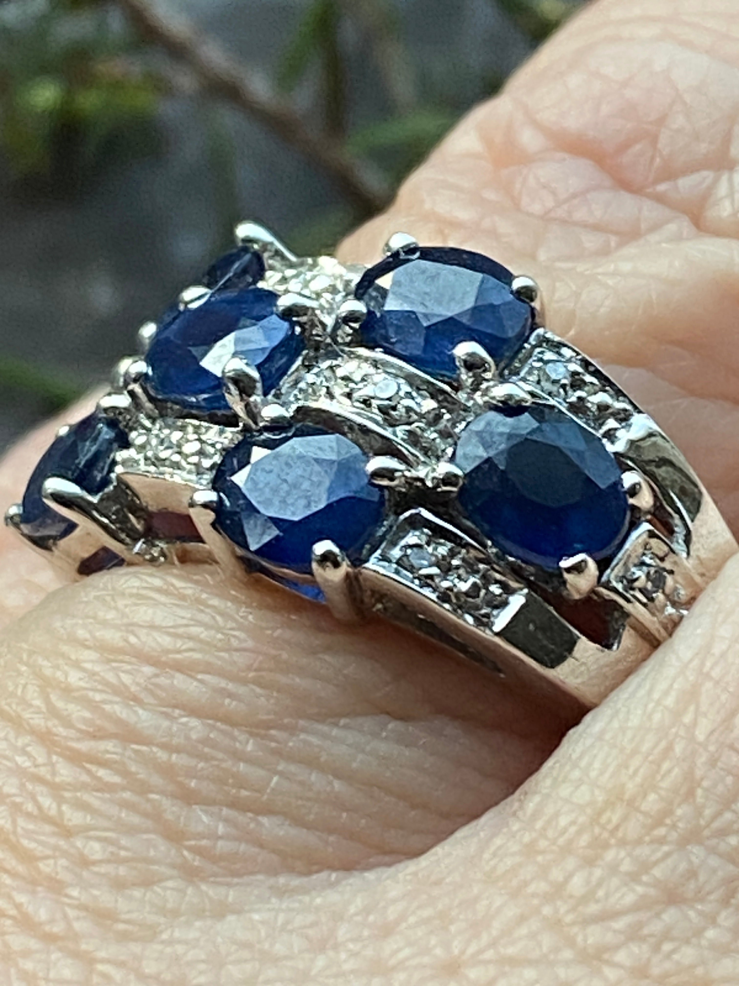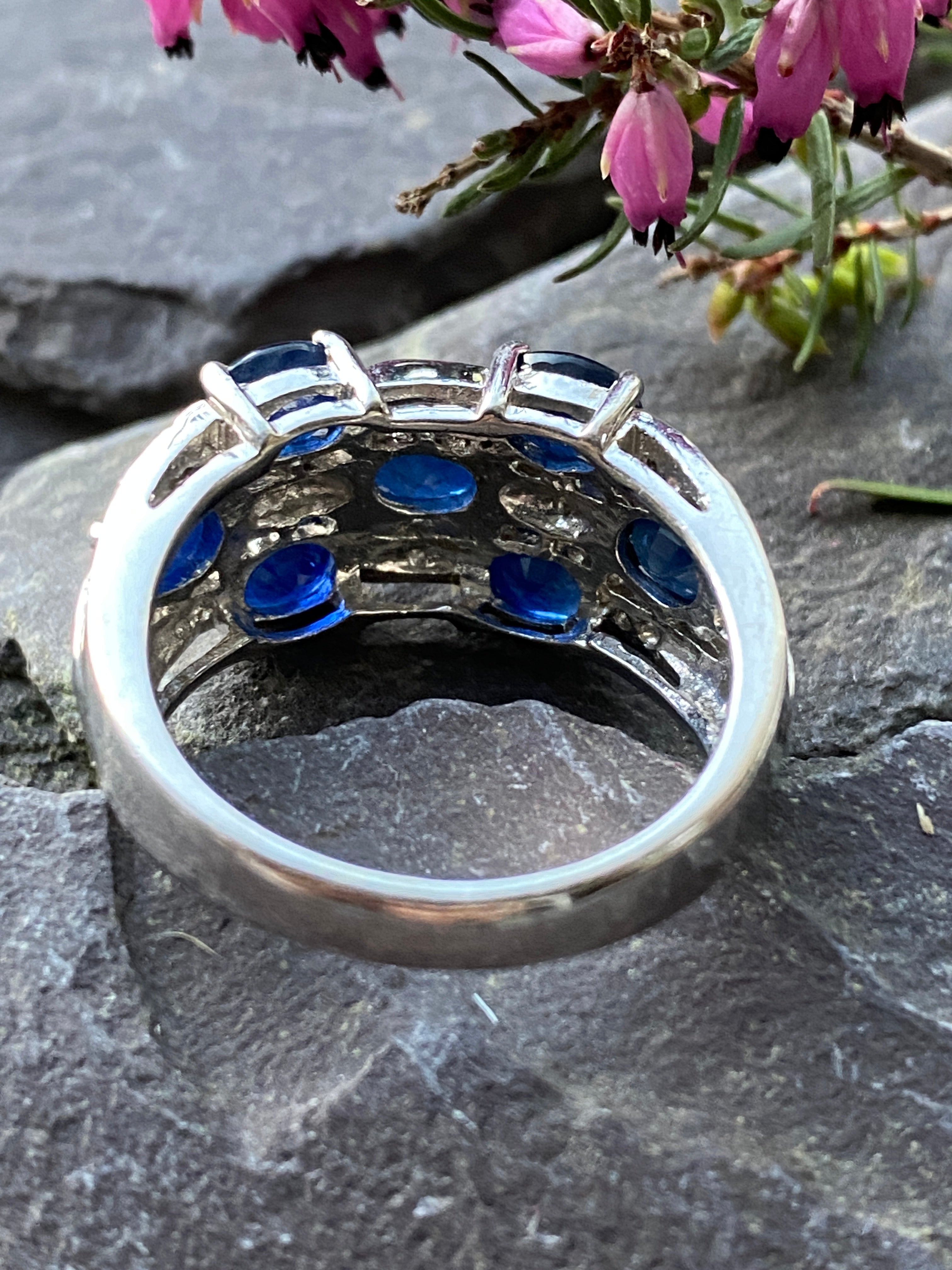 A stunning 9ct white gold ring set with royal blue oval cut sapphires and ten round brilliant diamond accents.