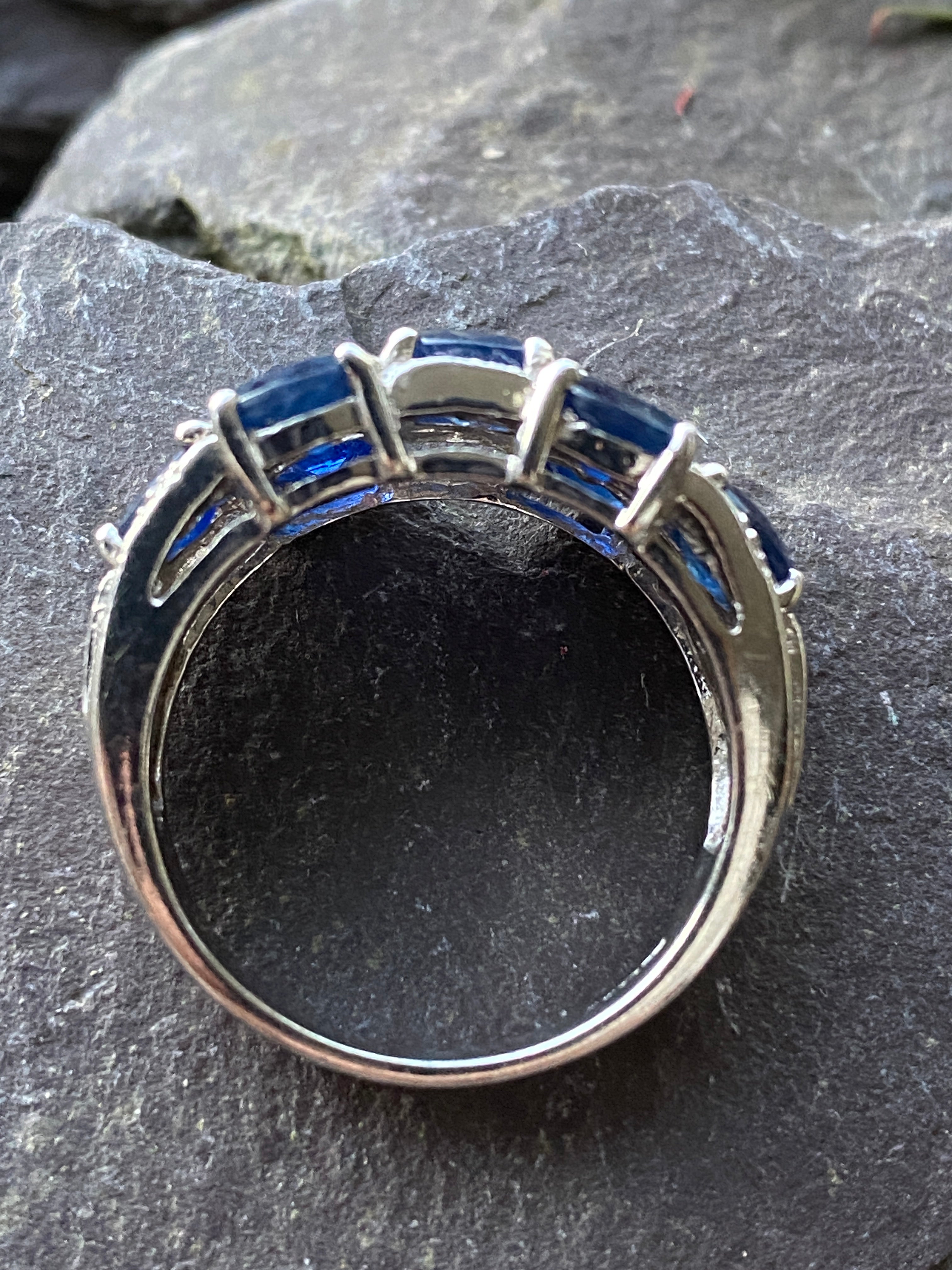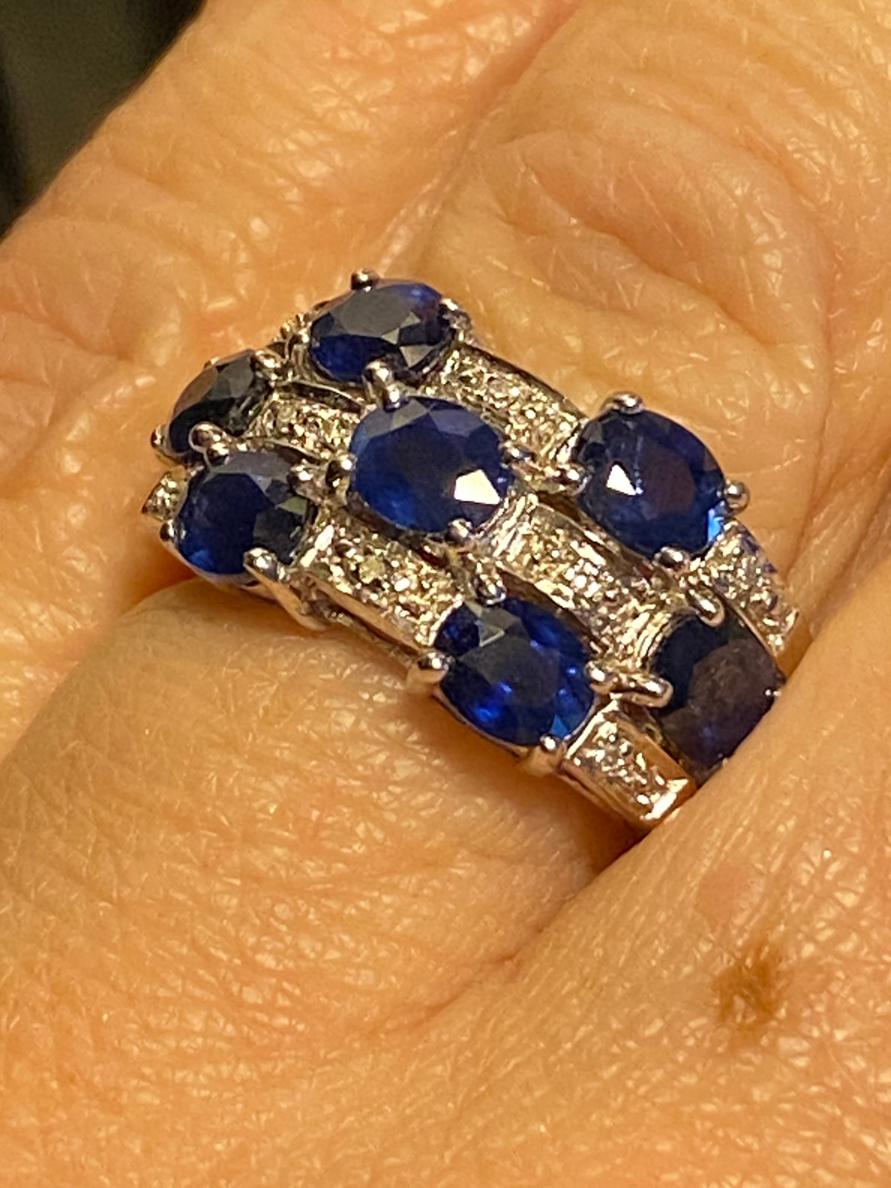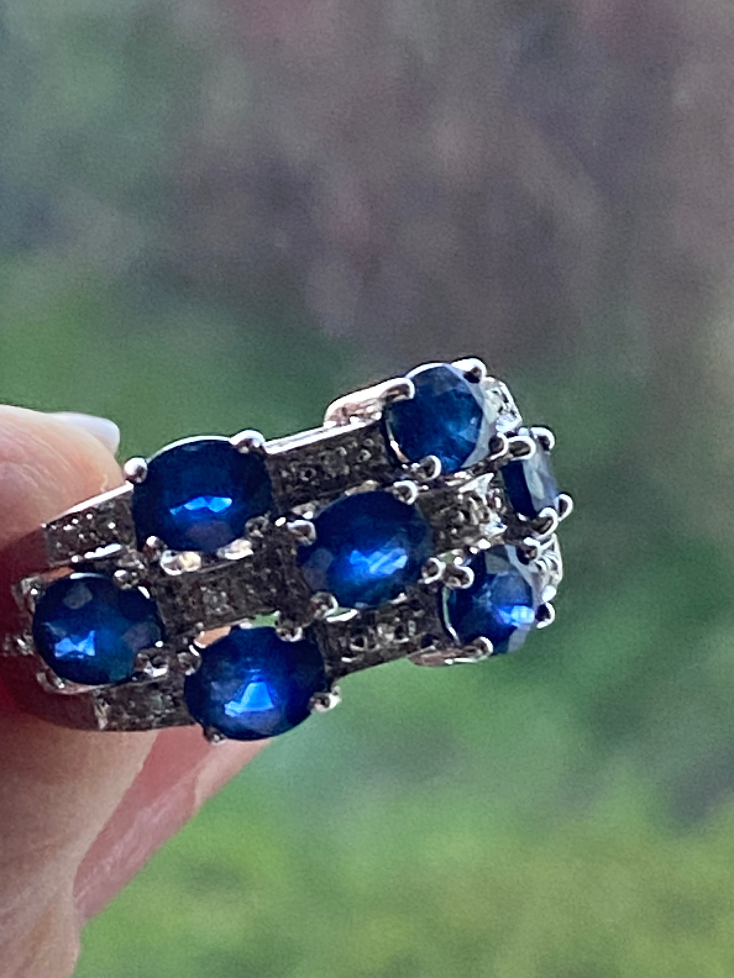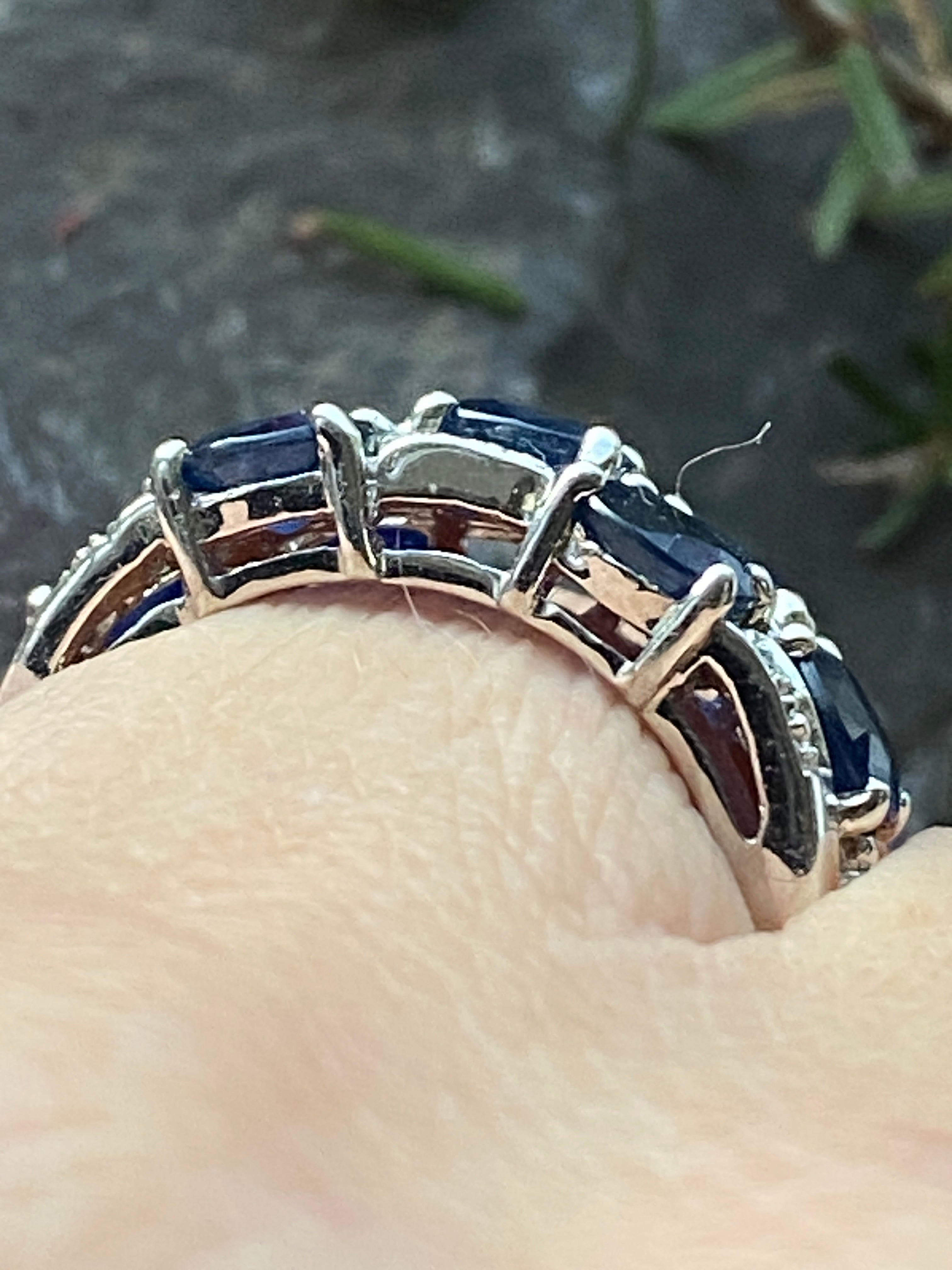 A stunning 9ct white gold ring set with royal blue oval cut sapphires and ten round brilliant diamond accents.