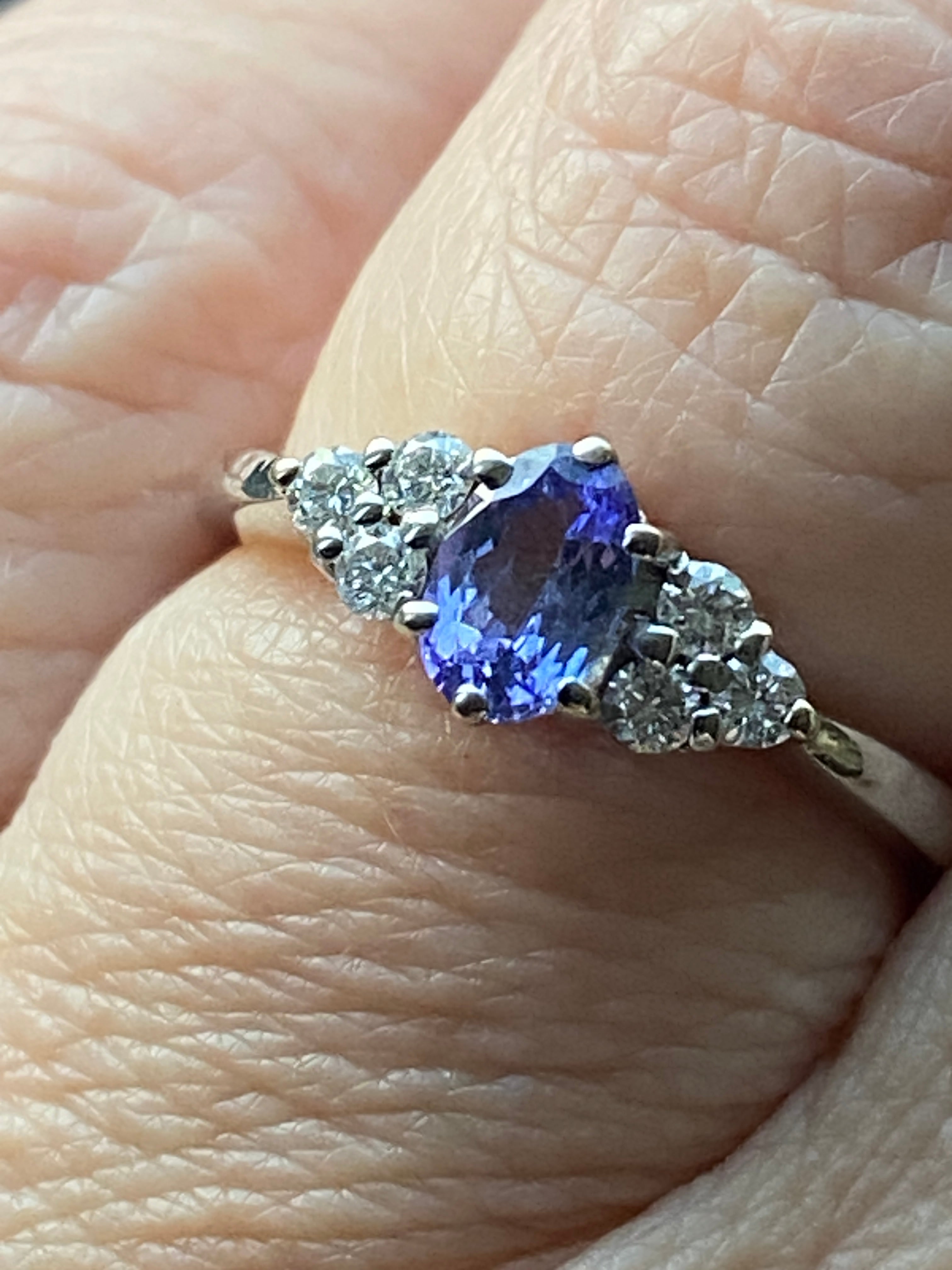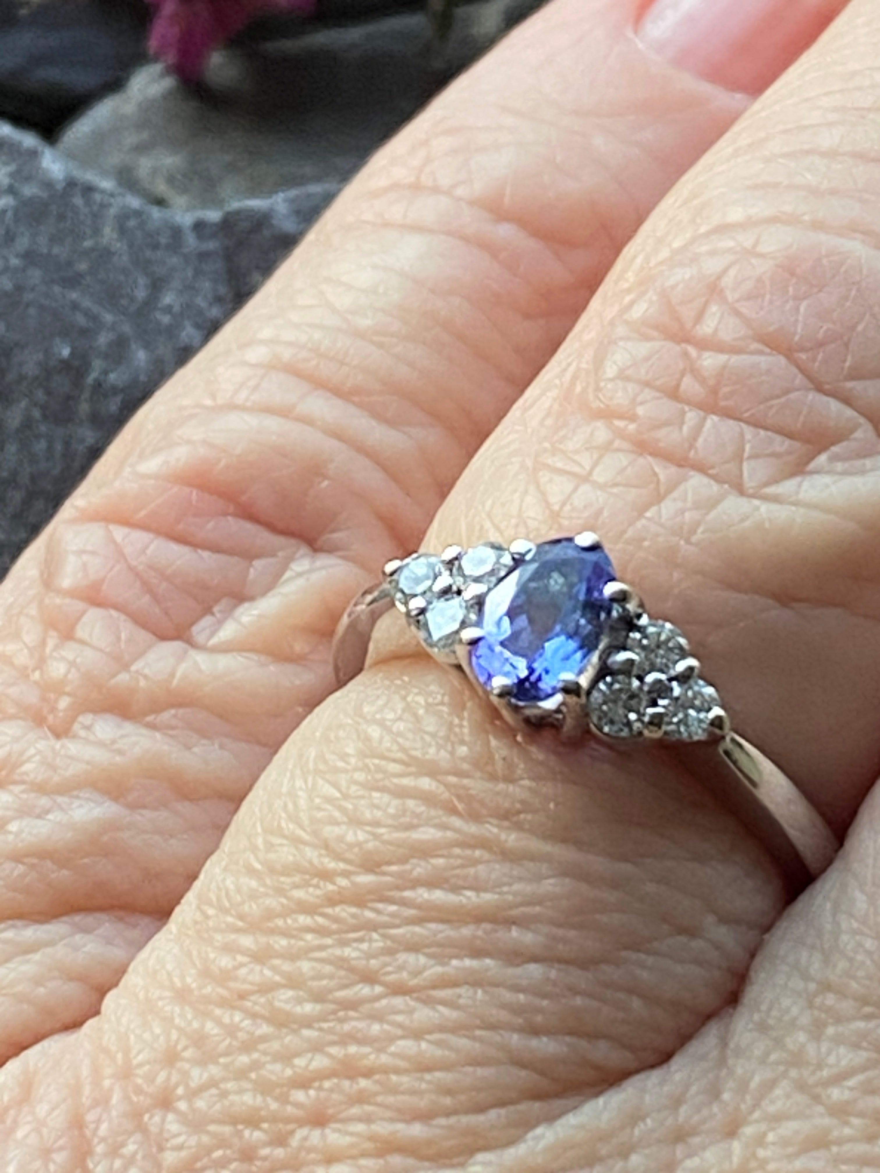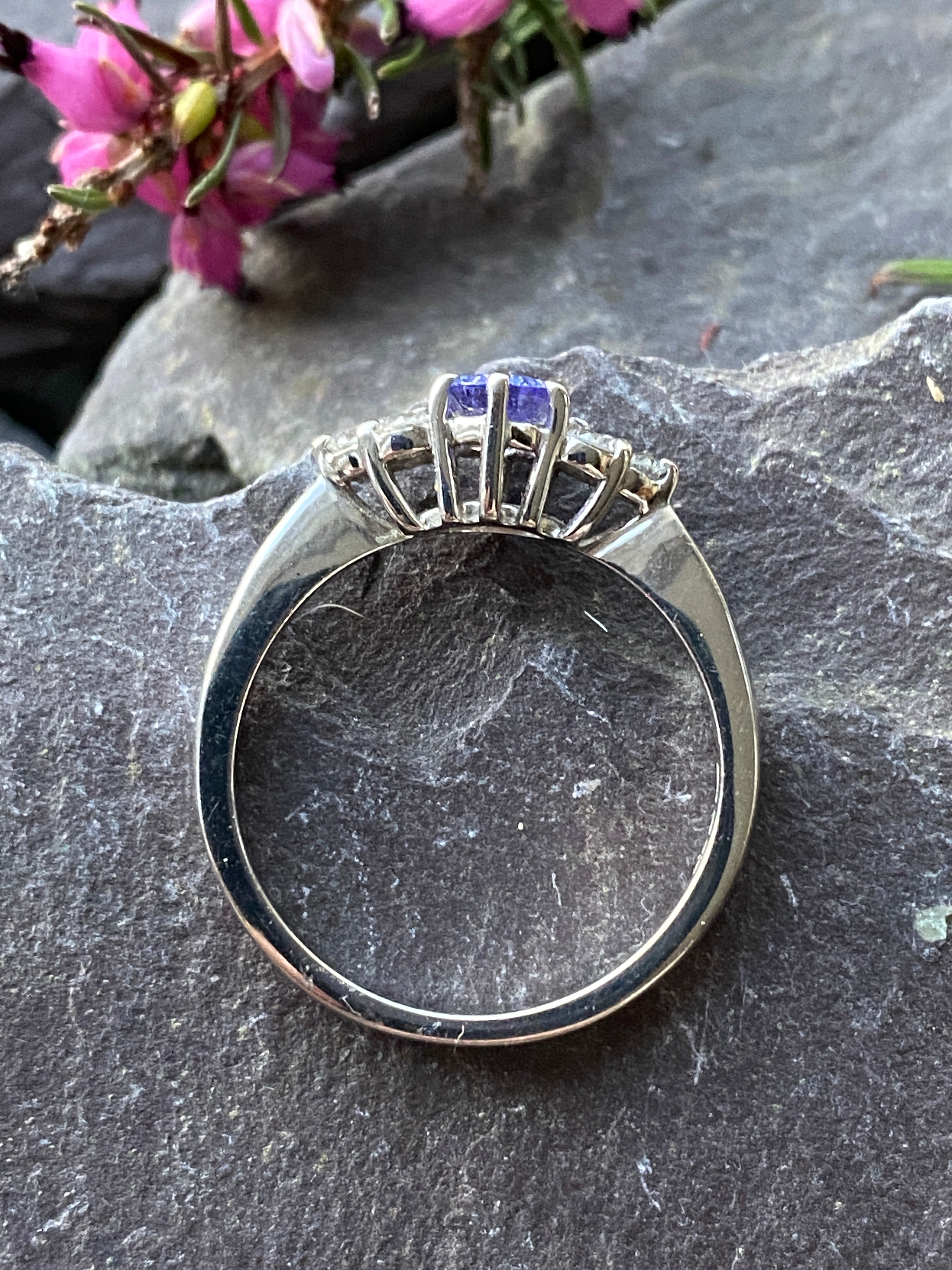 A very pretty 9ct white gold ring set with an oval Tanzanite and a trio of Diamonds each side
