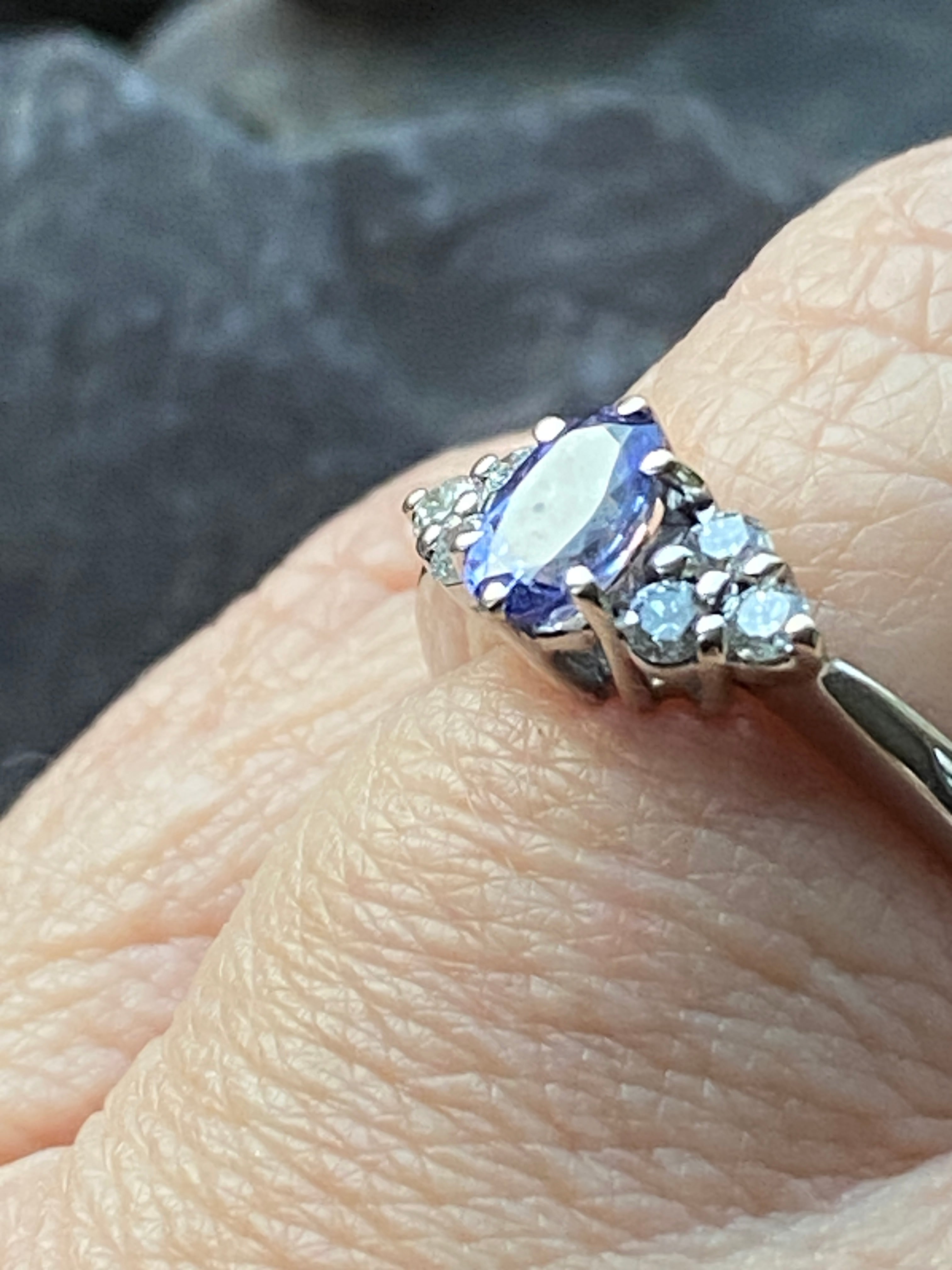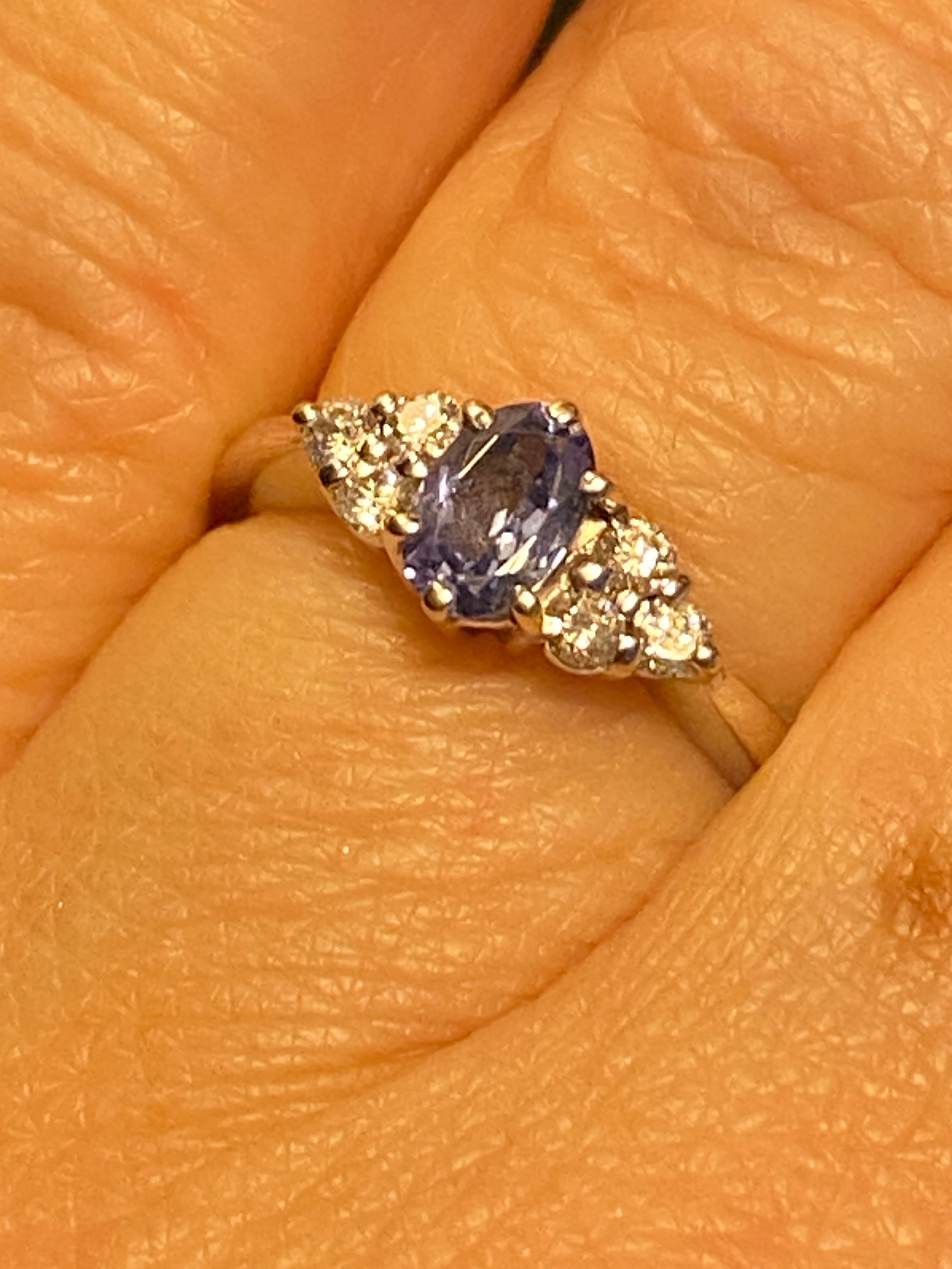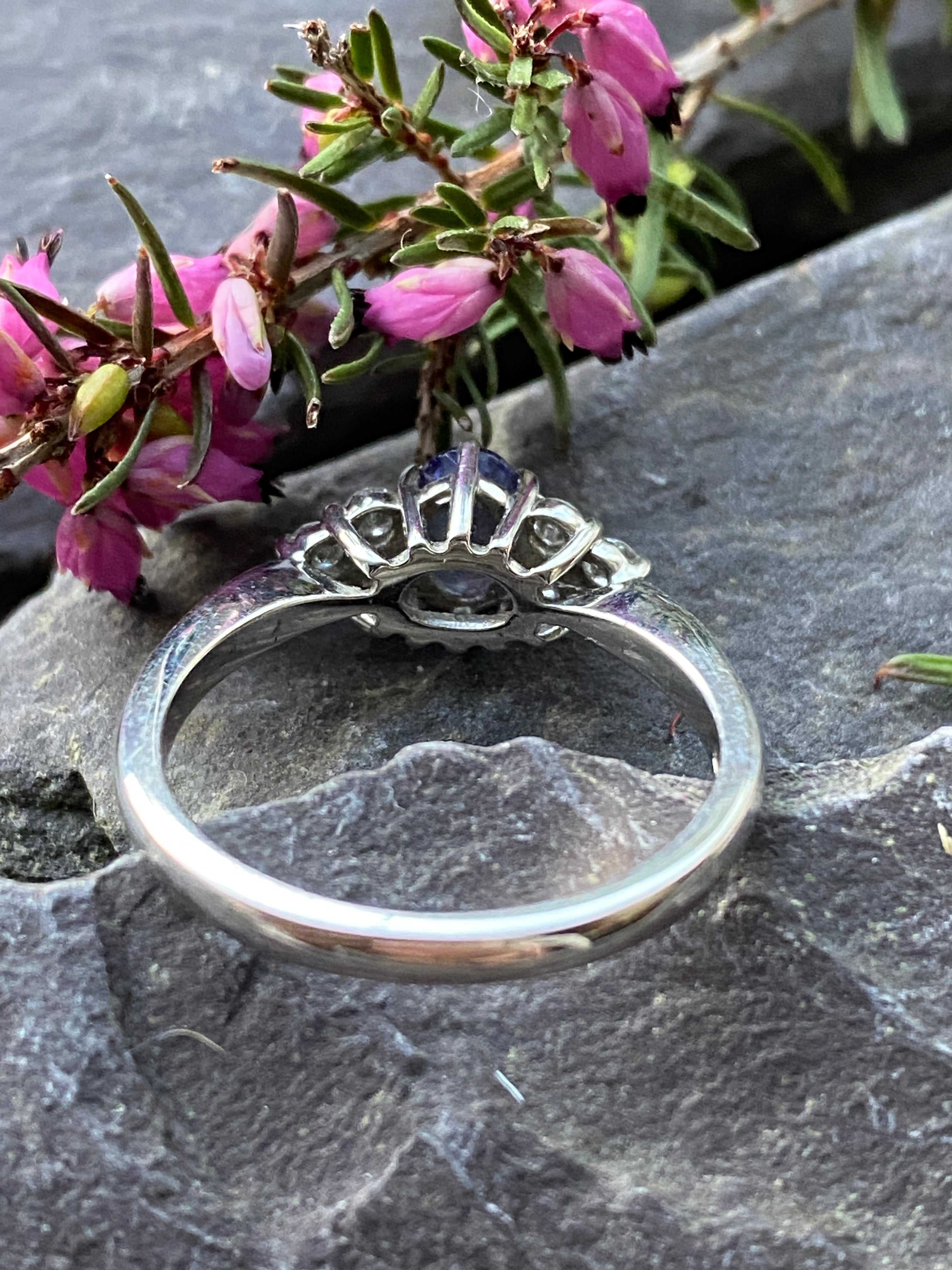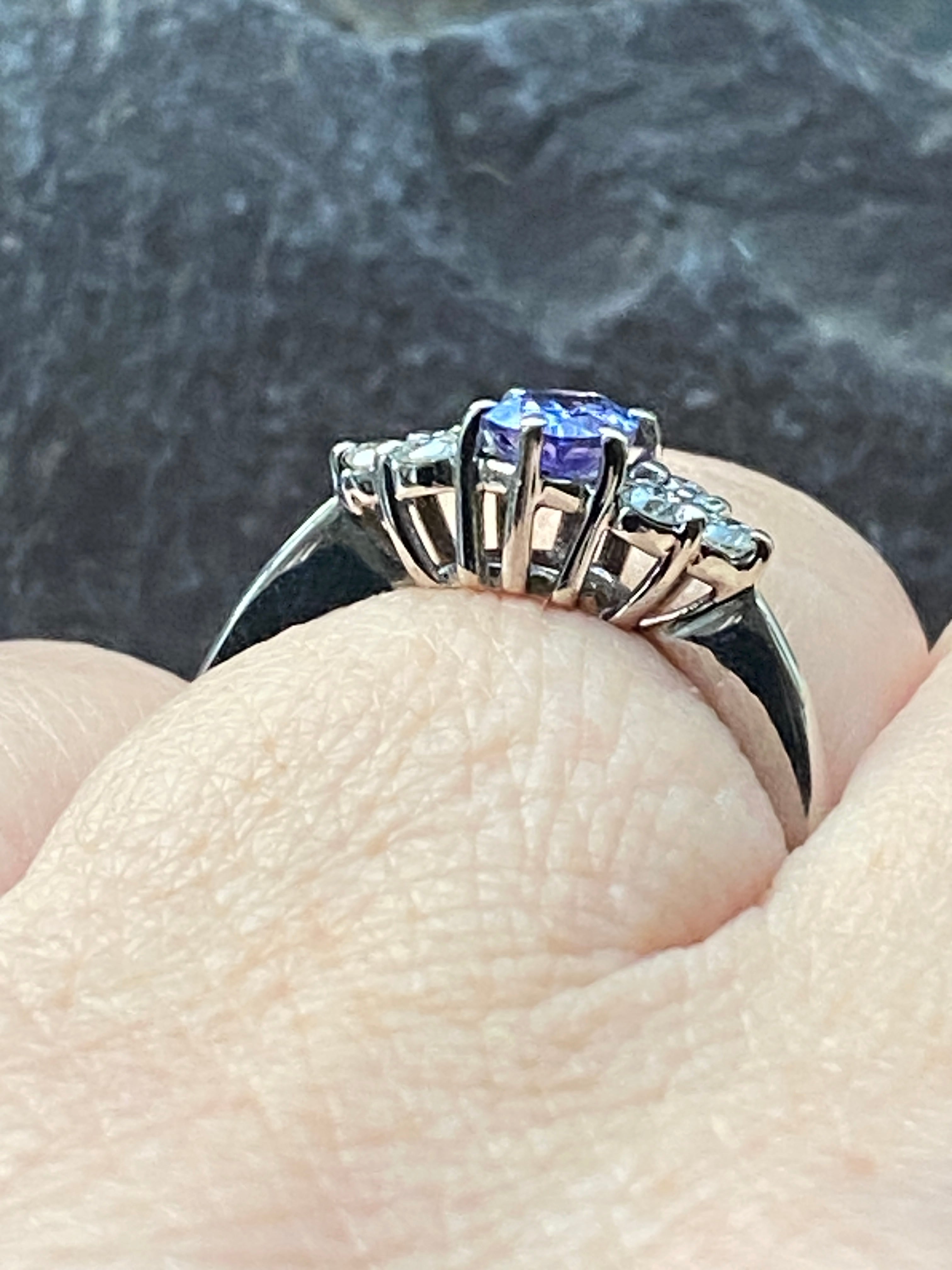 A very pretty 9ct white gold ring set with an oval Tanzanite and a trio of Diamonds each side