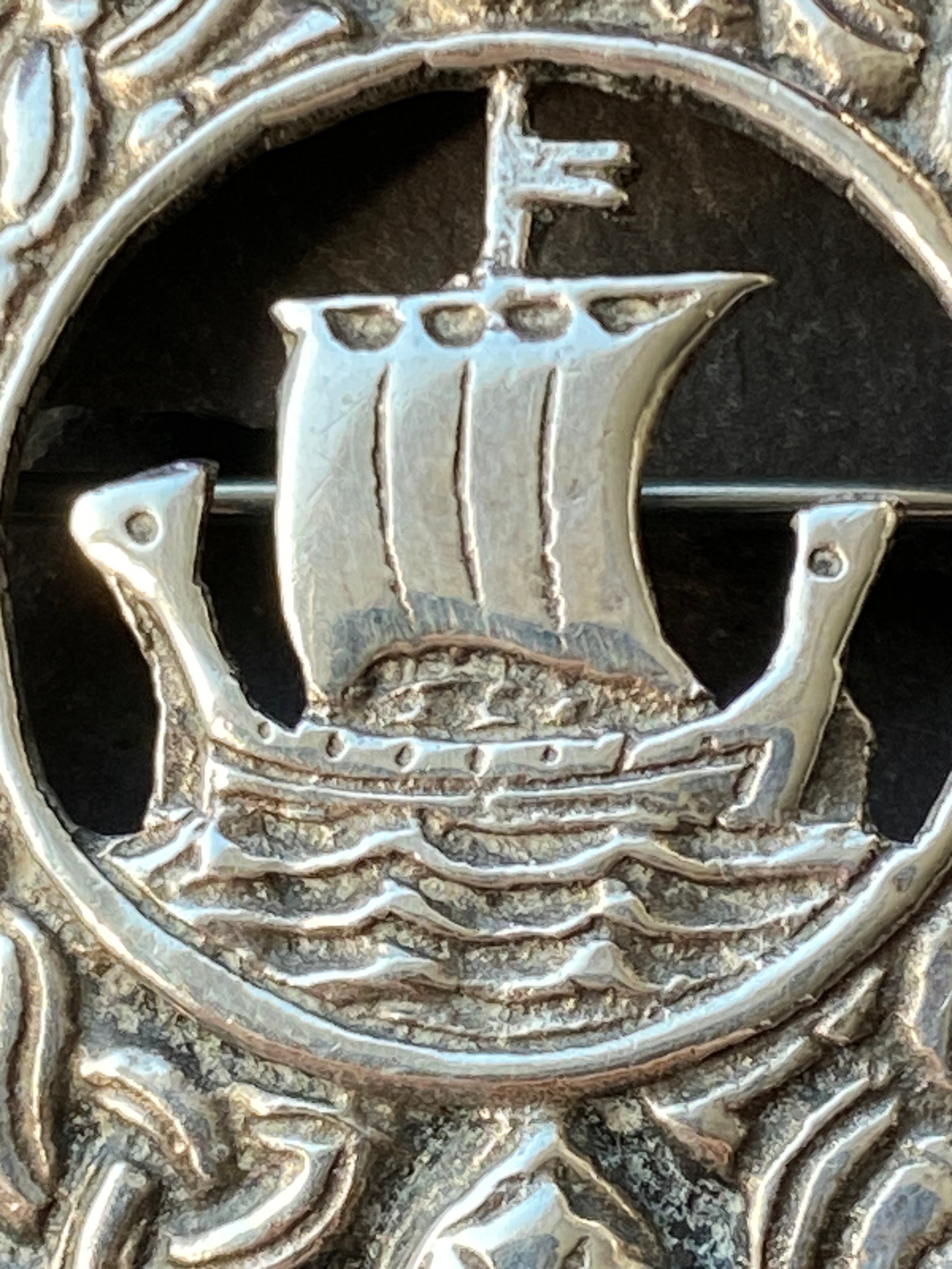 A well made brooch with a border of writhen serpents surrounding a Viking ship