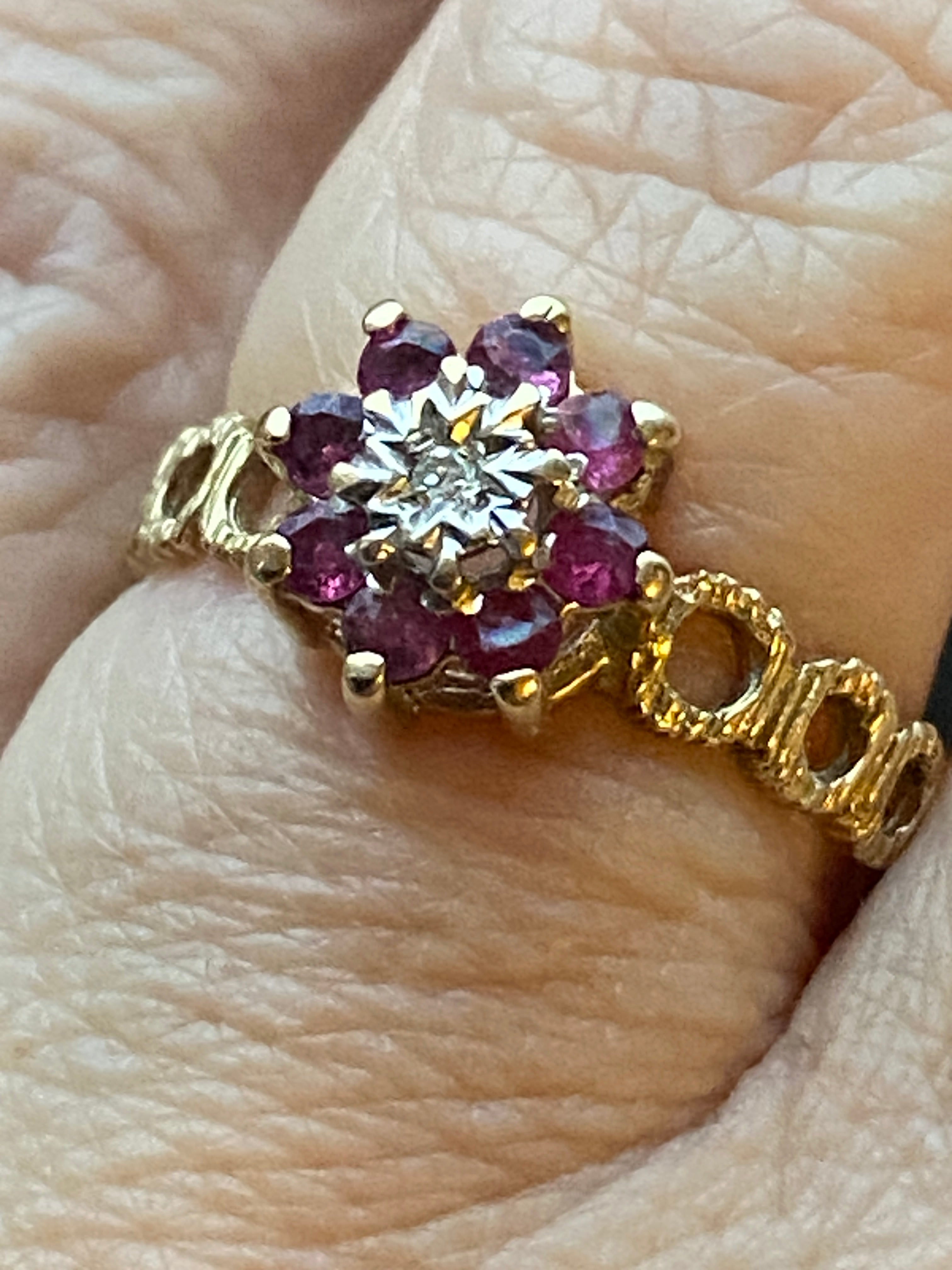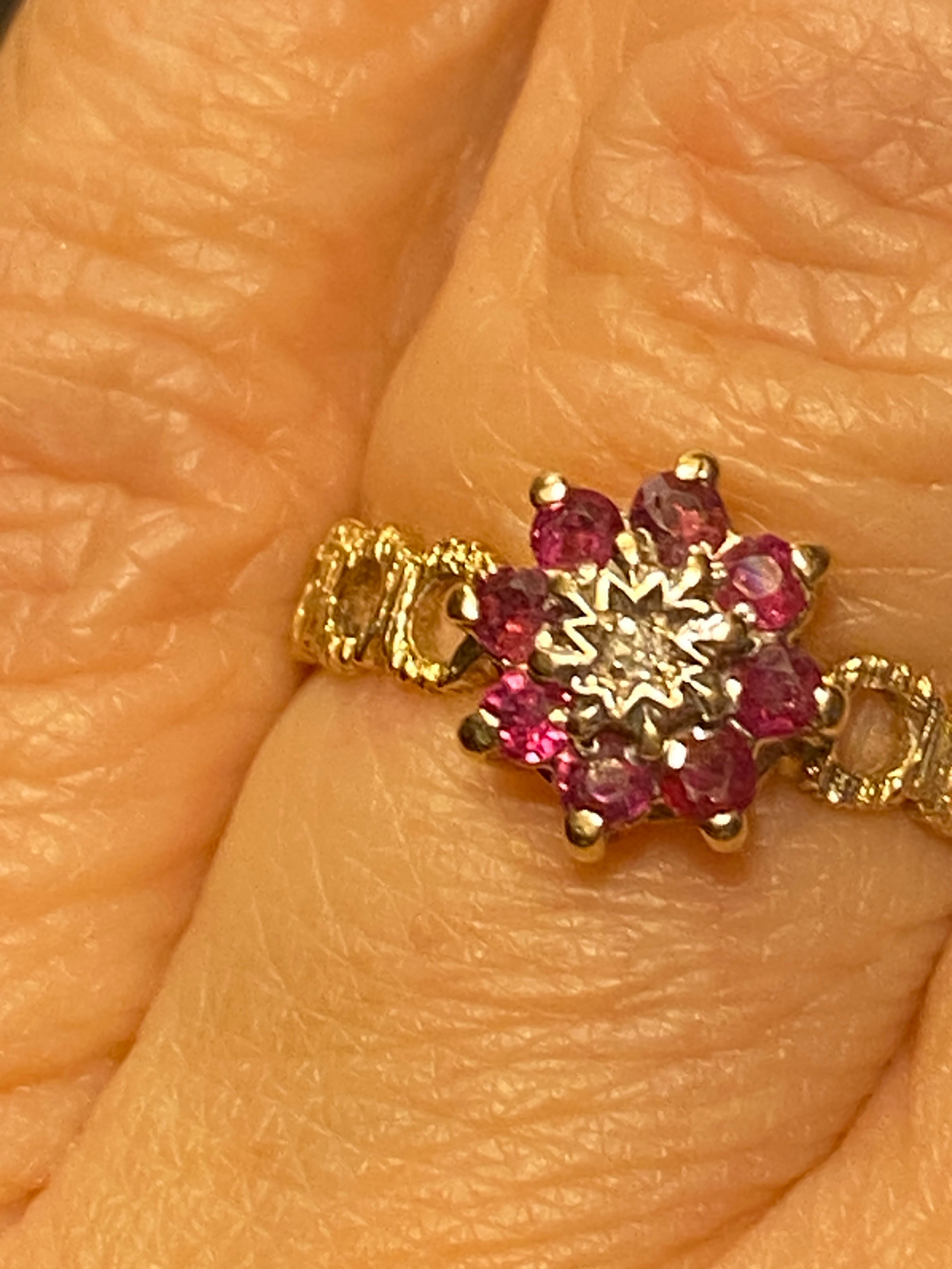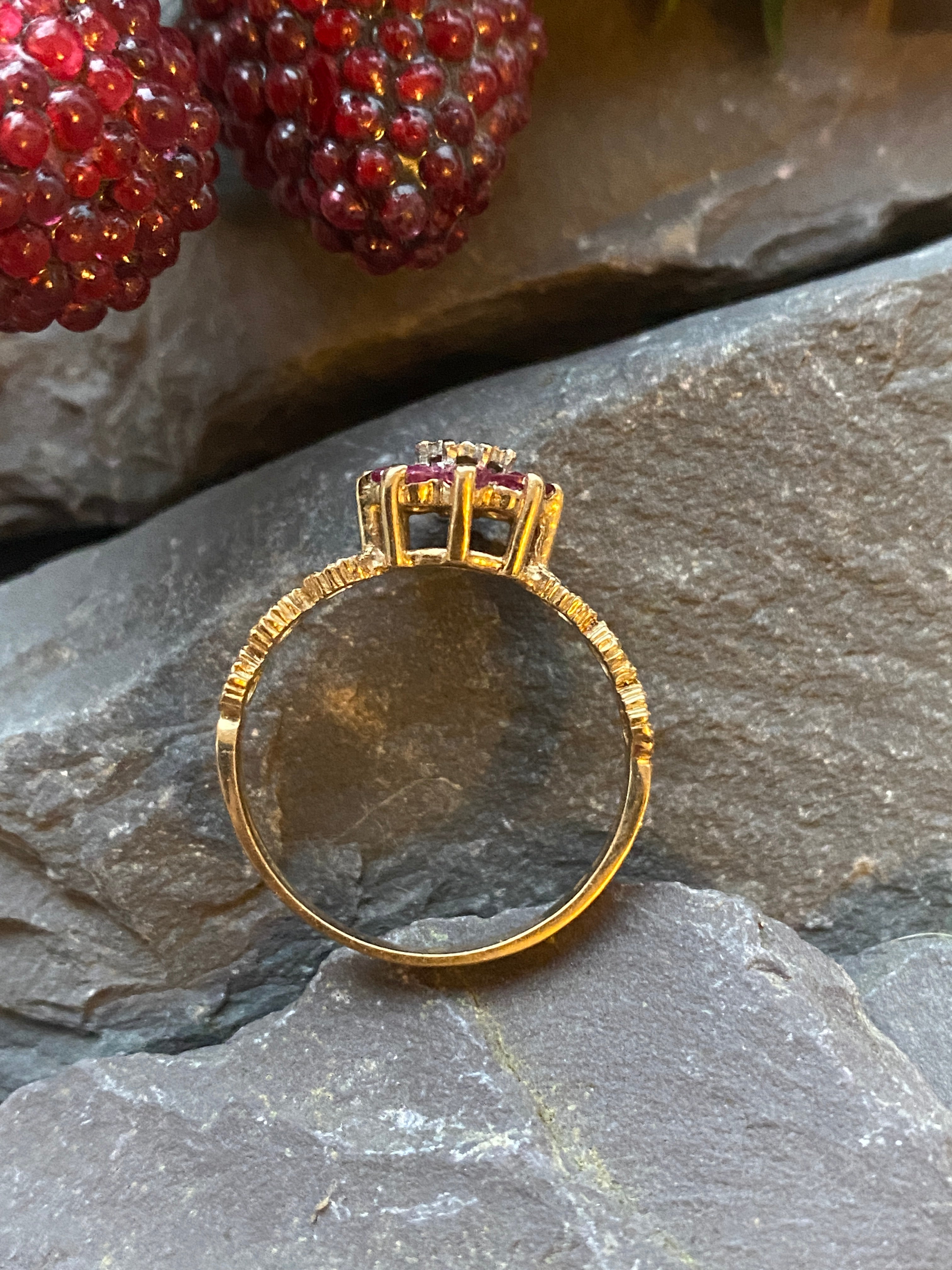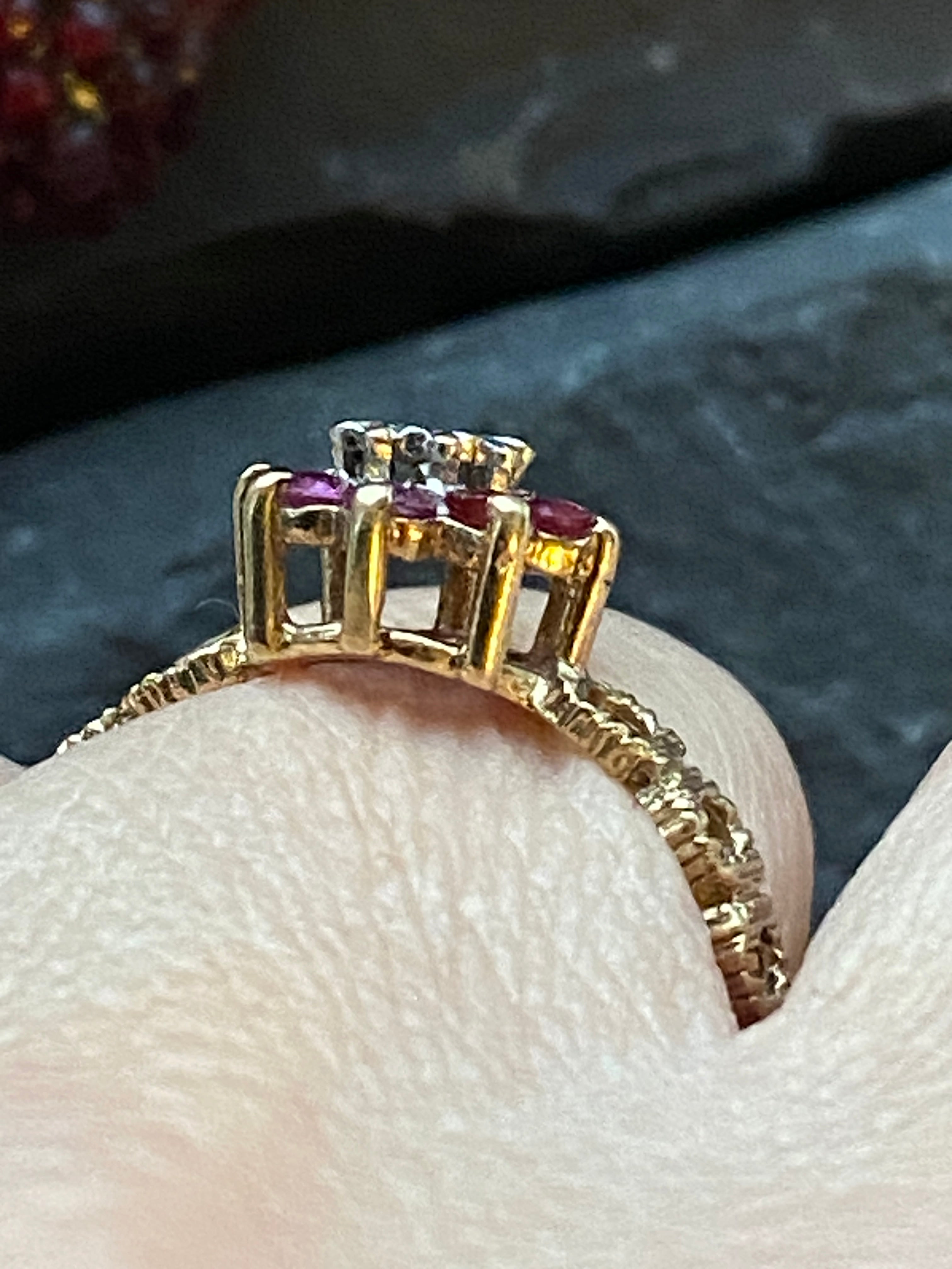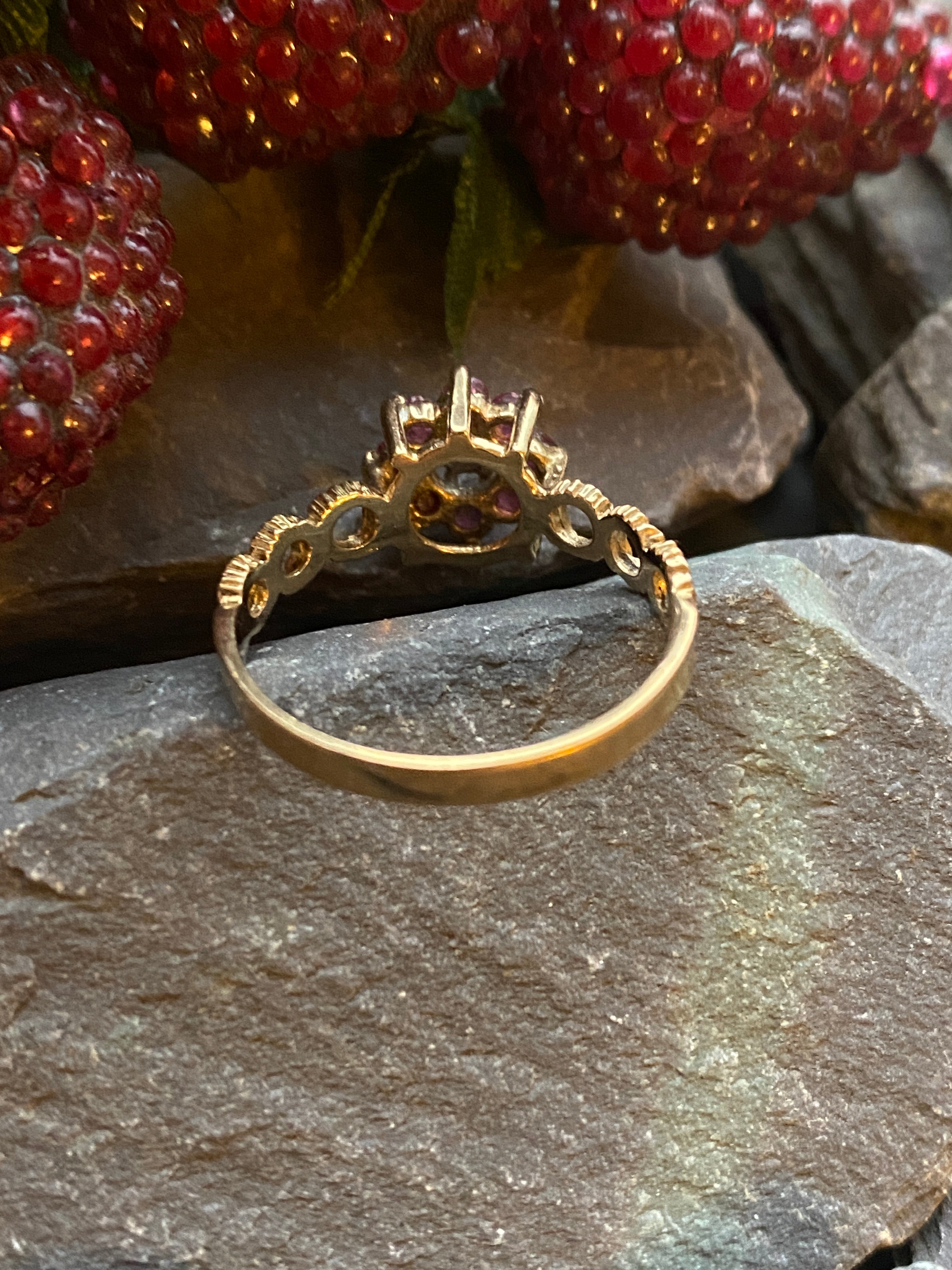 A pretty 9ct gold ring set with a cluster of Rubies with a Diamond centre.