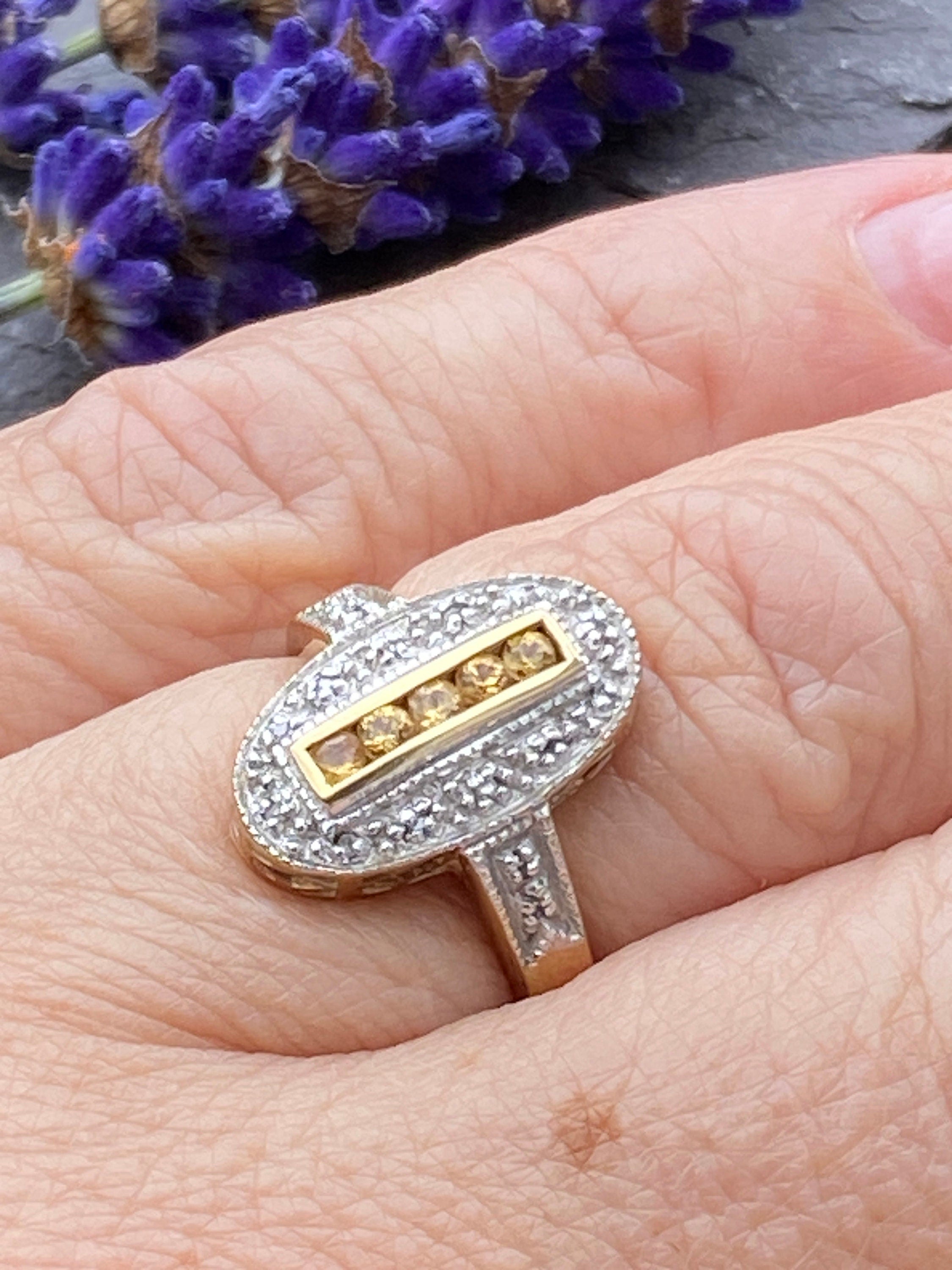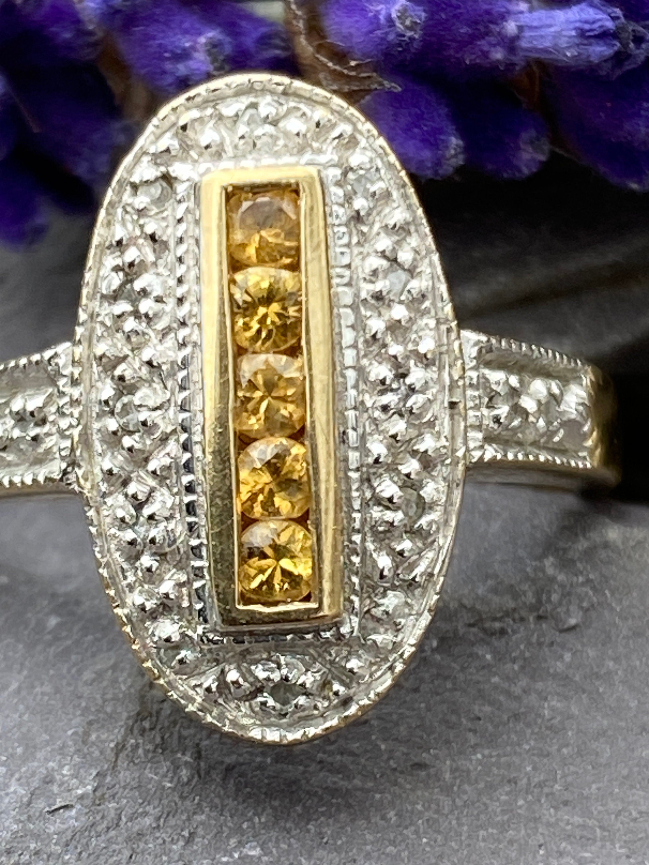 An Art Deco style ring in 9ct gold set with five round brilliant yellow sapphires surrounded by a deep Rhodium border set with eleven Round brilliant Diamond accents and two further Diamonds to the shoulders.