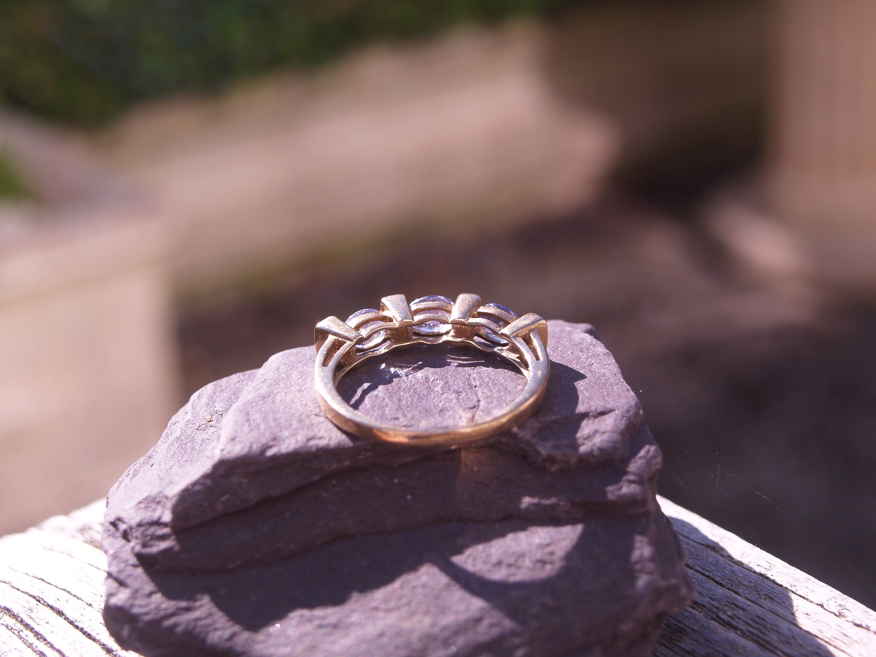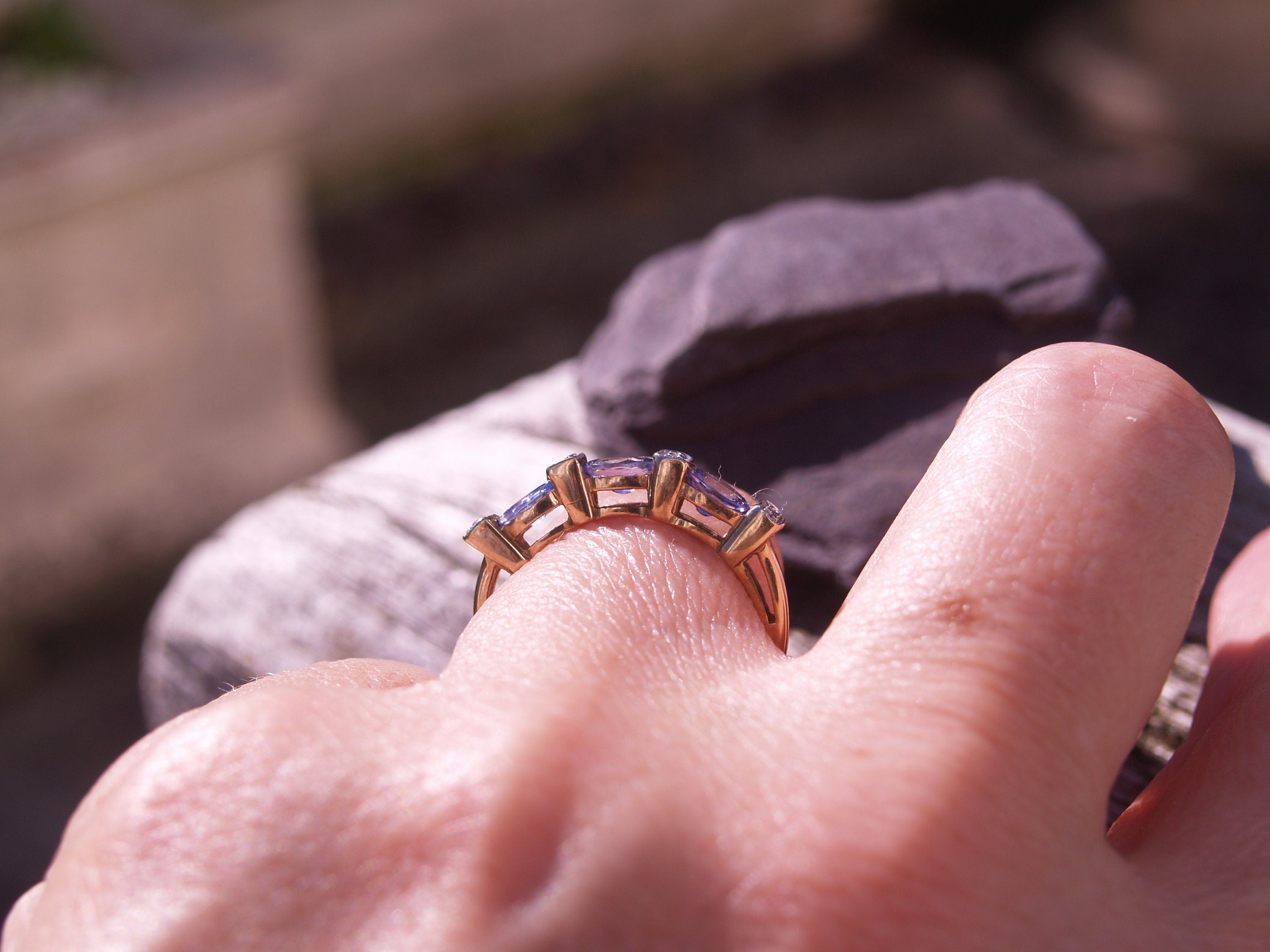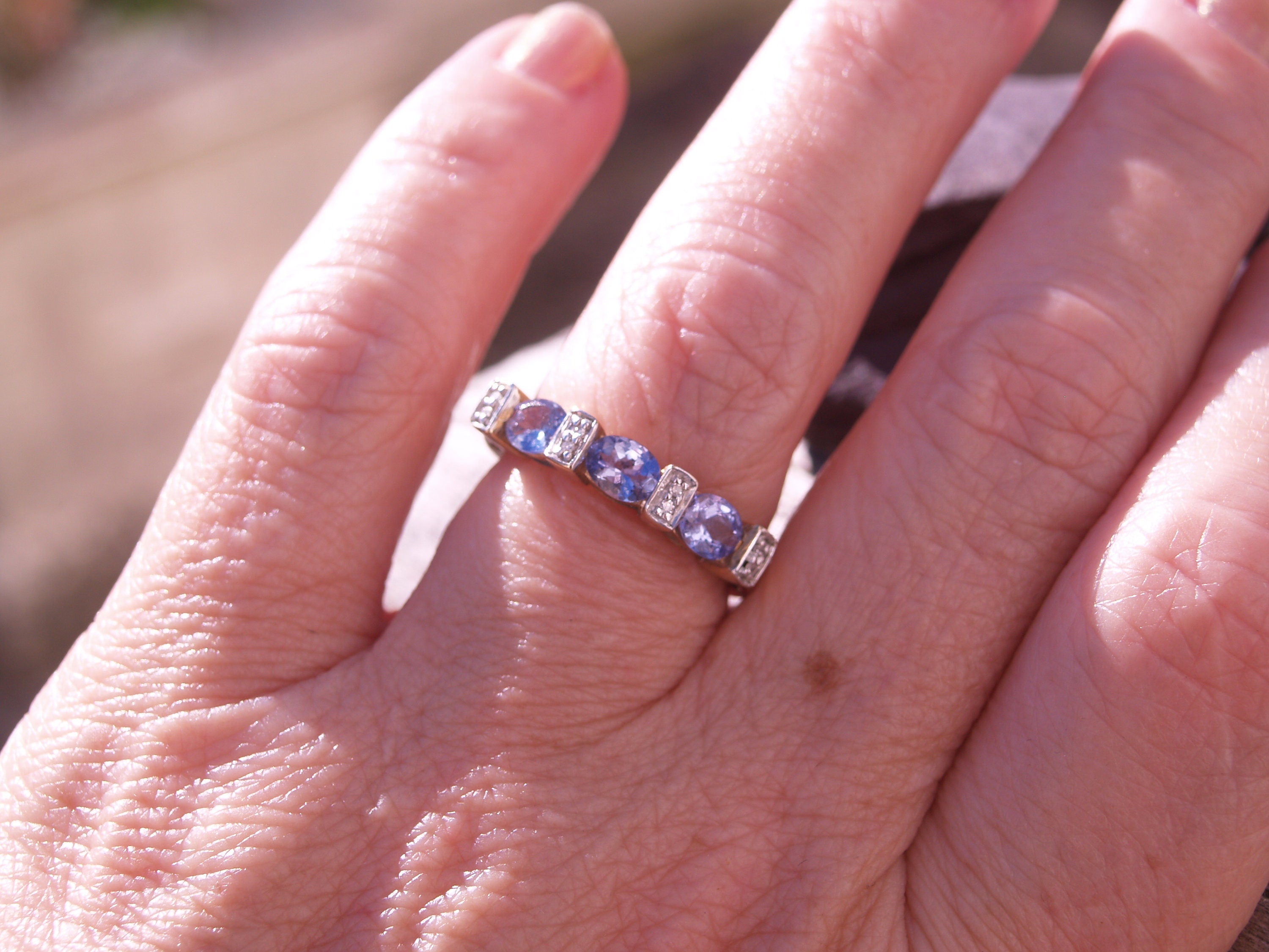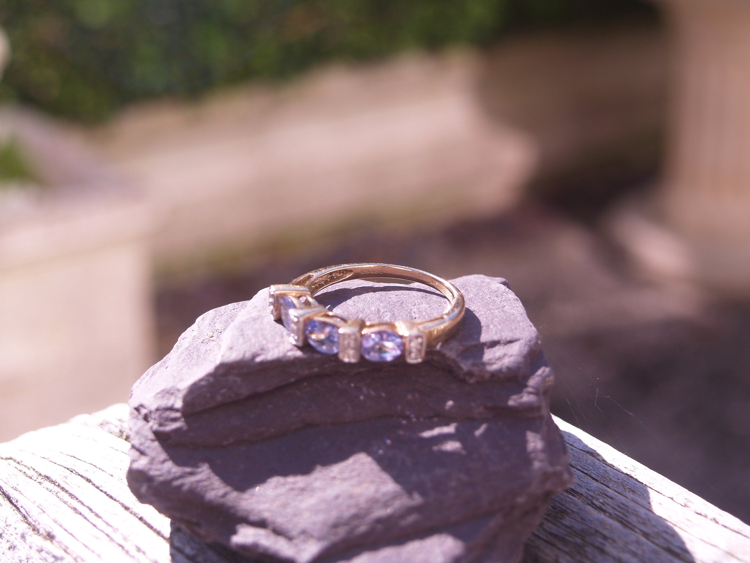 A beautiful 9ct gold ring set with three oval brilliant Tanzanites separated by four rows of two small diamonds.