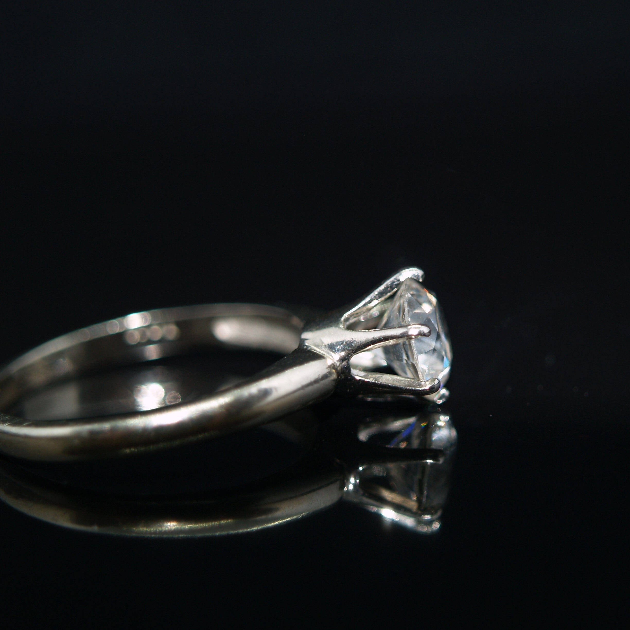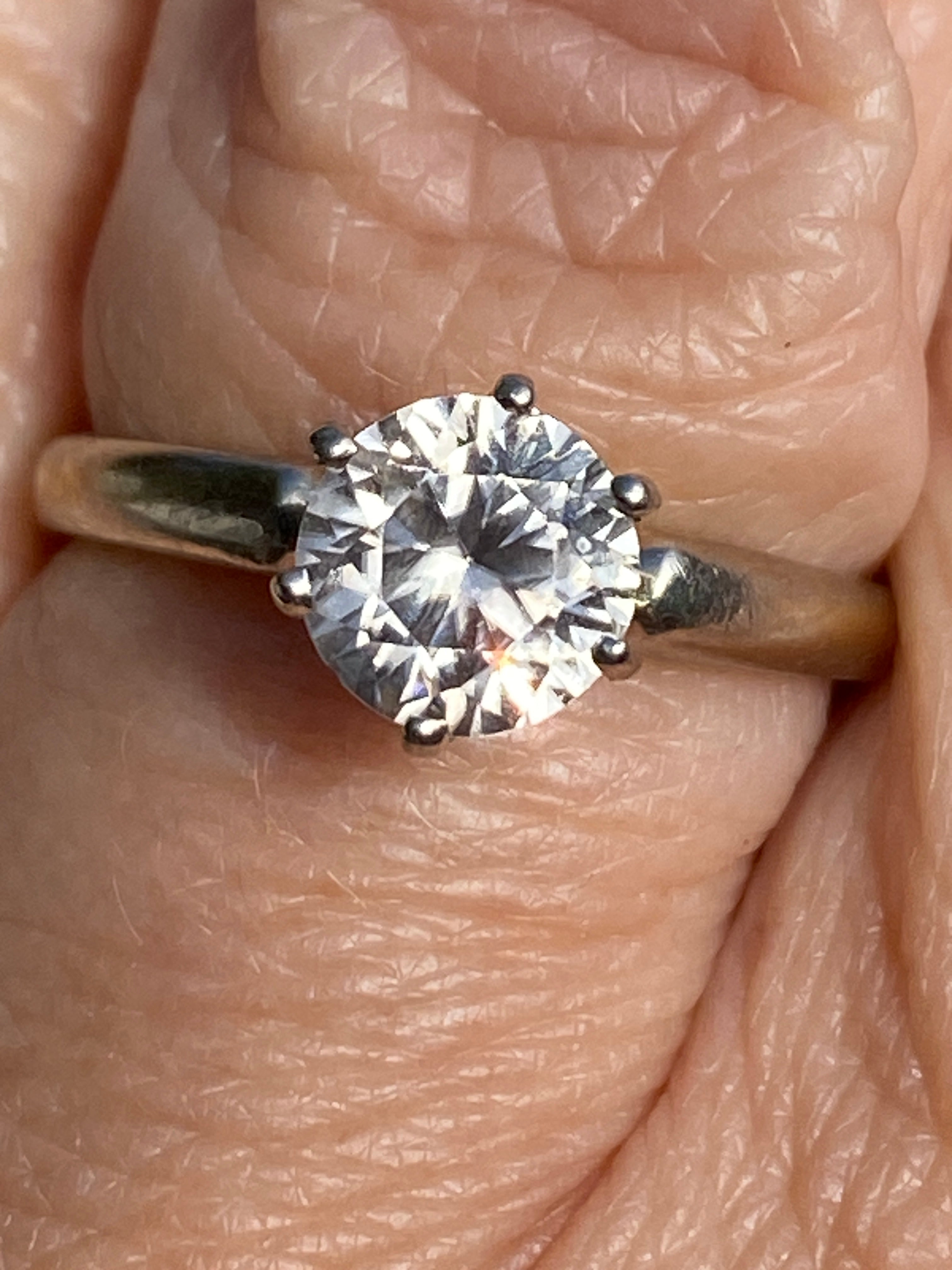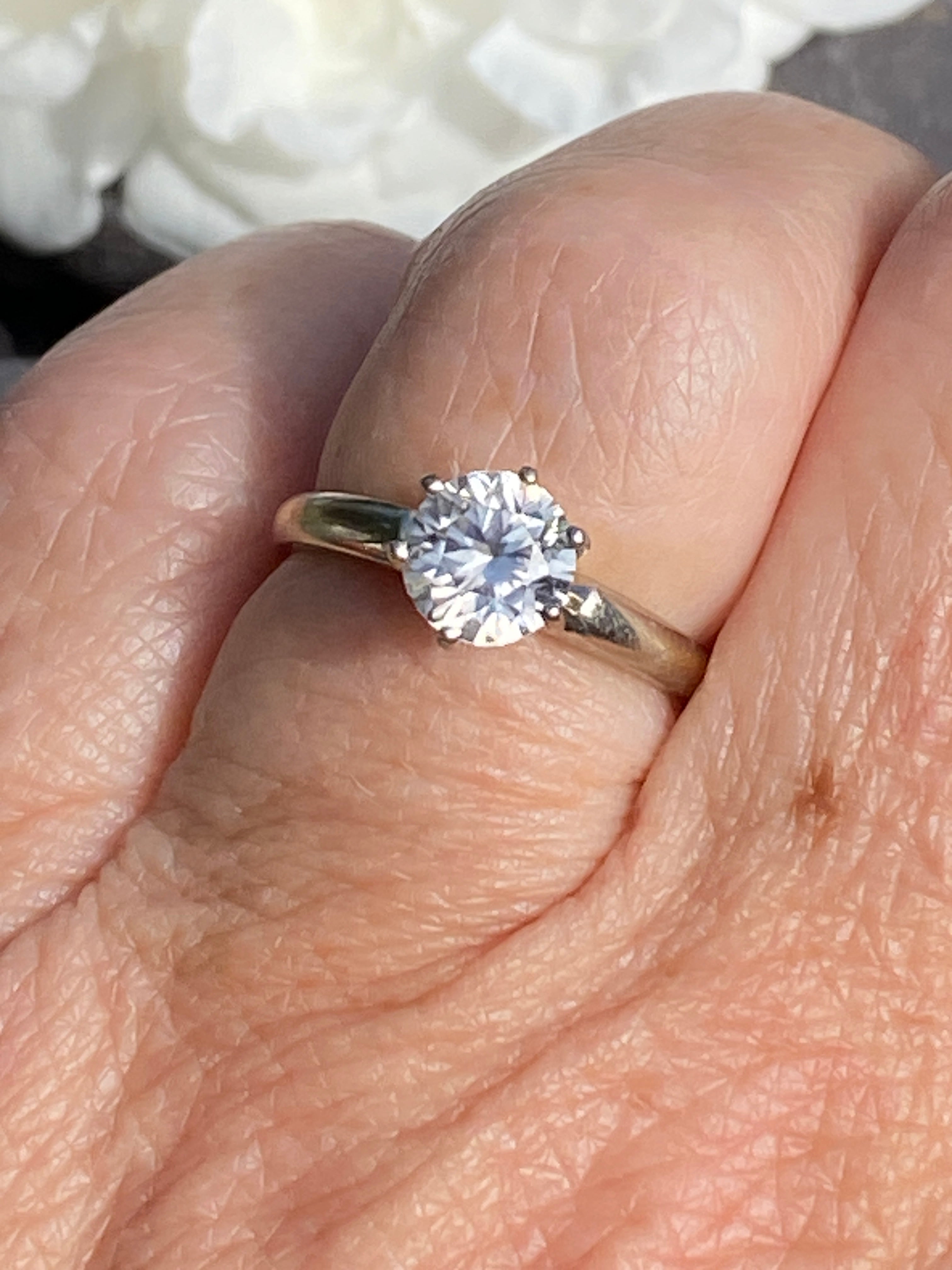 A stunning solitaire ring in 10 carat white gold set with a naturally occurring Zircon.Not to be confused with a manmade Cubic Zirconia.The white Zircon sparkles beautifully and...