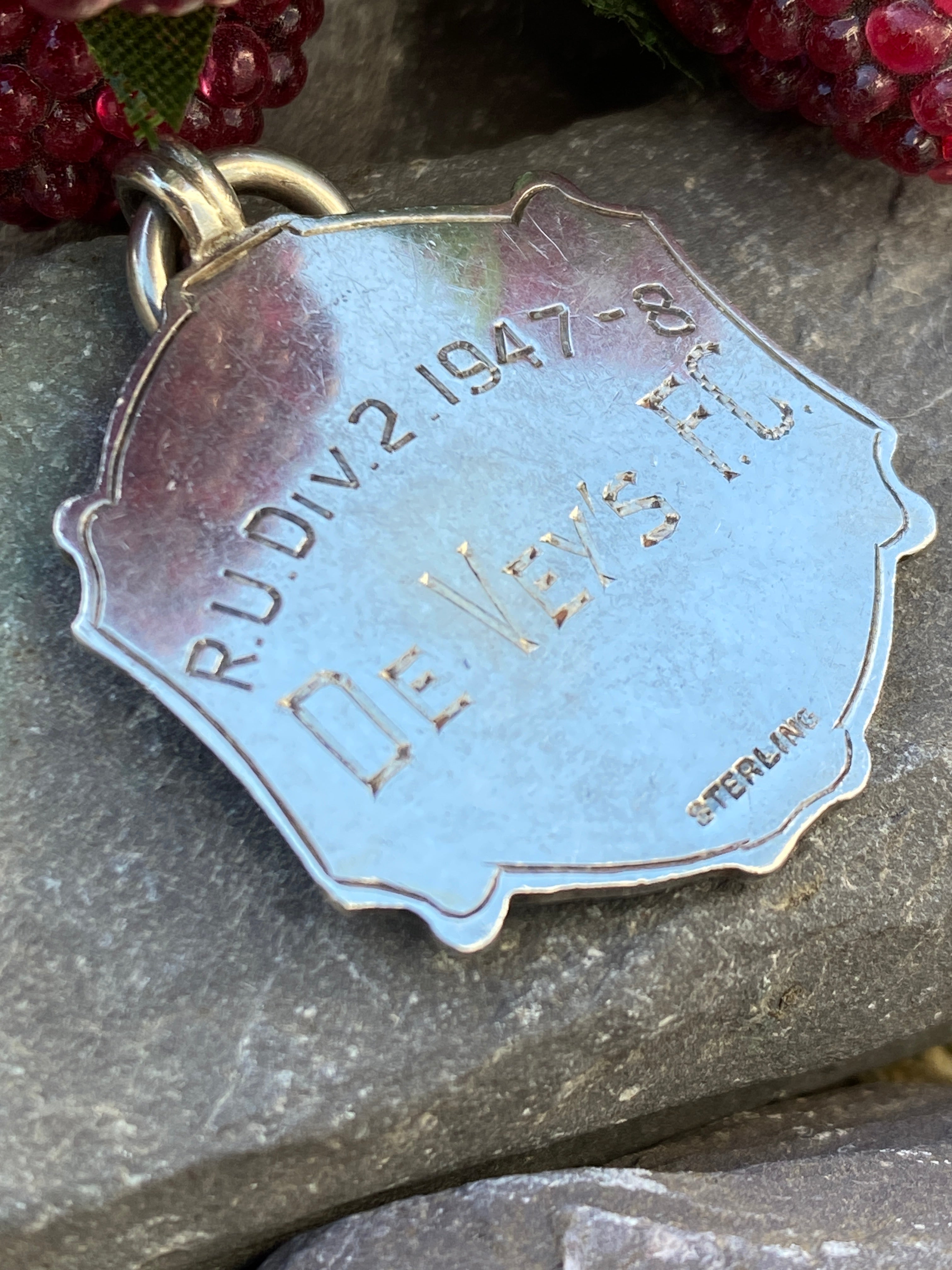 A sterling silver sporting trophy medal/fob for Bristol and Suburban Association Football League.Silver and enamel.Stamped sterling. Measures 37mm totalInscribed to De Veys FC. RU Division 2. 1947/8In very...