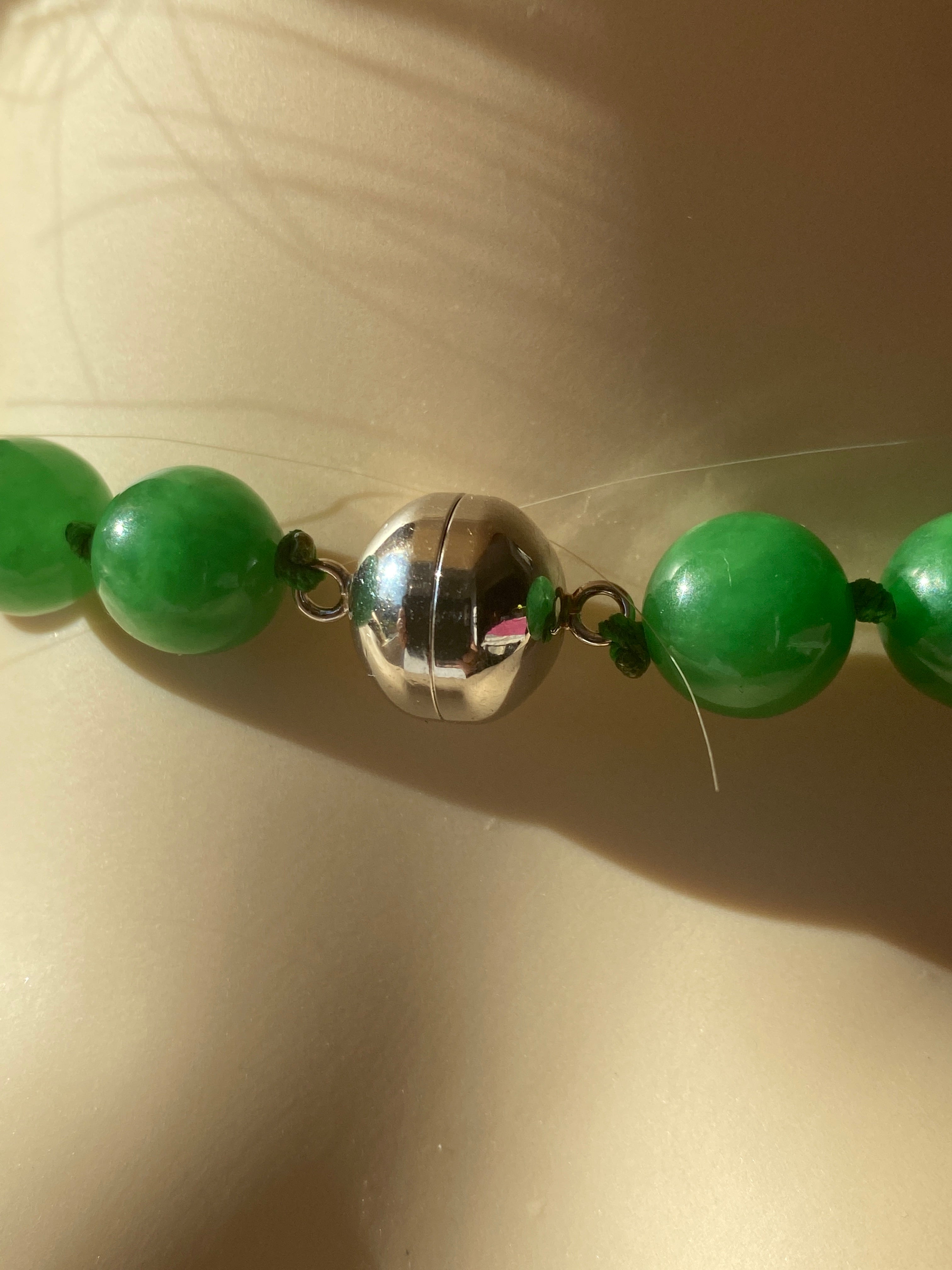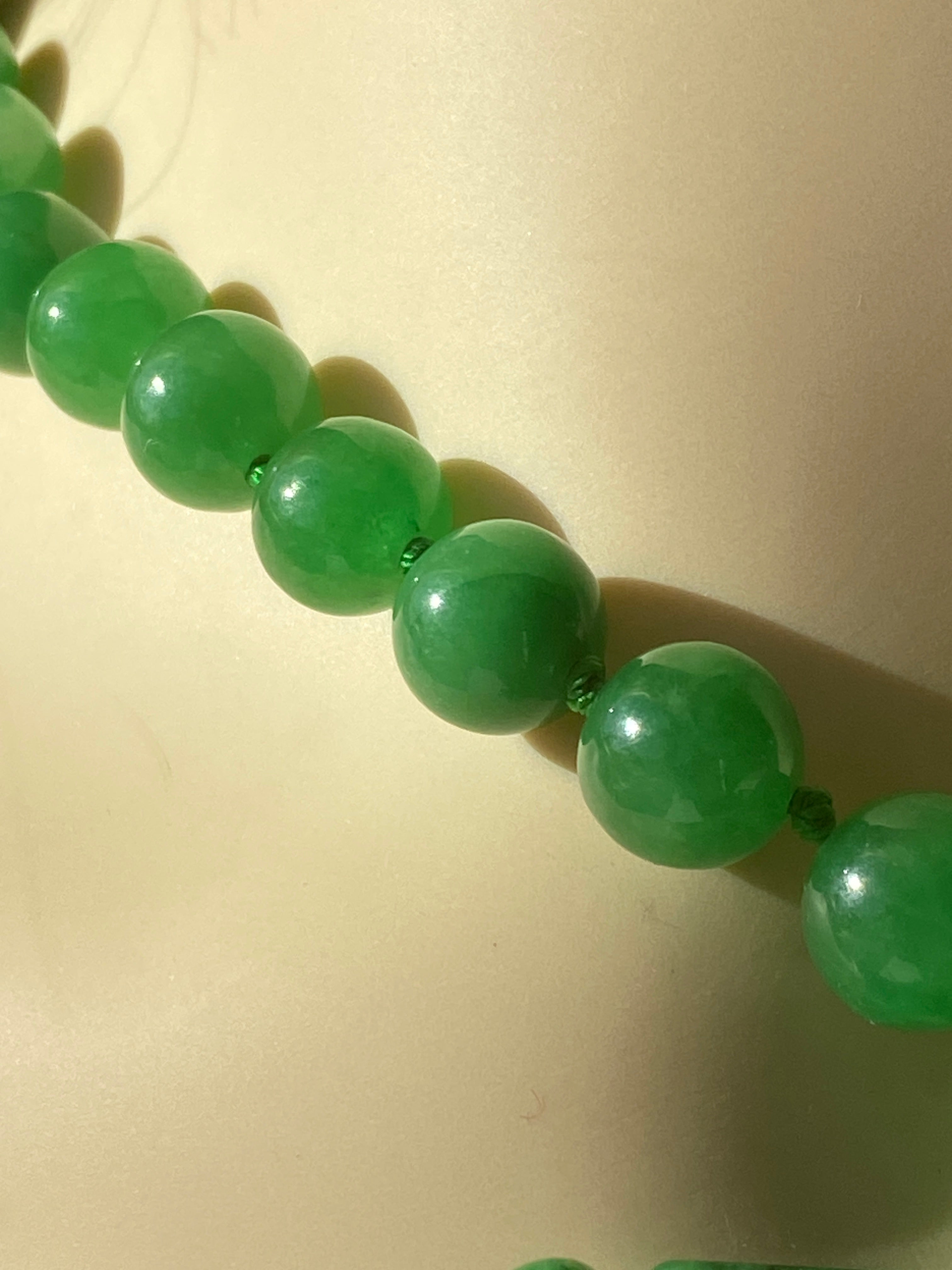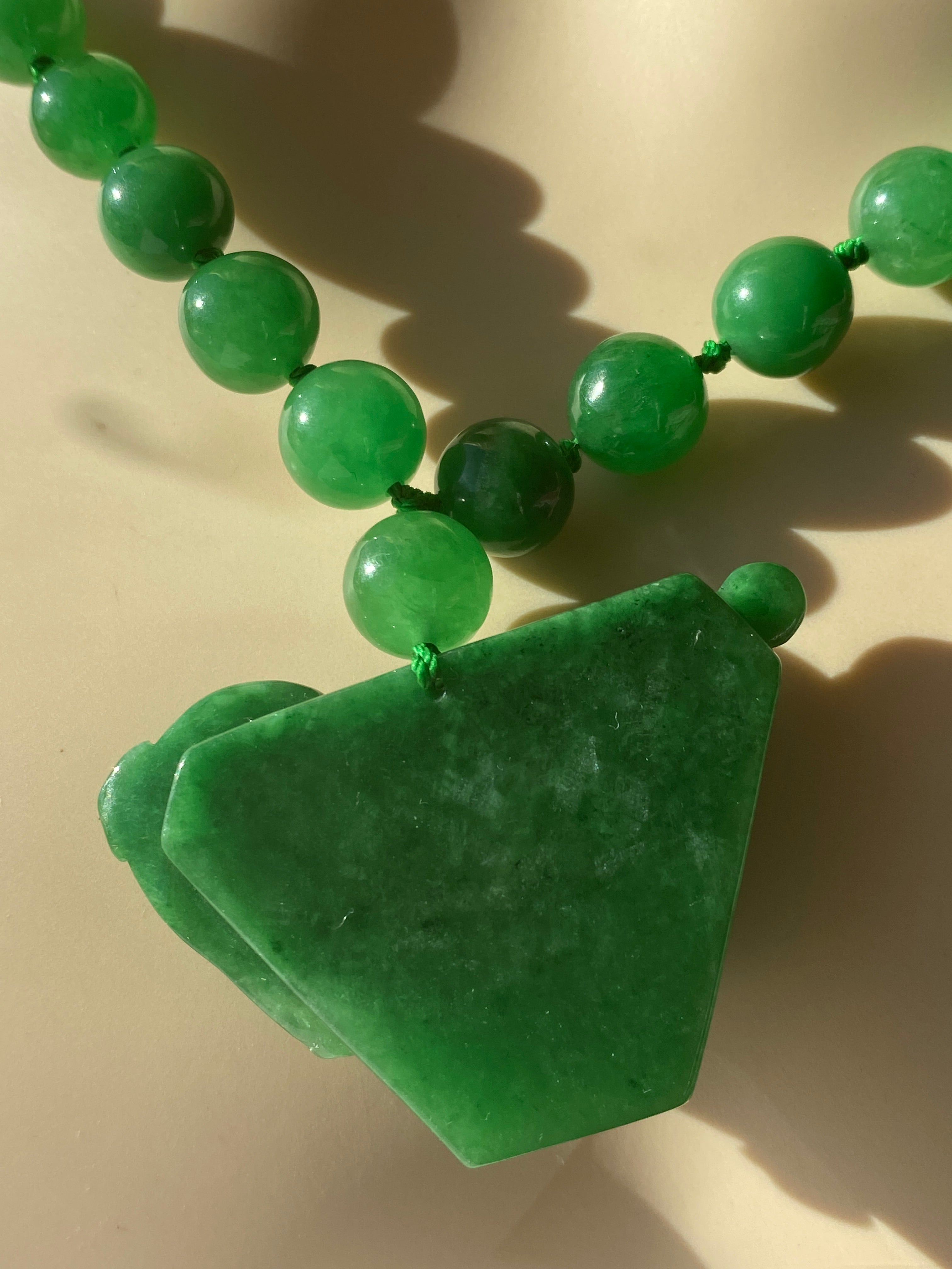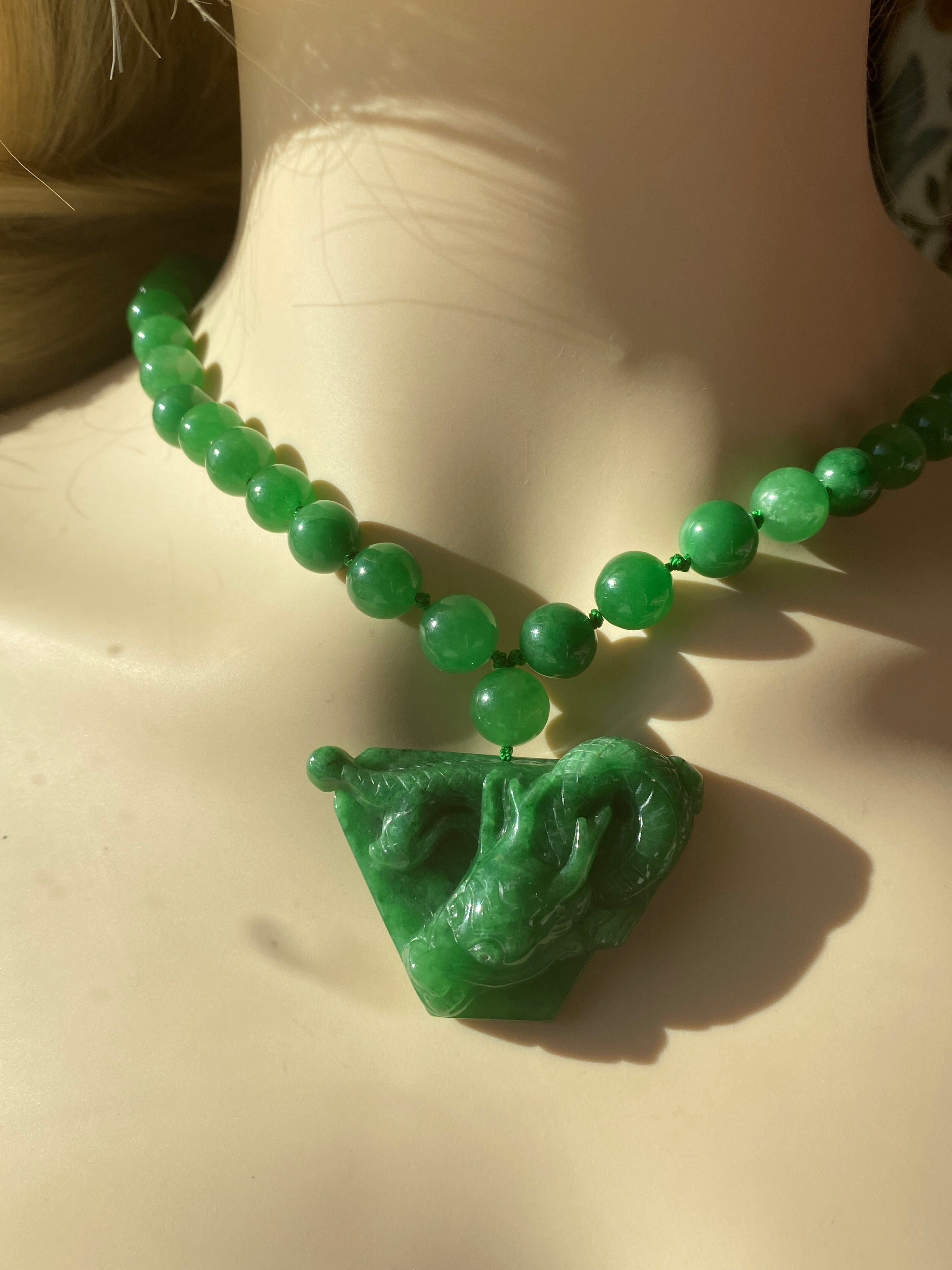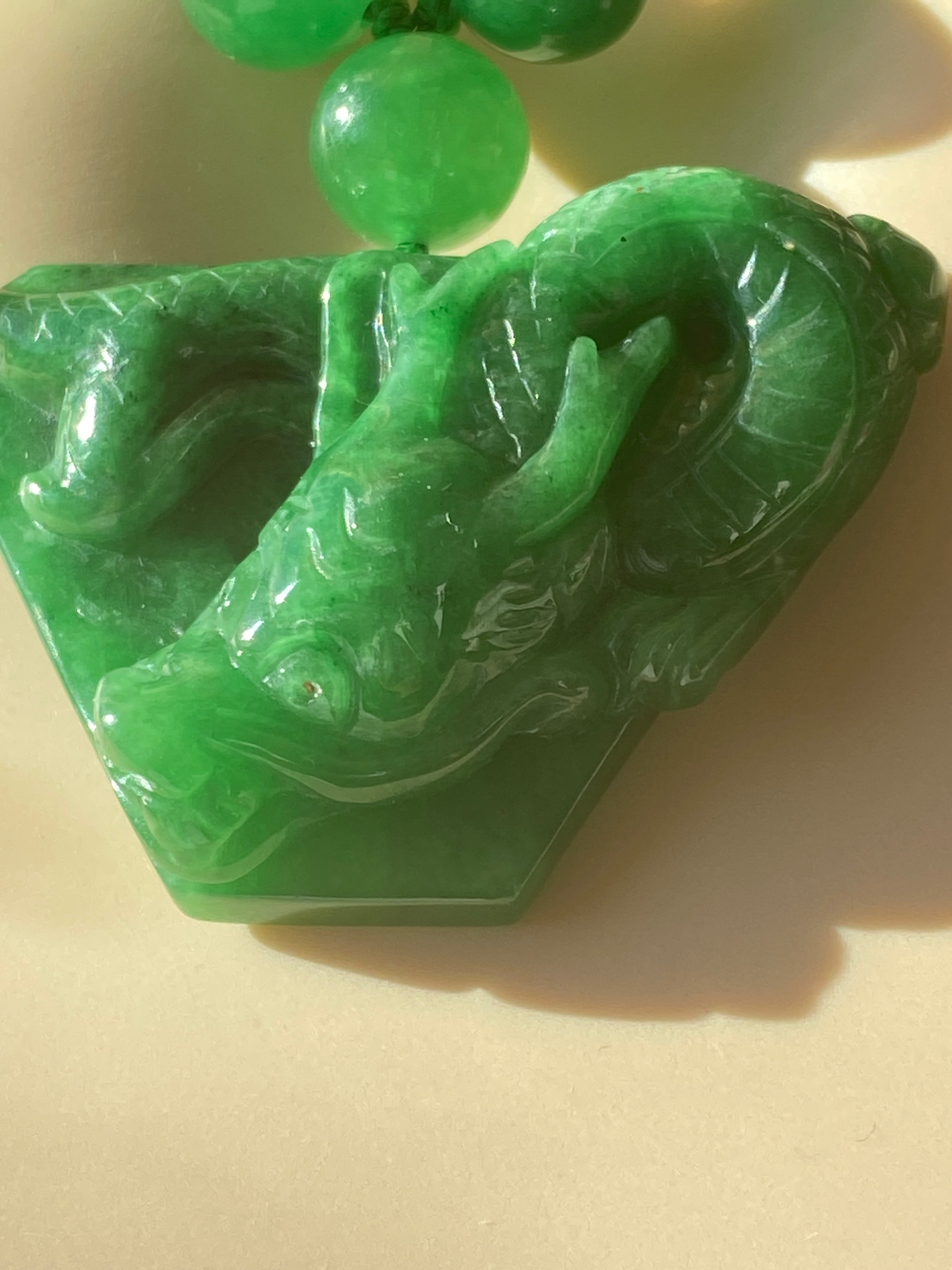 A beautiful carved Jade pendant featuring a coiled Dragon suspended from a string of pea green Jade beads.