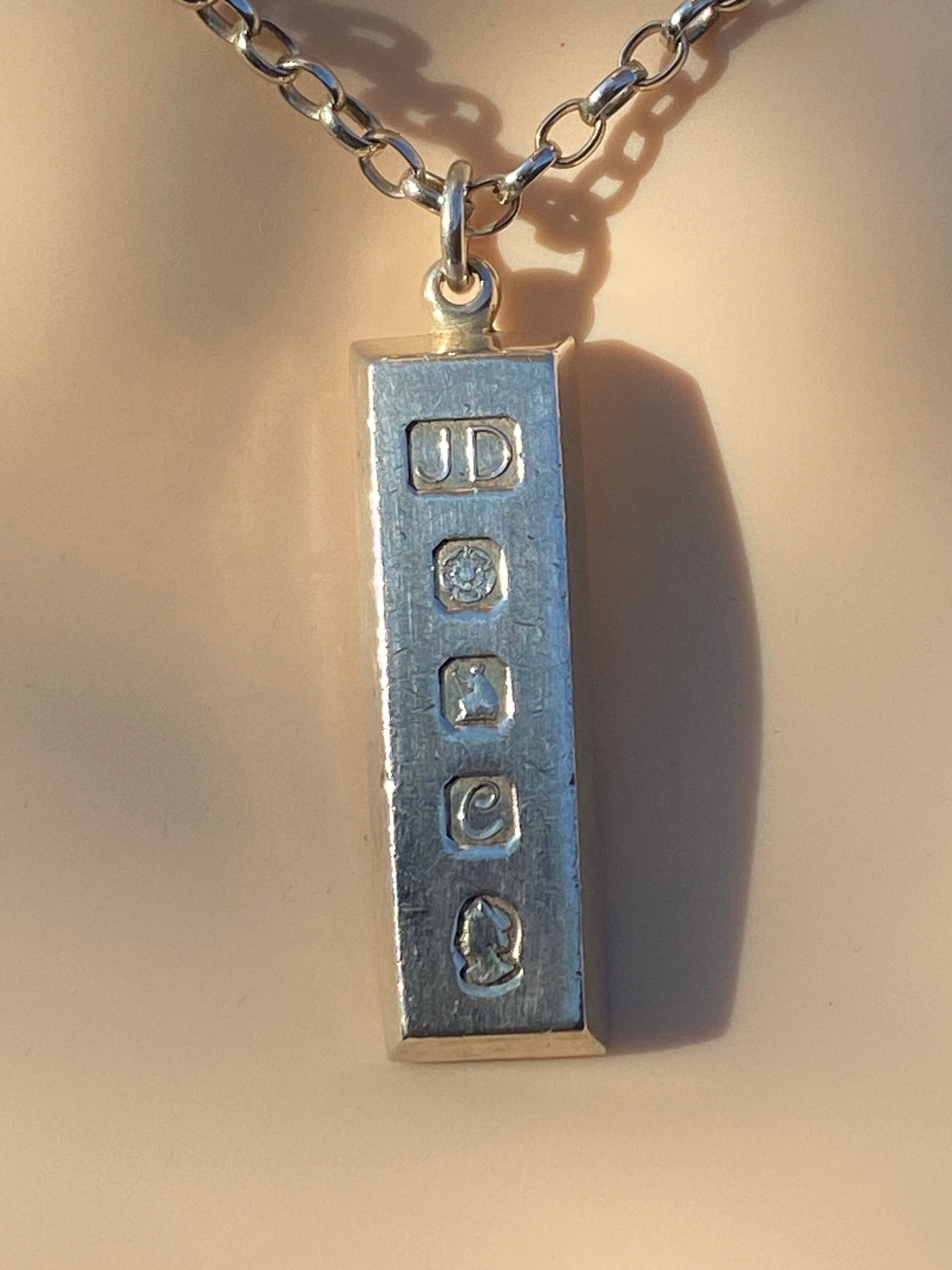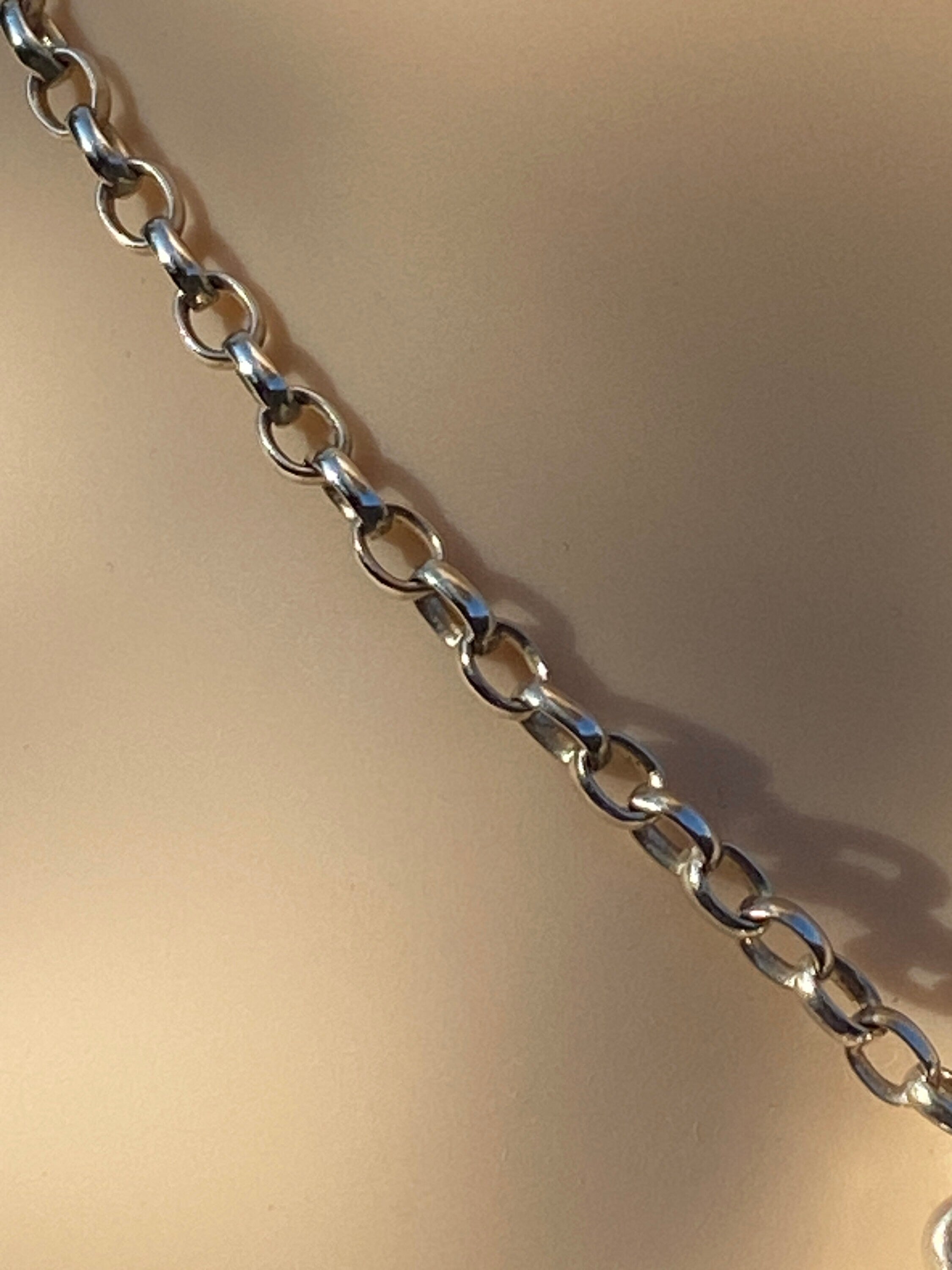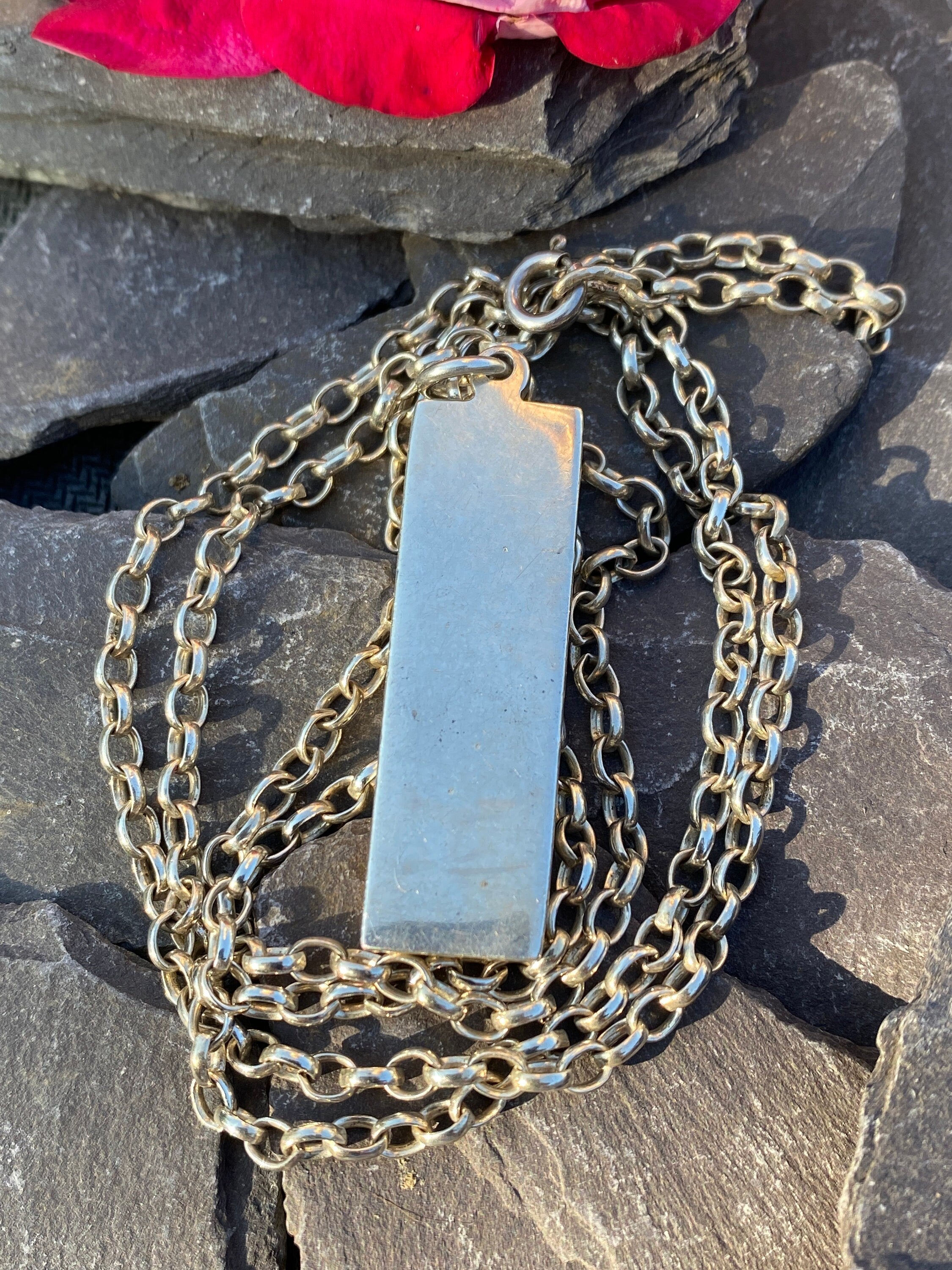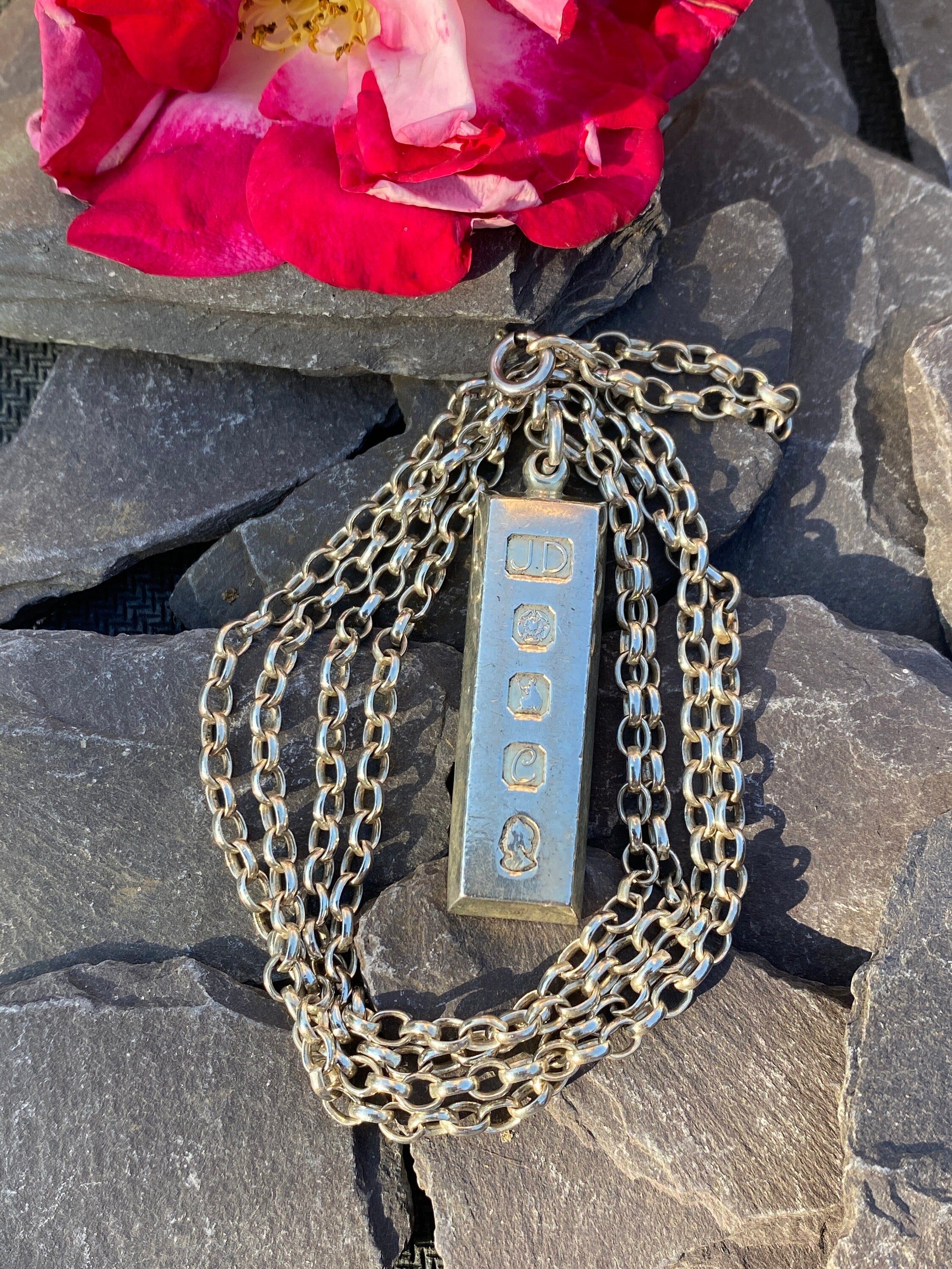 Suspended from a generous 30 inch belcher chain in sterling silver with bolt ring clasp