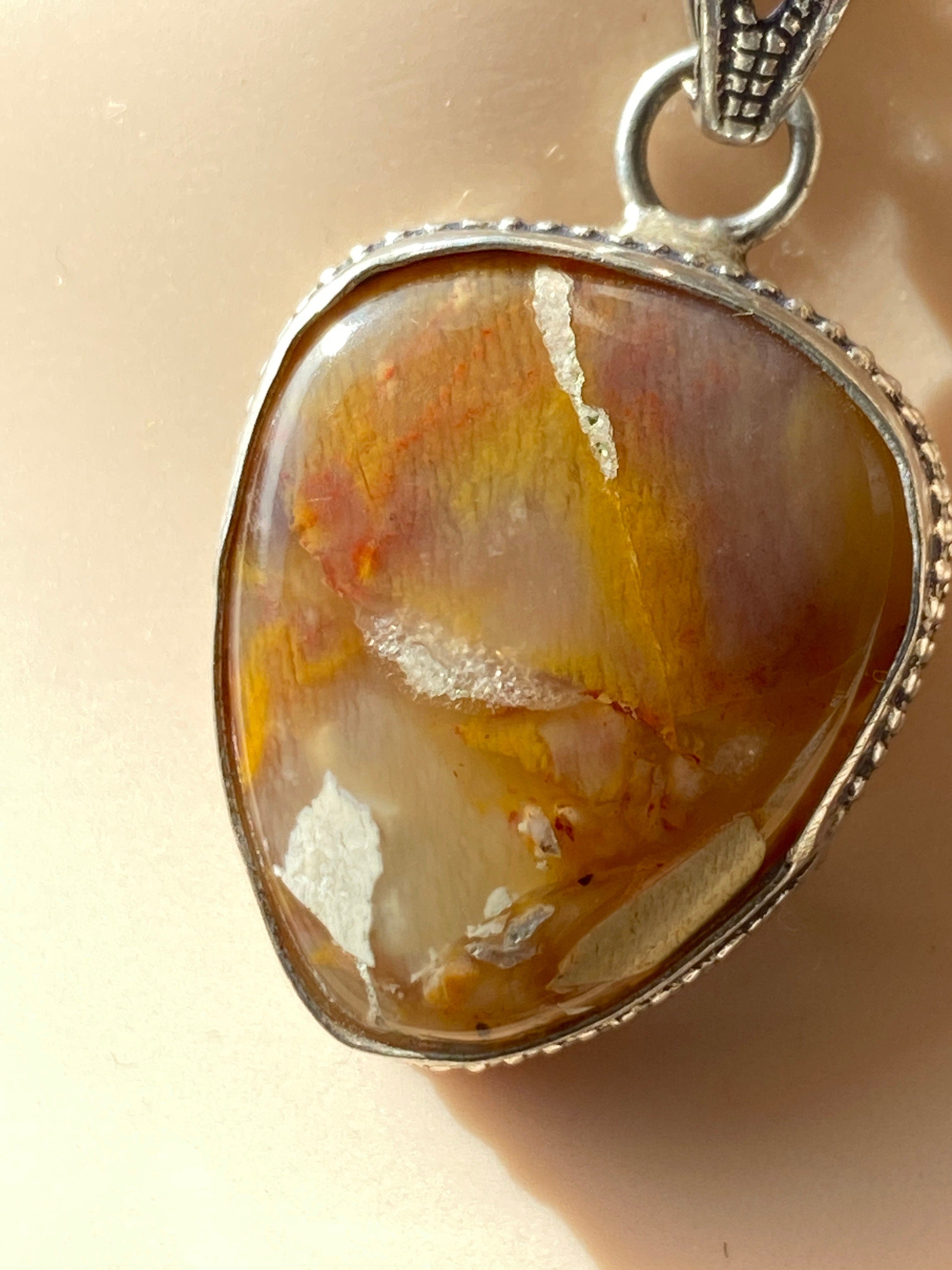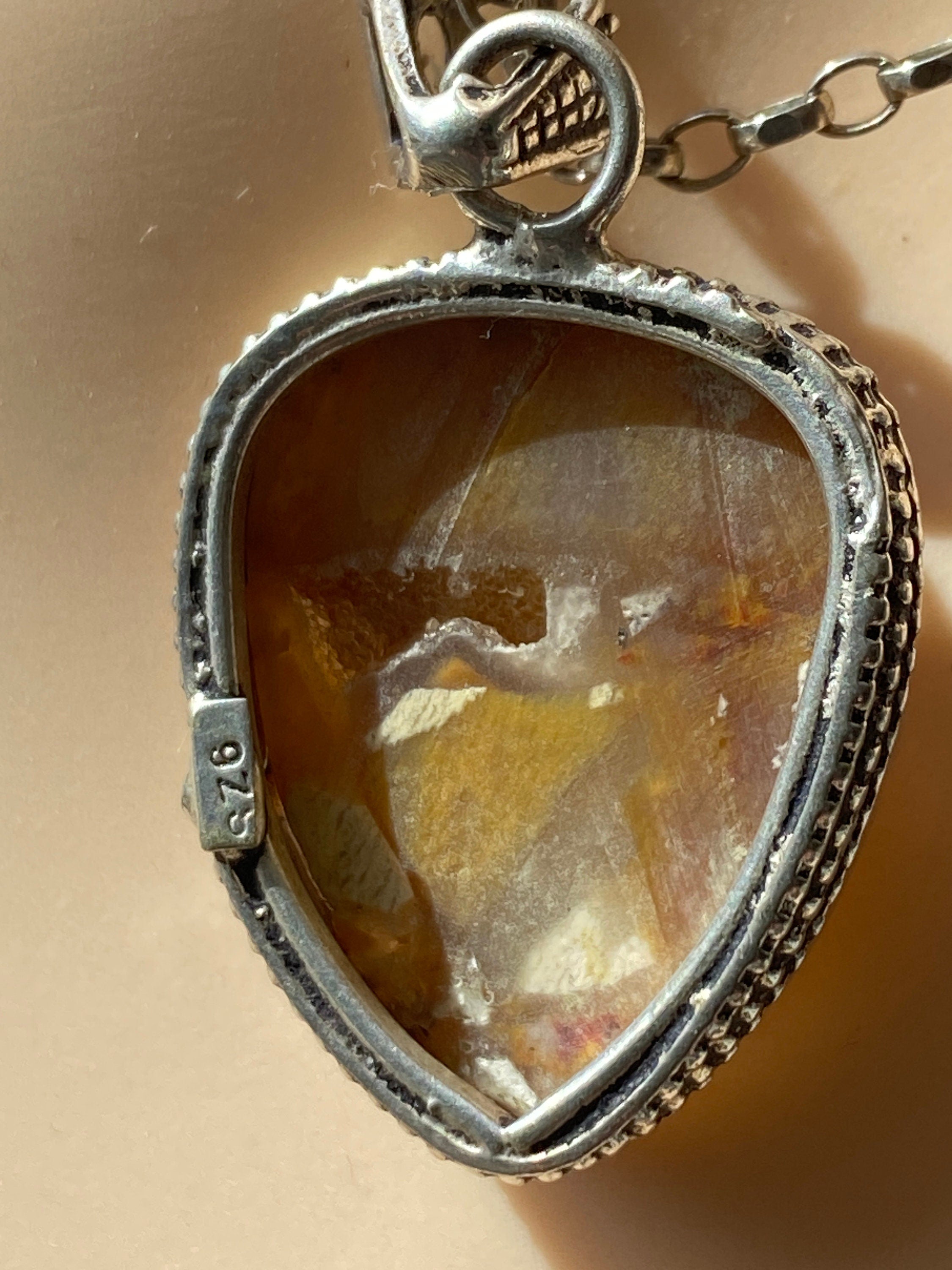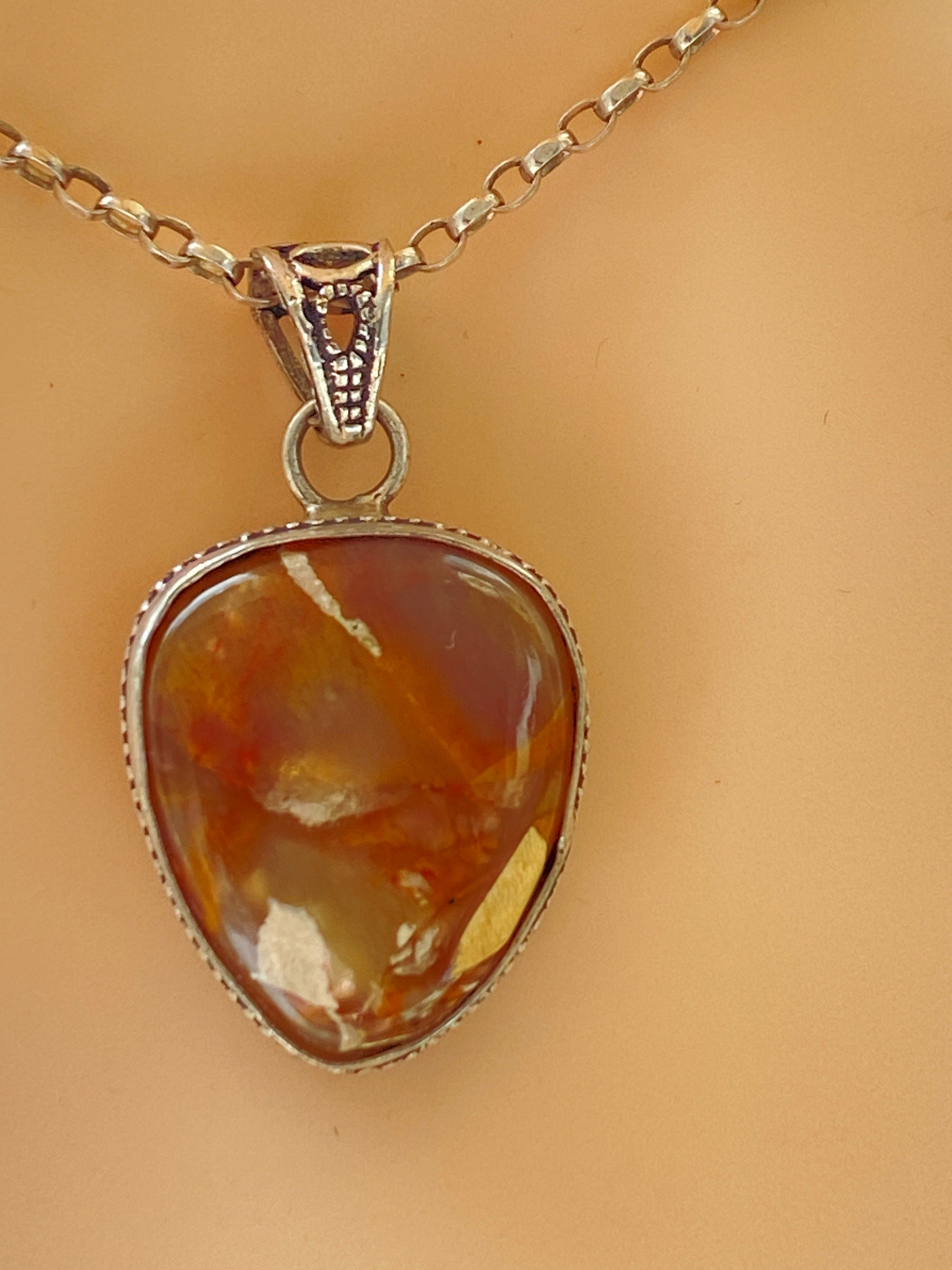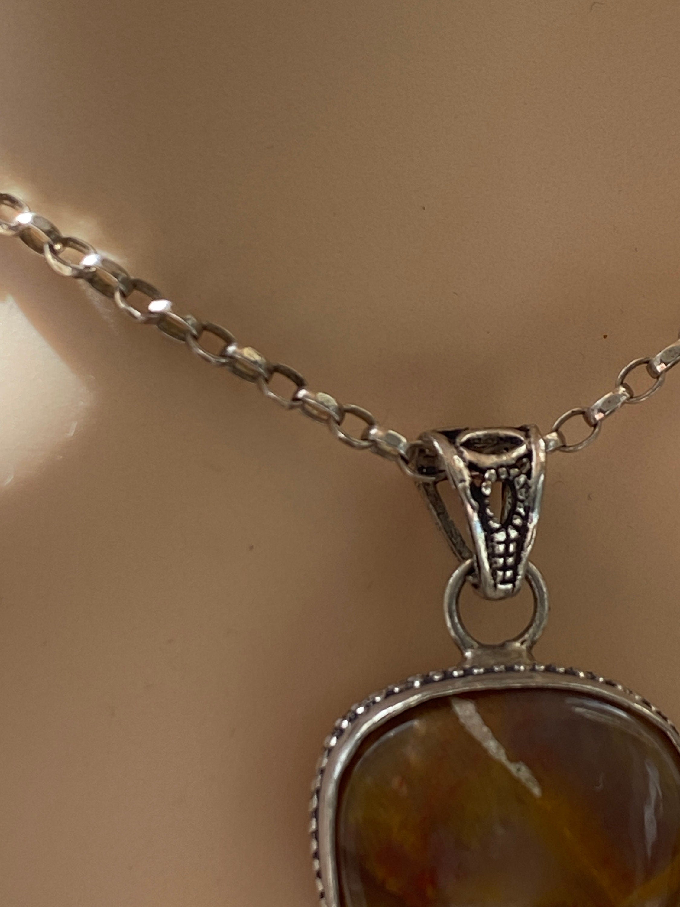 A beautiful piece of polished natural agate set in sterling silver and suspended on a very long faceted curb chain