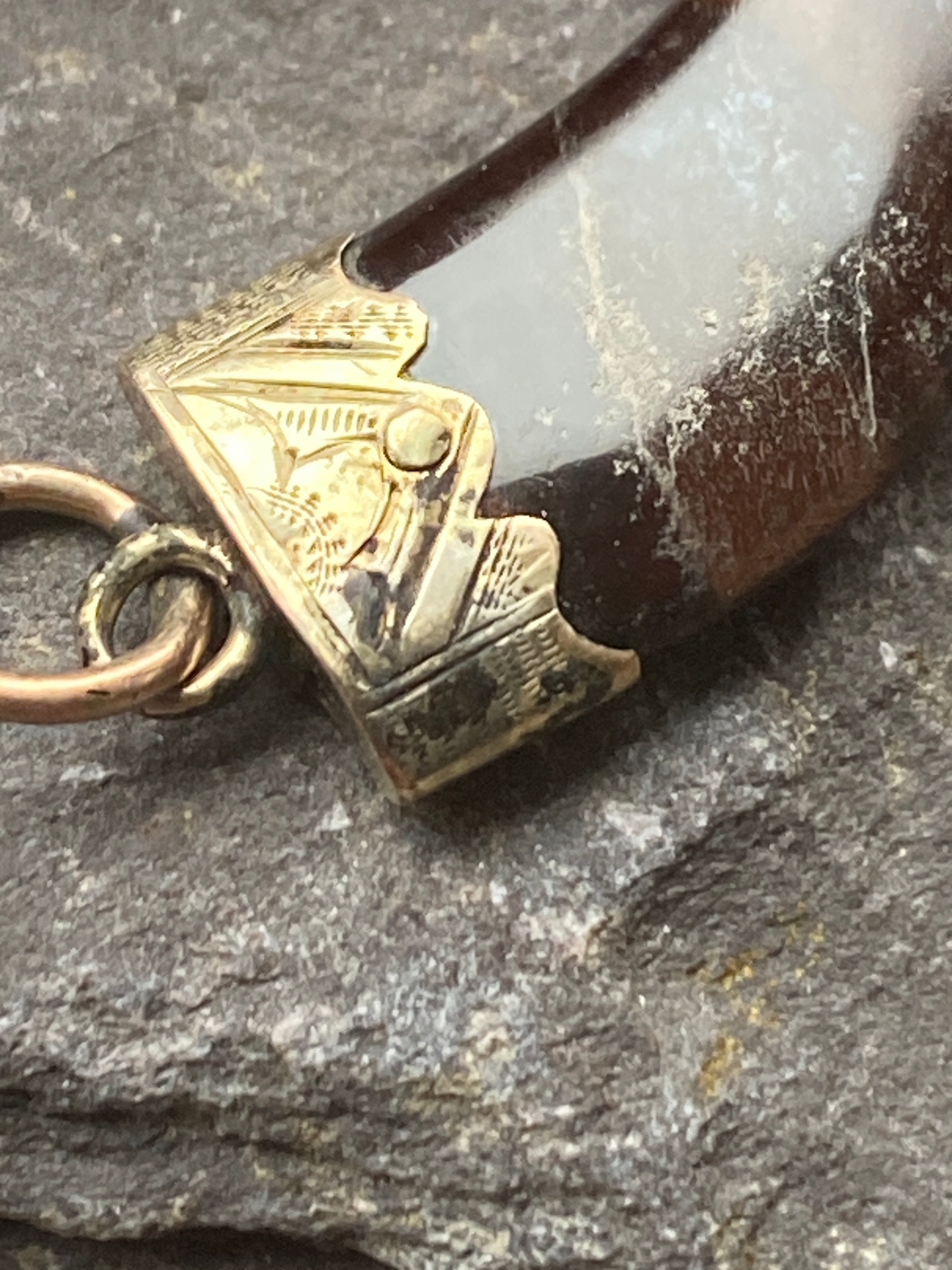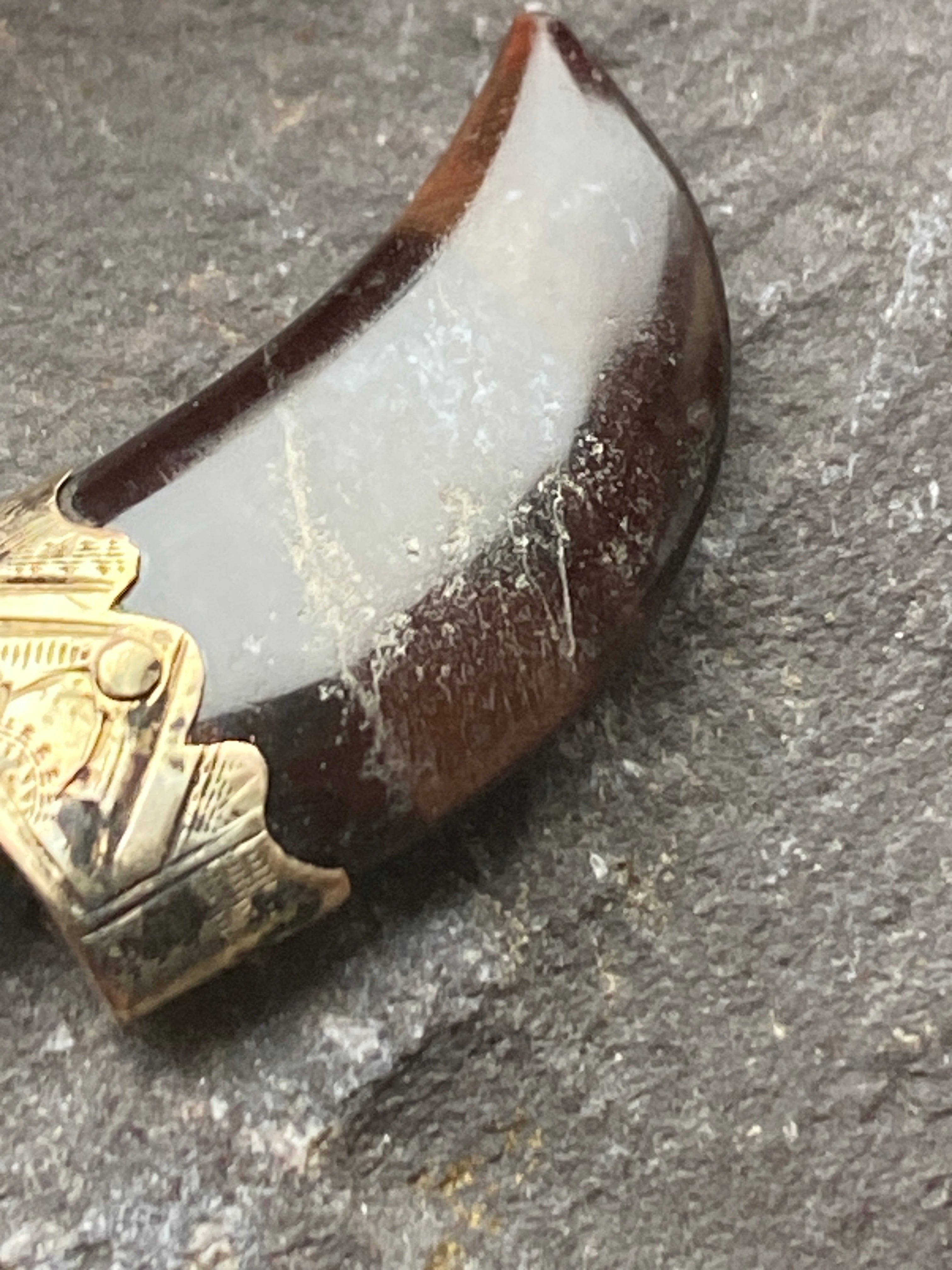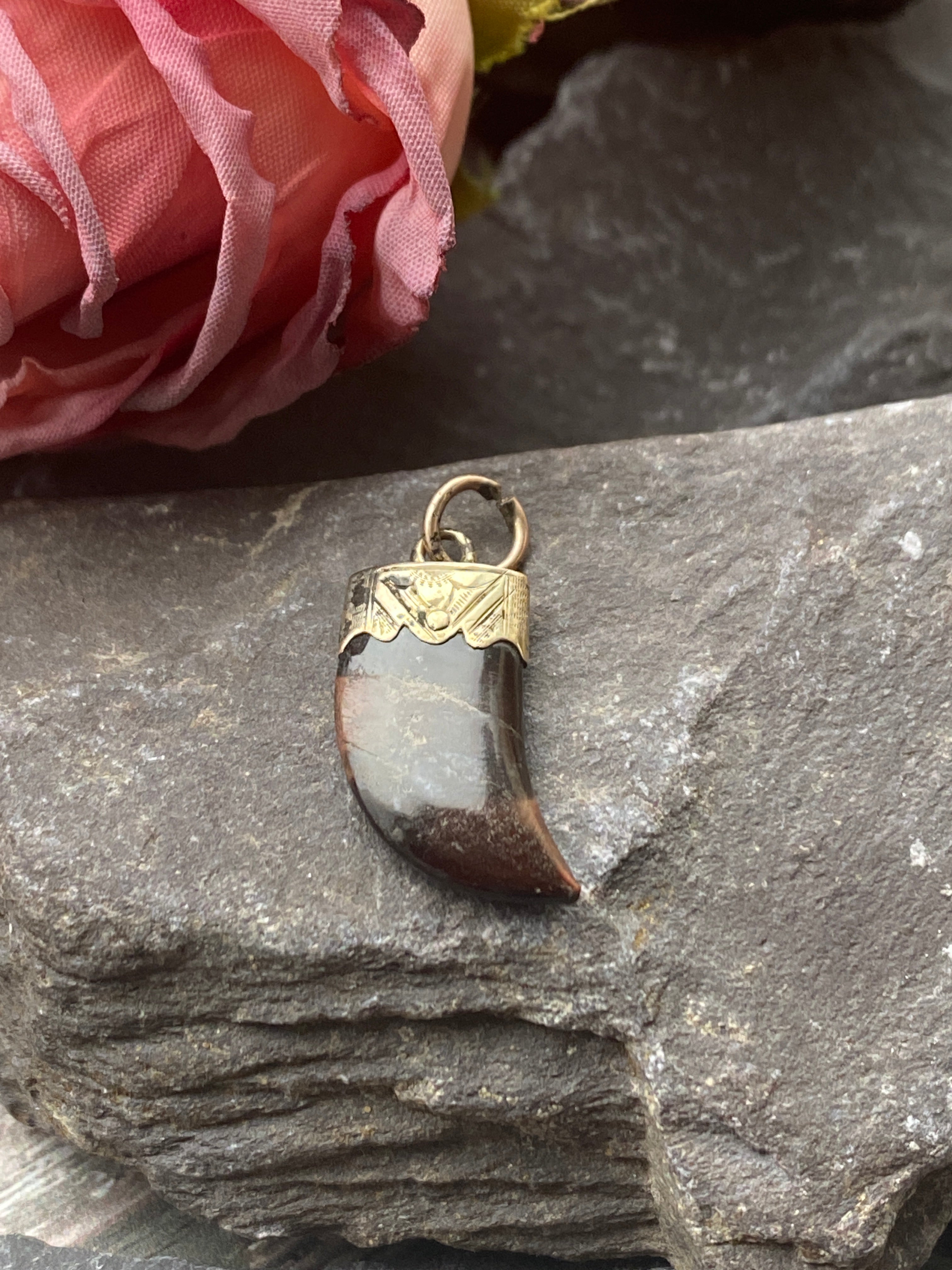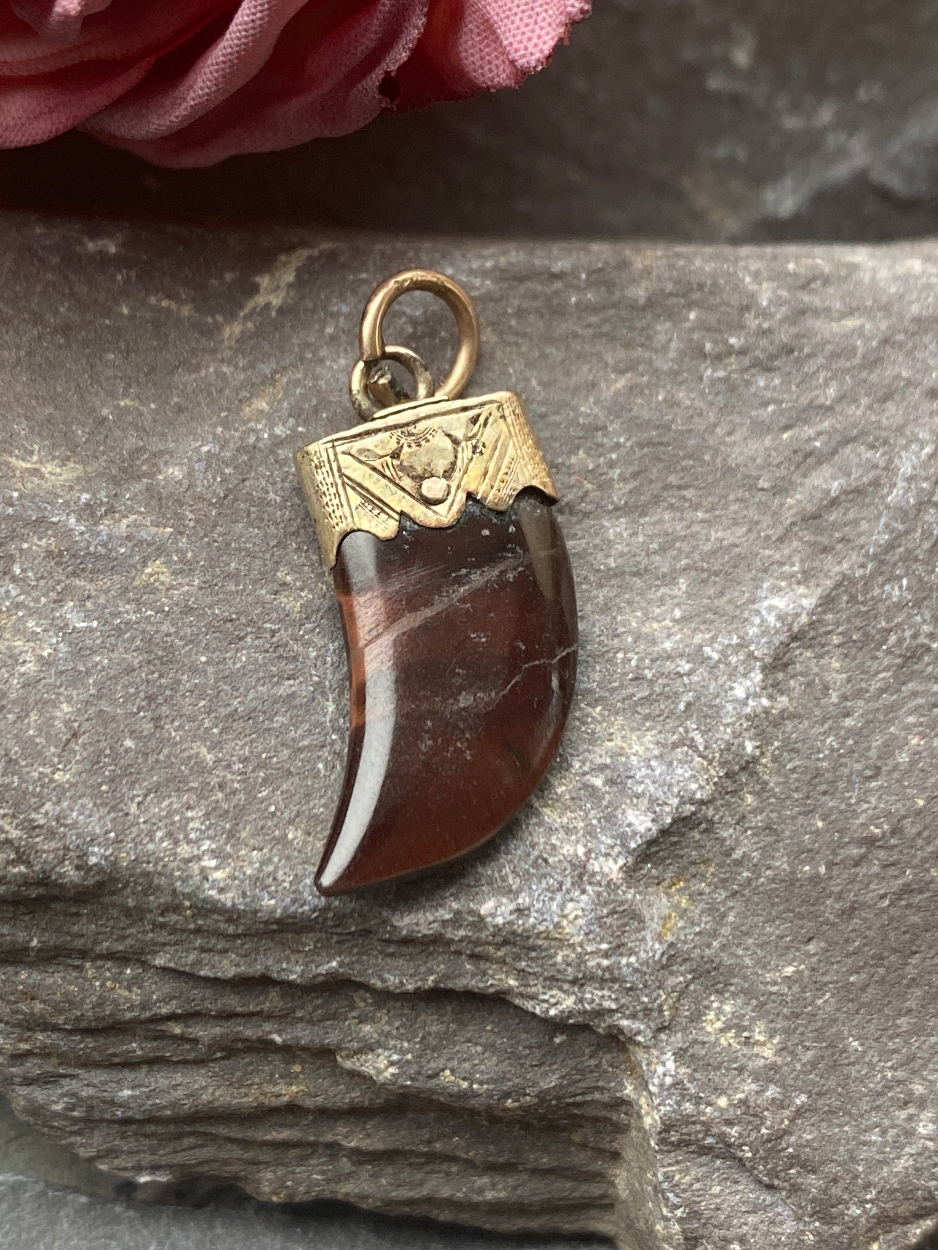 An antique 9ct gold tigers eye claw pendant