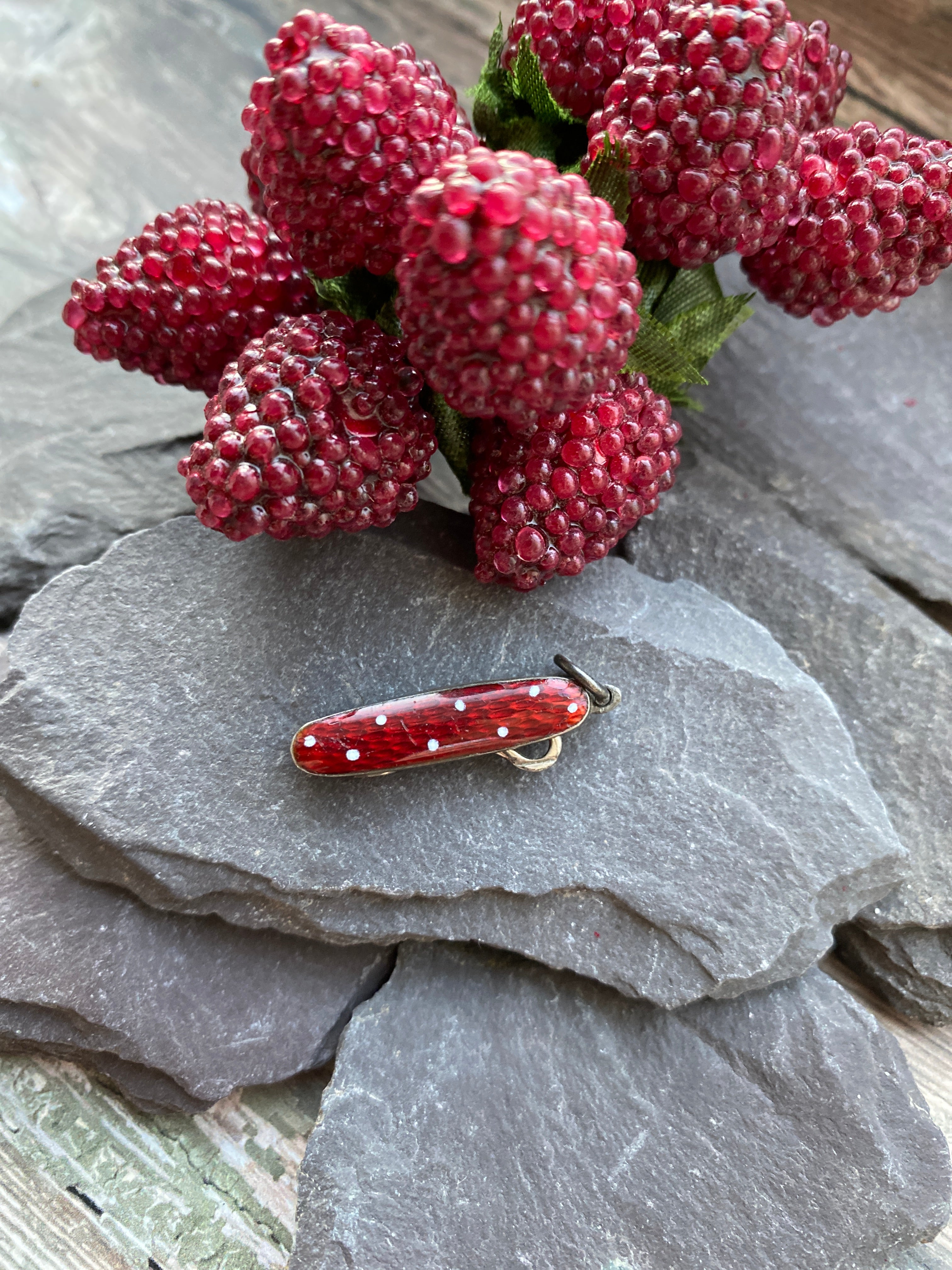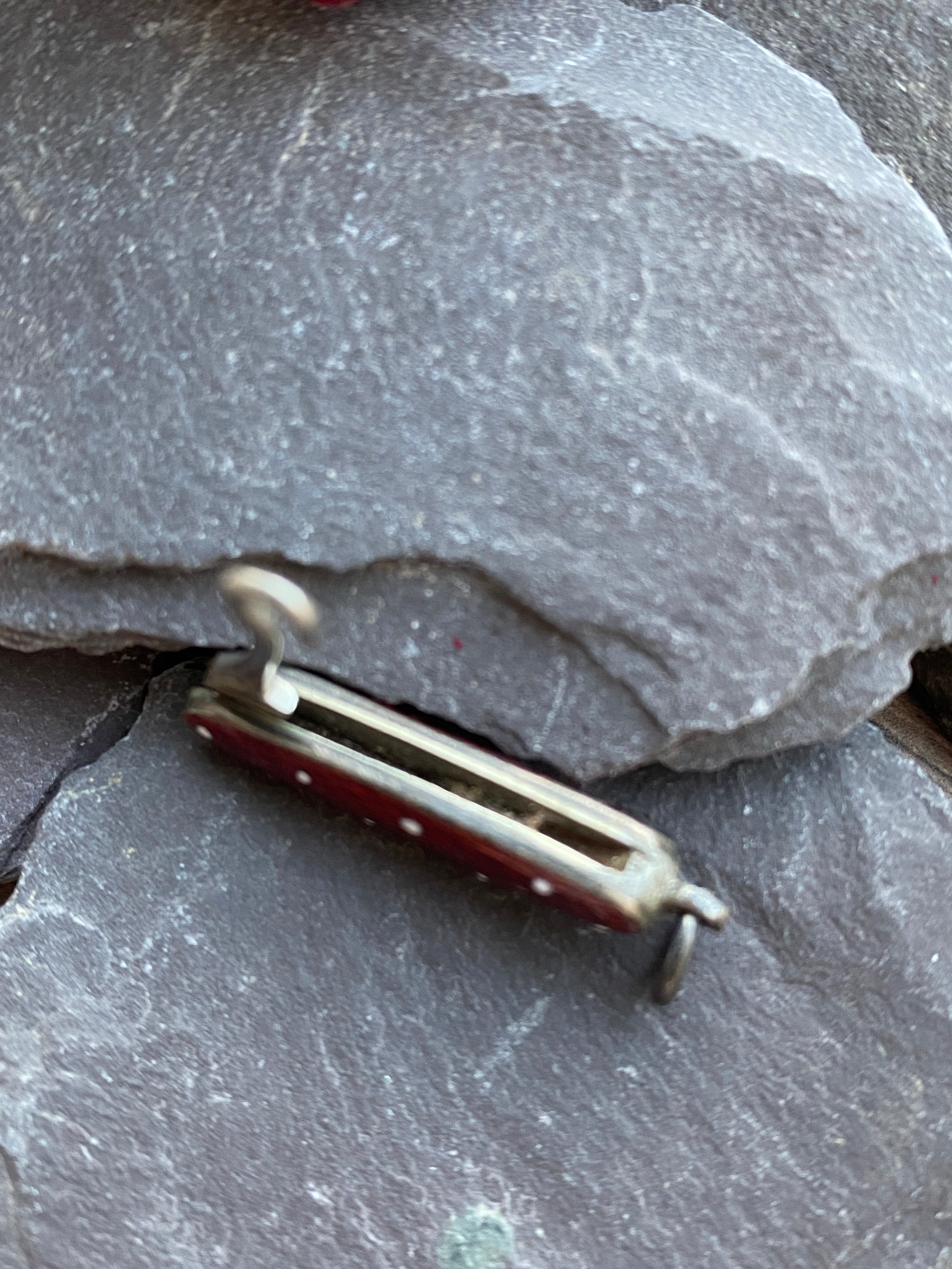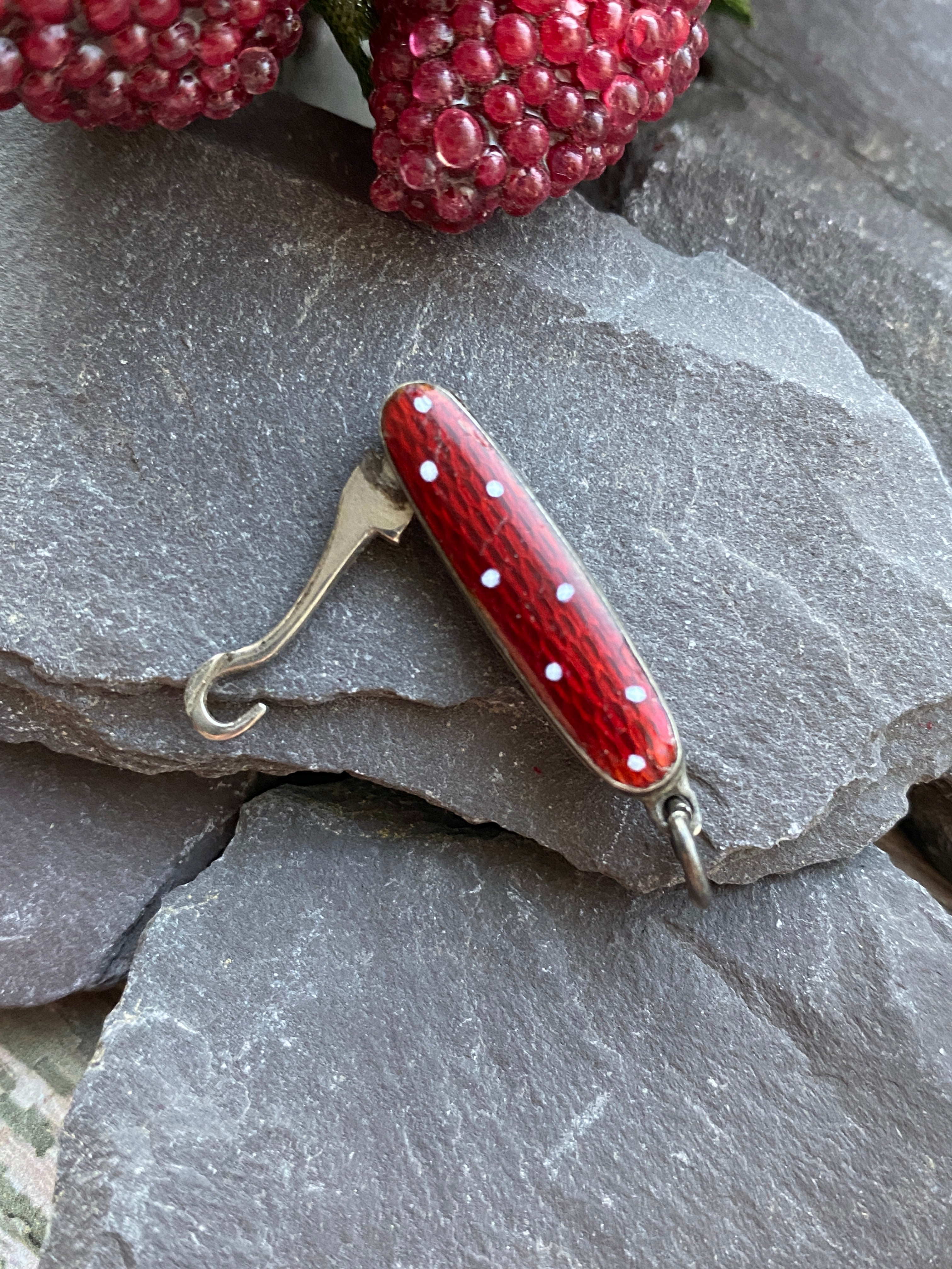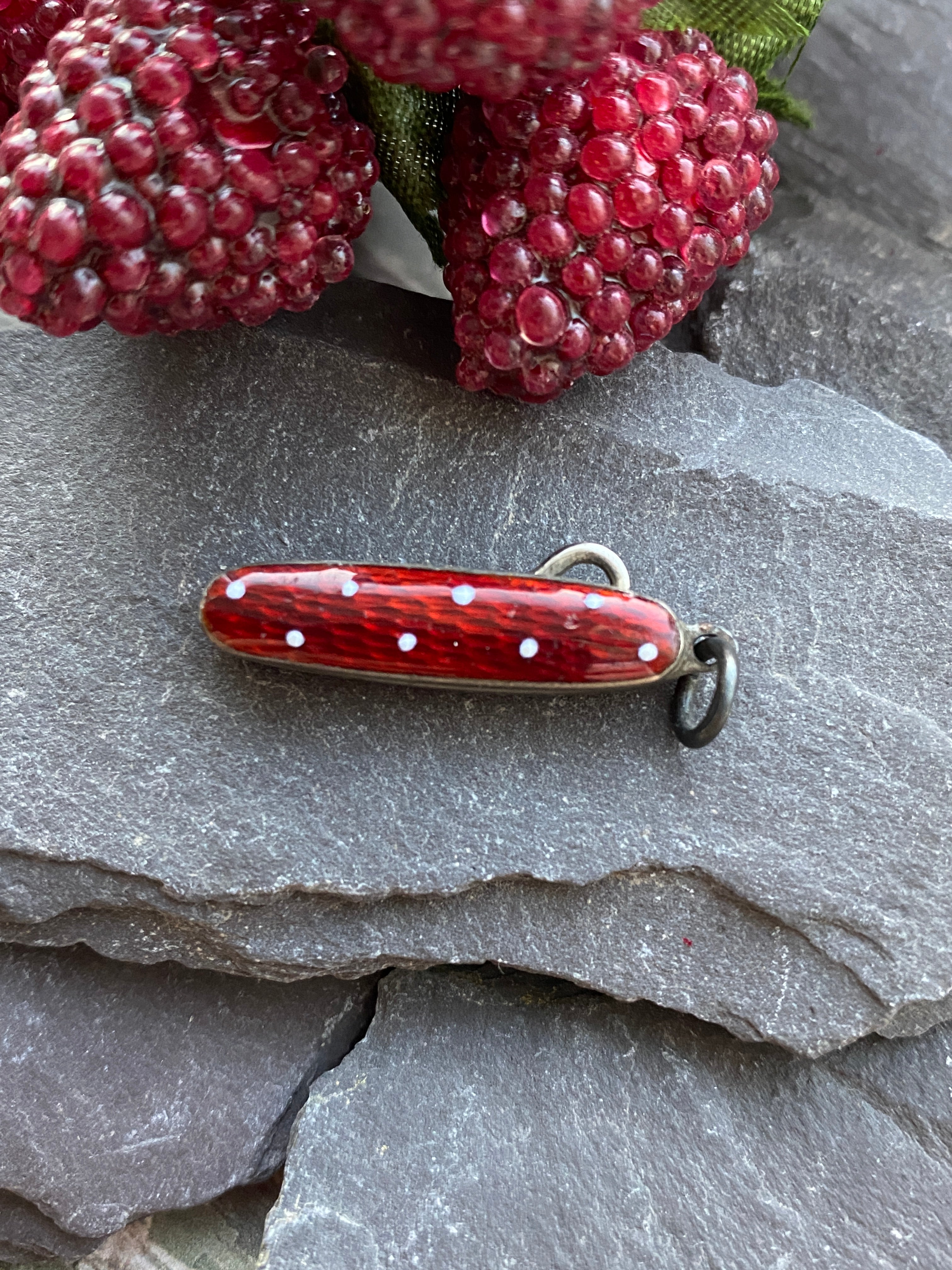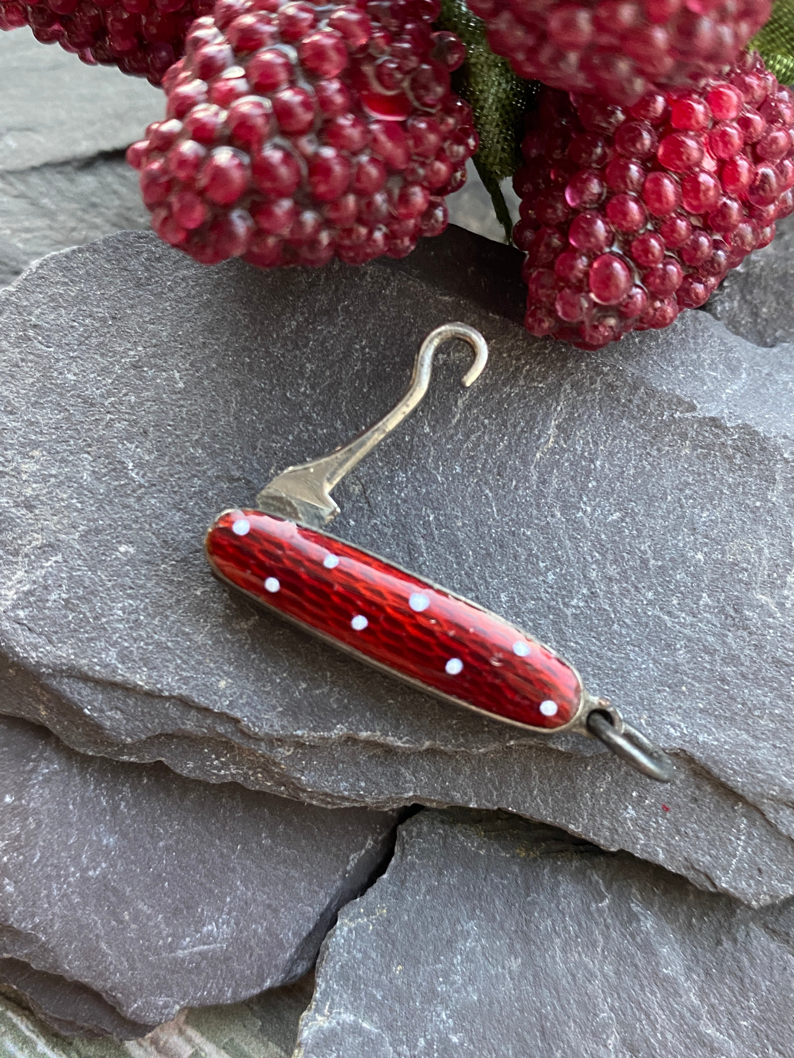 A cute steel and guilloche enamel pendant in the shape of a pen knife with a concealed button hook for ladies gloves.