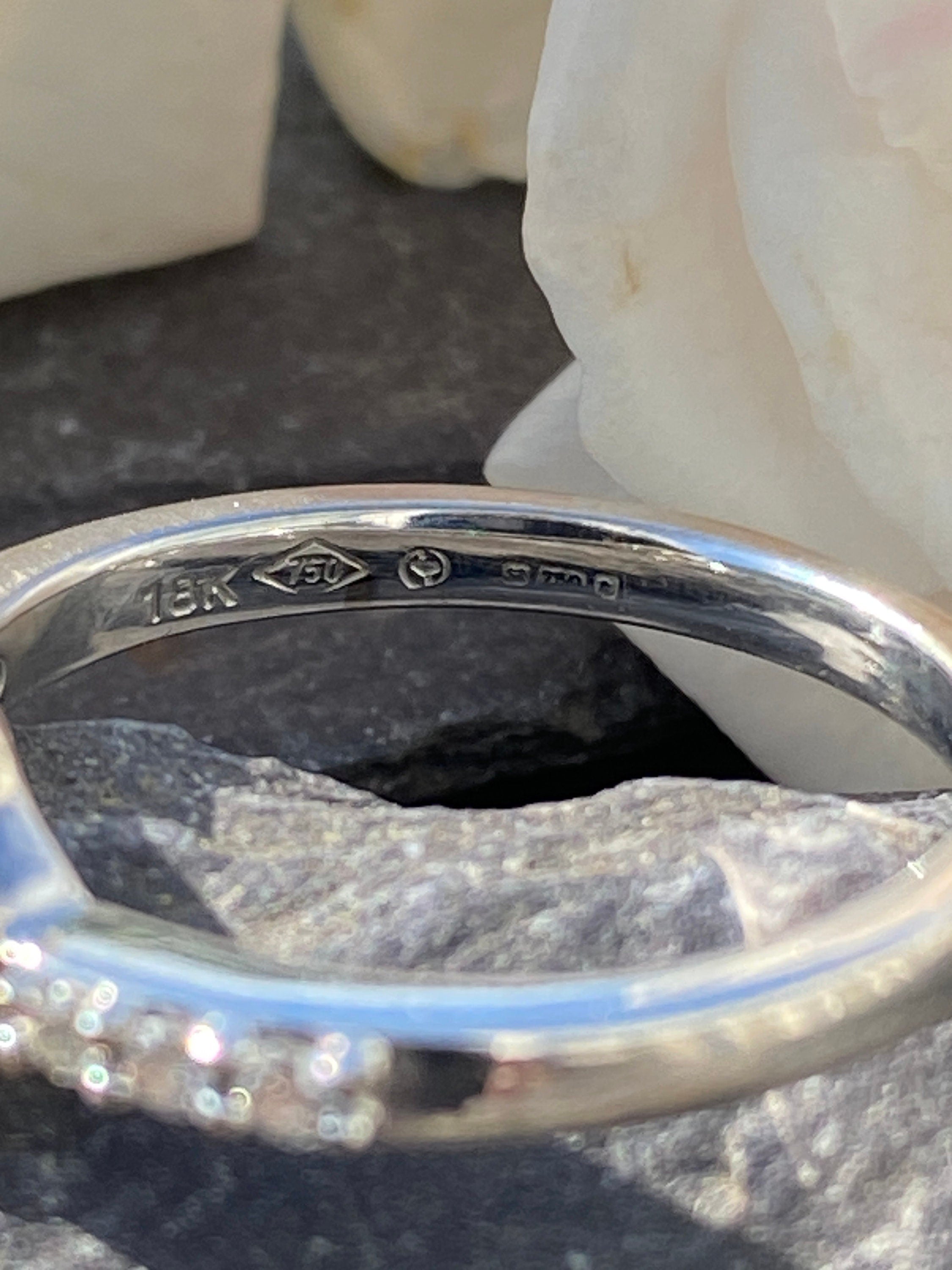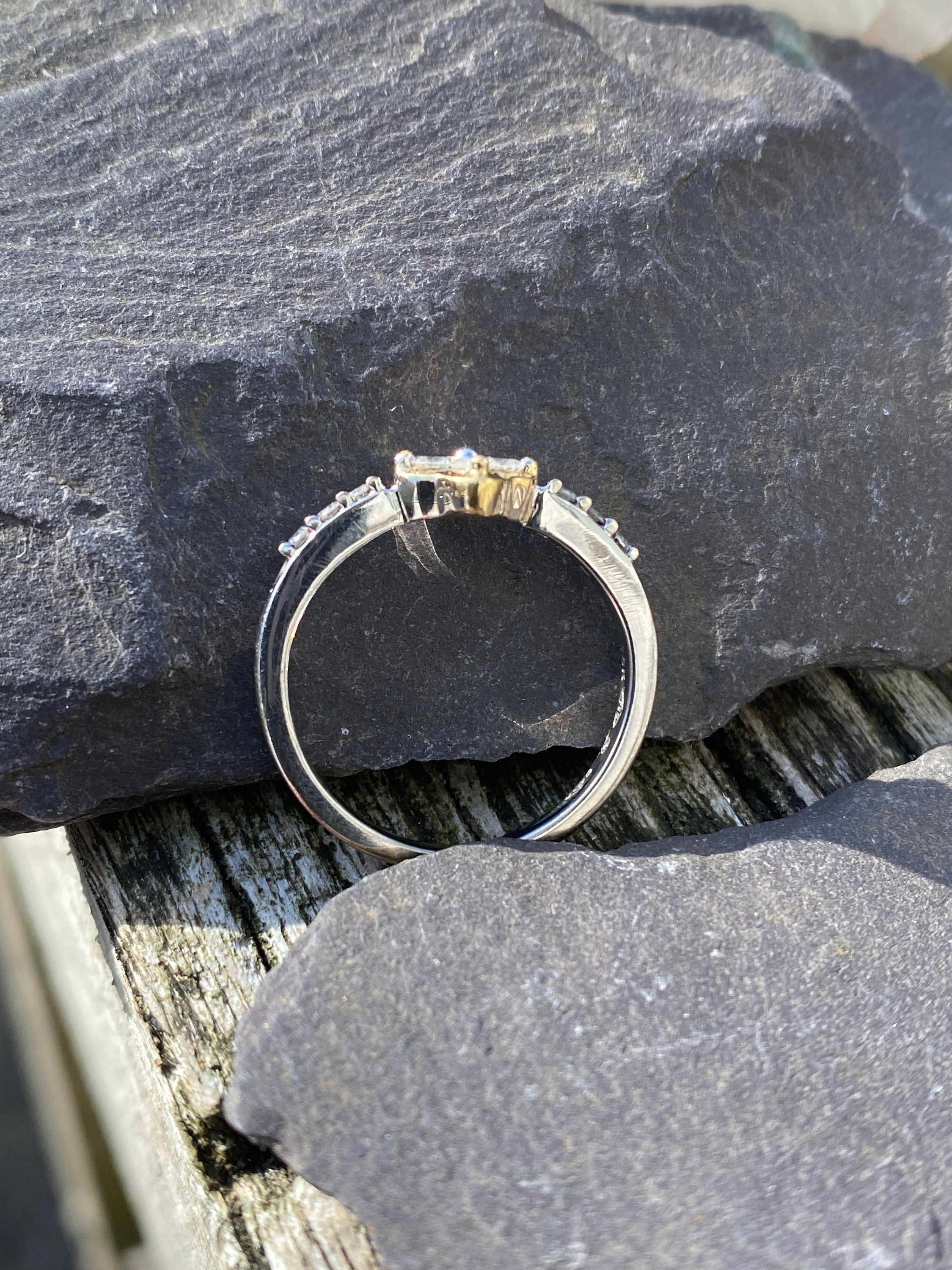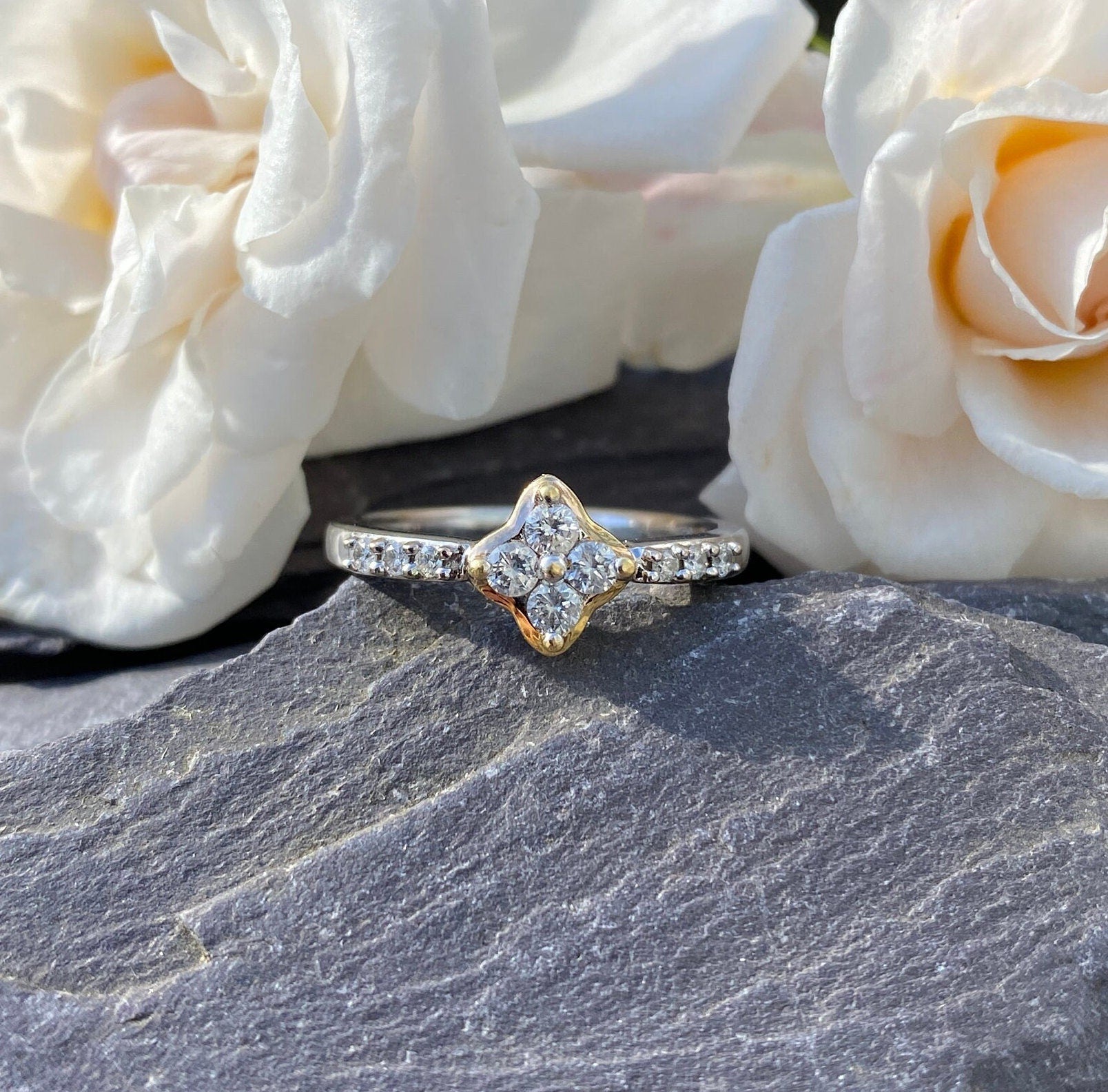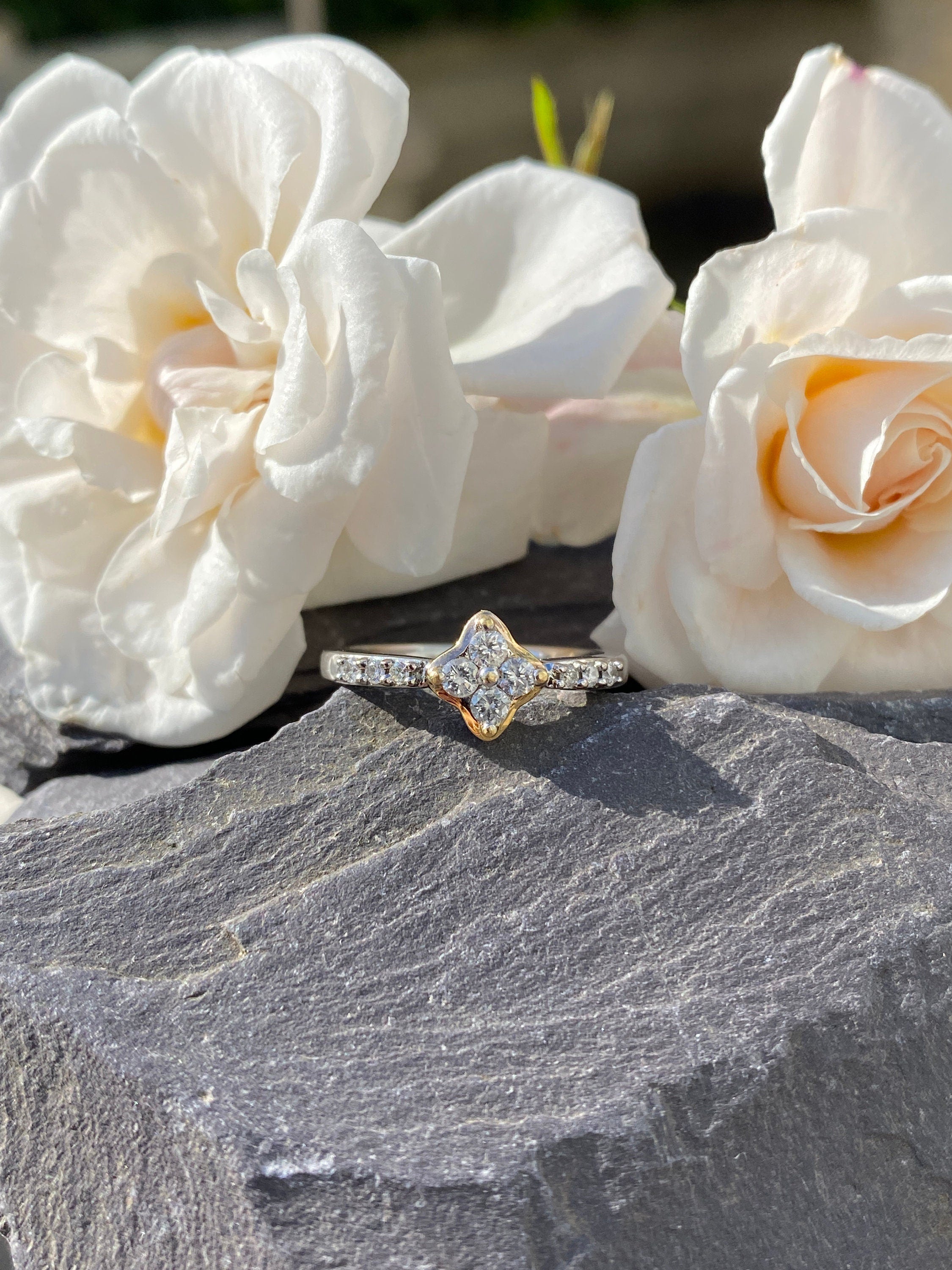 A stunning 18ct gold ring set with four round brilliant cut Diamonds in a star setting surrounded by 18ct yellow gold with a further three Diamonds to each shoulder.