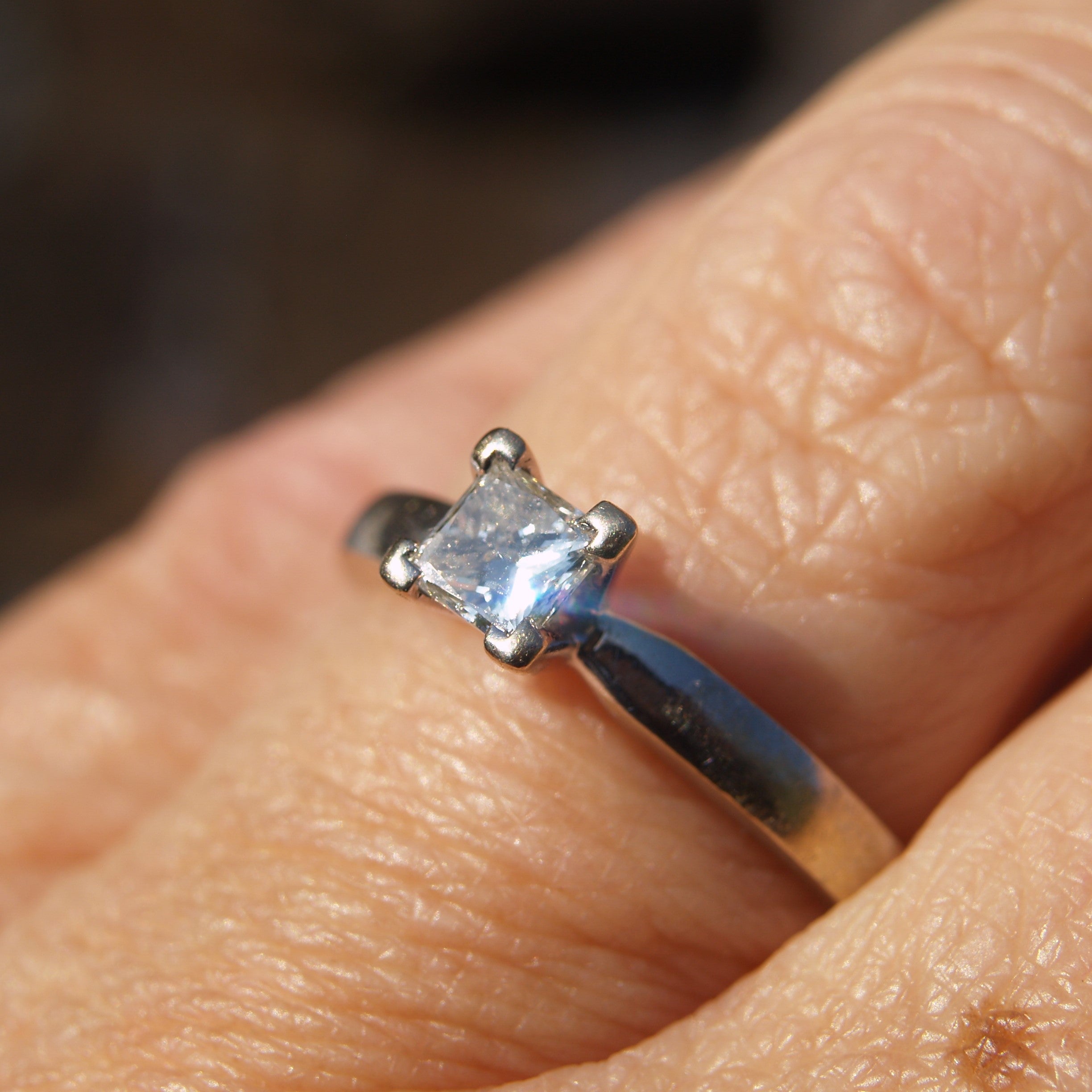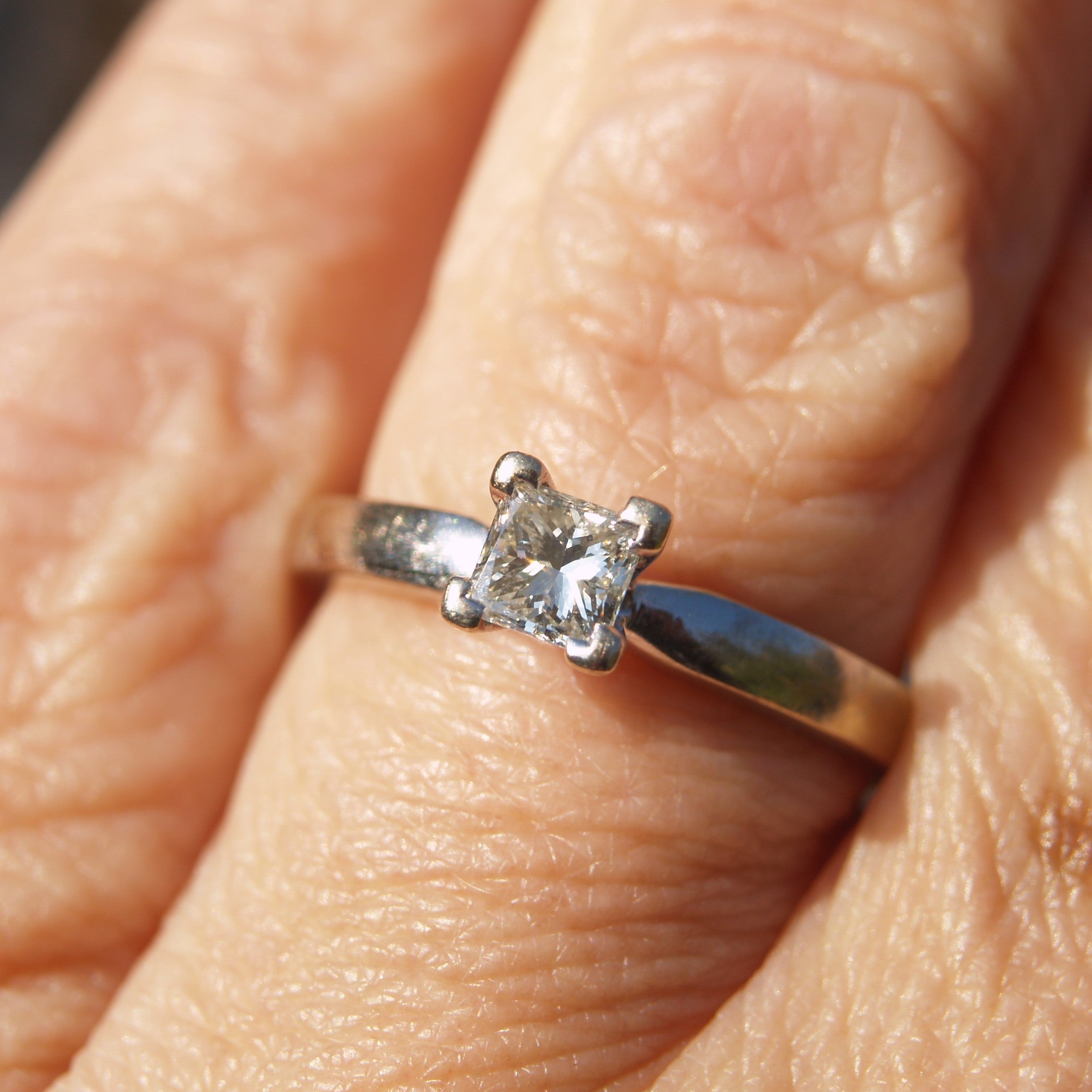 A solitaire diamond ring set in 18ct white gold. The princess cut diamond of 0.50 carat assessed as SI1/ F colour. Finger size N (uk) or Size 6 1/2 (usa)