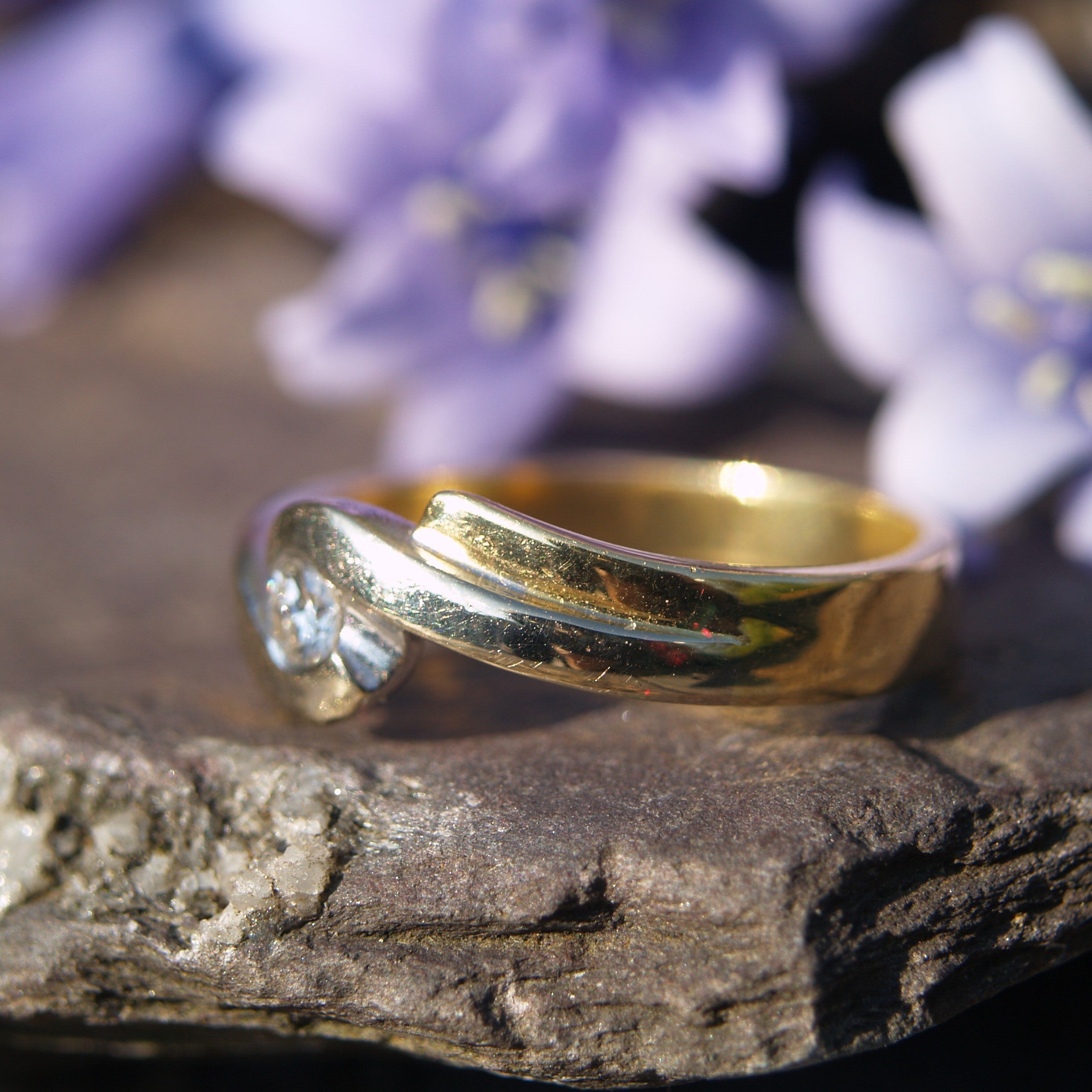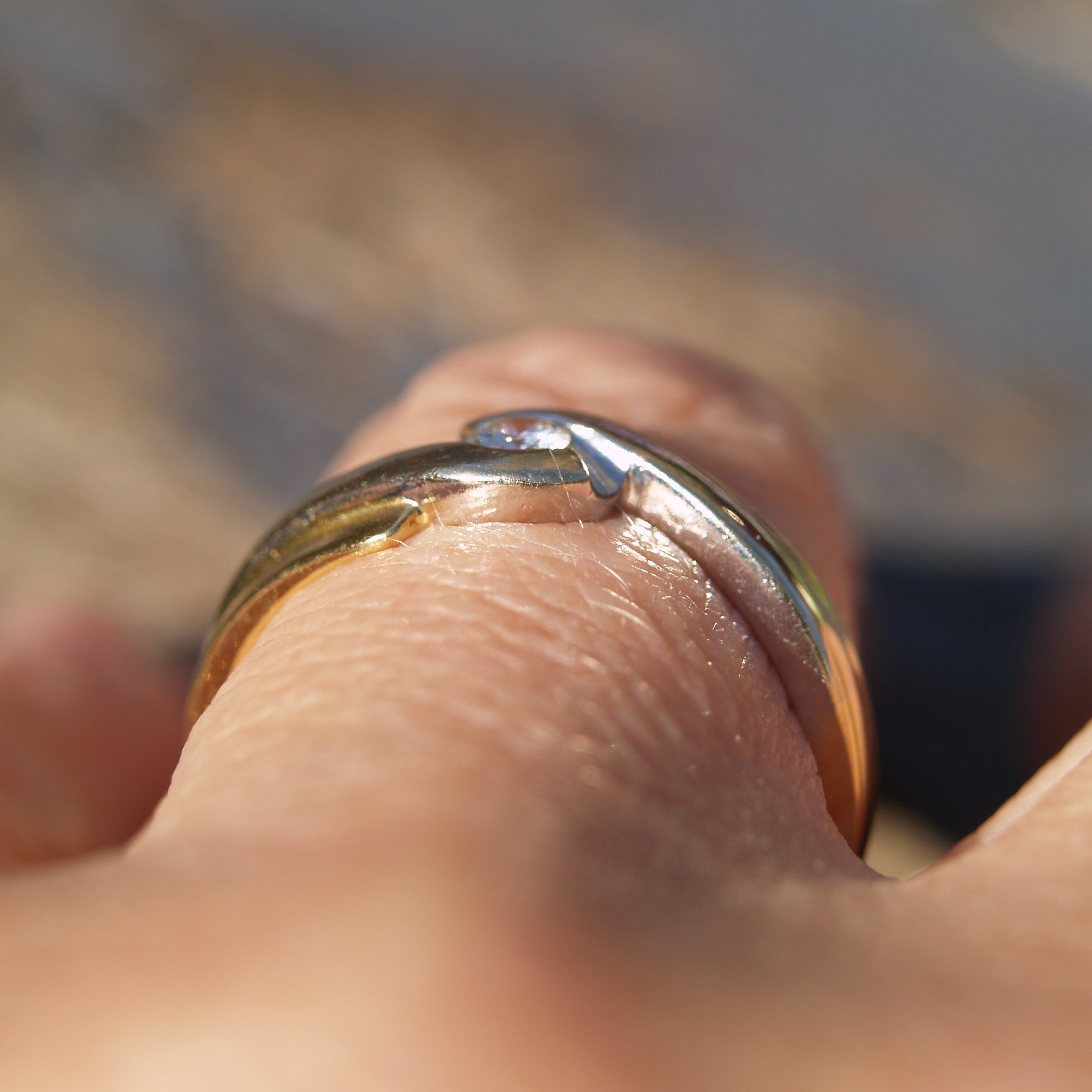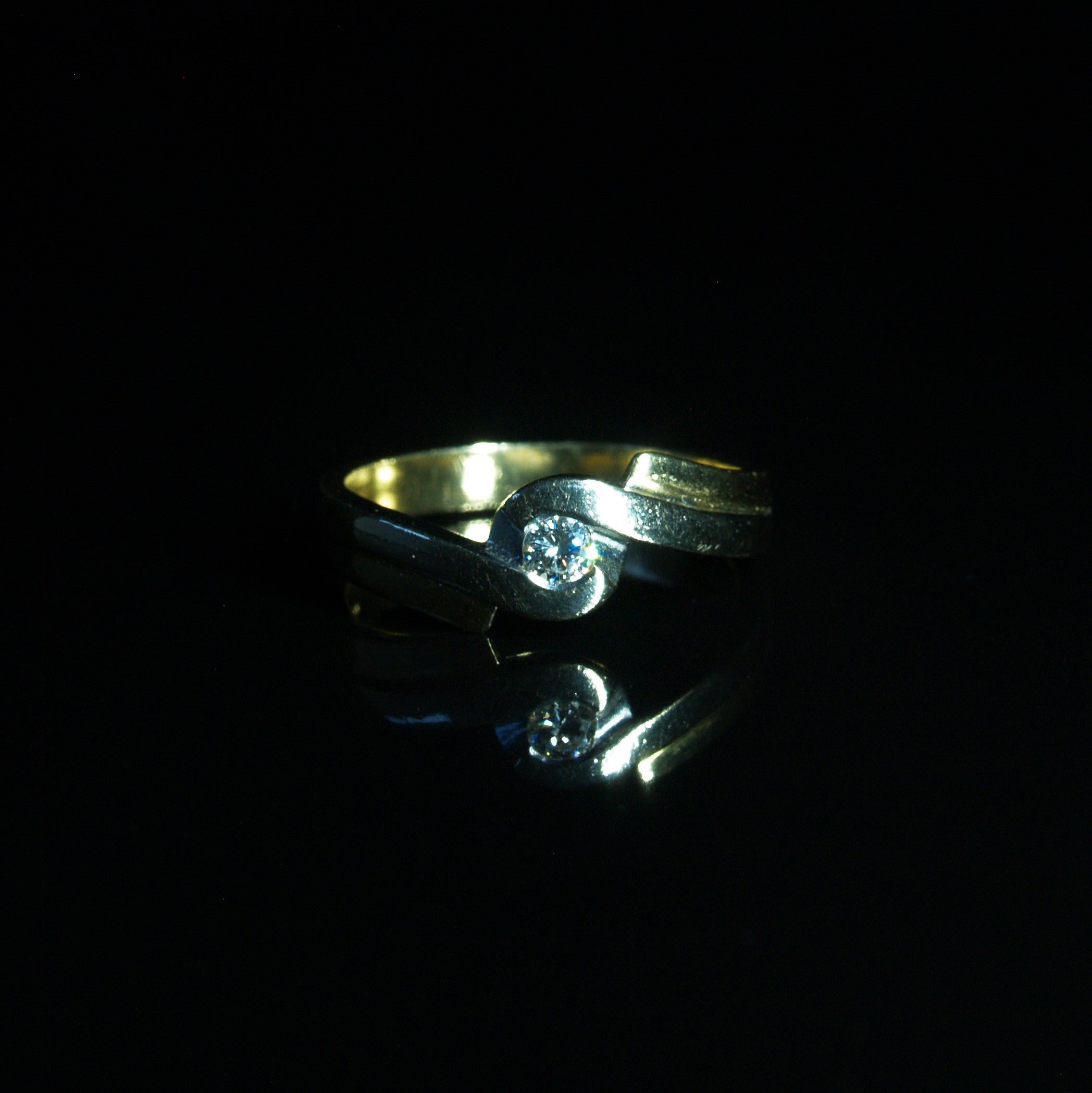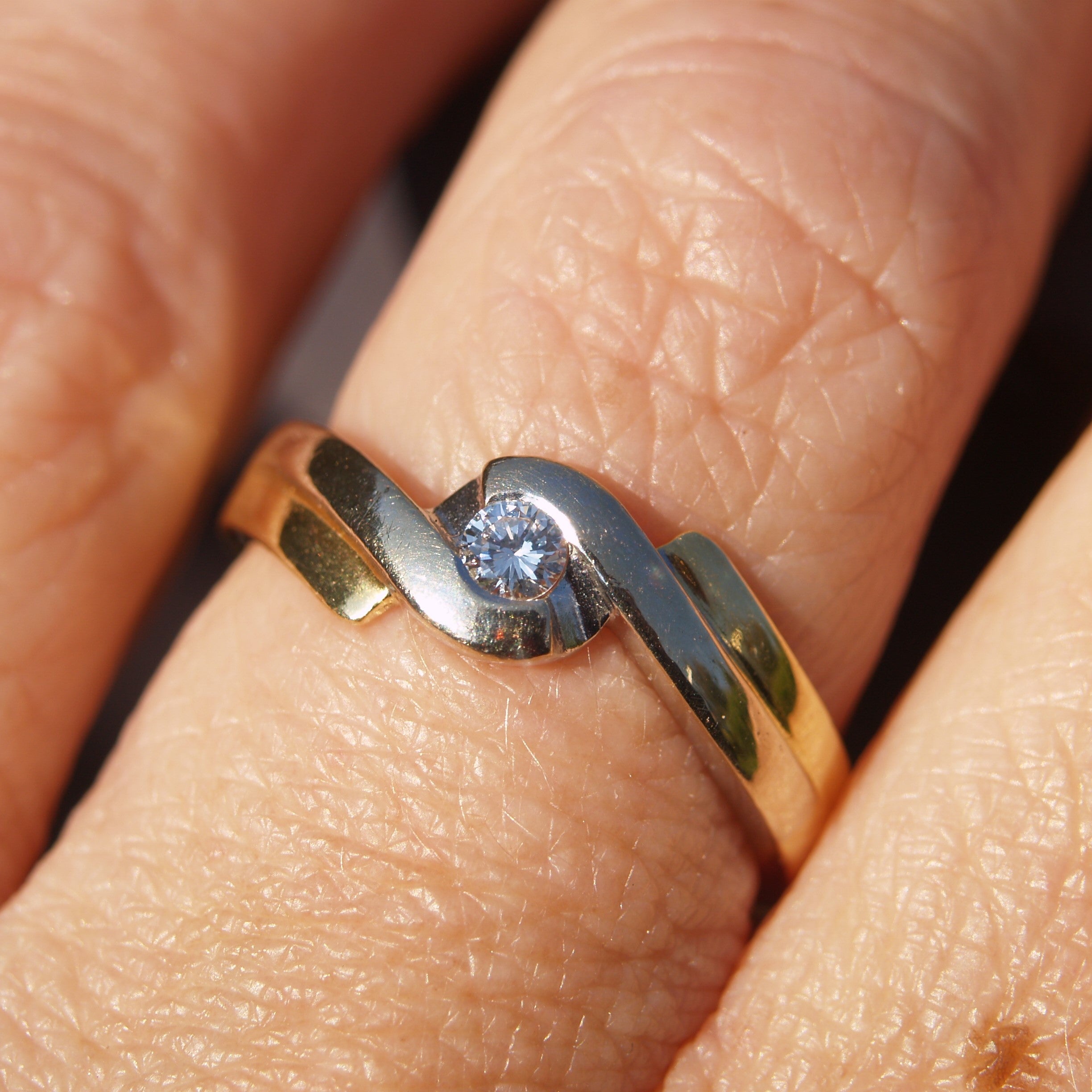 A modern 18ct gold white & yellow gold ring set with a solitaire Diamond in a twist design. Assessed as Vs2/G. Diamond Weight 0.20ct. Weight 4.8tg. Finger size O (uk) or Size 7 (usa)