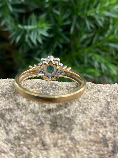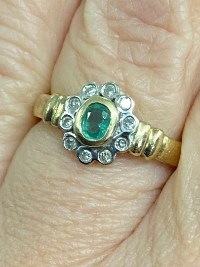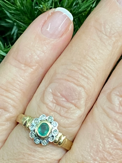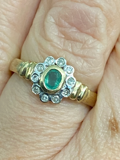 A really smart 9ct gold ring set with an Emerald surrounded by Diamonds