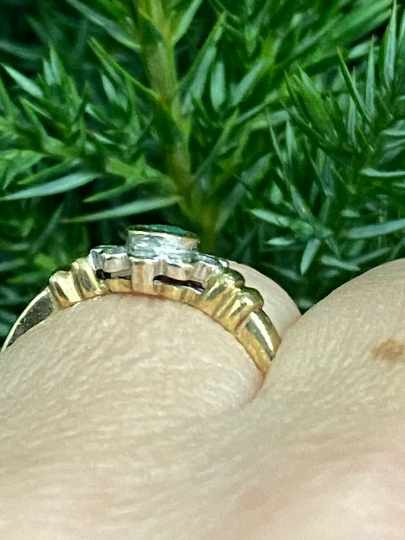 The Emerald framed in a yellow gold collet and the Diamonds rub over setting finished in ‘white’ Rhodium