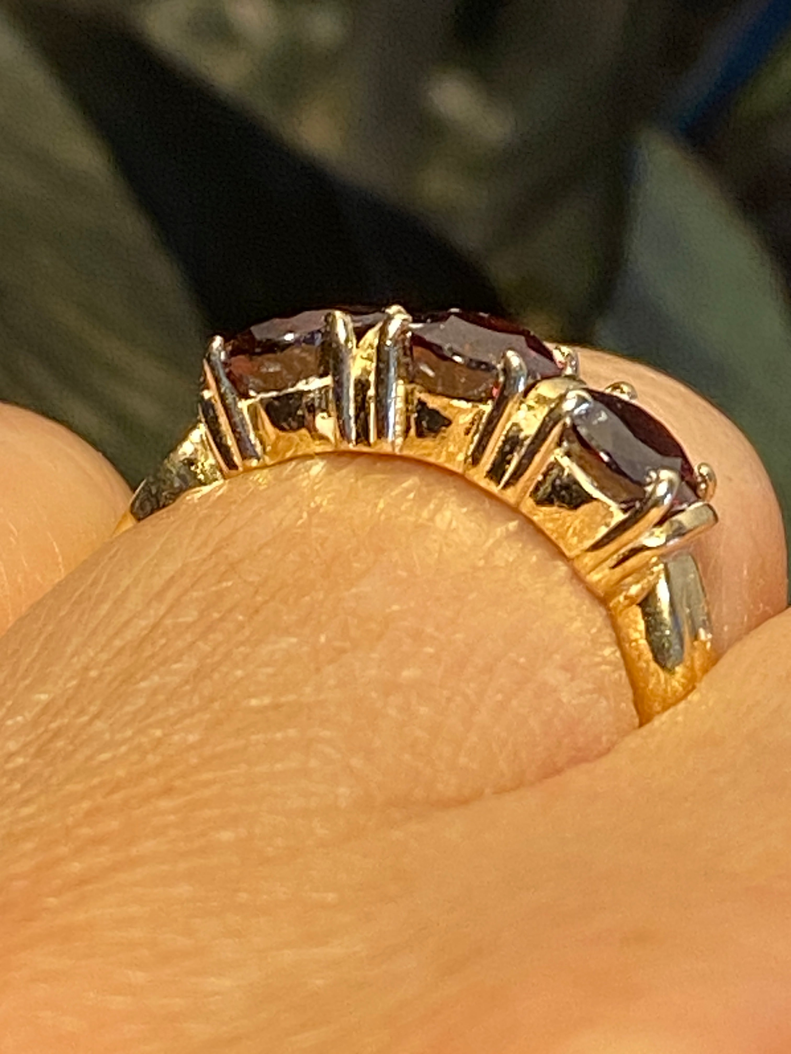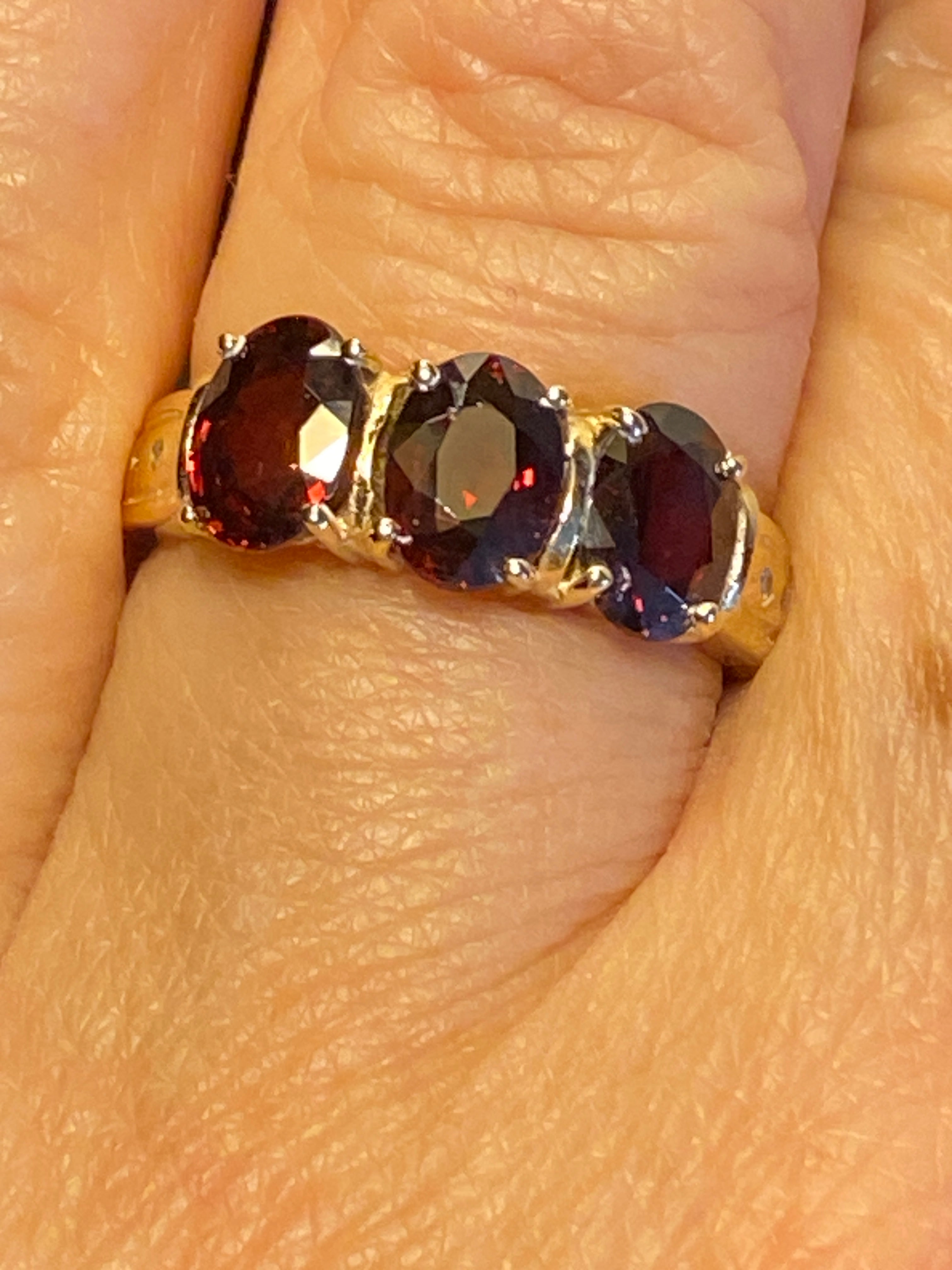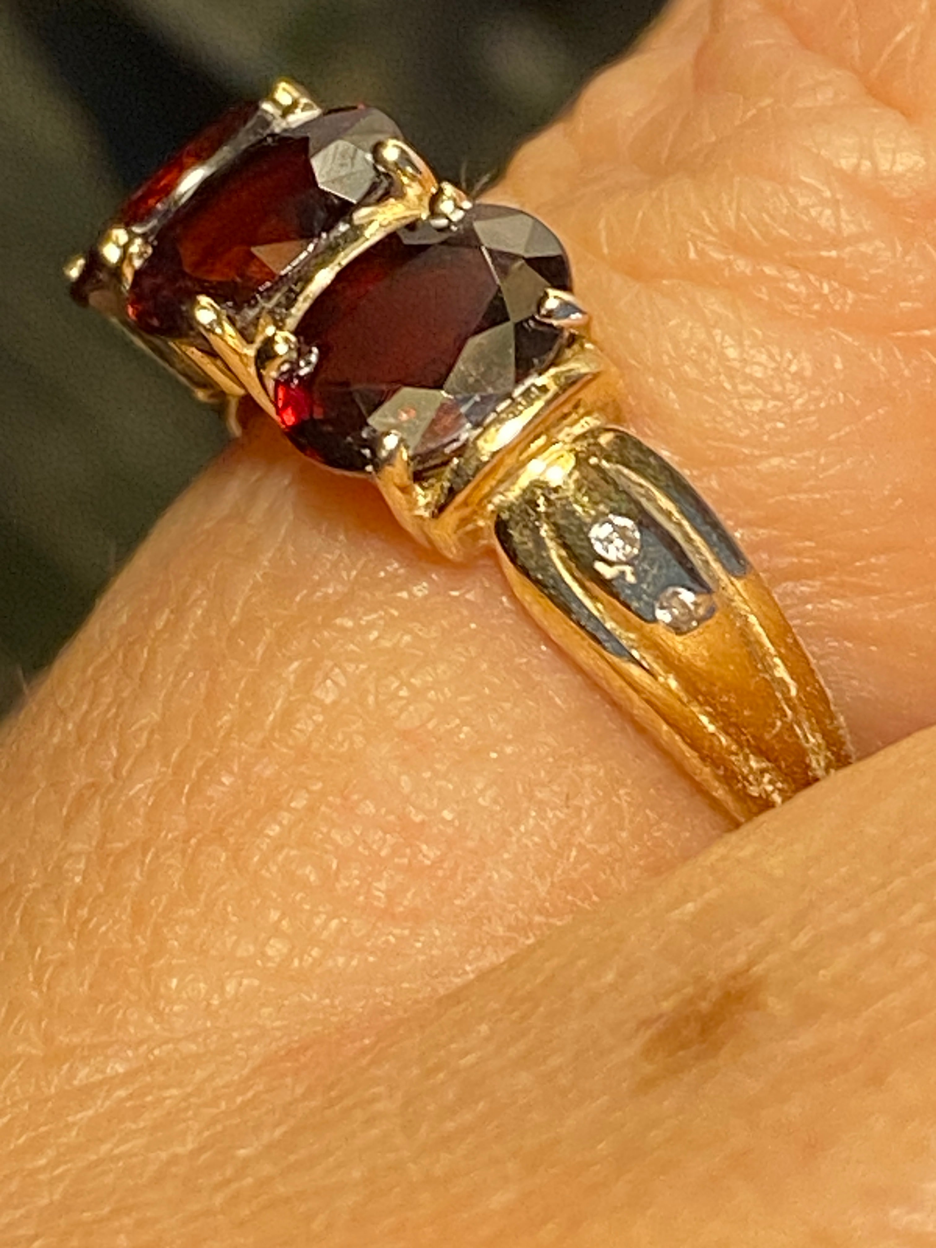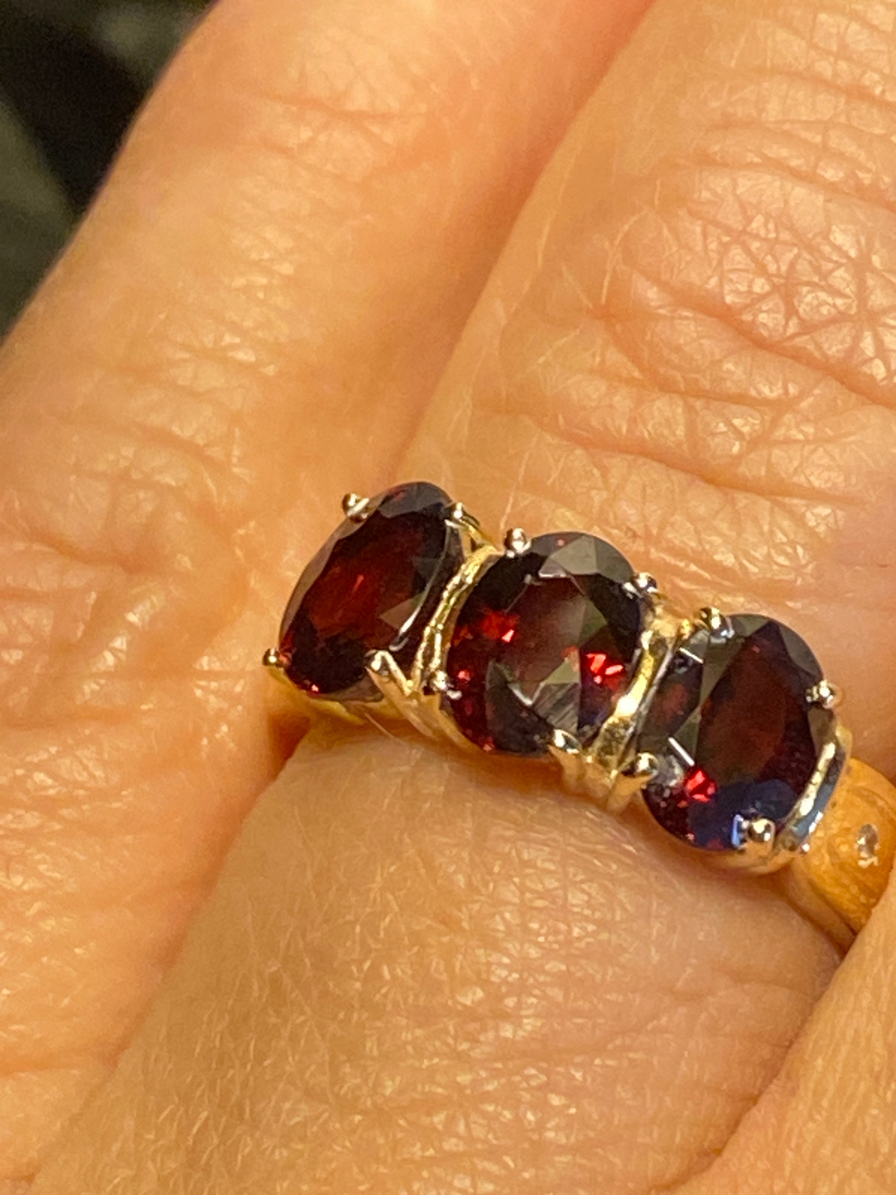 A beautiful 14ct gold ring set with three deep red oval cut Garnet stones finished with two Diamond accents in each shoulder. Finger size N or 7 US.Full...