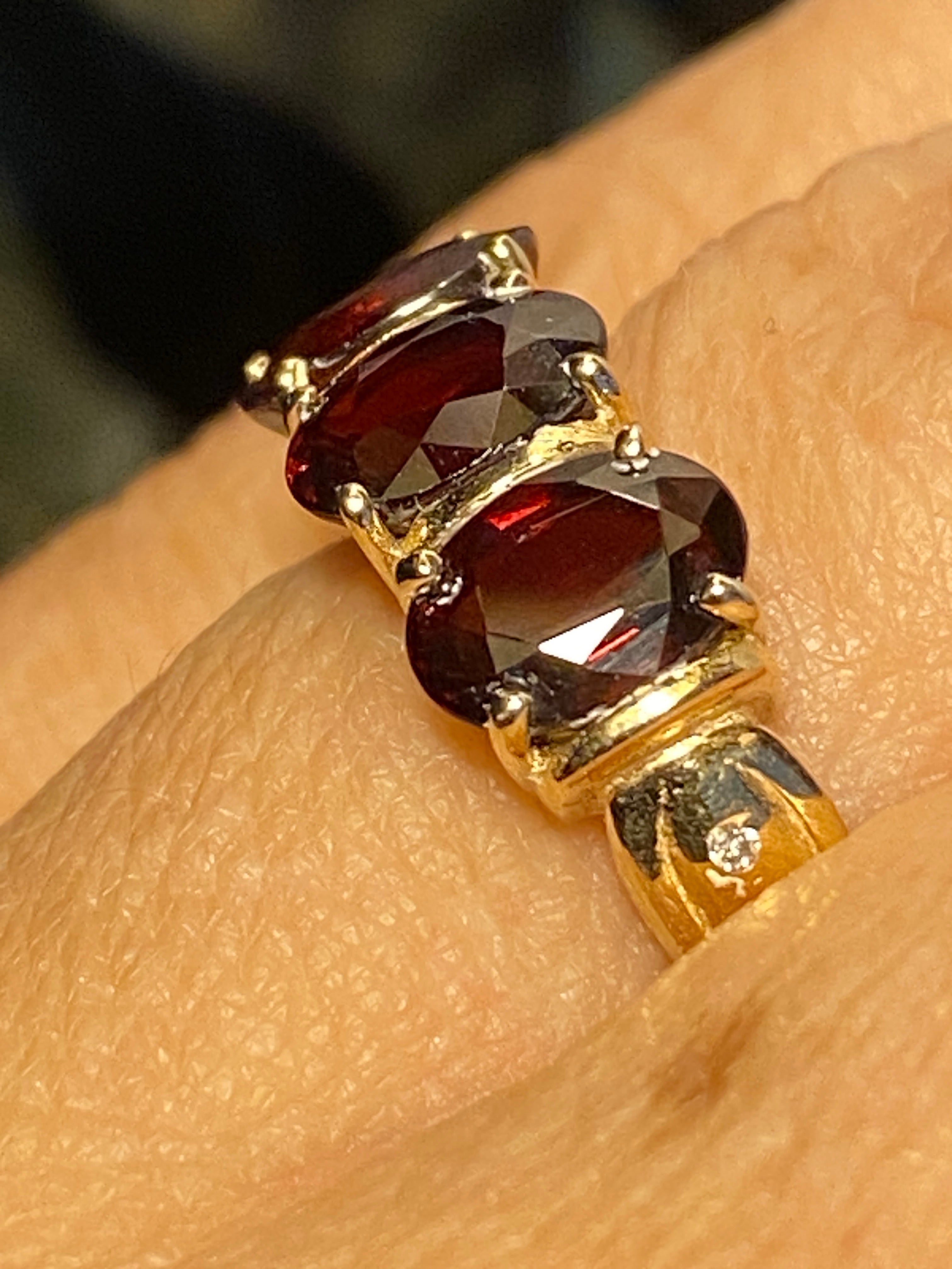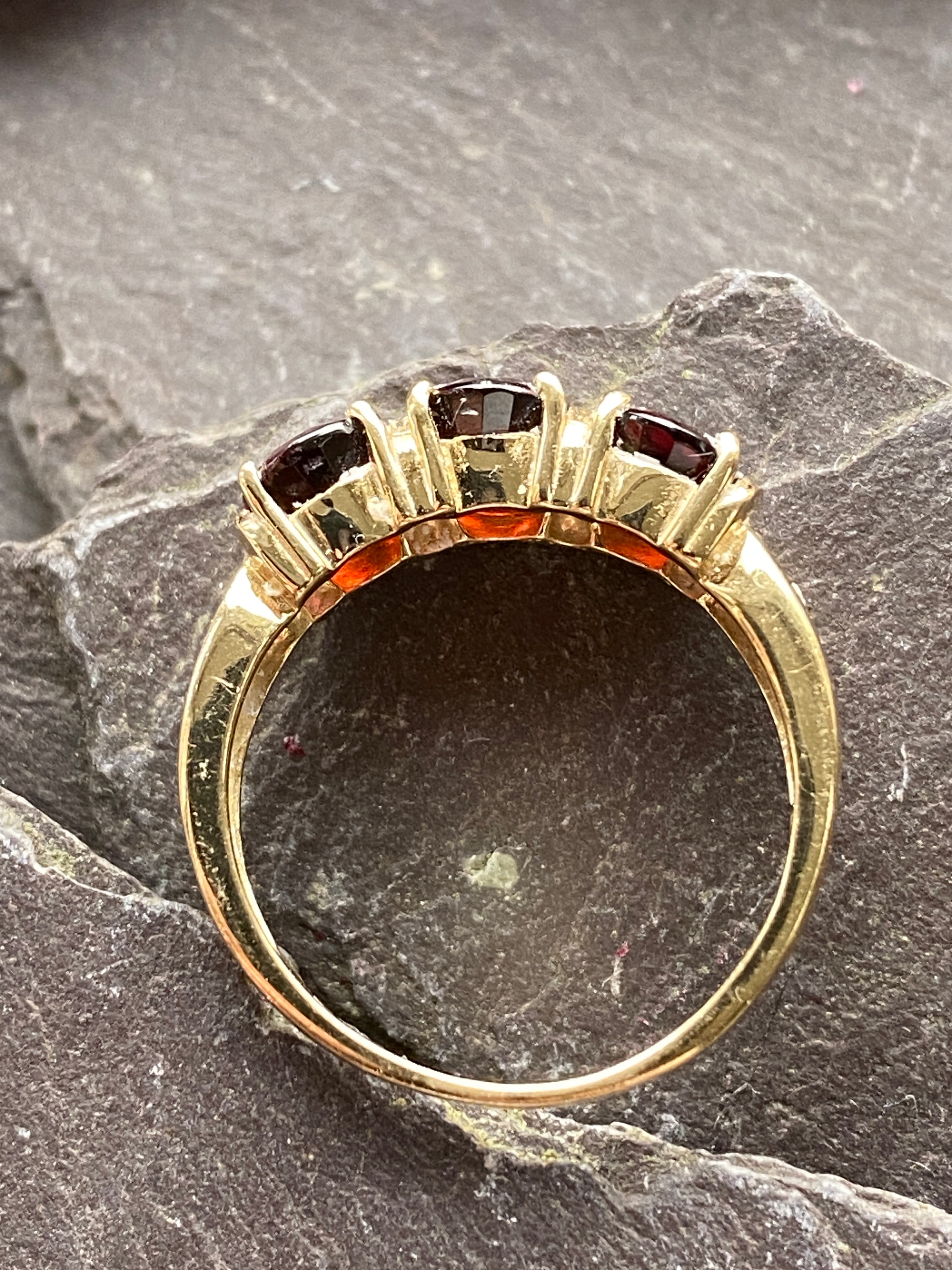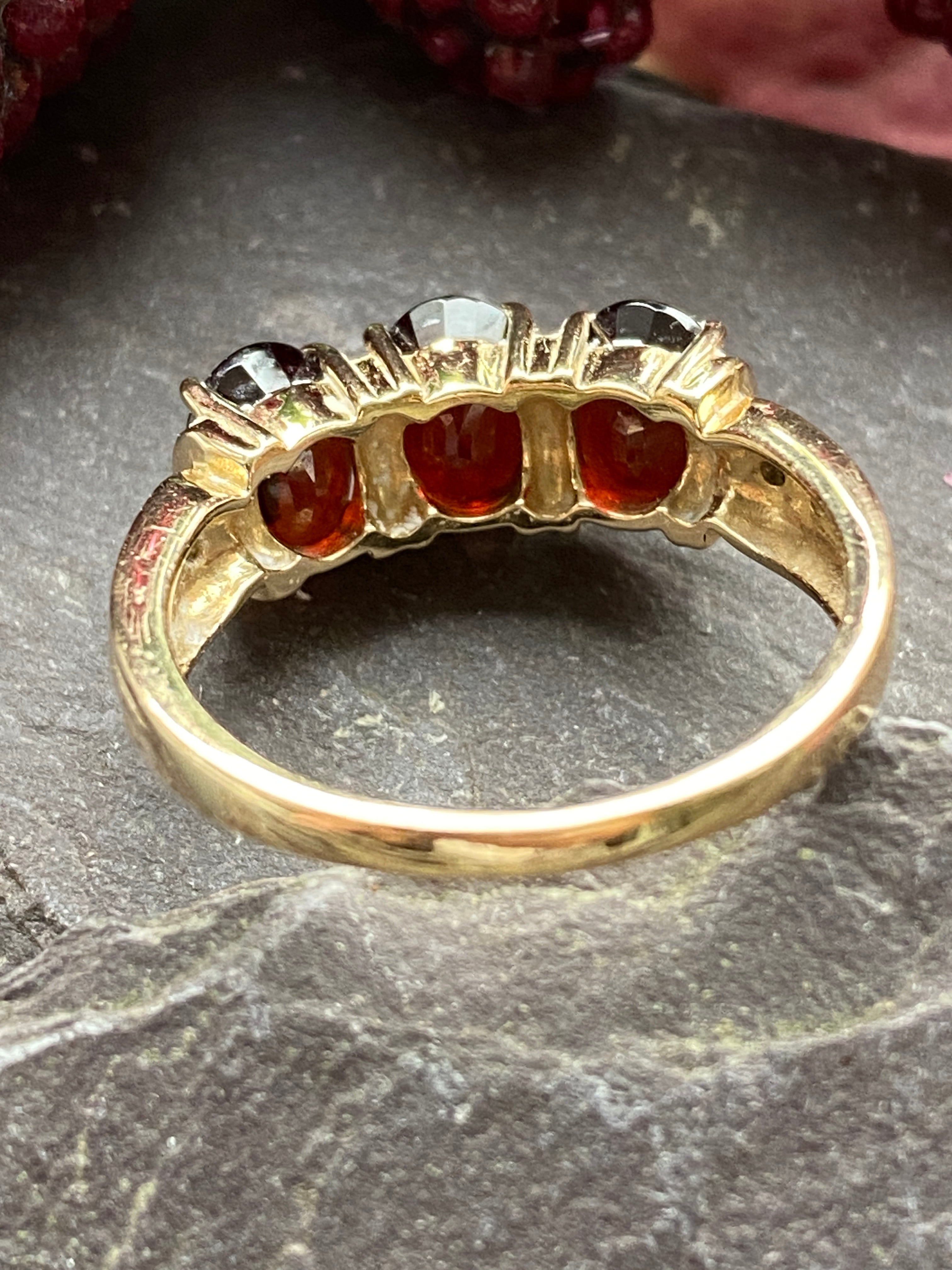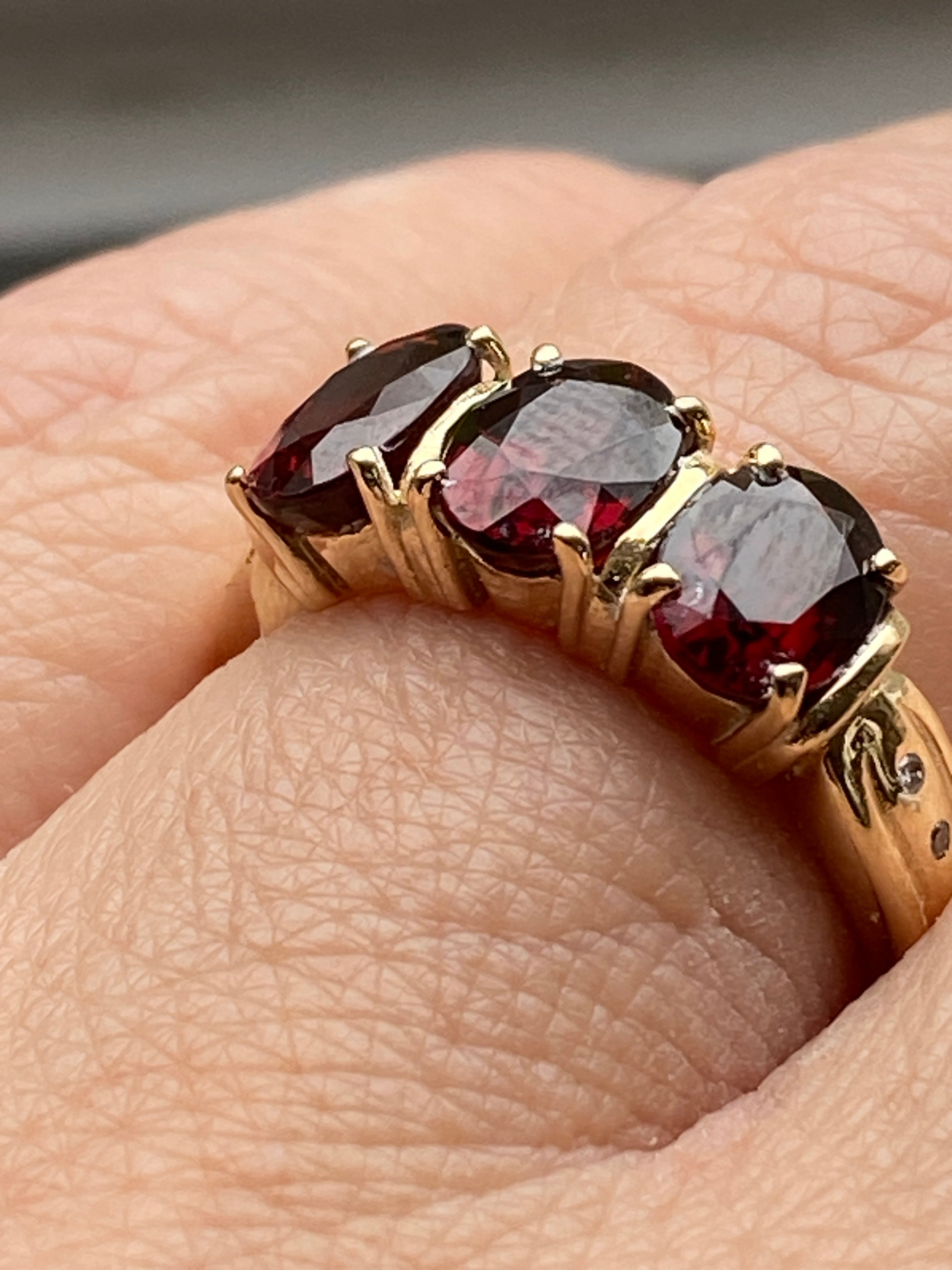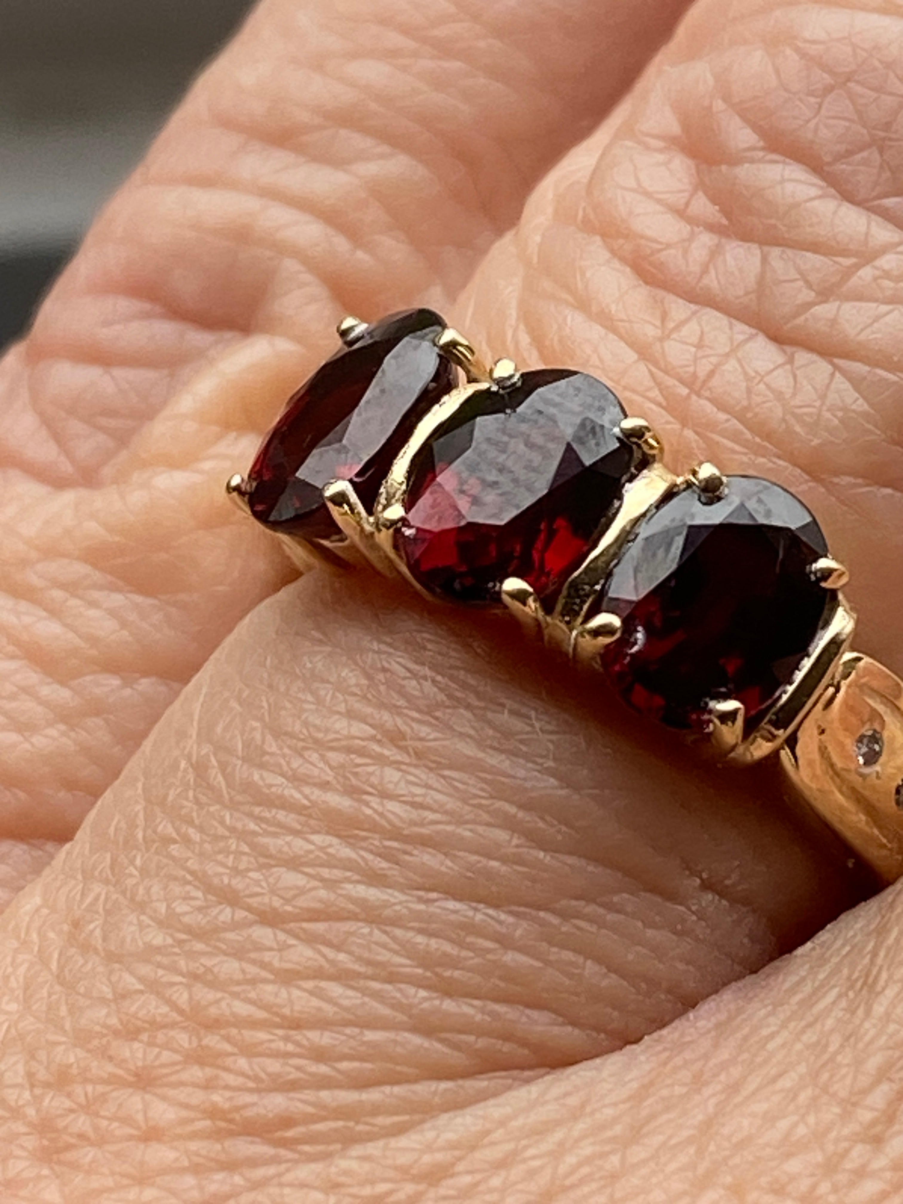 A beautiful 14ct gold ring set with three deep red oval cut Garnet stones finished with two Diamond accents in each shoulder.