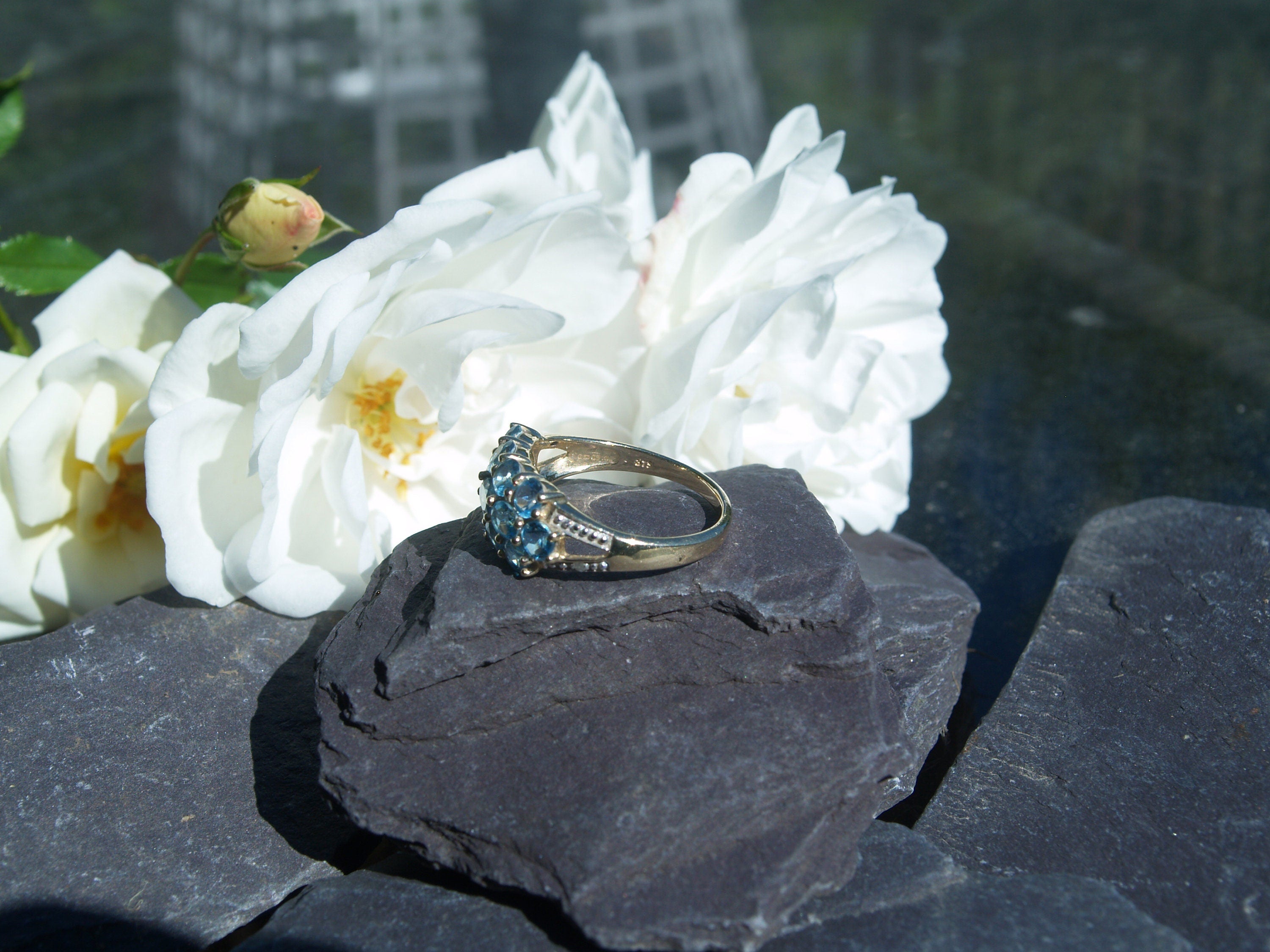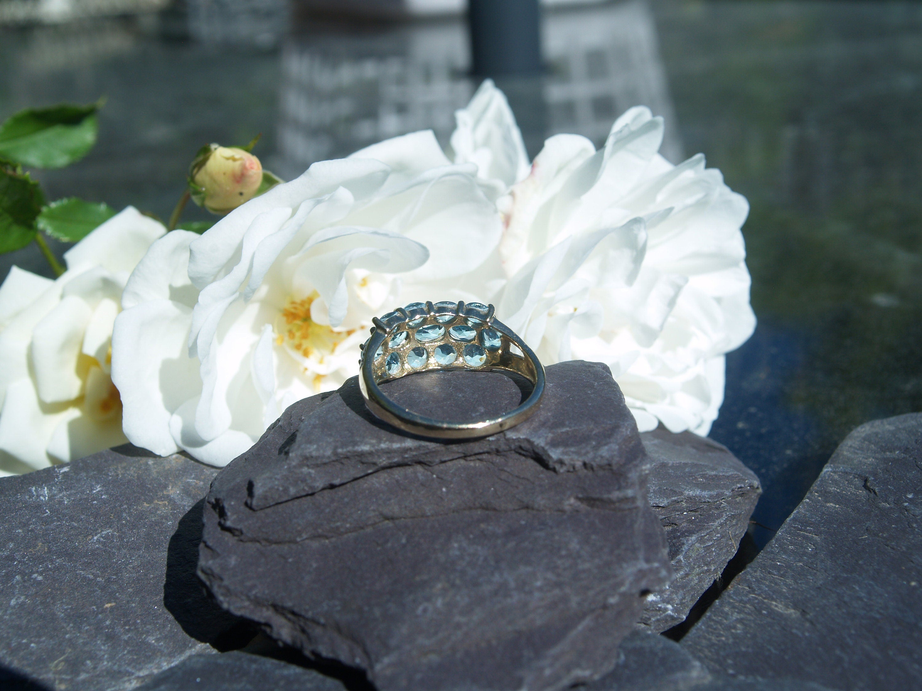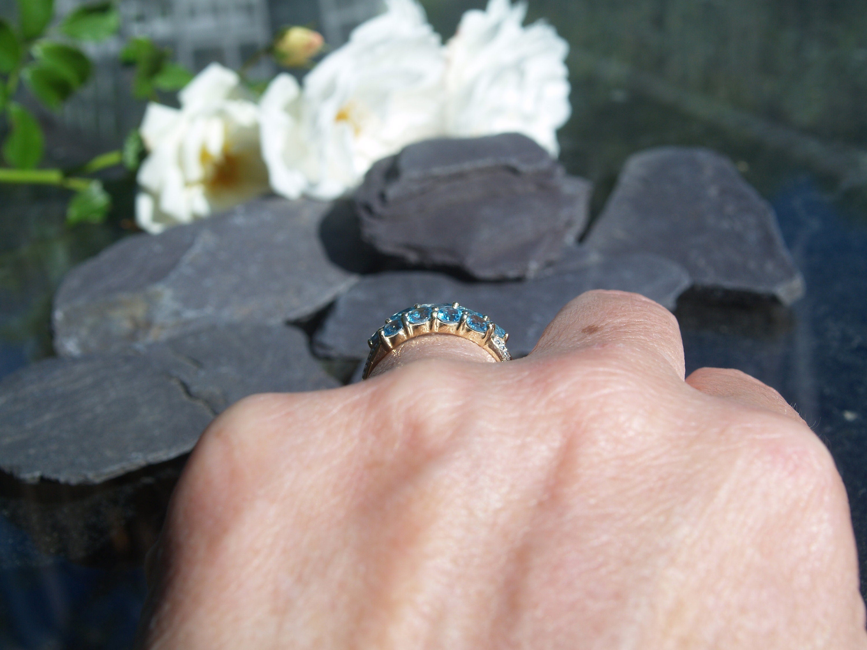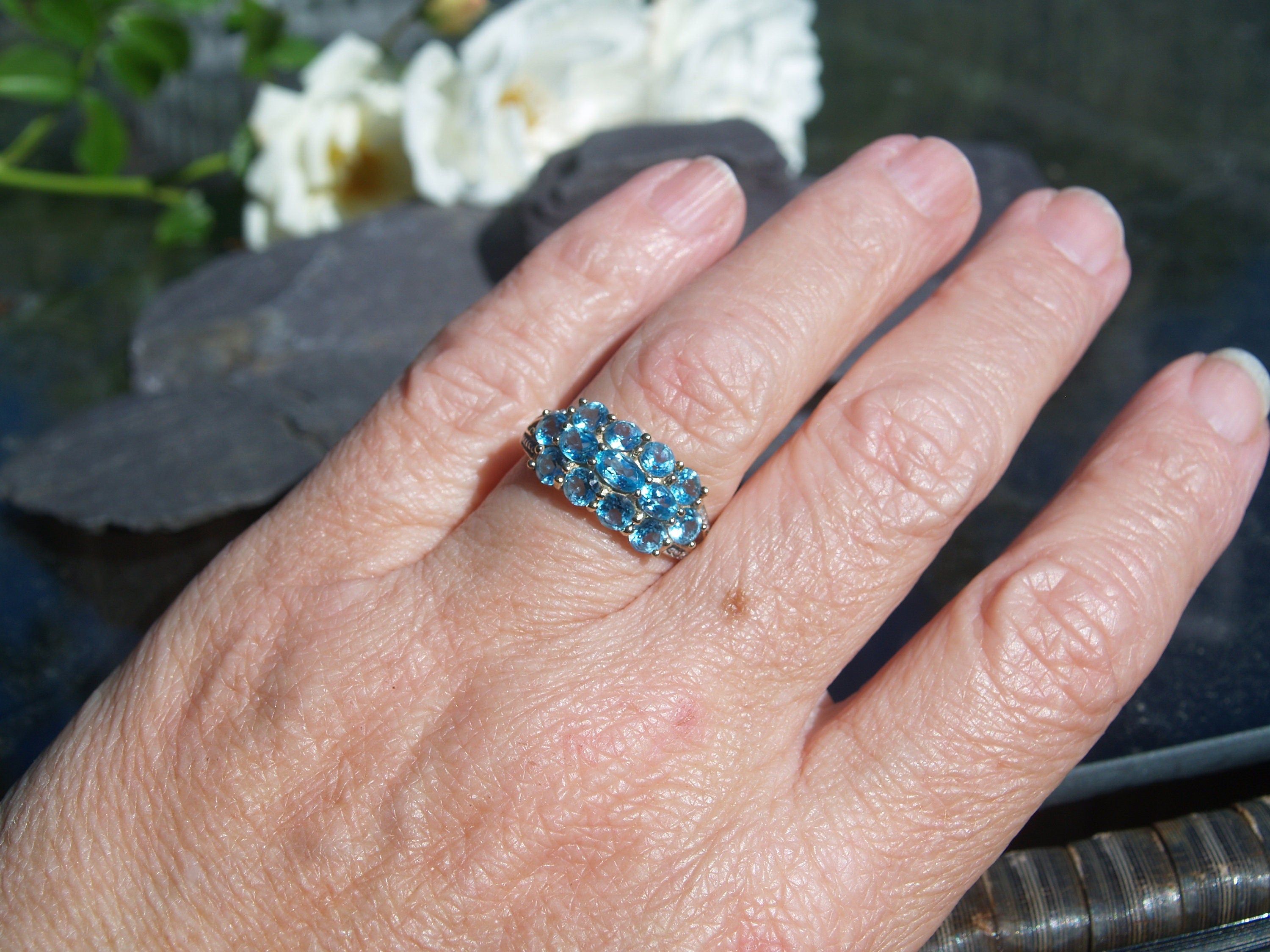 An eye catching 9ct gold ring set with three rows of baby blue Topaz and finished with a Diamond accent to each shoulder.