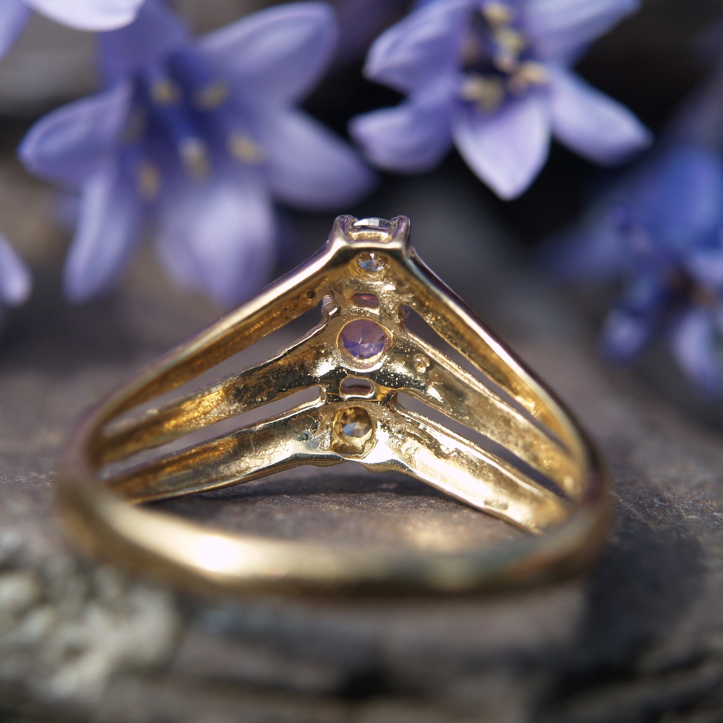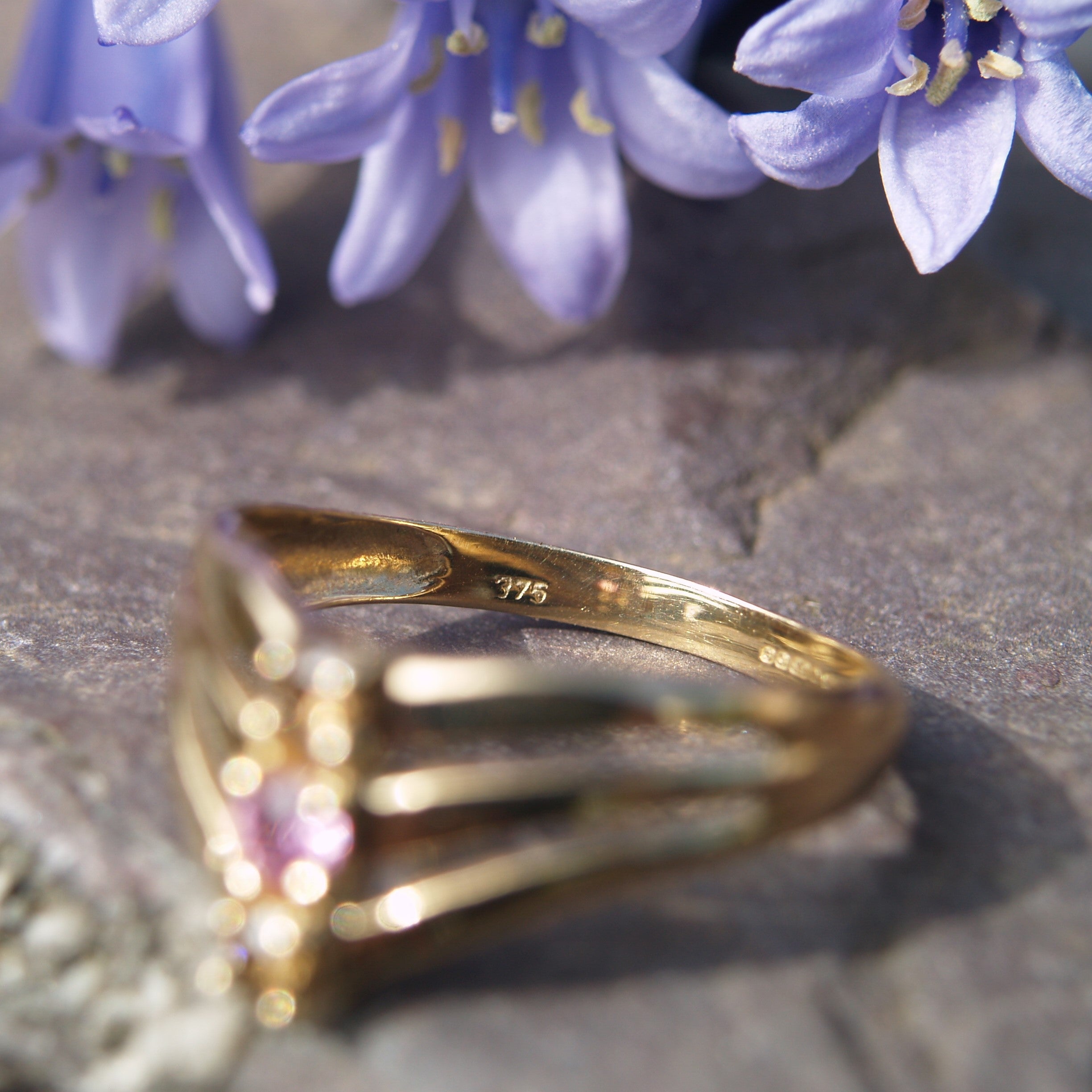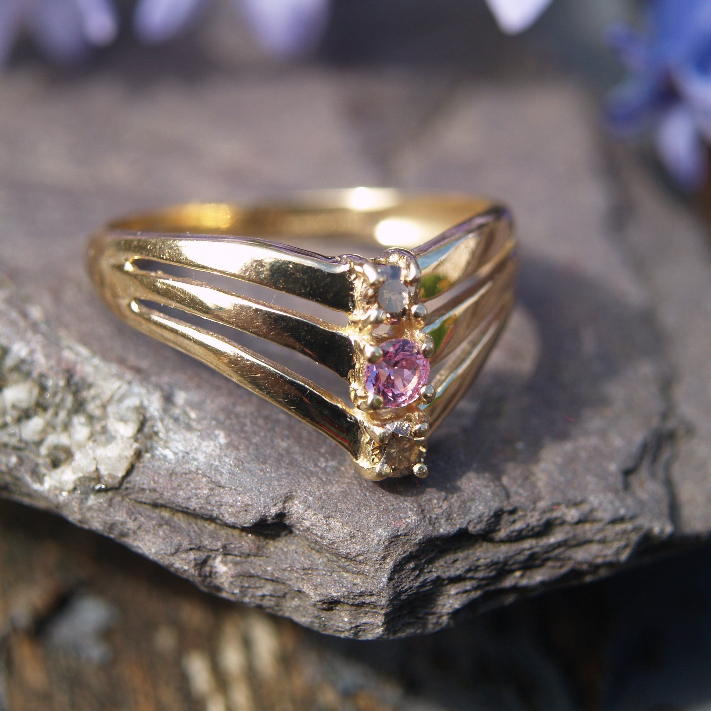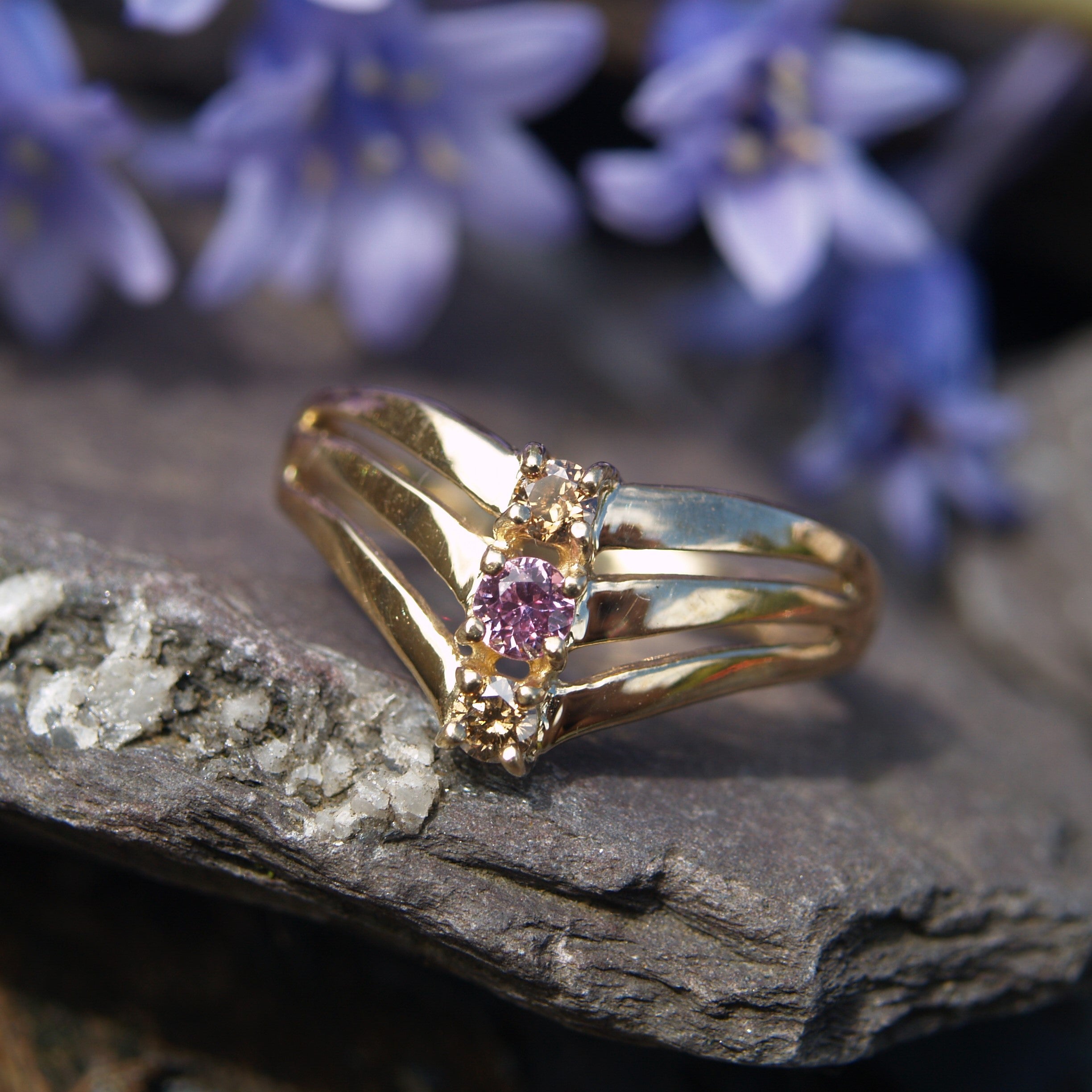 An unusual 9ct gold wishbone ring set with two round brilliant 'Cognac' Diamonds ( S to Z Tinted) and a central pink Sapphire. Full hallmarks for Birmingham 375 2004.