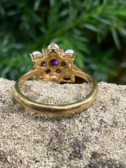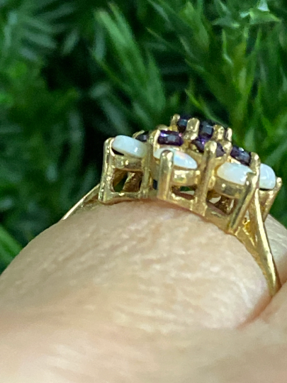 A striking 9ct gold cluster ring set with white Opals and Amethyst purple Cubic ZirconiasFinger size N1/2 or 7 USIn excellent conditionWill arrive gift boxedFree tracked shipping/UK next...