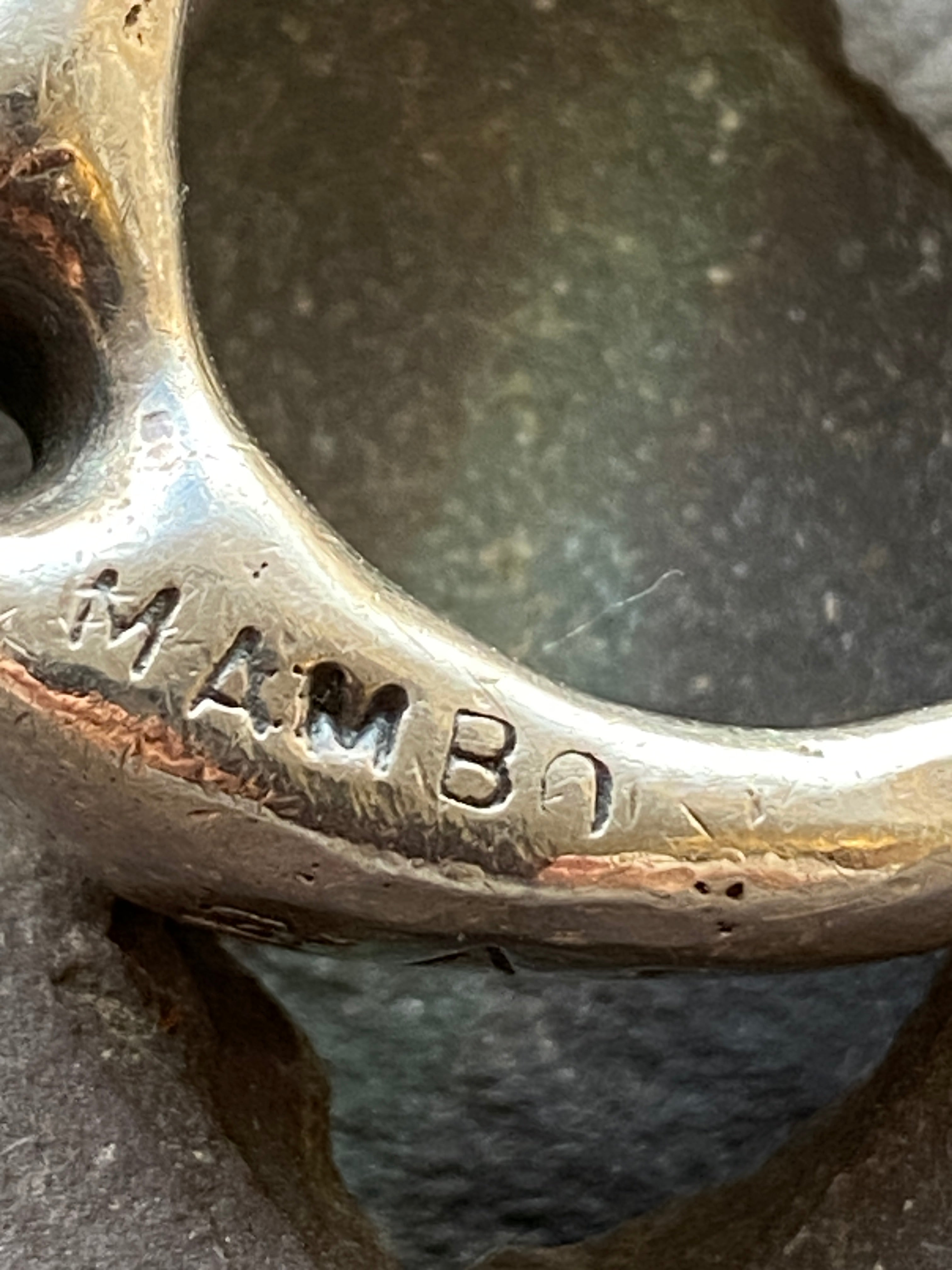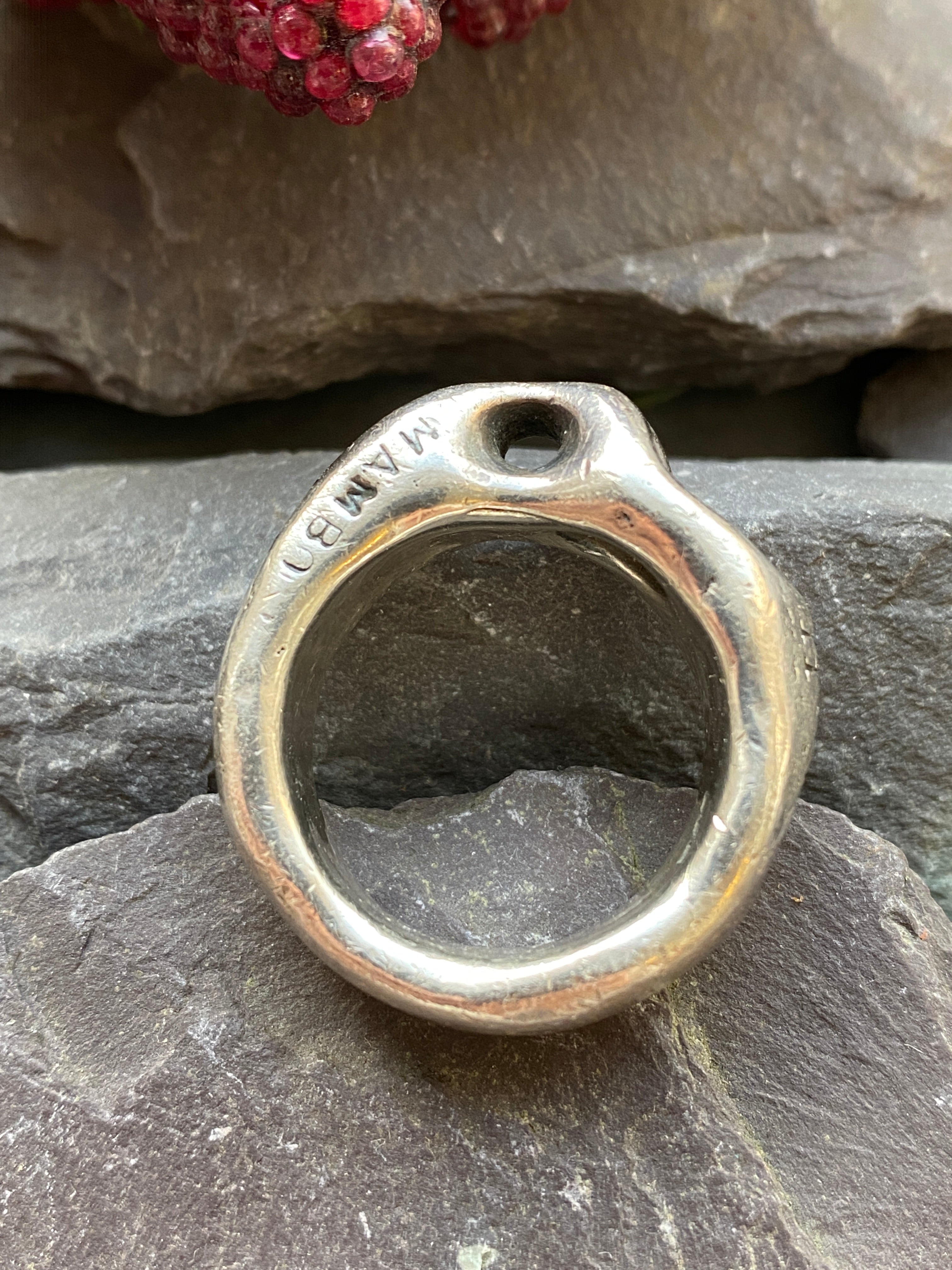 A vintage solid sterling silver ring weighing 25.14g stamped with 'I've got the horn'Made by mamboFull hallmarks for London 1995Oxidised letters and holes in the ringWe think it...