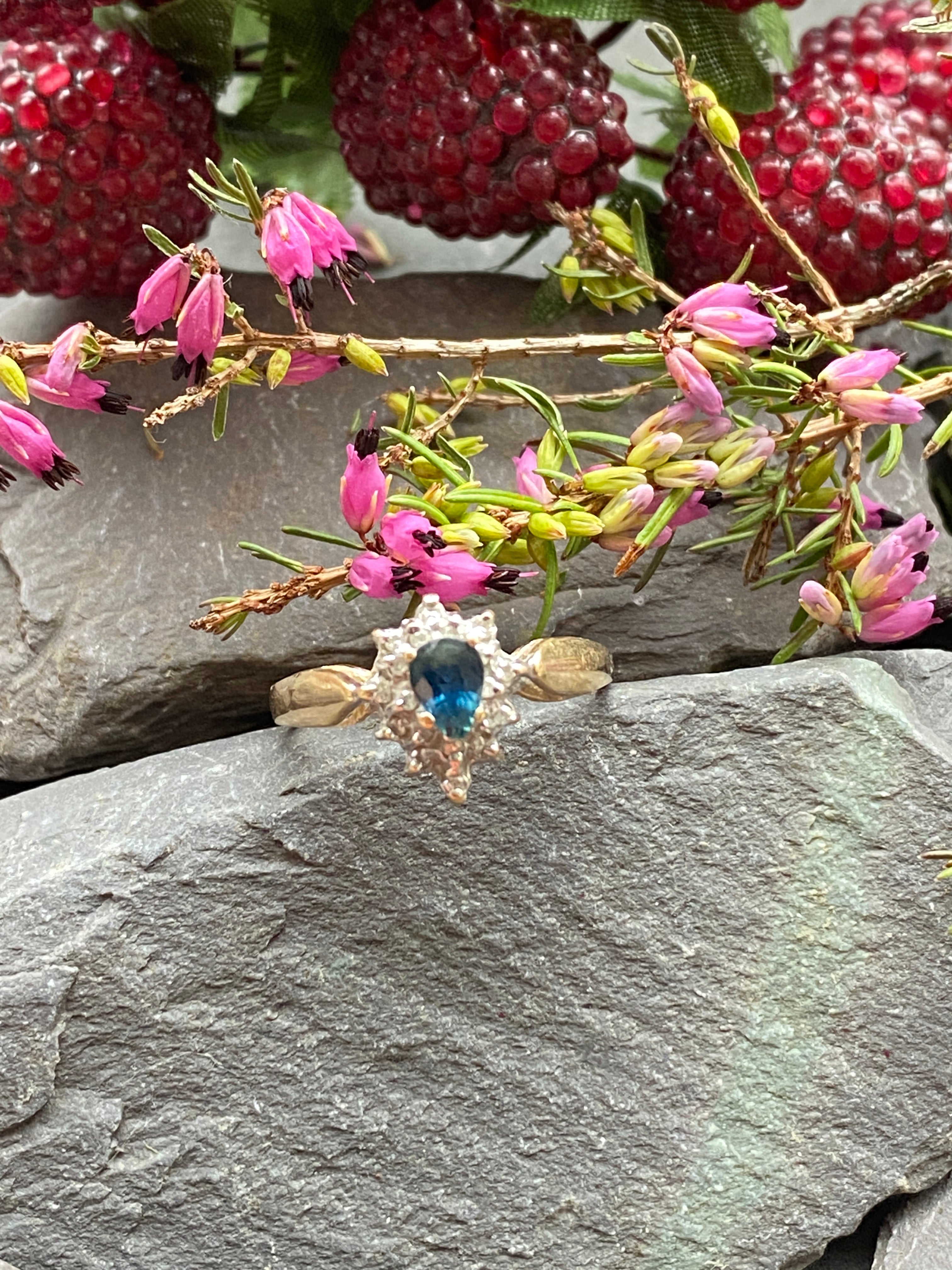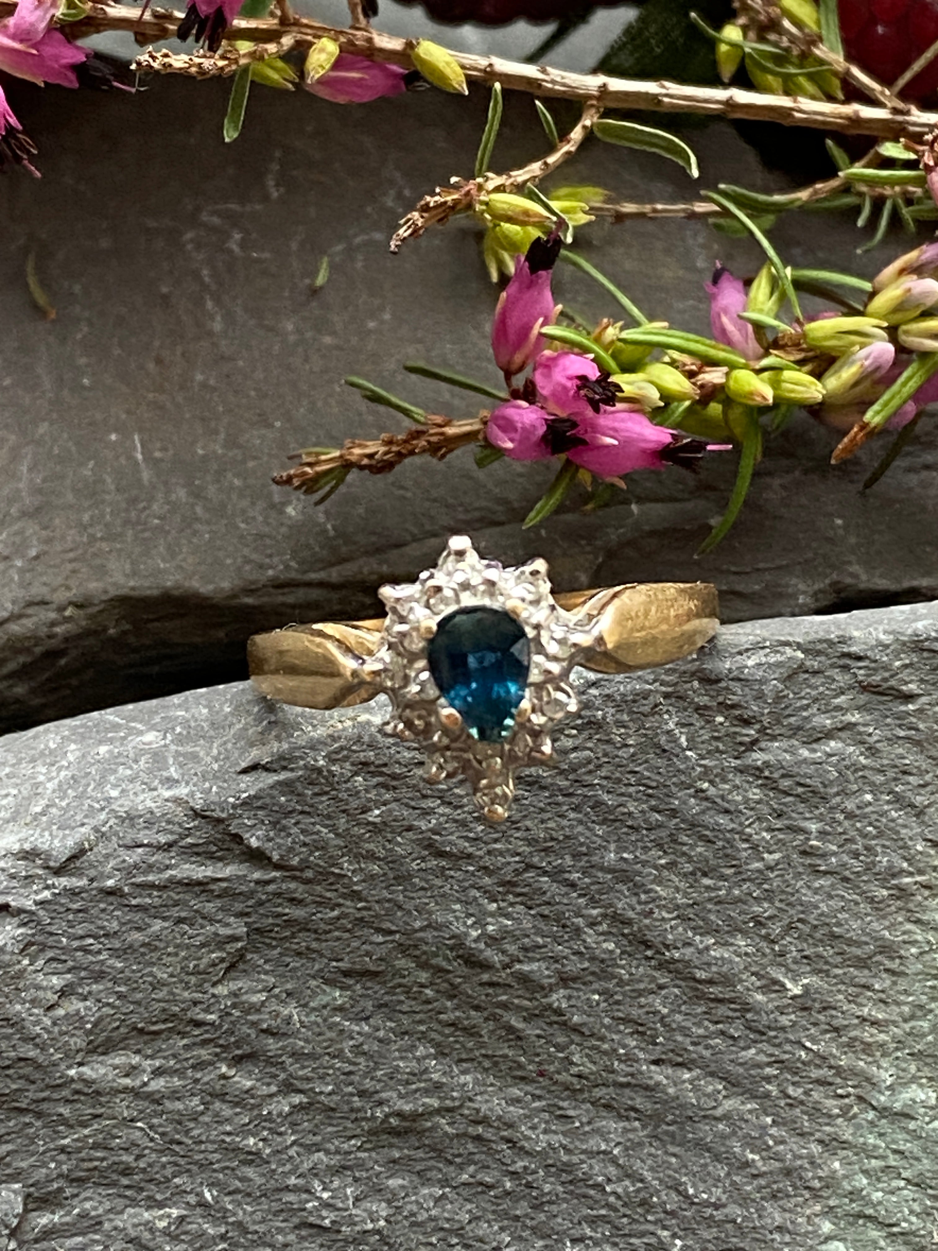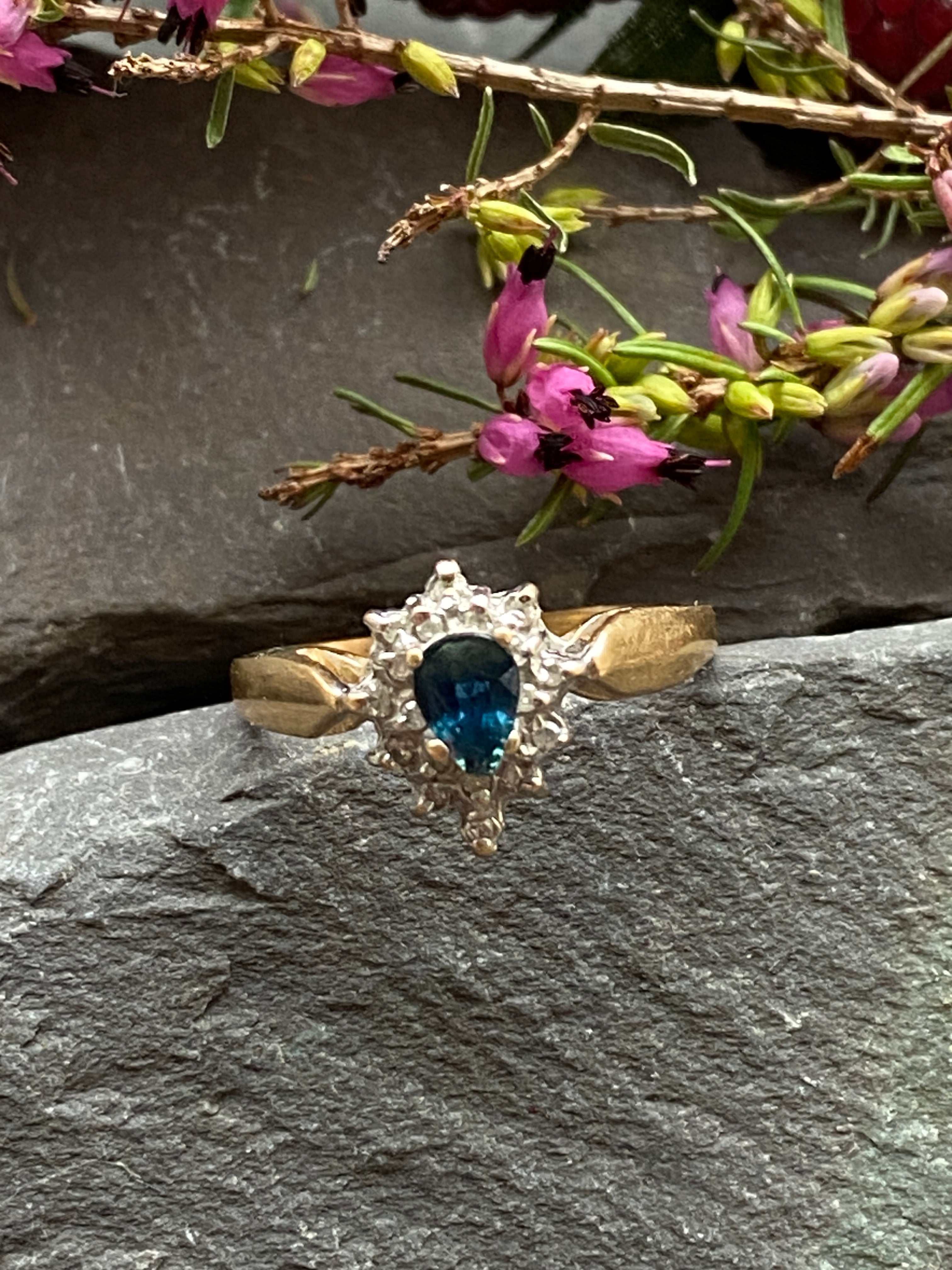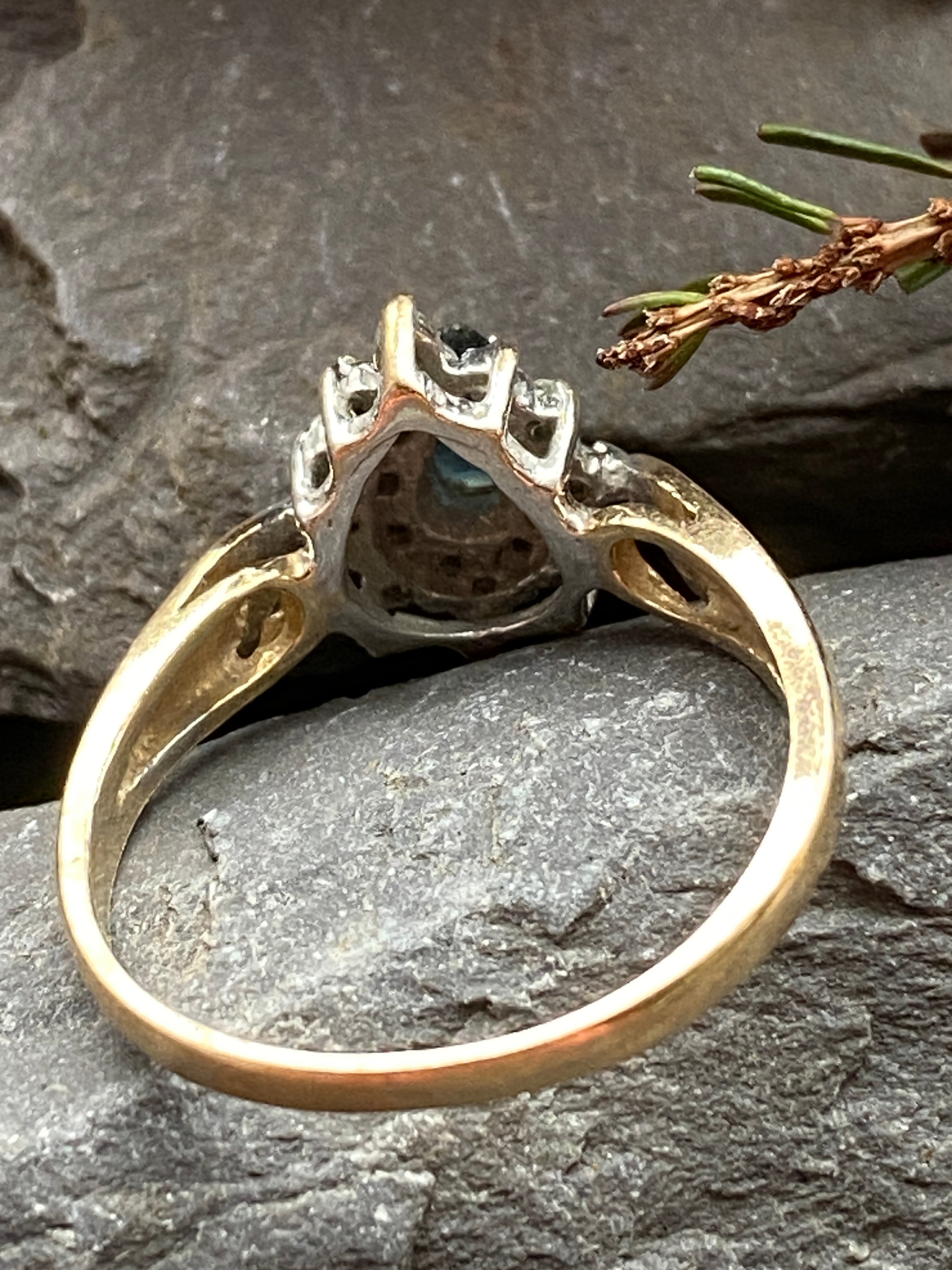 A very pretty 10ct gold ring set with a London blue topaz and Diamonds in a Rhodium enhanced setting