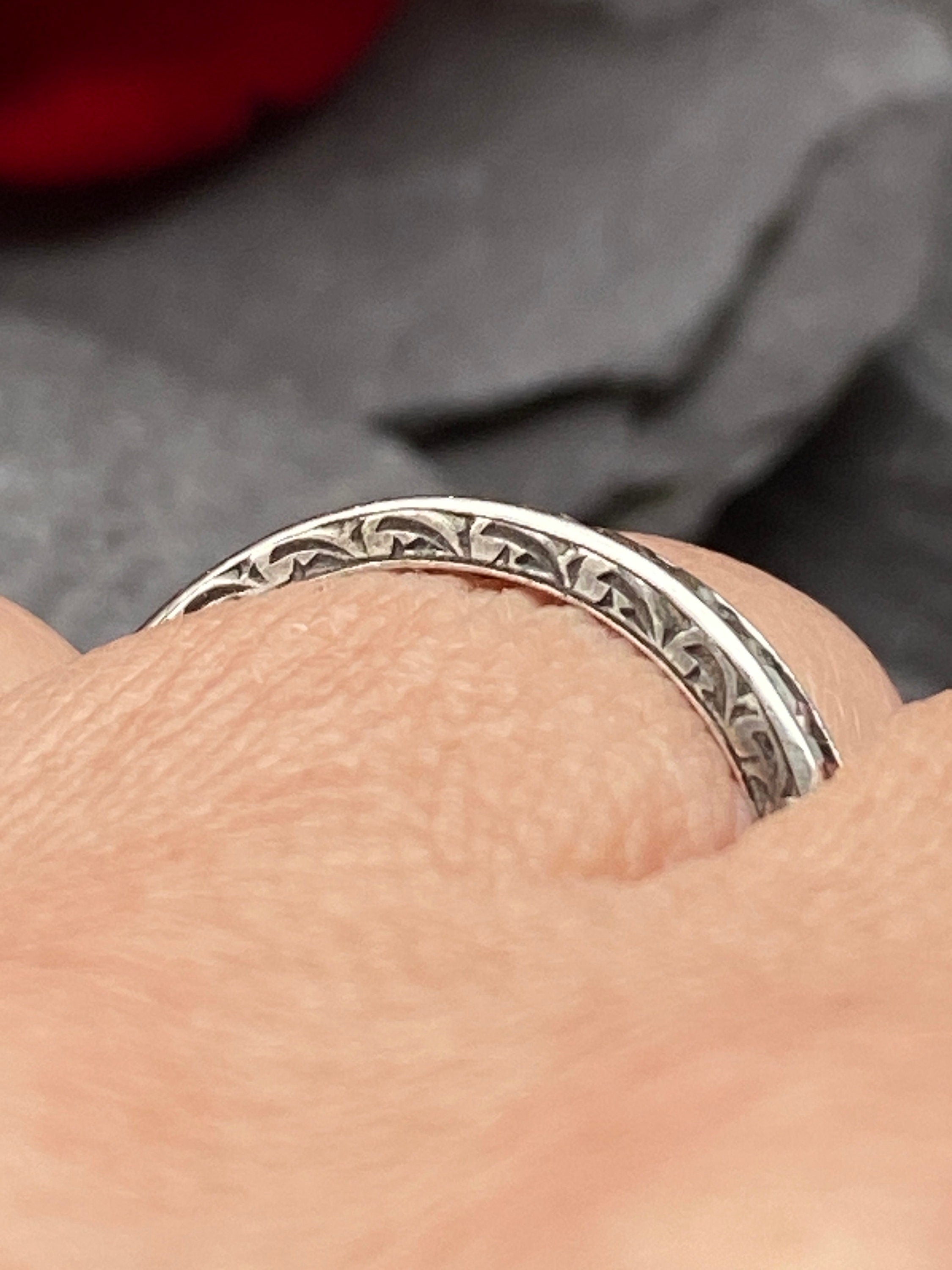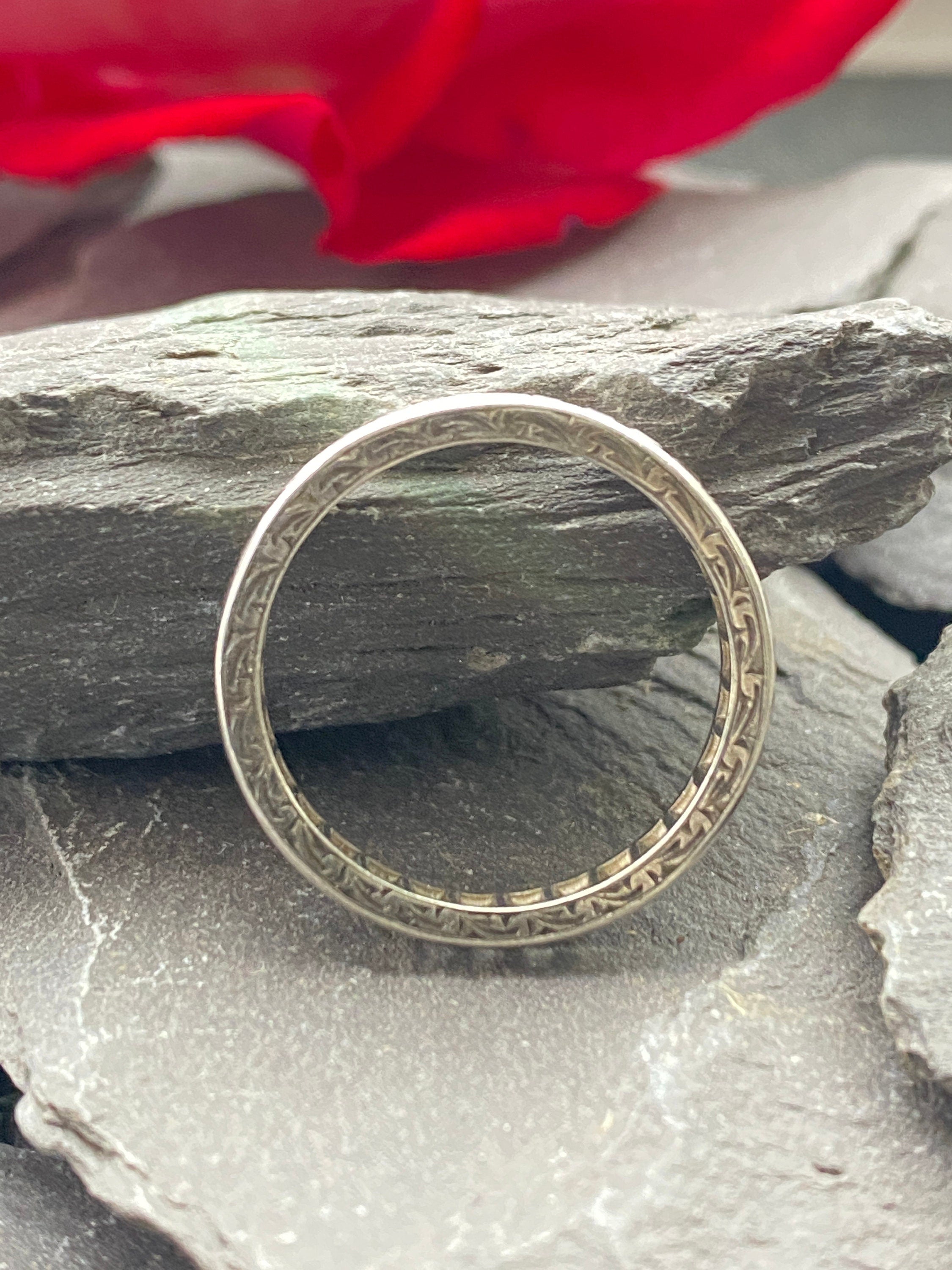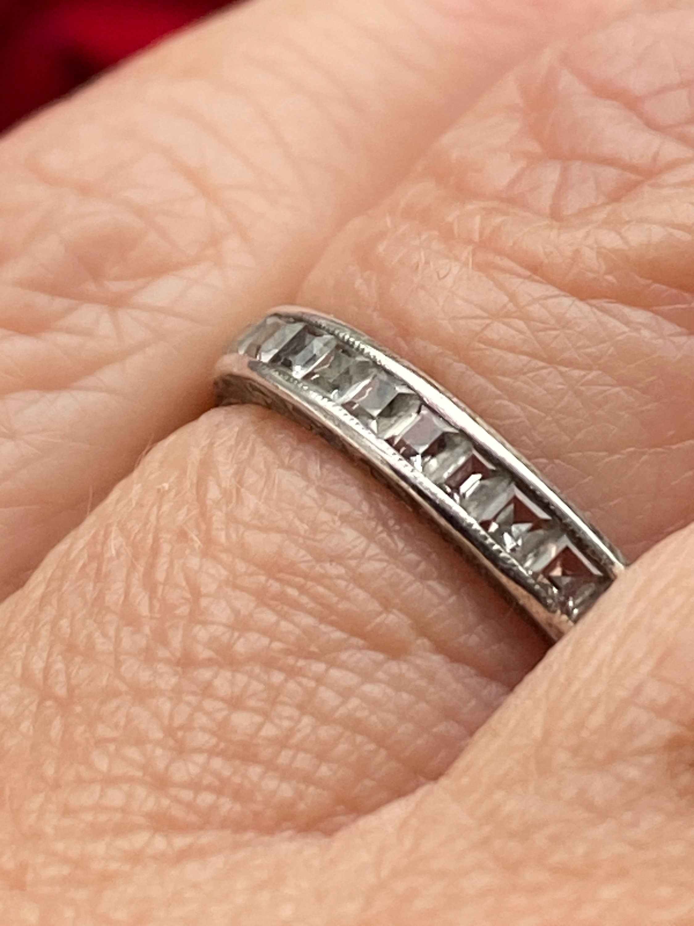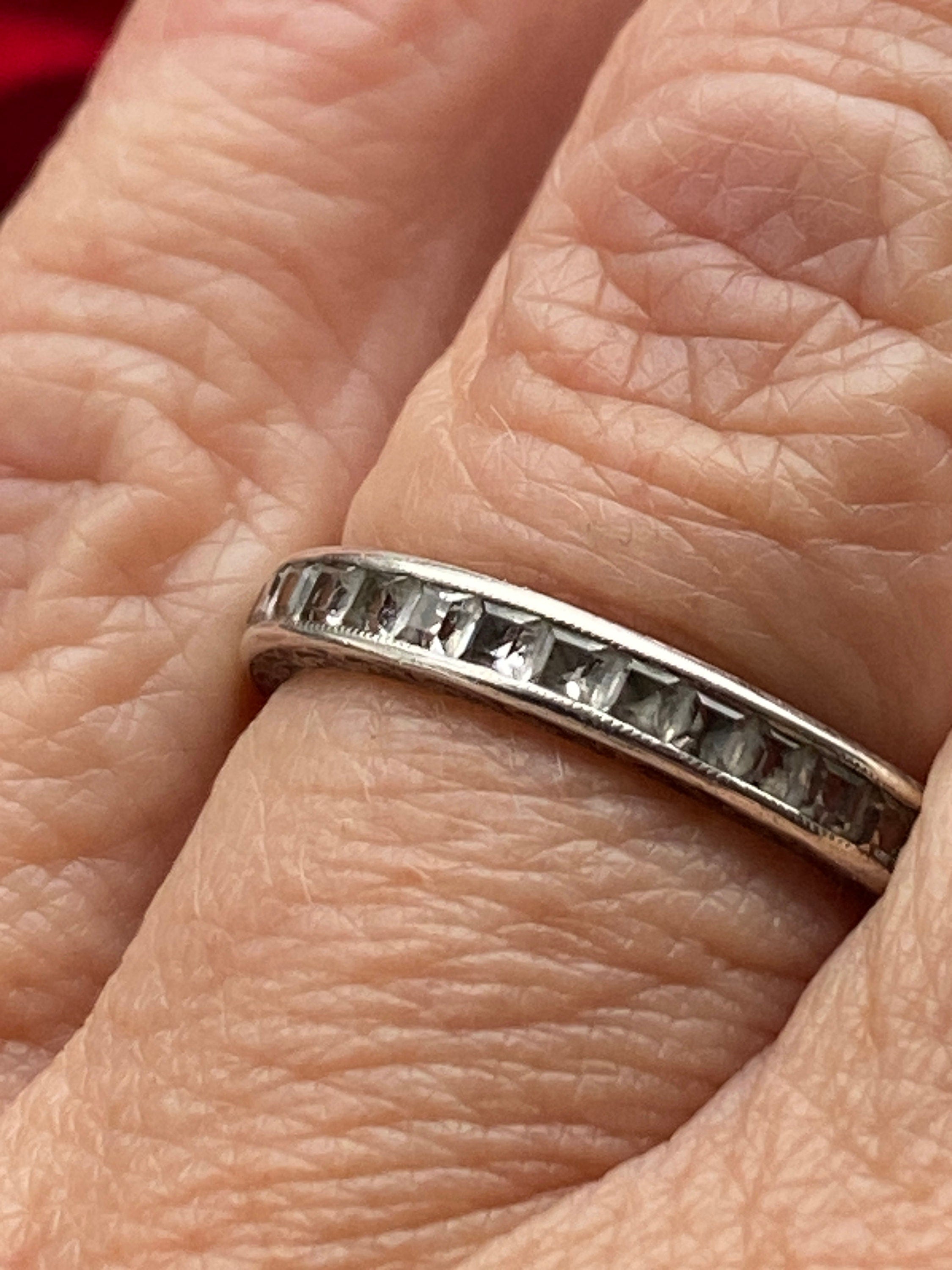 An Art deco period sterling silver full eternity ring set with square cut white sapphires in a channel setting