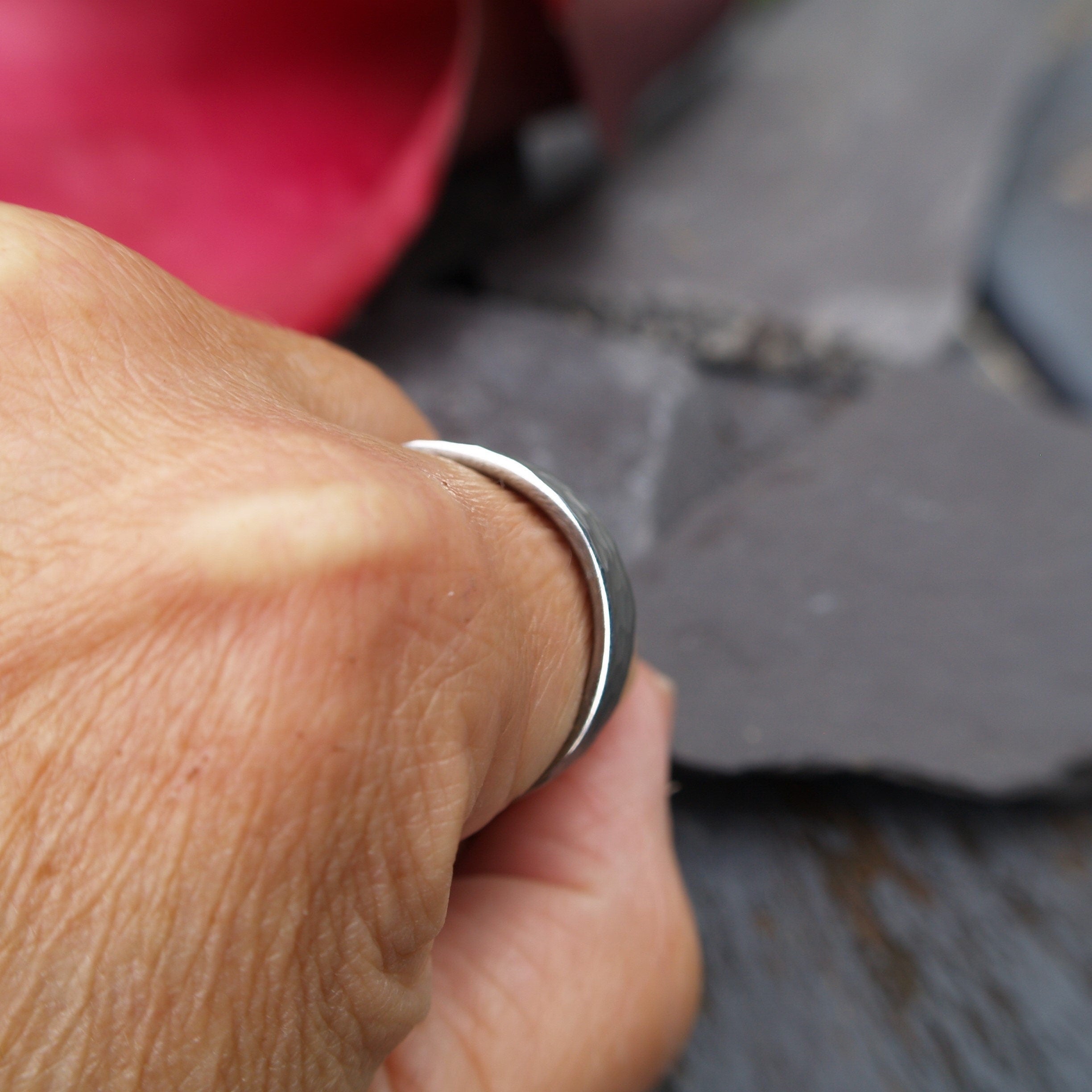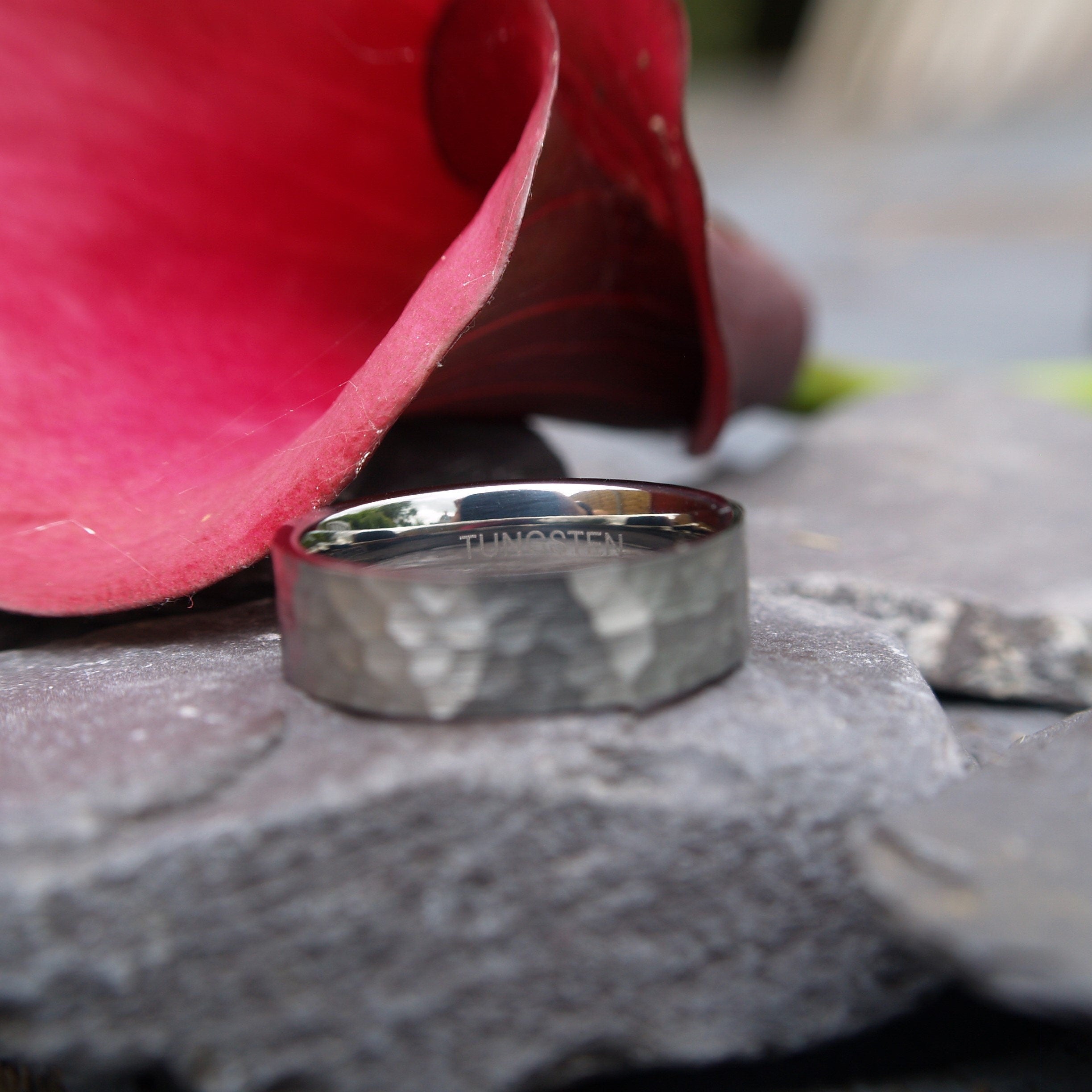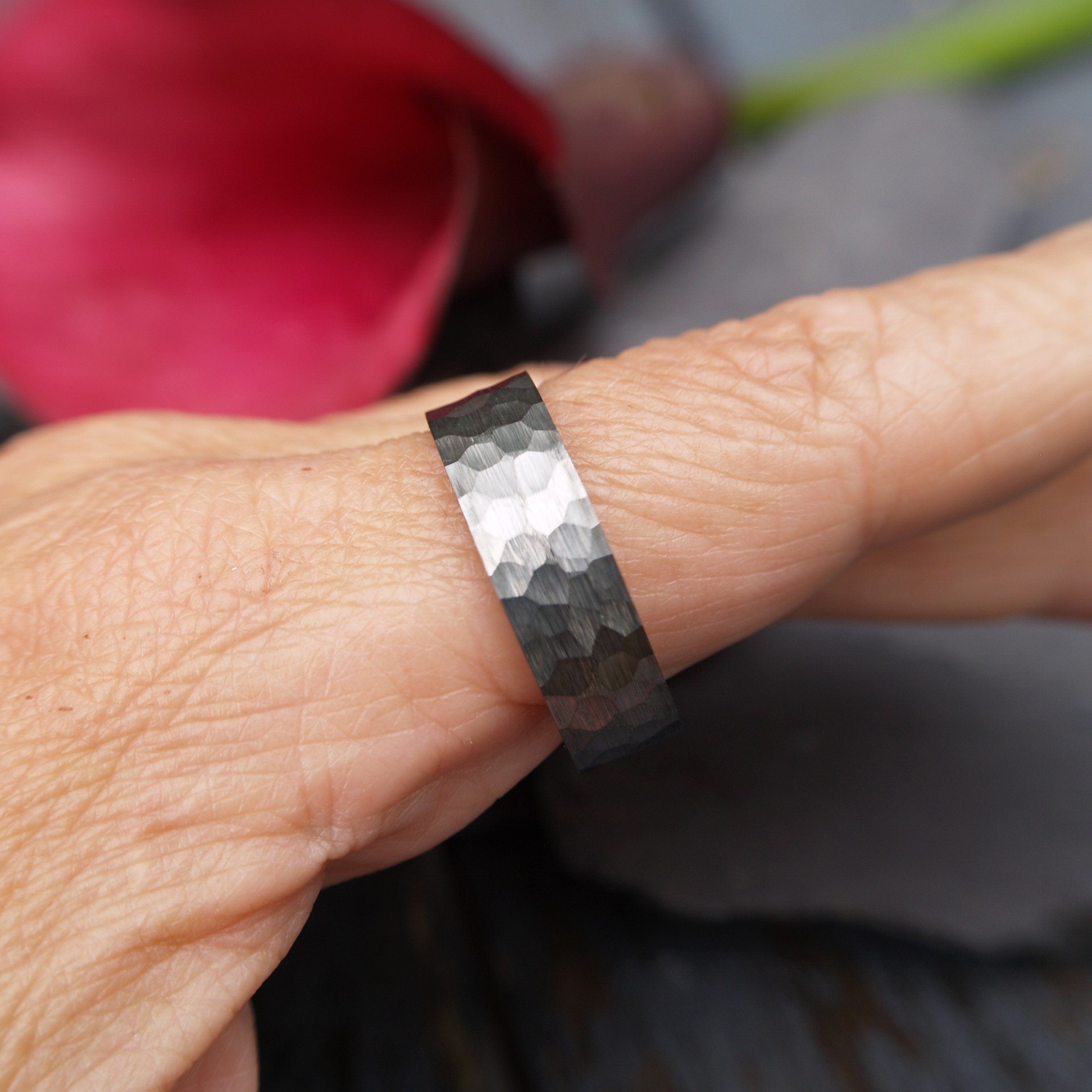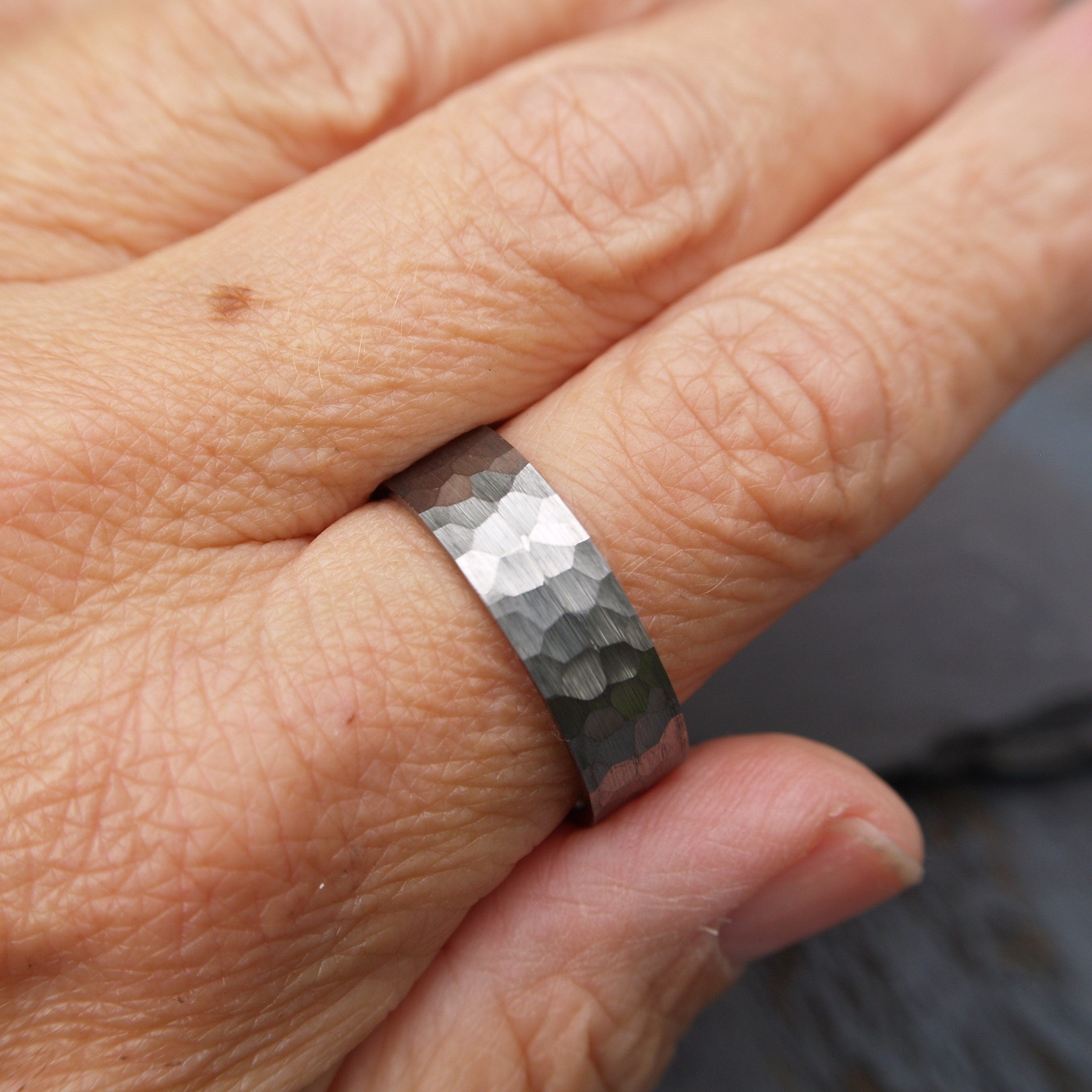 A very smart Tungsten ring with an etched hammered finish.