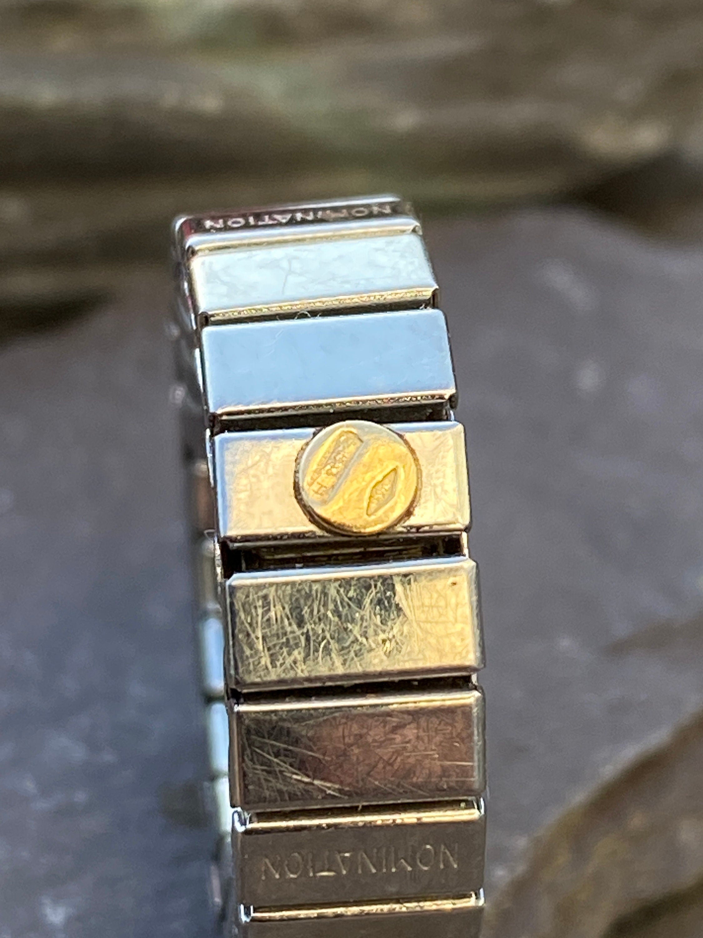 An ideal solution if you love rings but have enlarged knuckles.A Nomination stainless steel expanding ring set with a synthetic Opal and 18ct gold accents 18ct gold button...