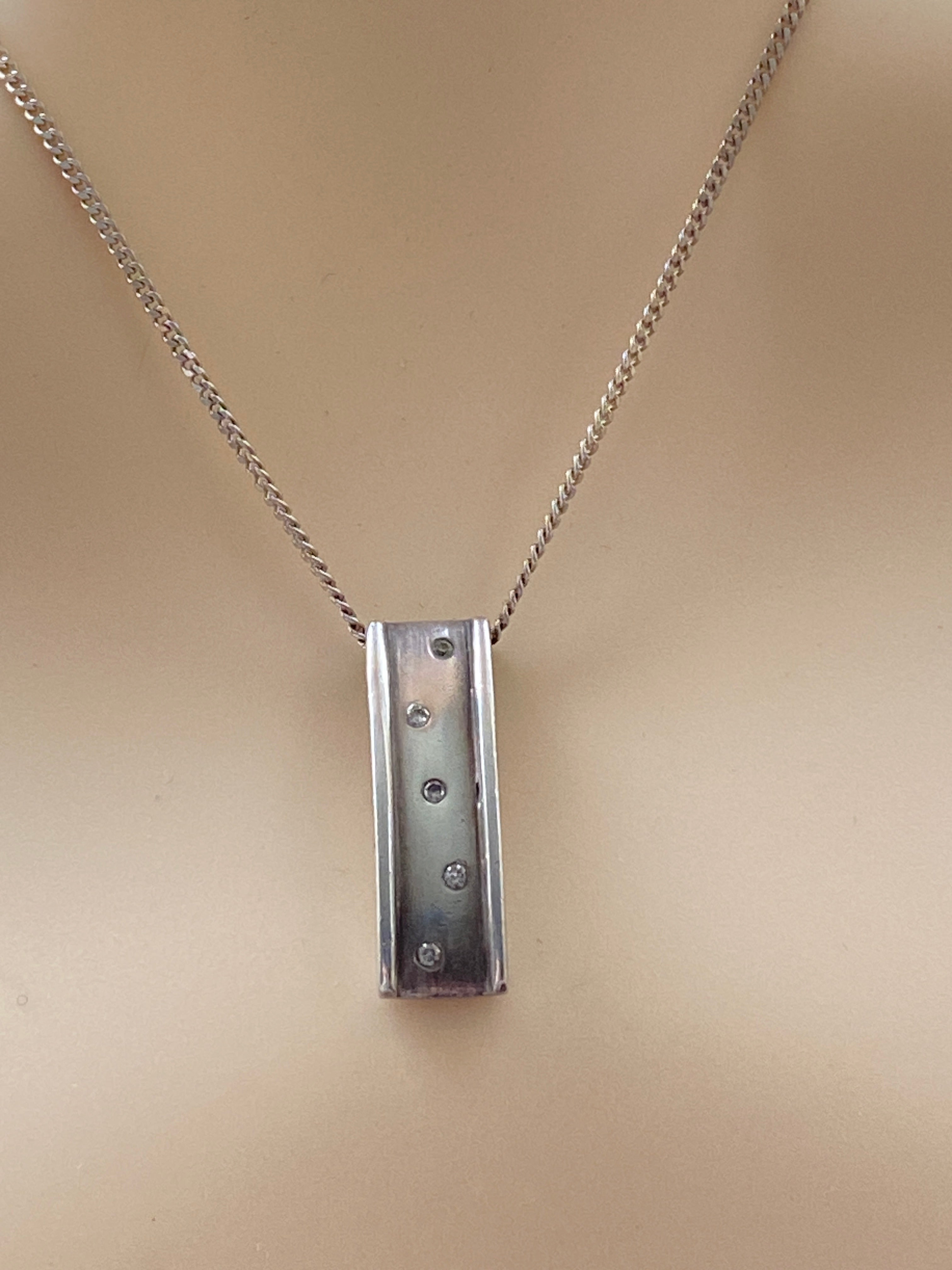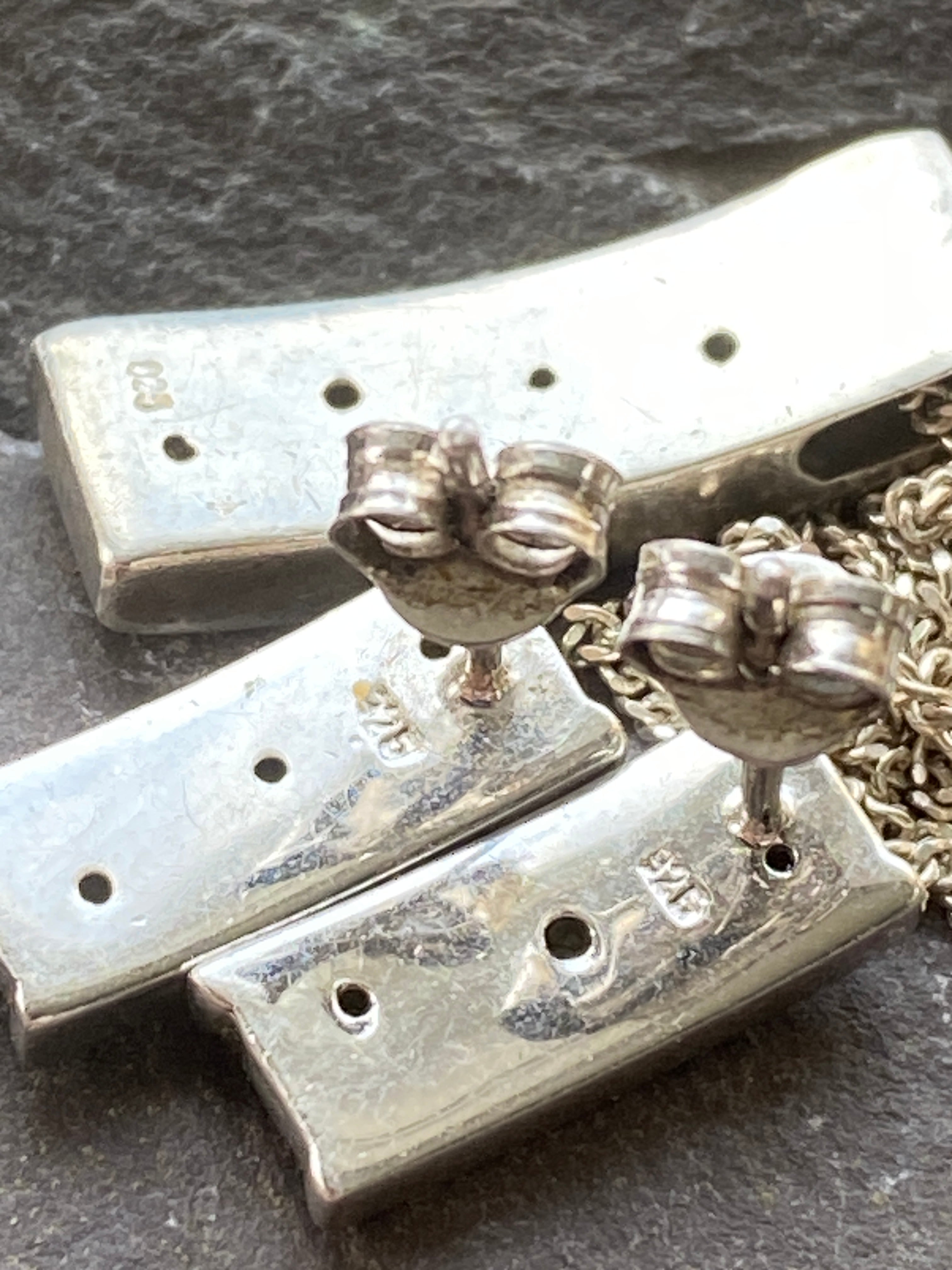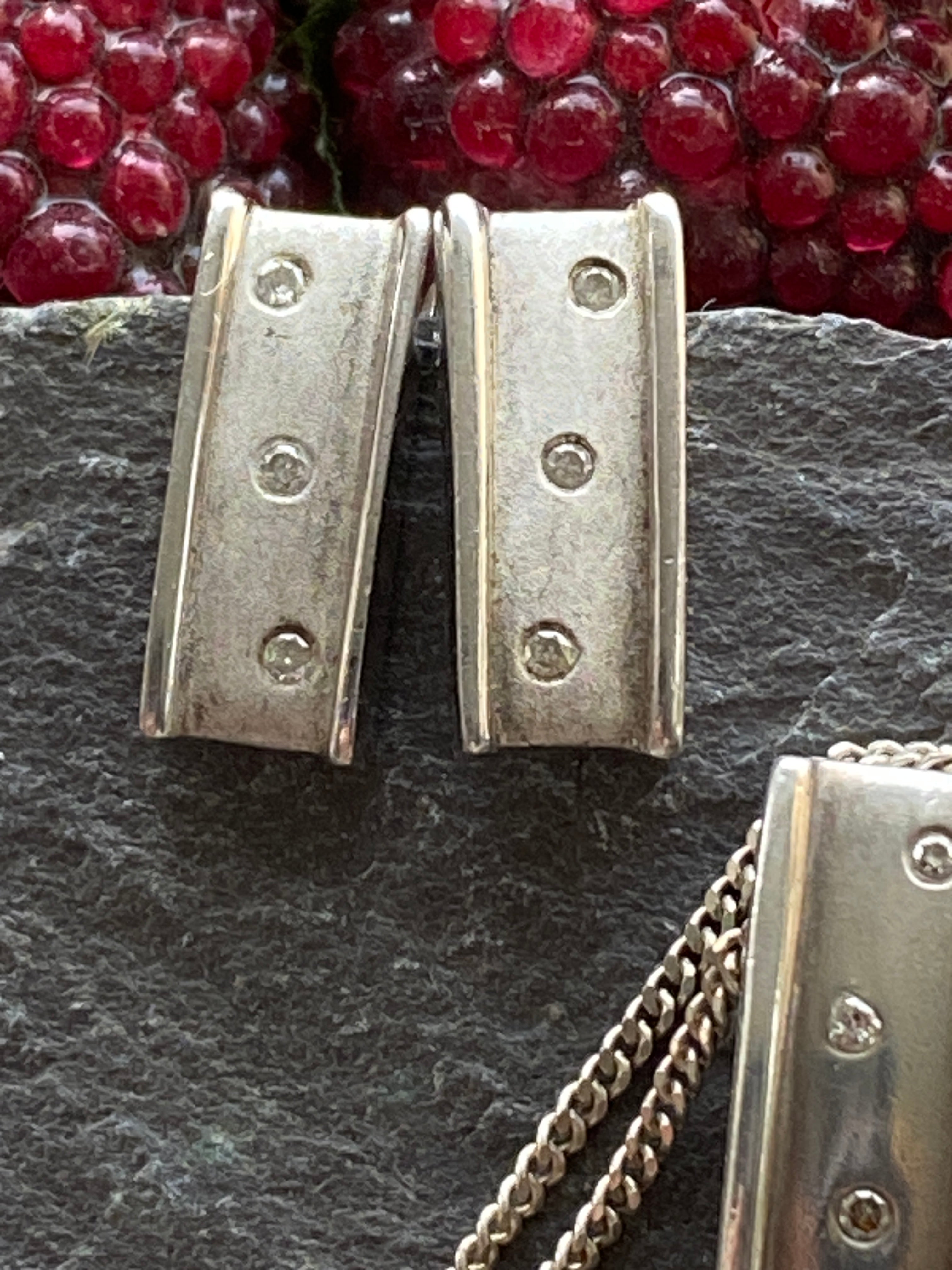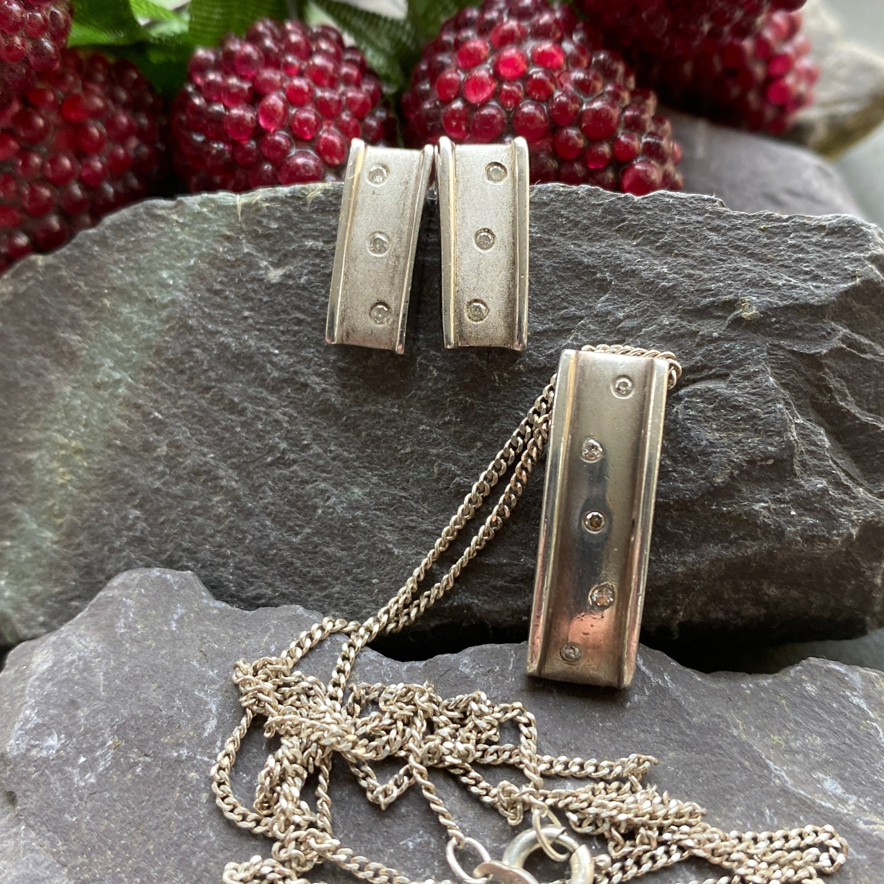 A minimalist sterling silver jewellery set featuring a pendant and earrings set with round brilliant Diamonds. Pendant suspended from a 18 inch curb link chain with bolt ring clasp