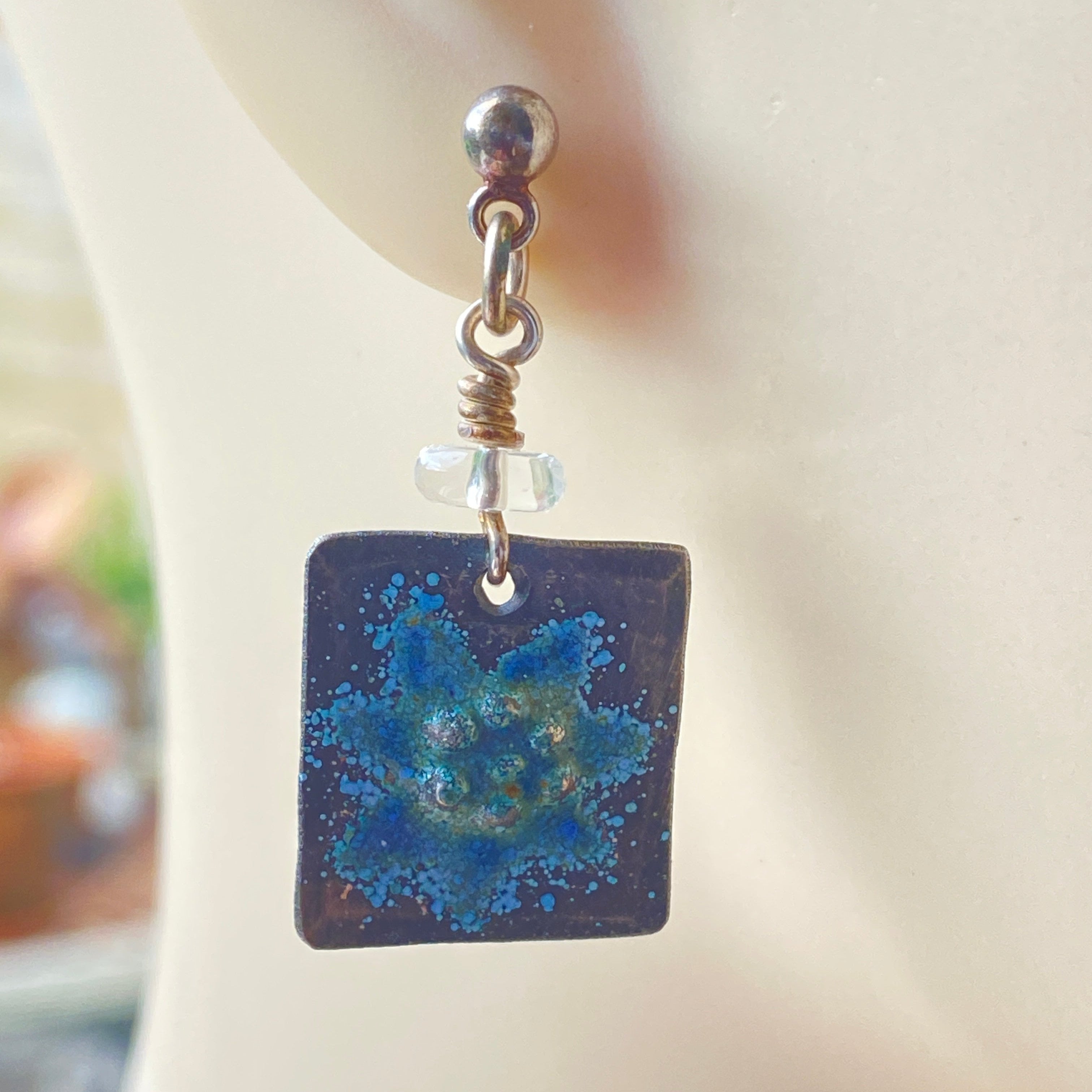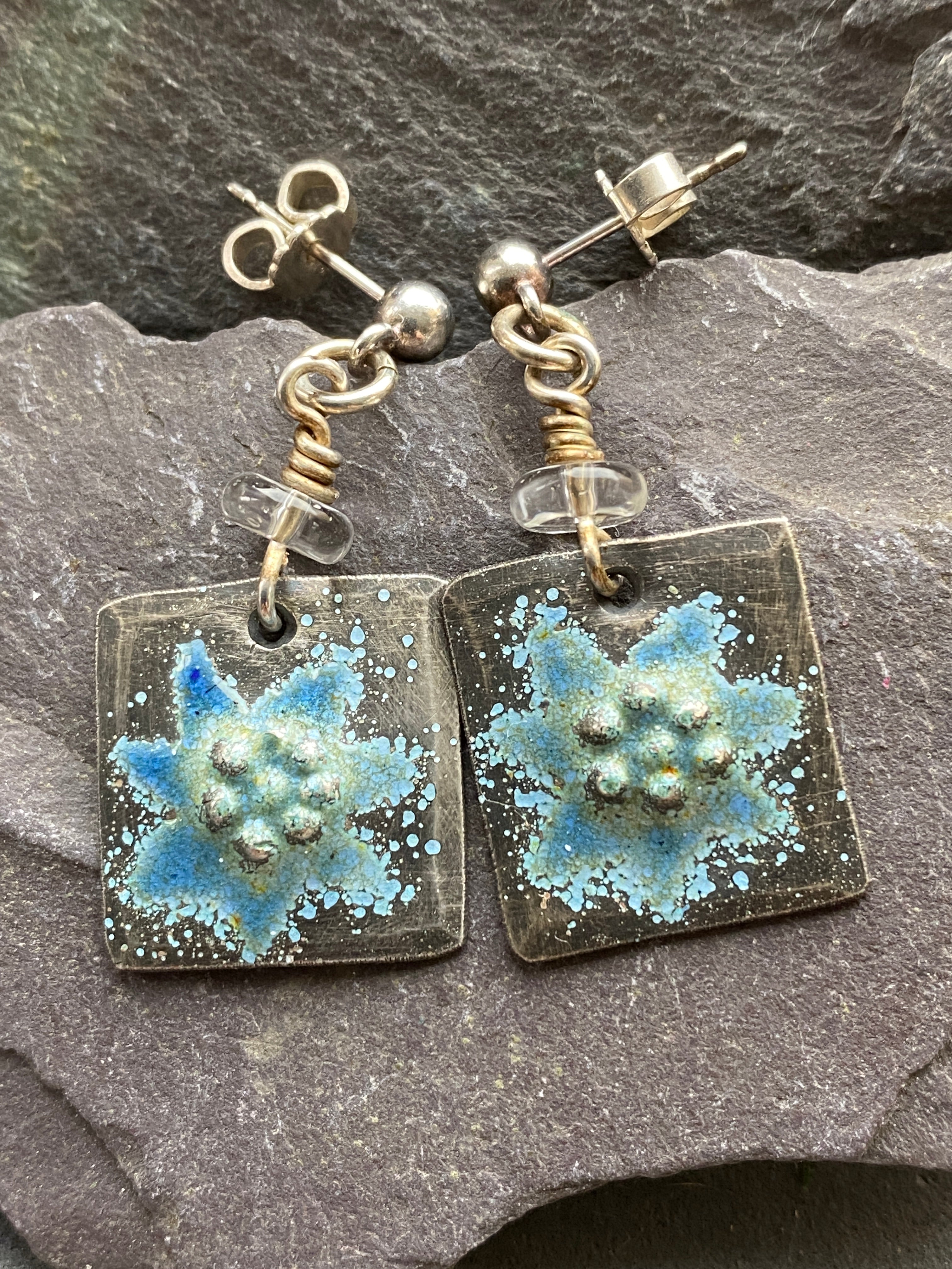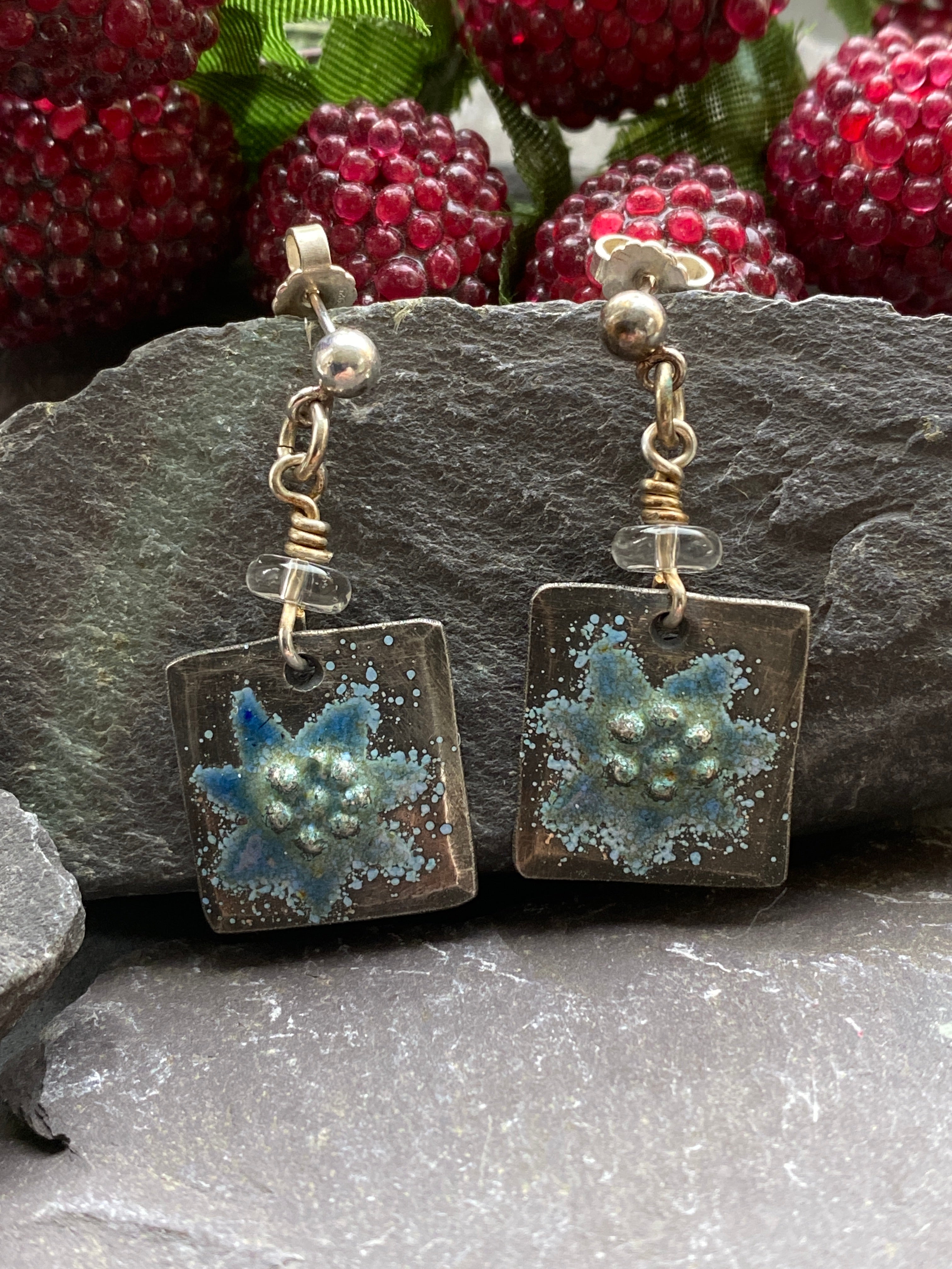 A cool pair of sterling silver earrings with a blue enamel flower design finished with a Quartz bead roundel.