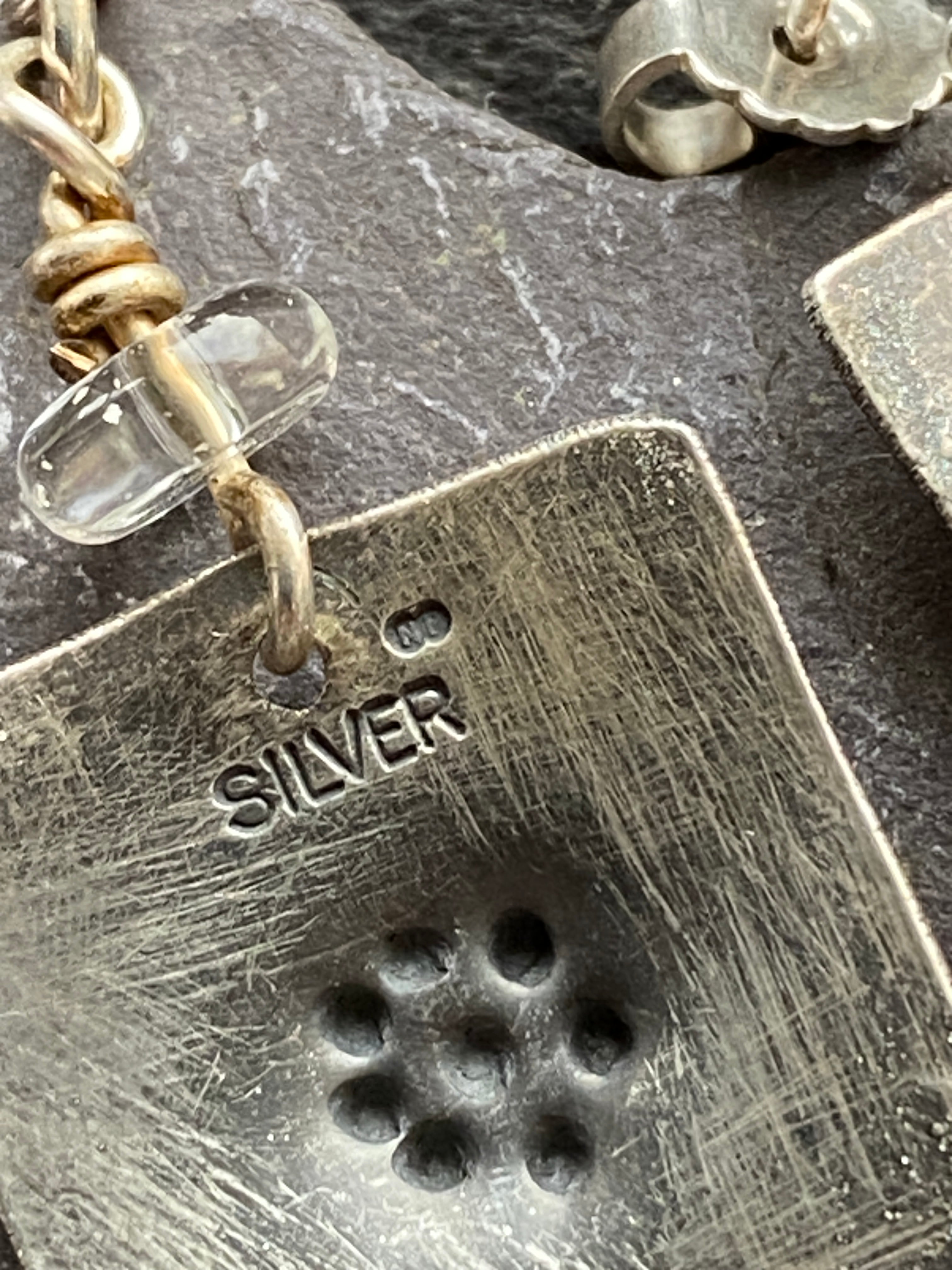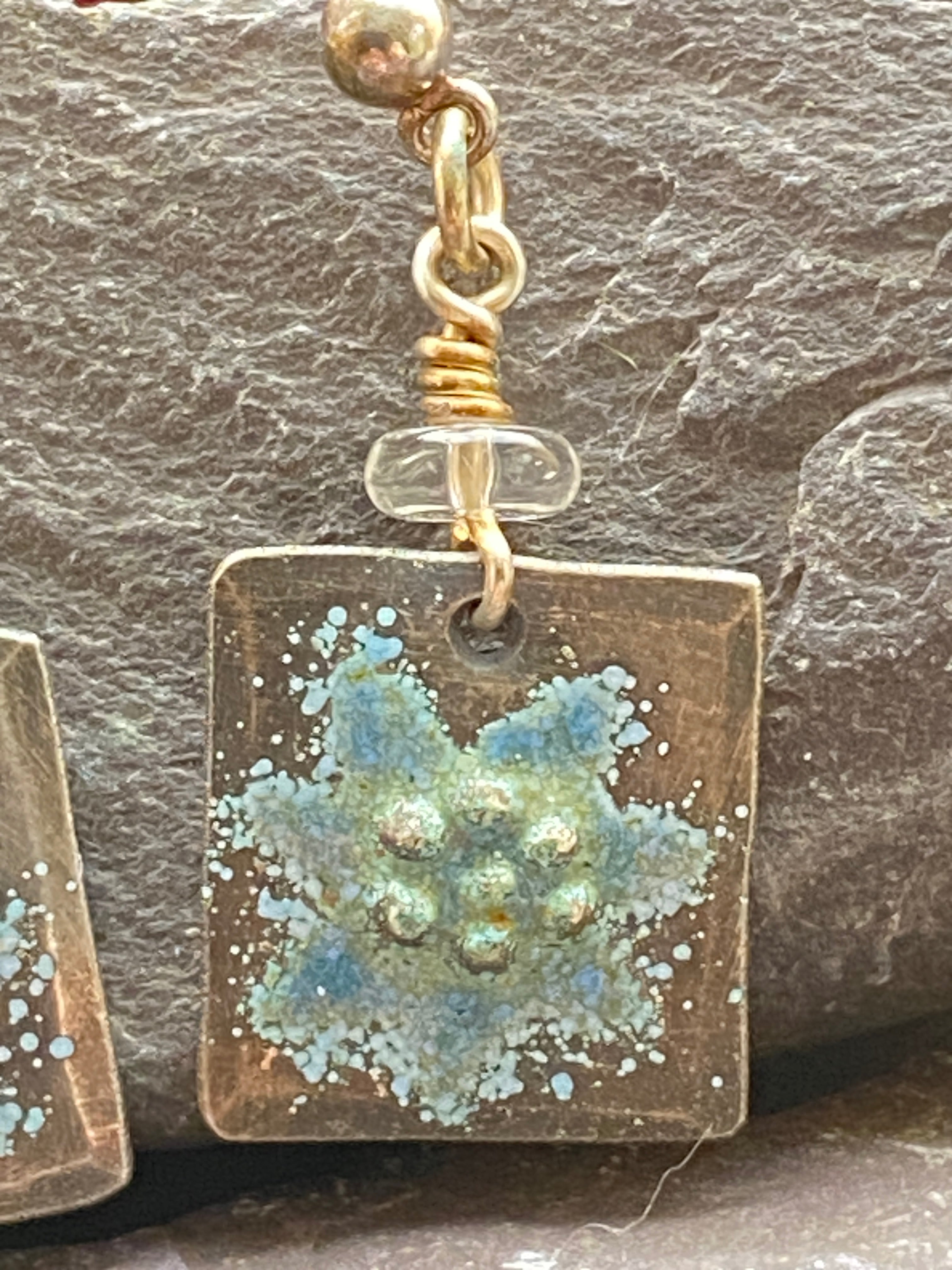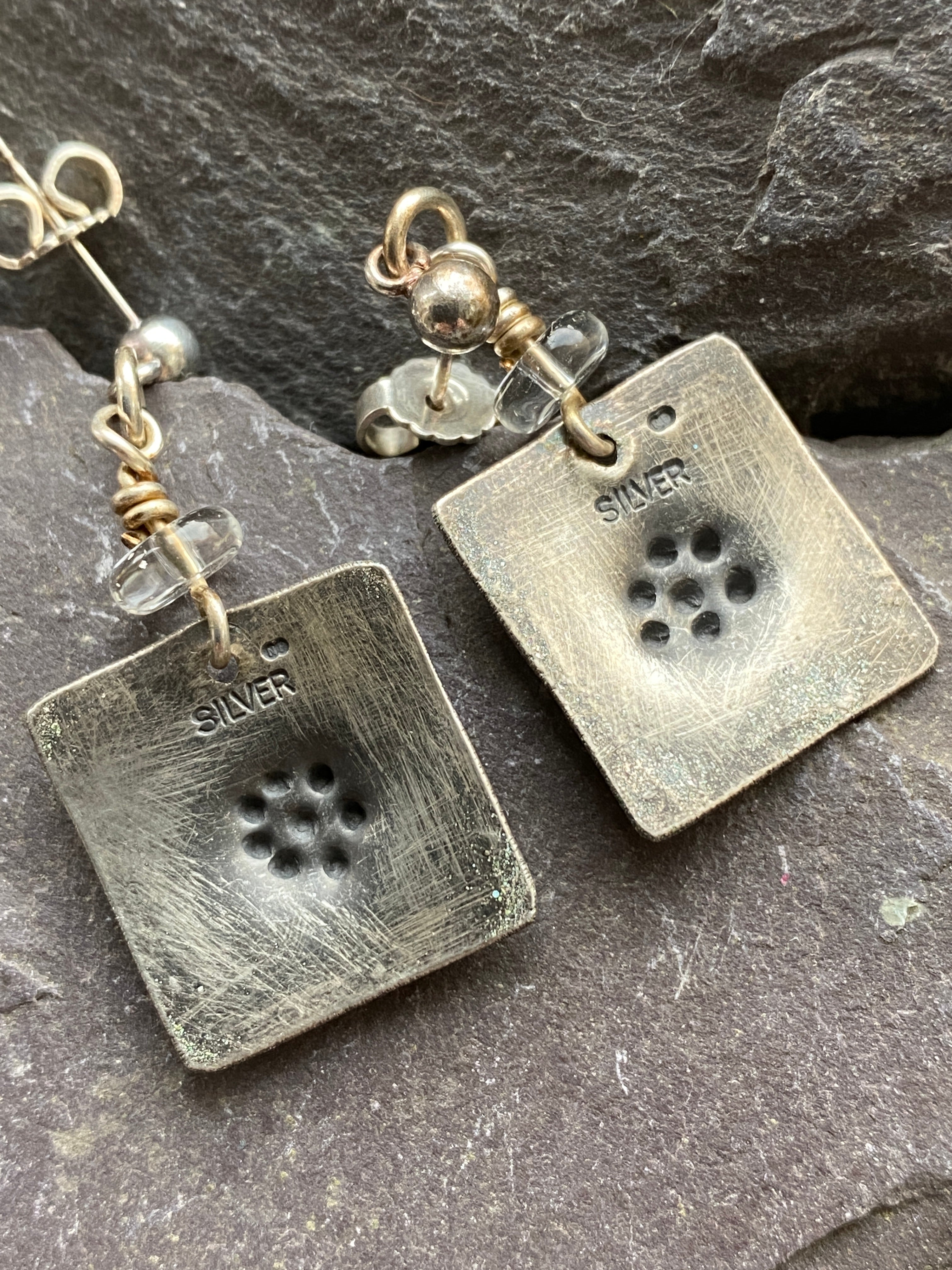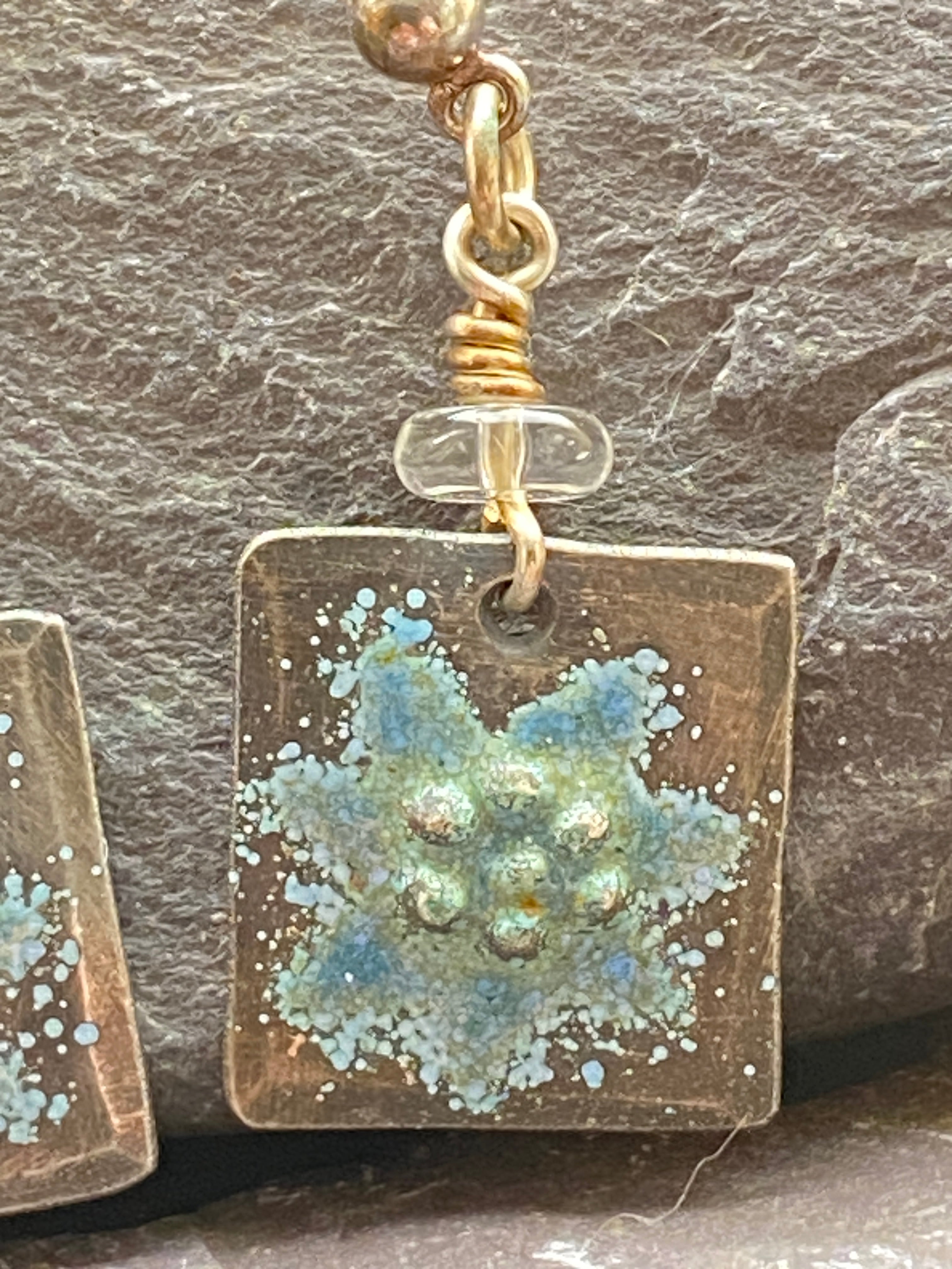 A cool pair of sterling silver earrings with a blue enamel flower design finished with a Quartz bead roundel.