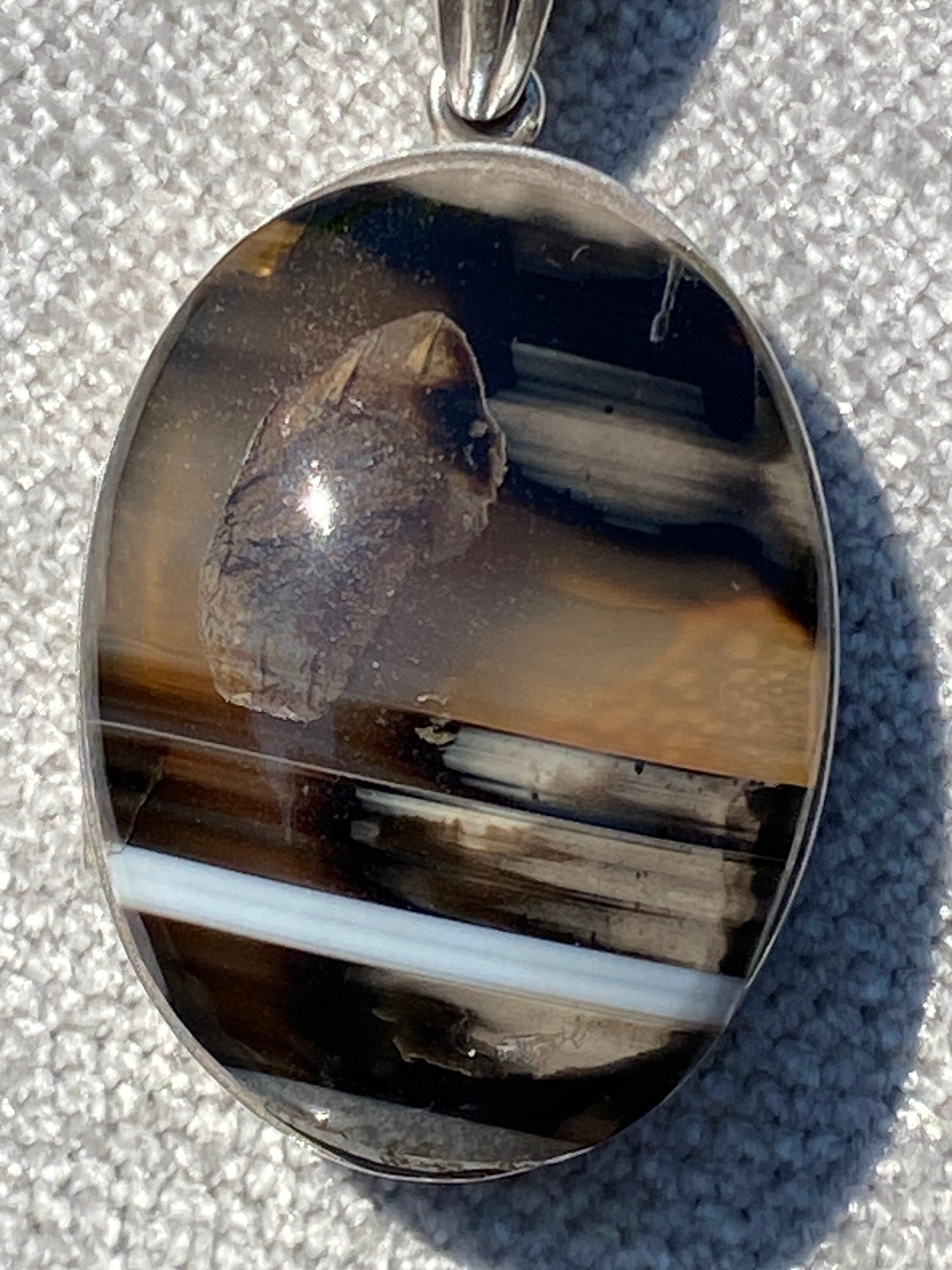 An unusual sterling silver locket set with a natural banded agate .