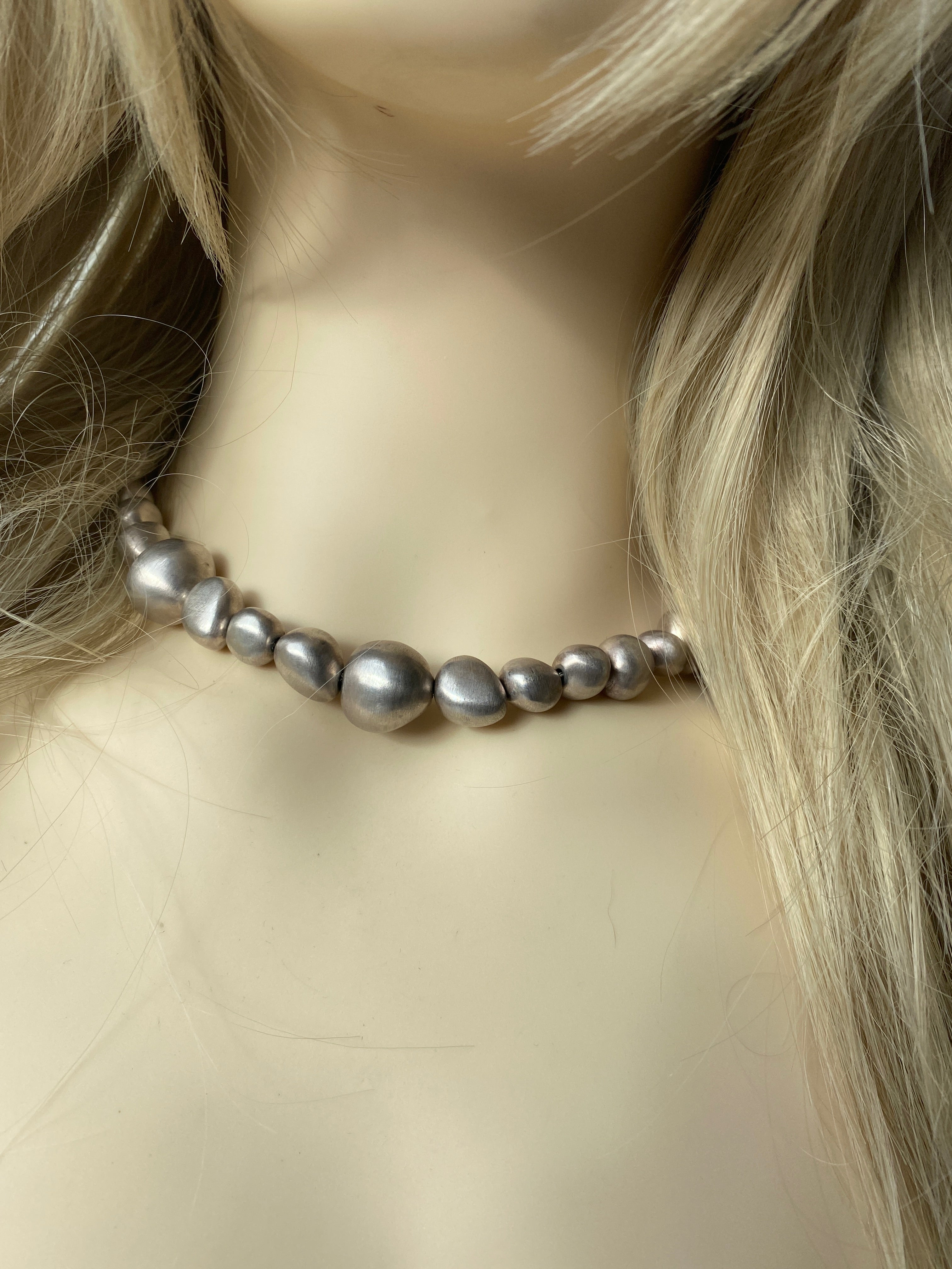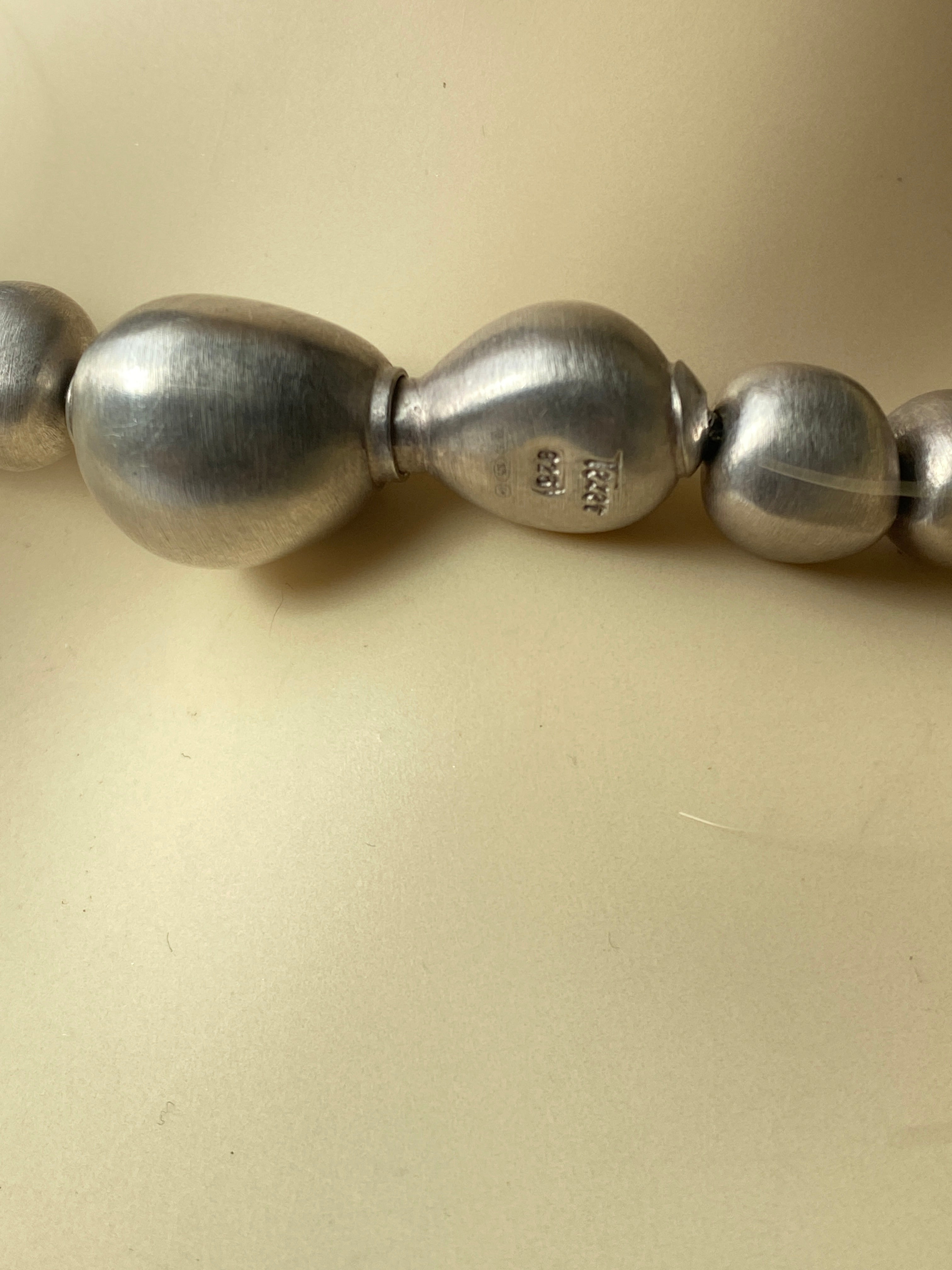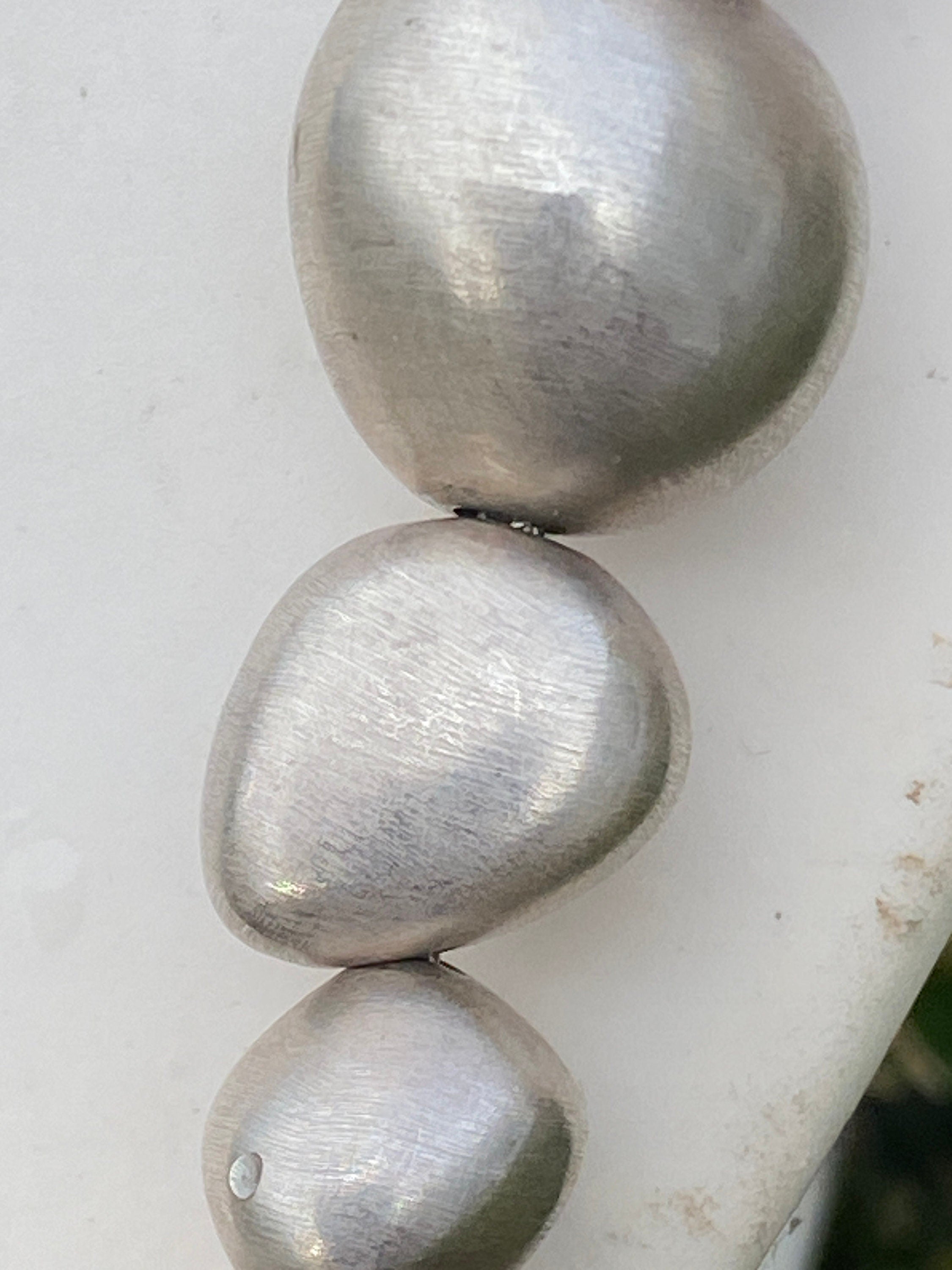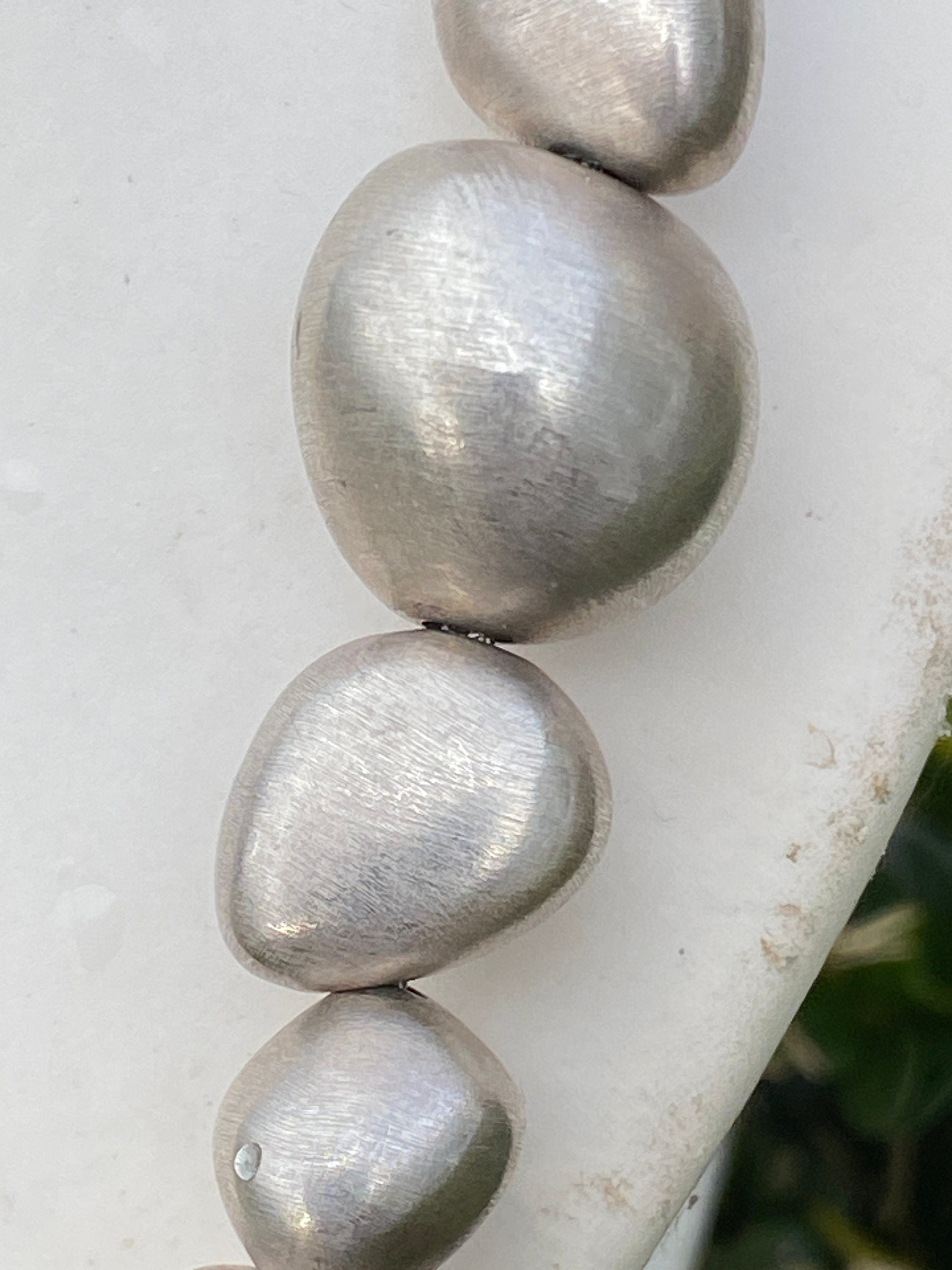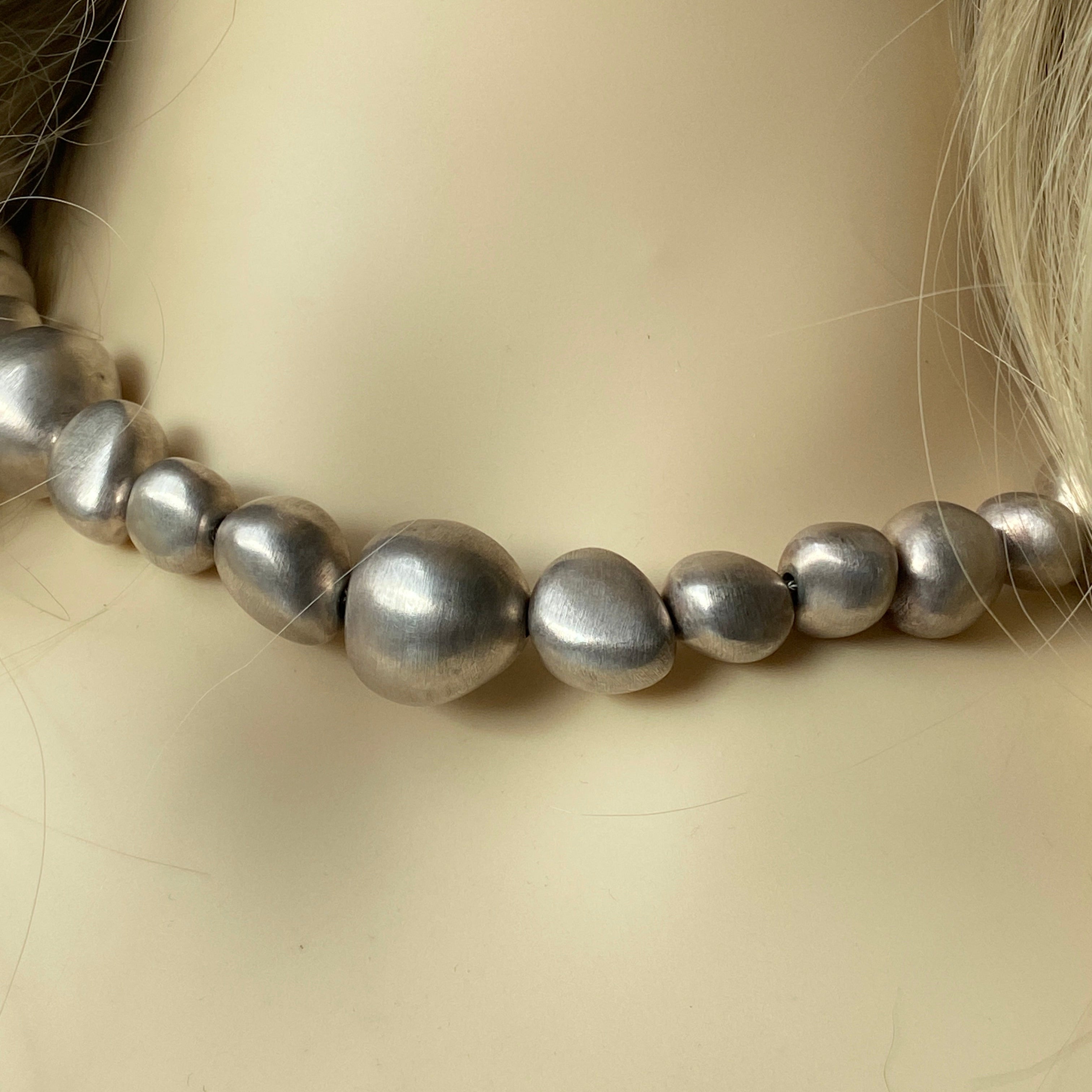 A German designer necklace with brushed finish sterling silver abstract beads on a sterling silver herringbone rope.
