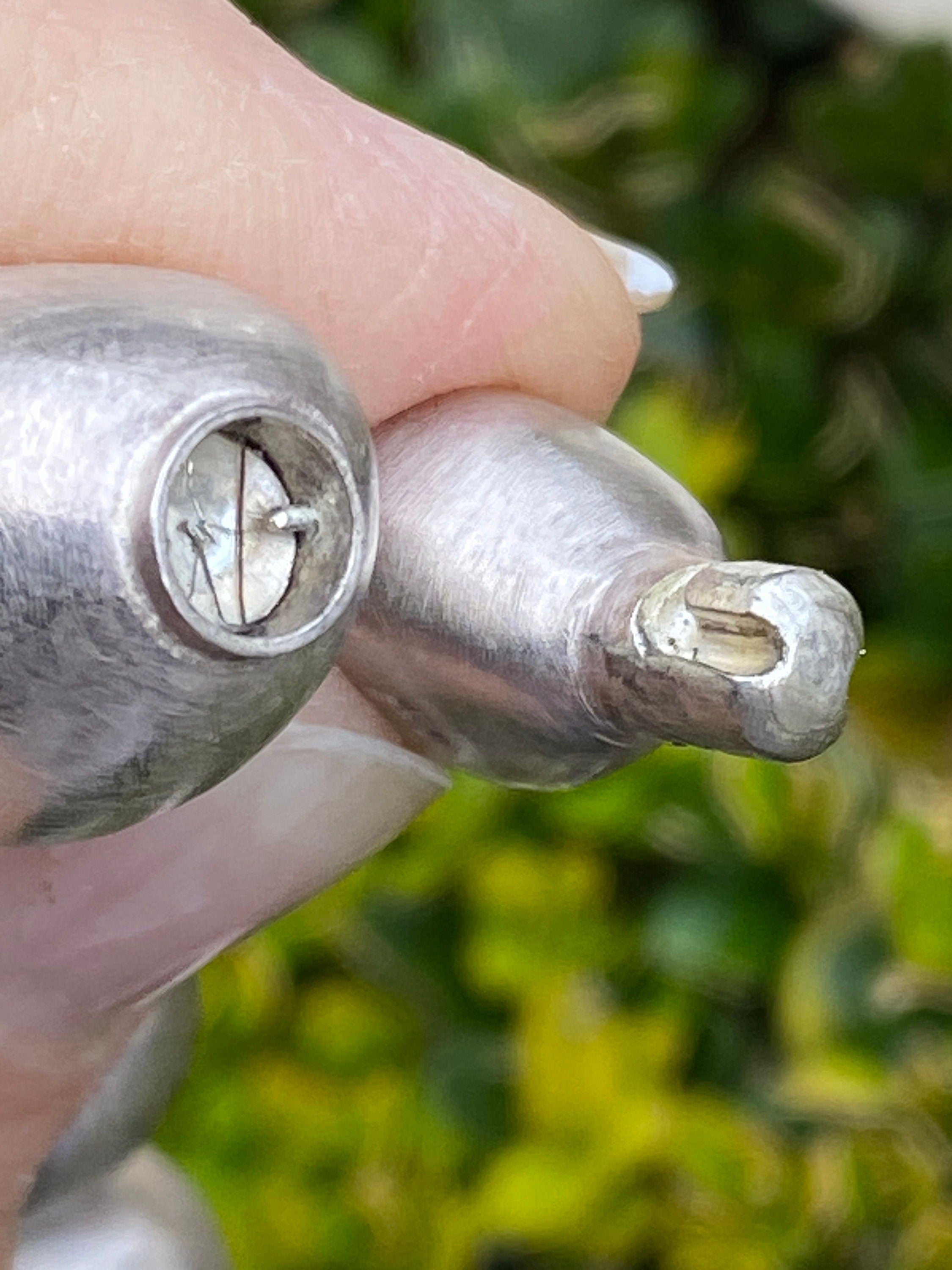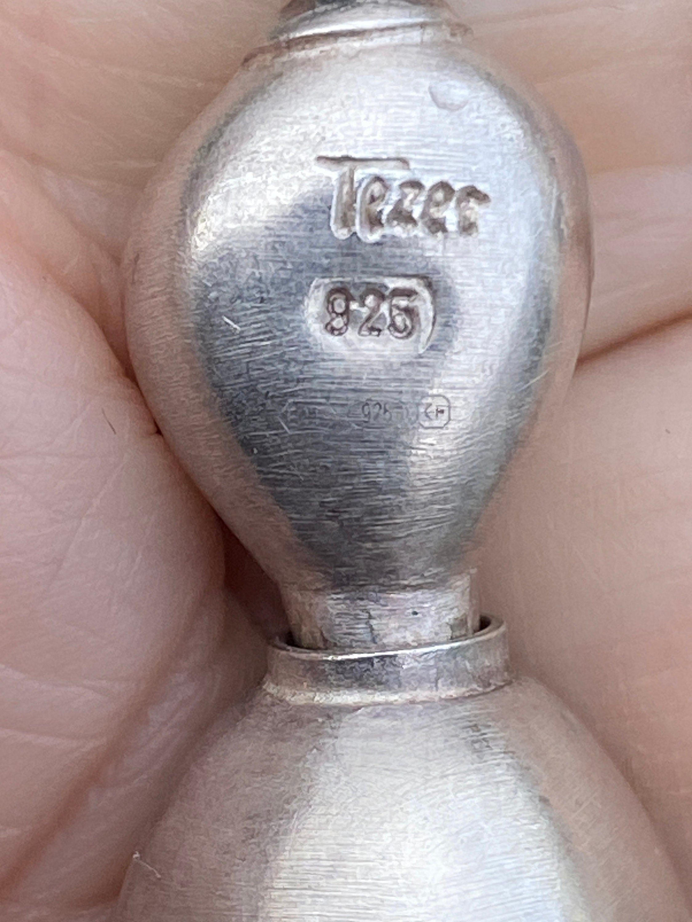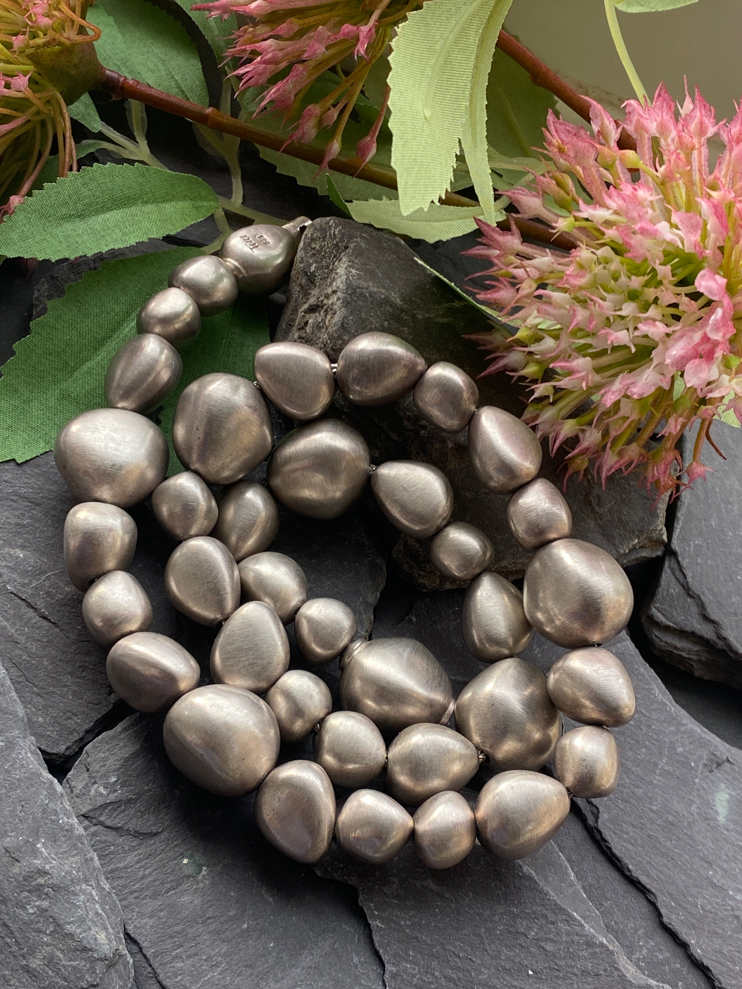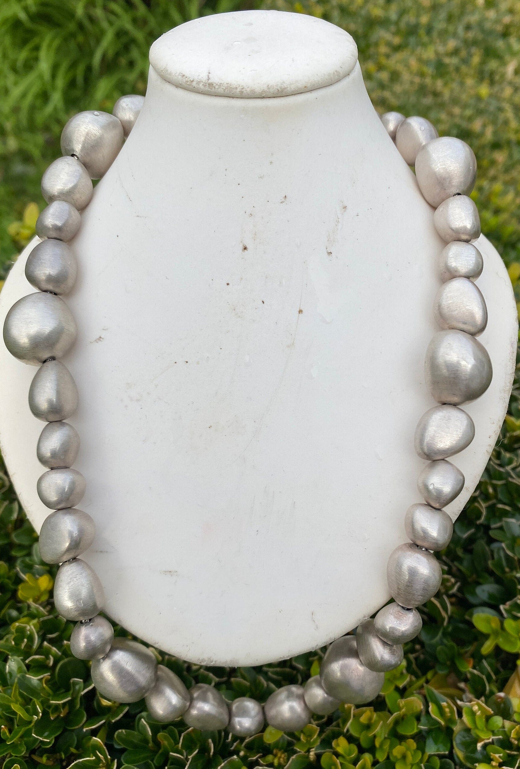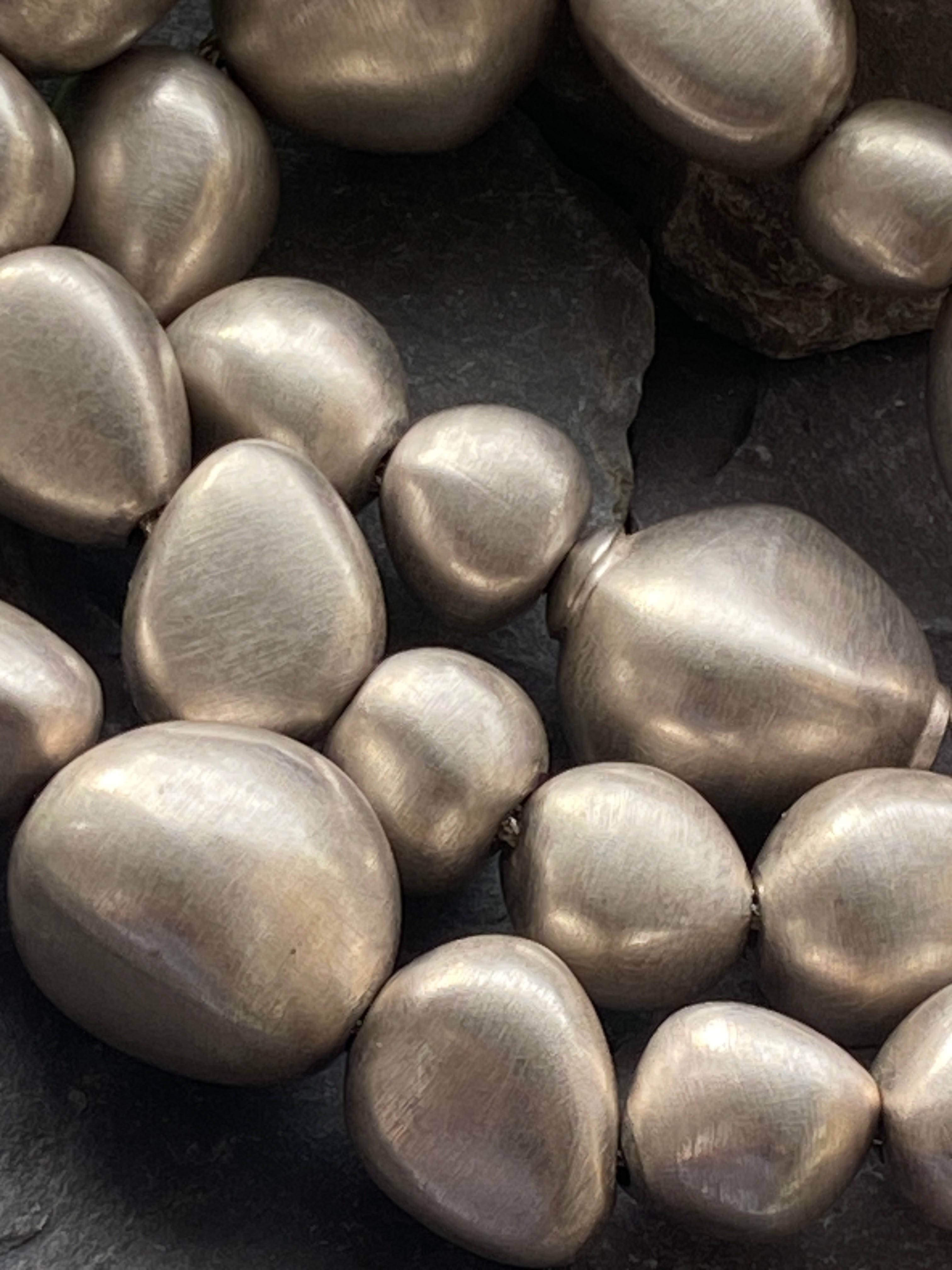 A German designer necklace with brushed finish sterling silver abstract beads on a sterling silver herringbone rope.