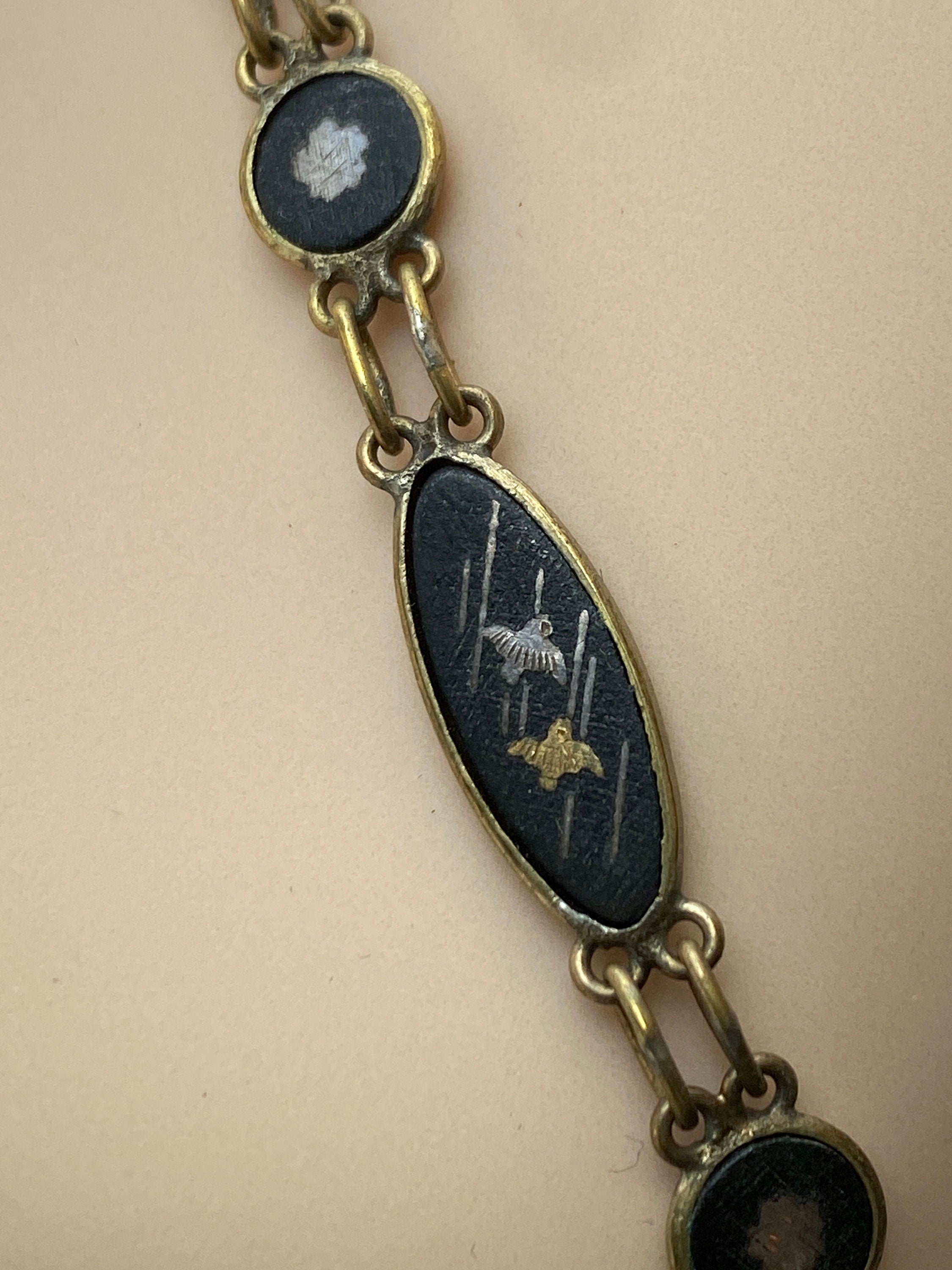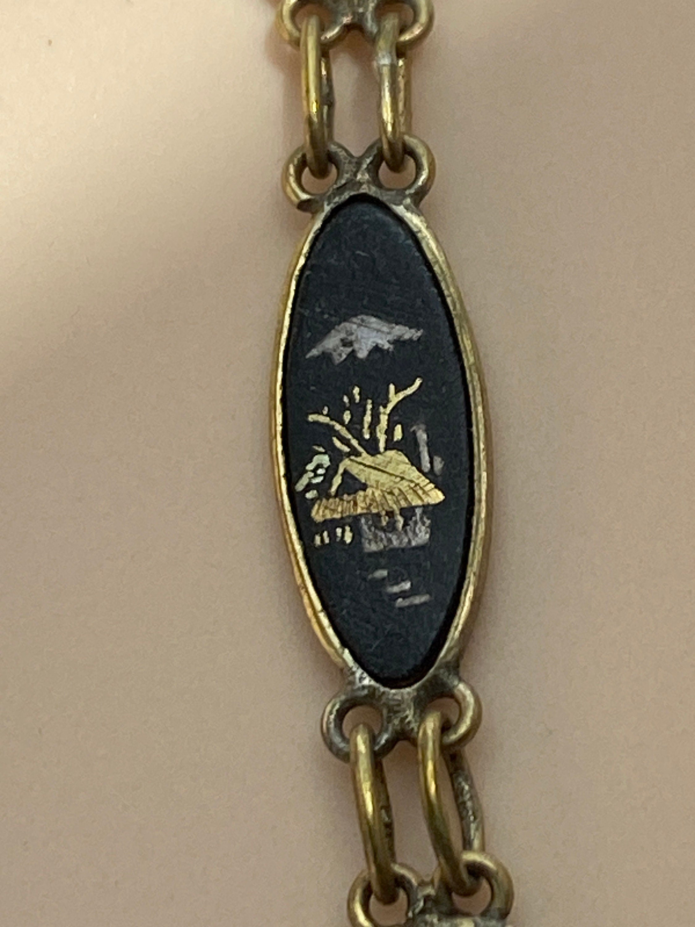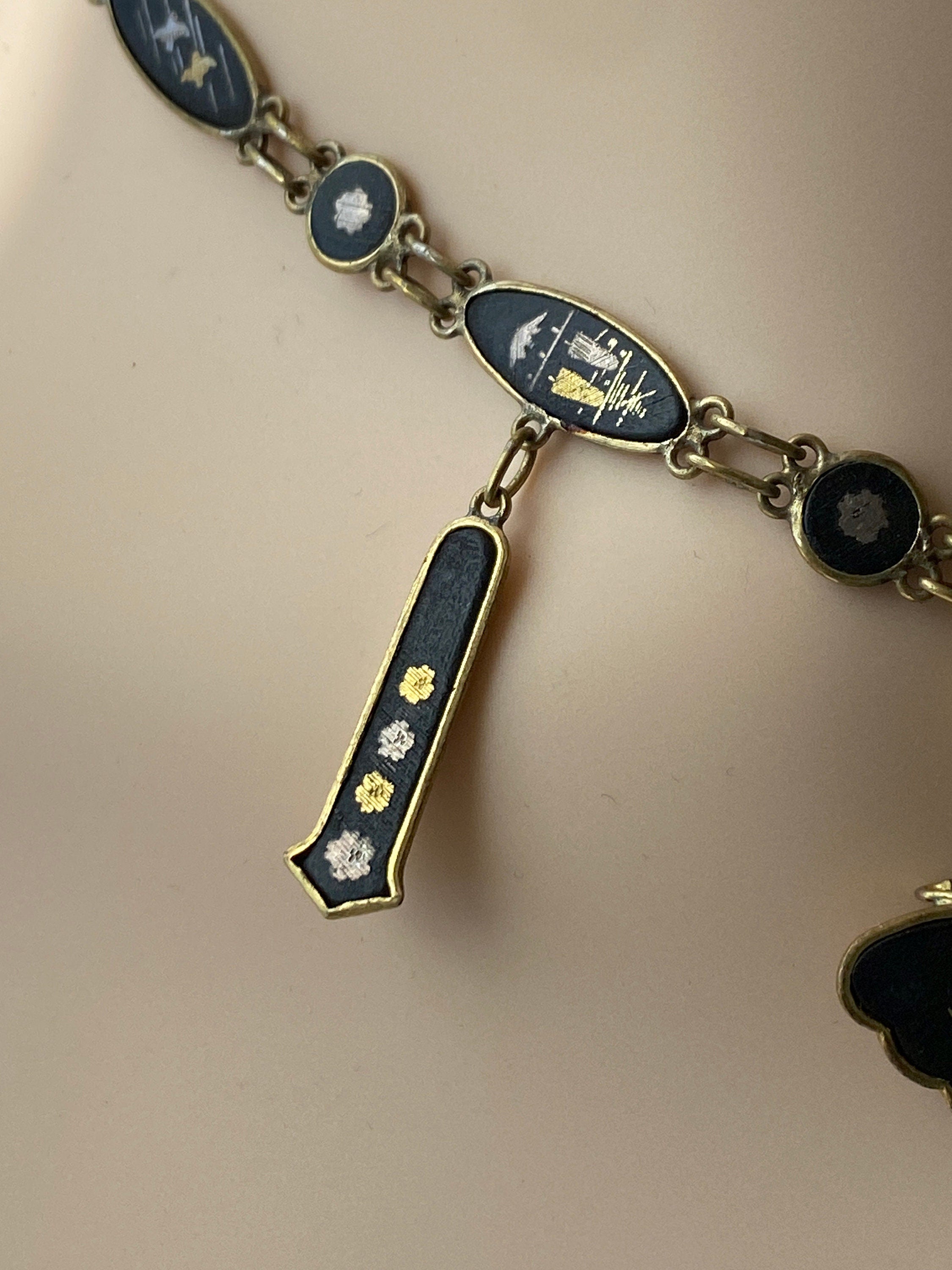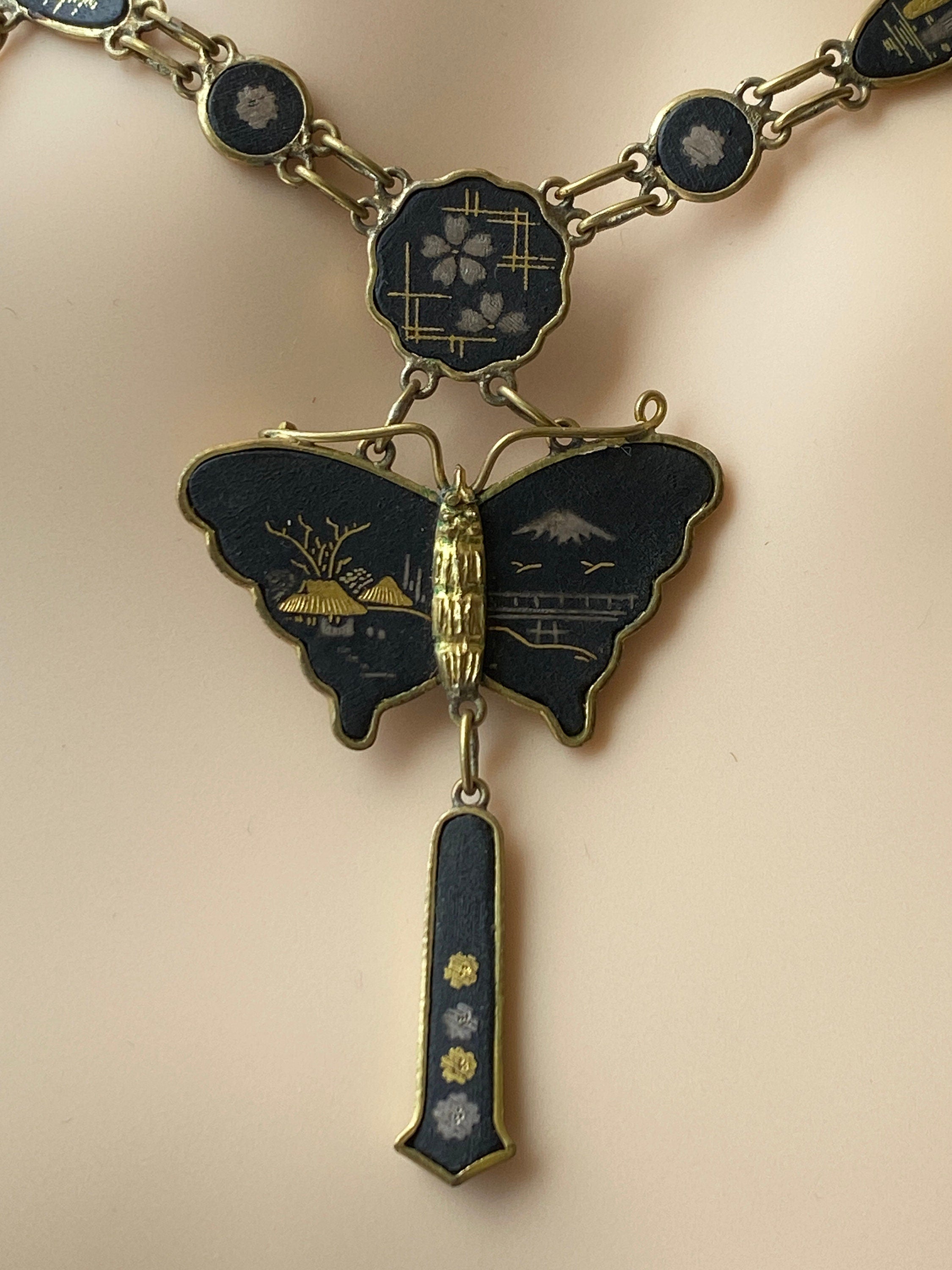 A stunning vintage Japanese Damascene necklace featuring a butterfly shaped pendant suspended from a chain of plaques featuring various inlaid scenes in silver and gold.