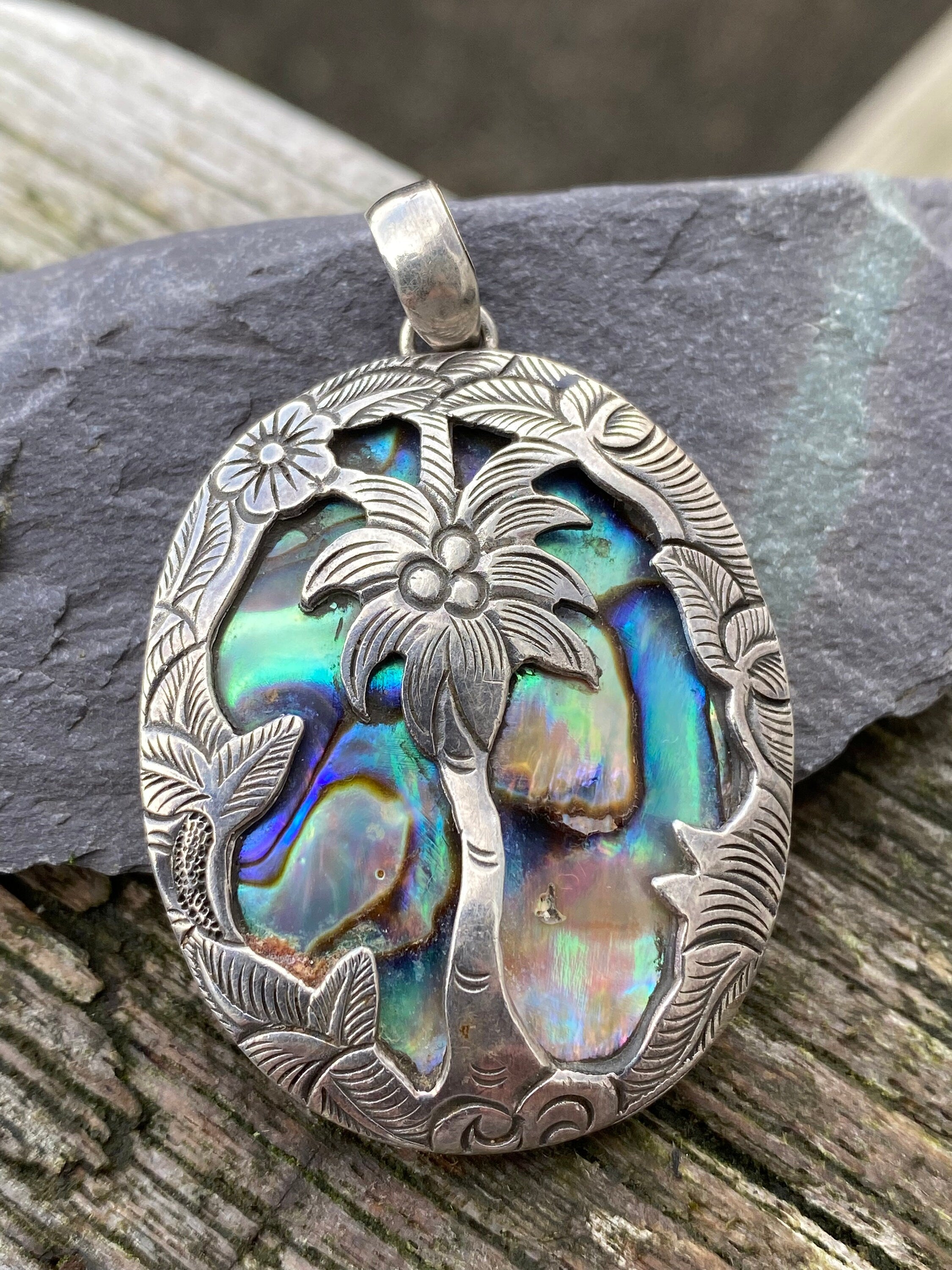 A vintage reversible sterling silver pendant set with a natural polished abalone shell/polished black agate Designed with a palm tree in a tropical theme to the front In...