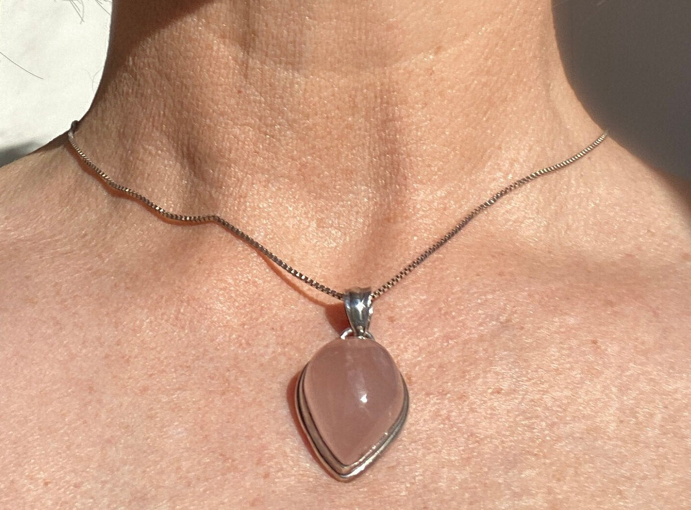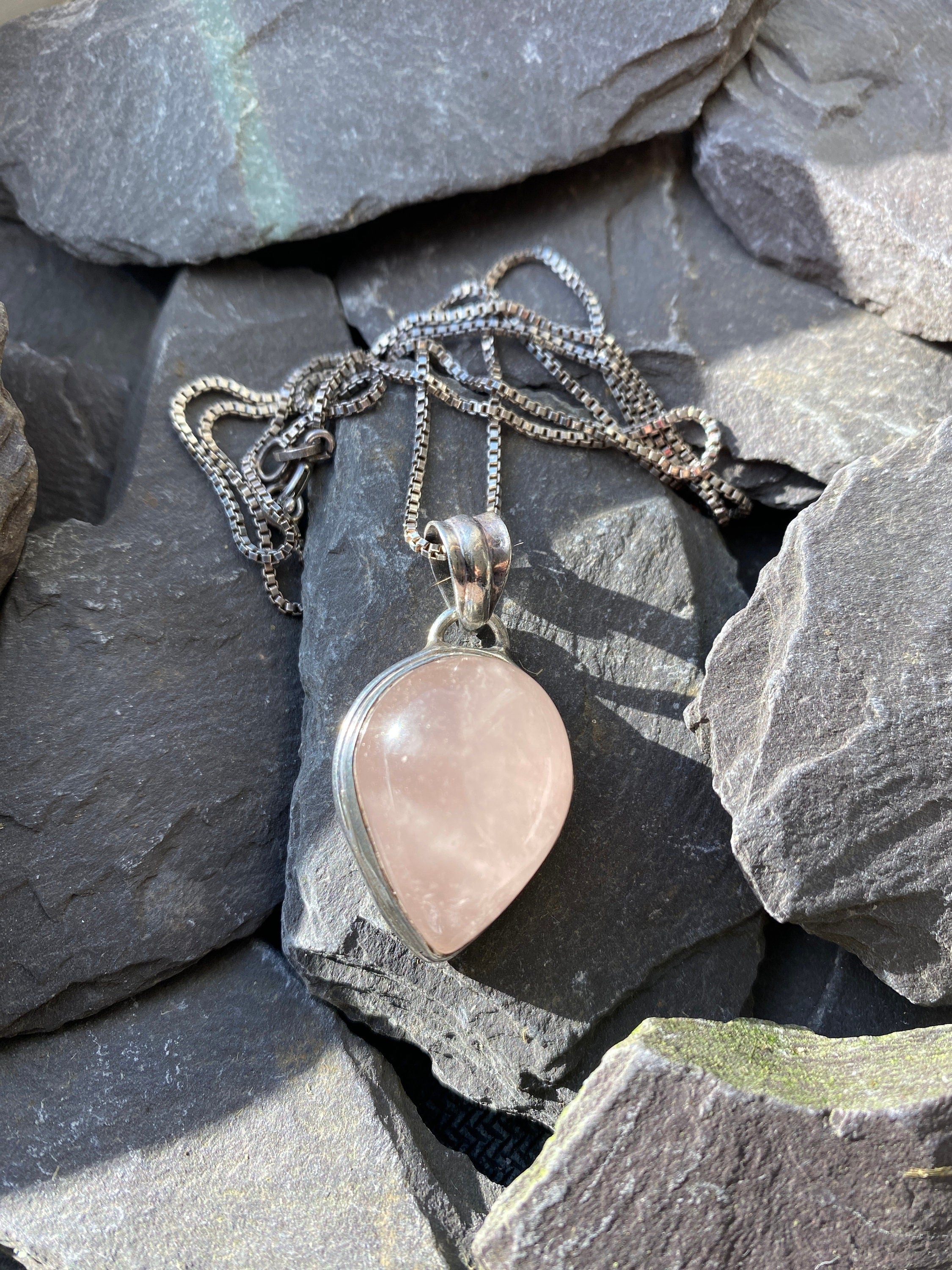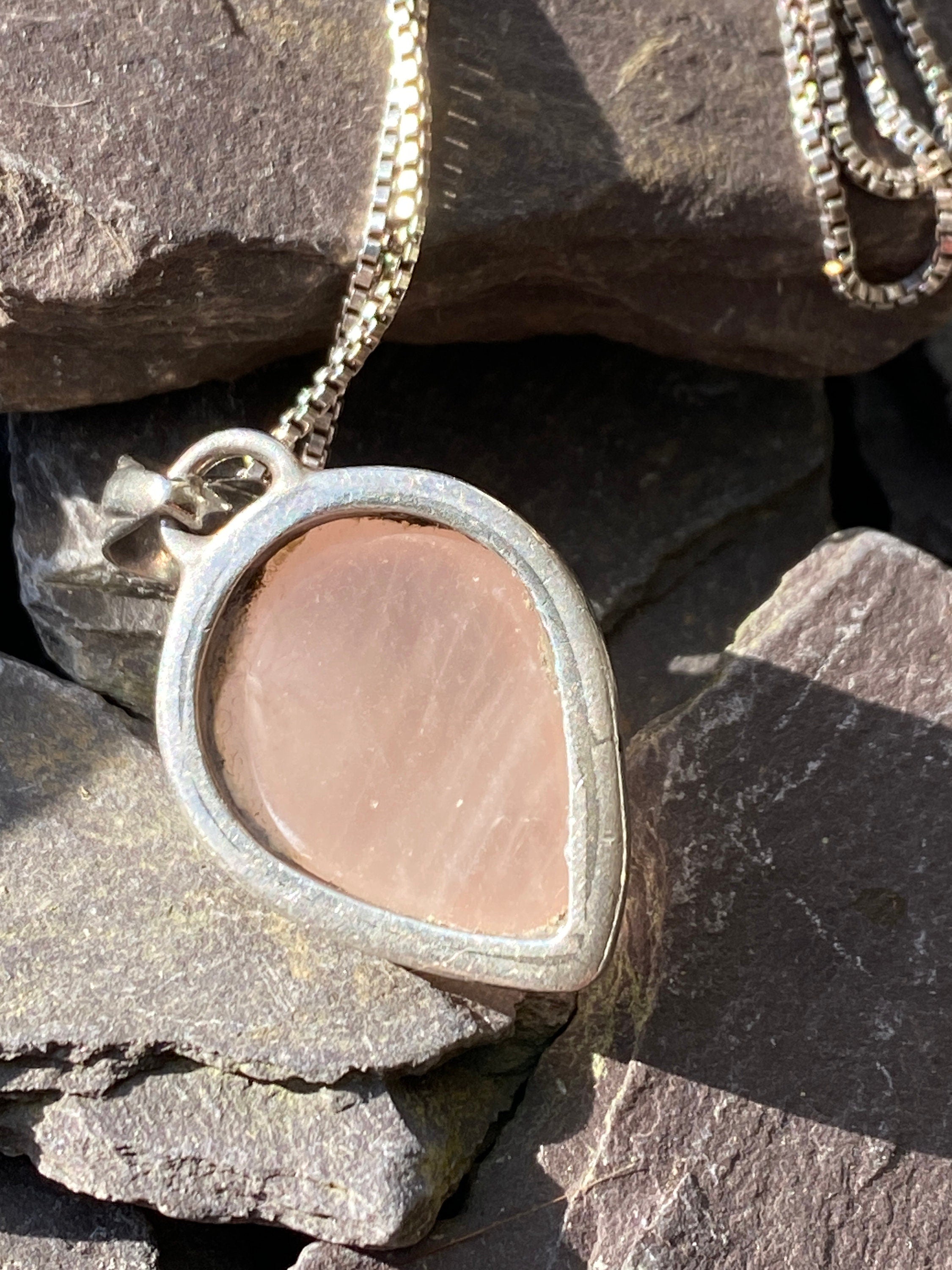 A lovely sterling silver pendant set with a natural polished Rose Quartz stone.
