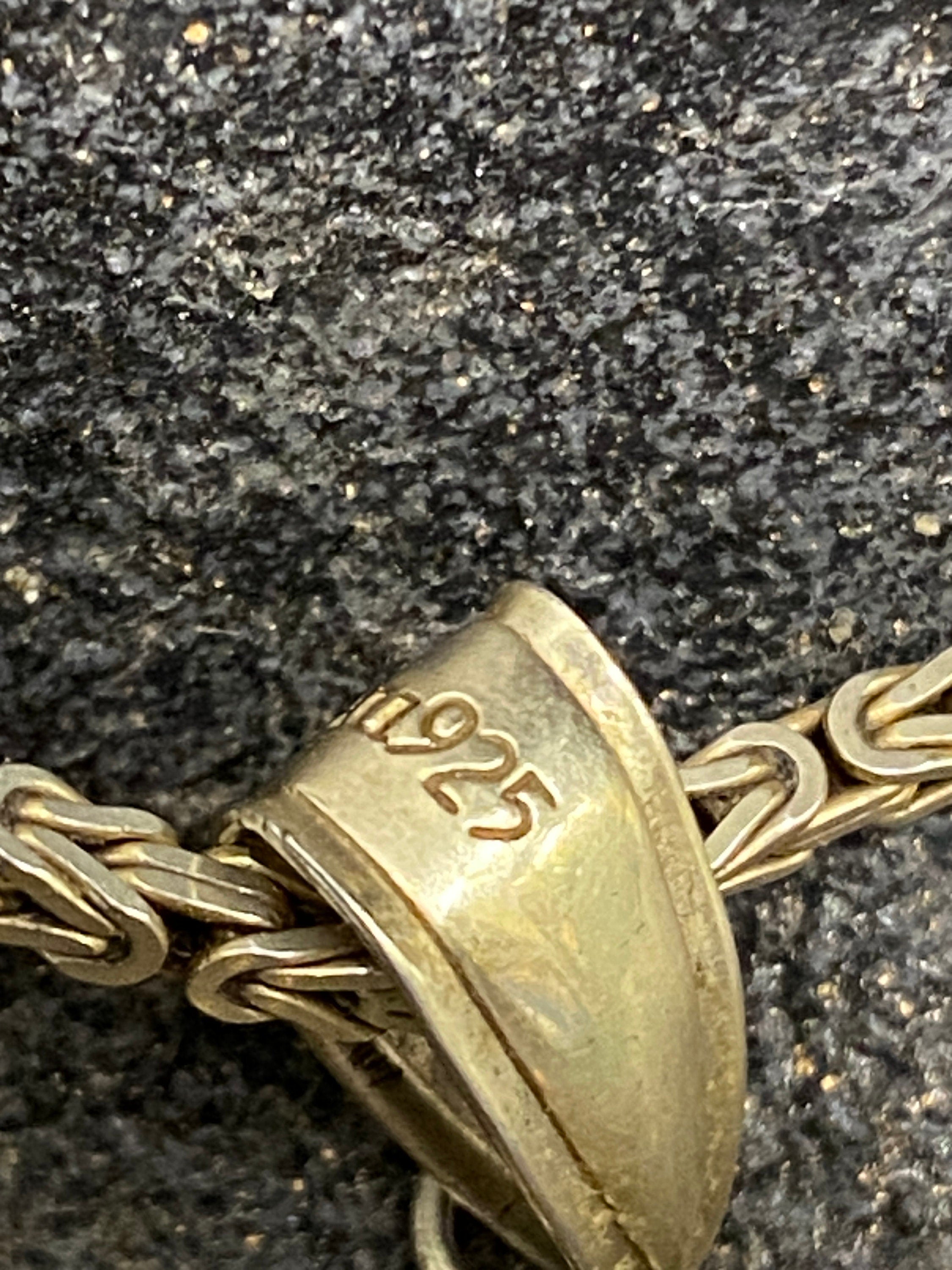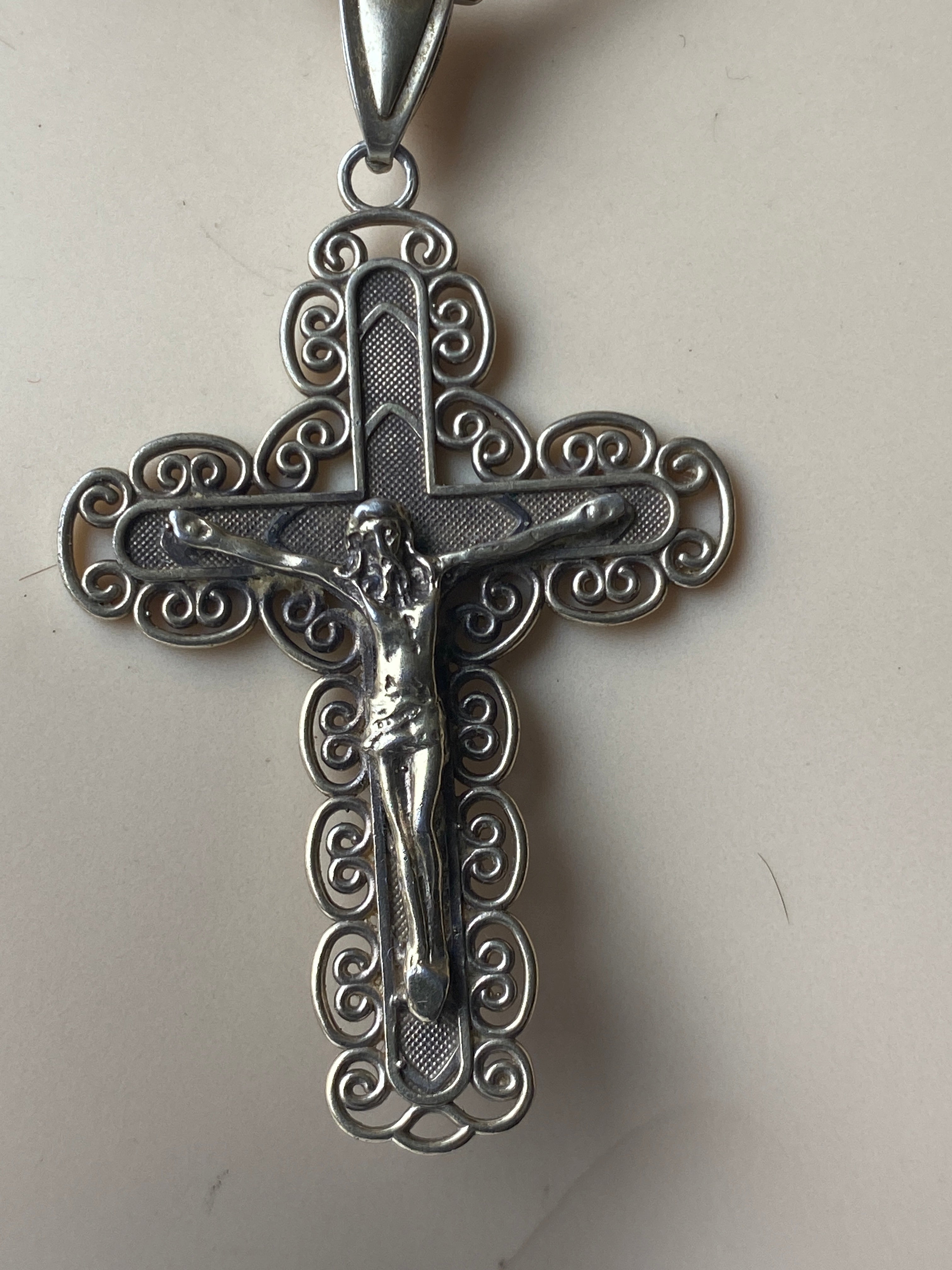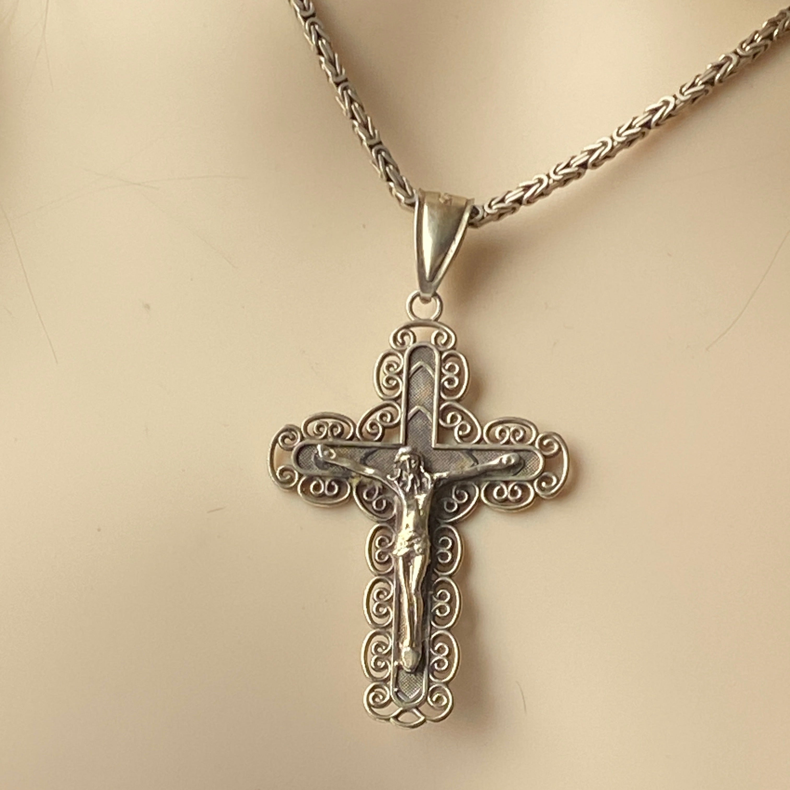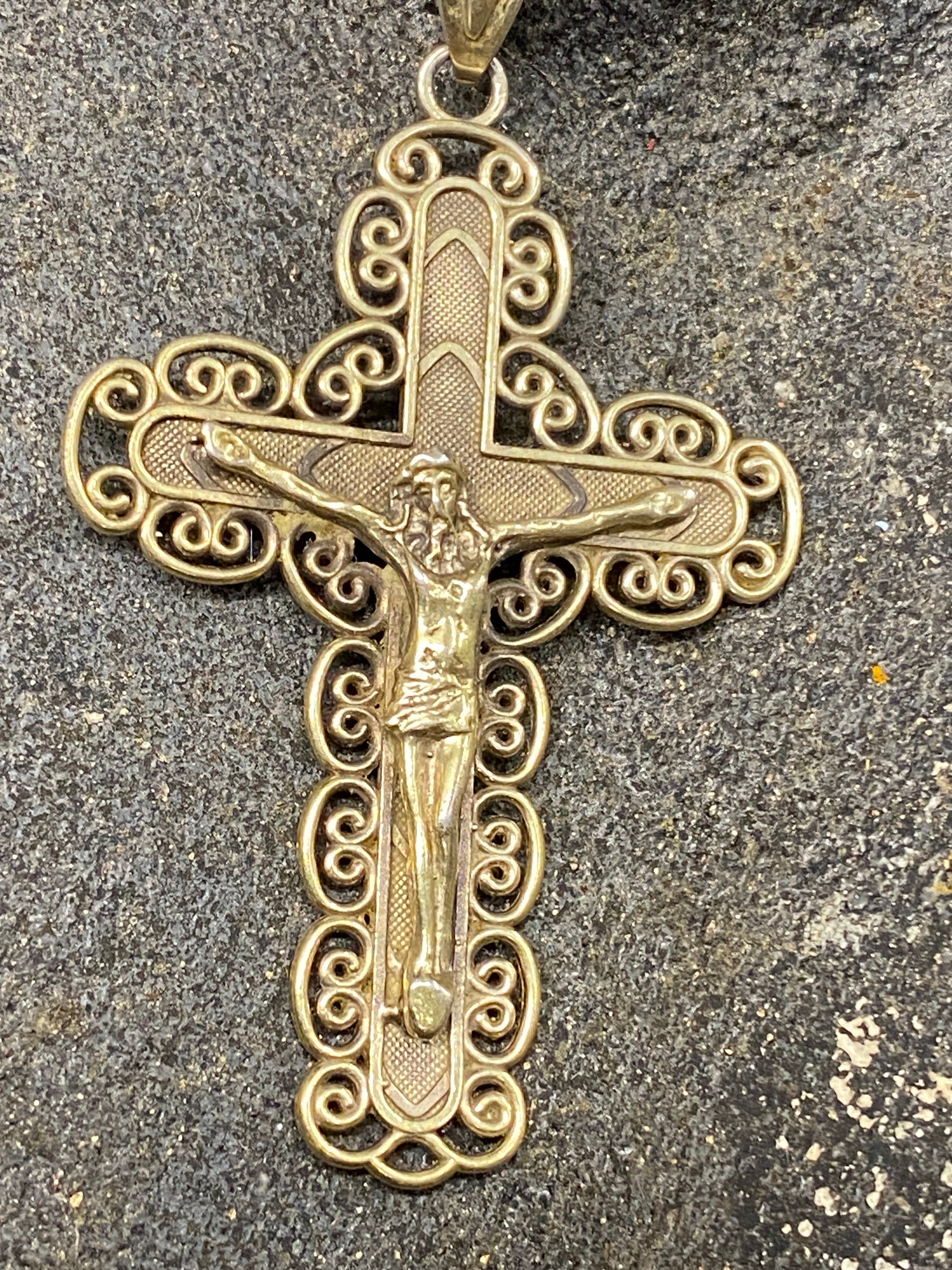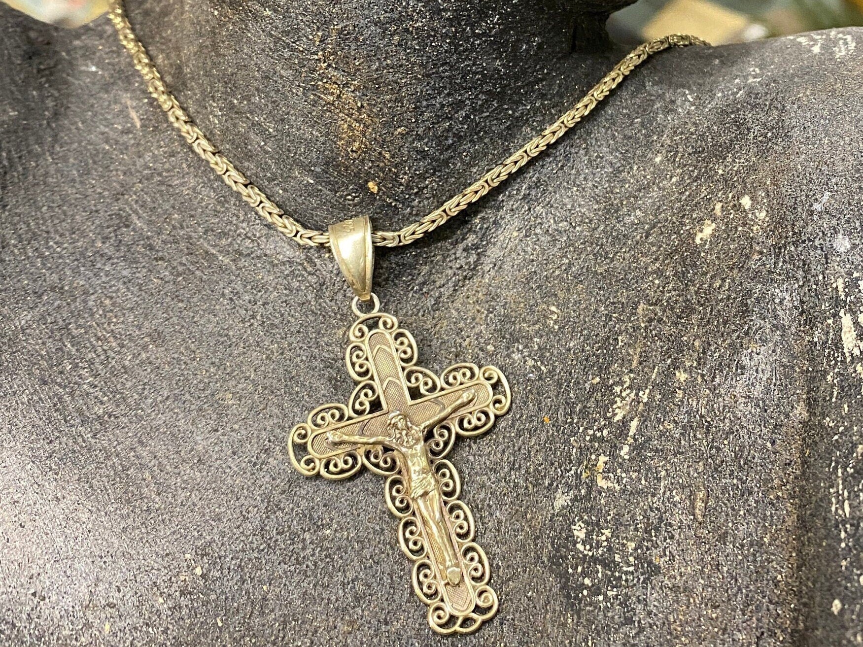 A stunning vintage sterling silver gilt ornate crucifix and Byzantine chain