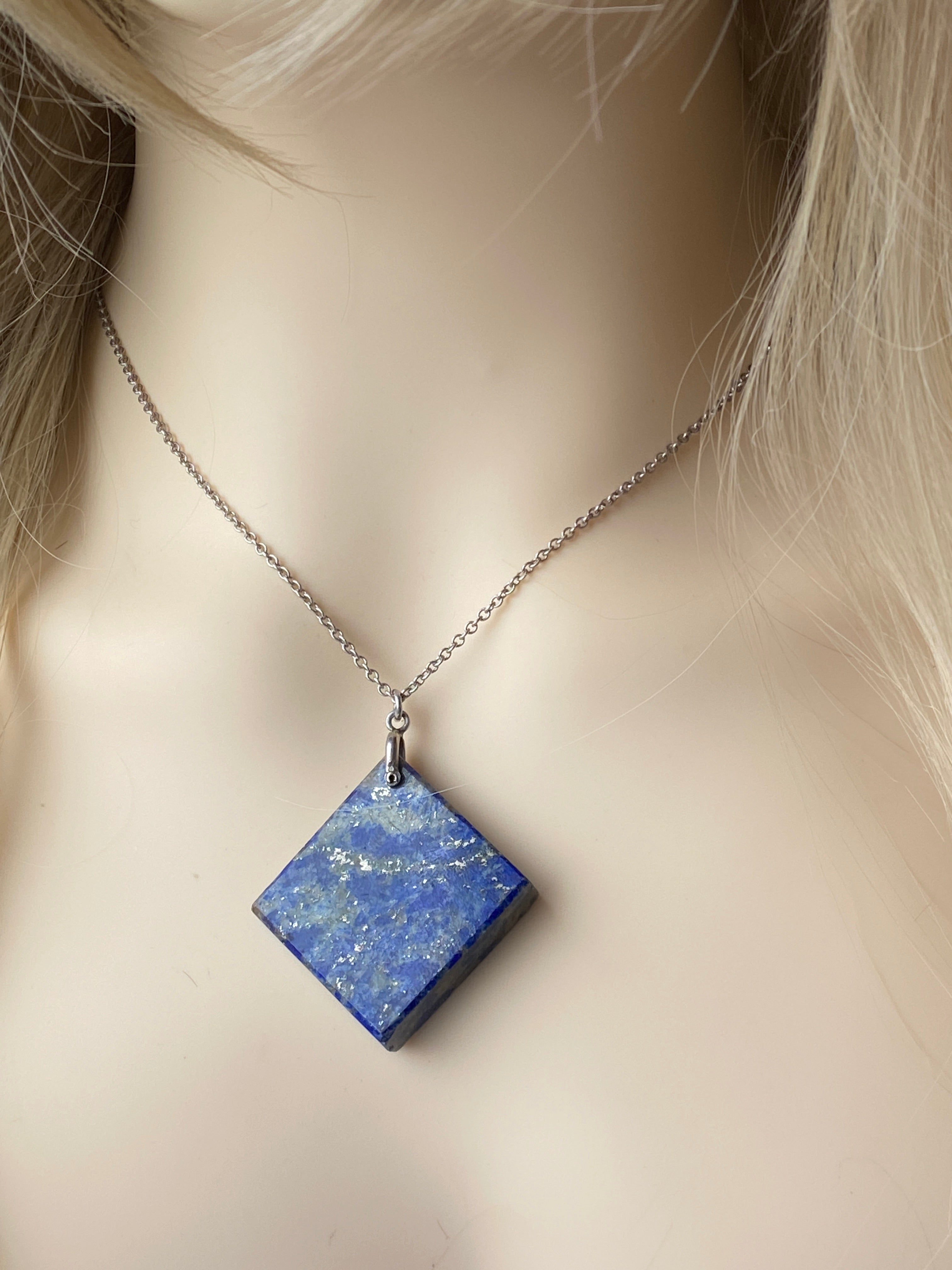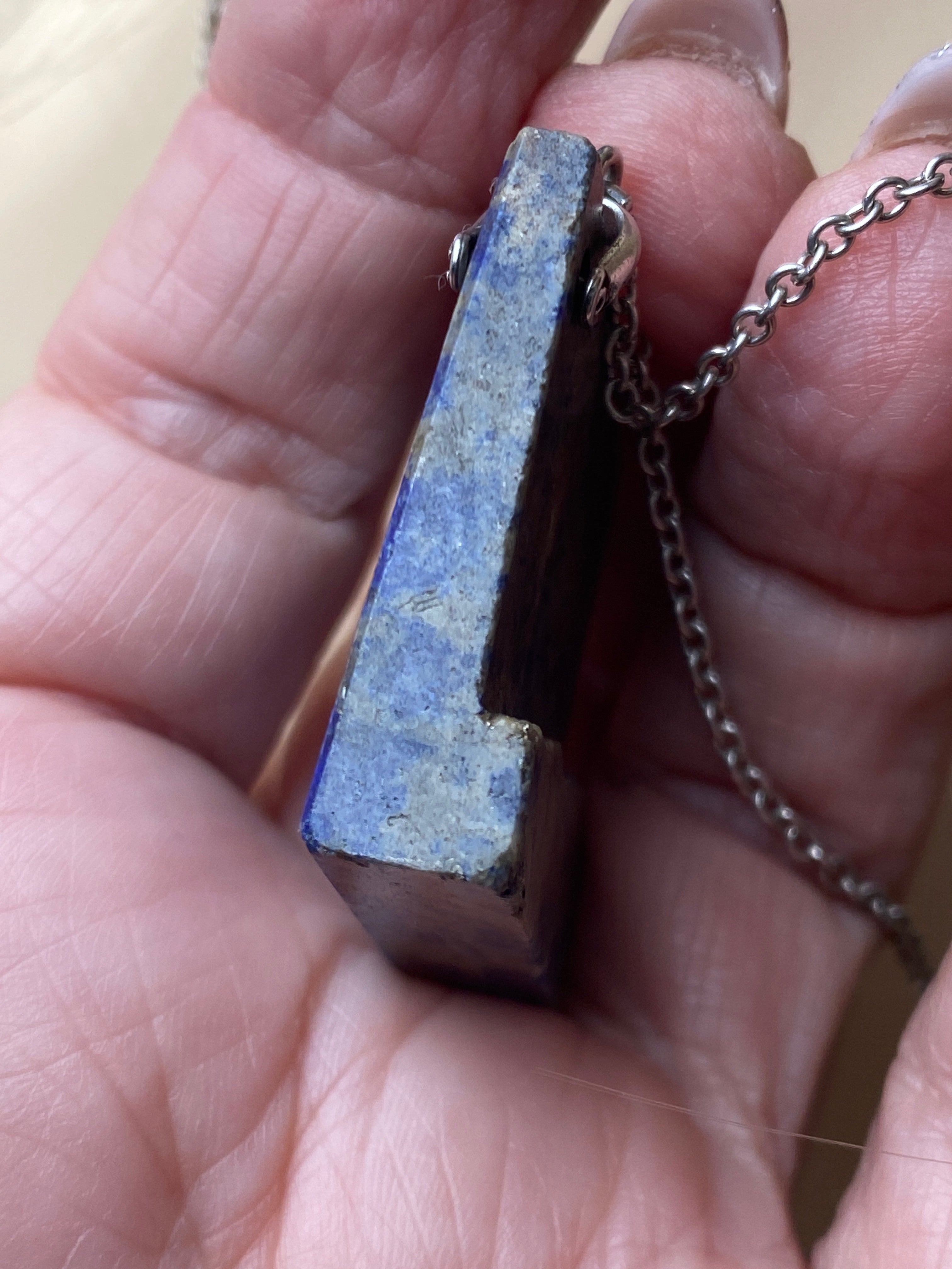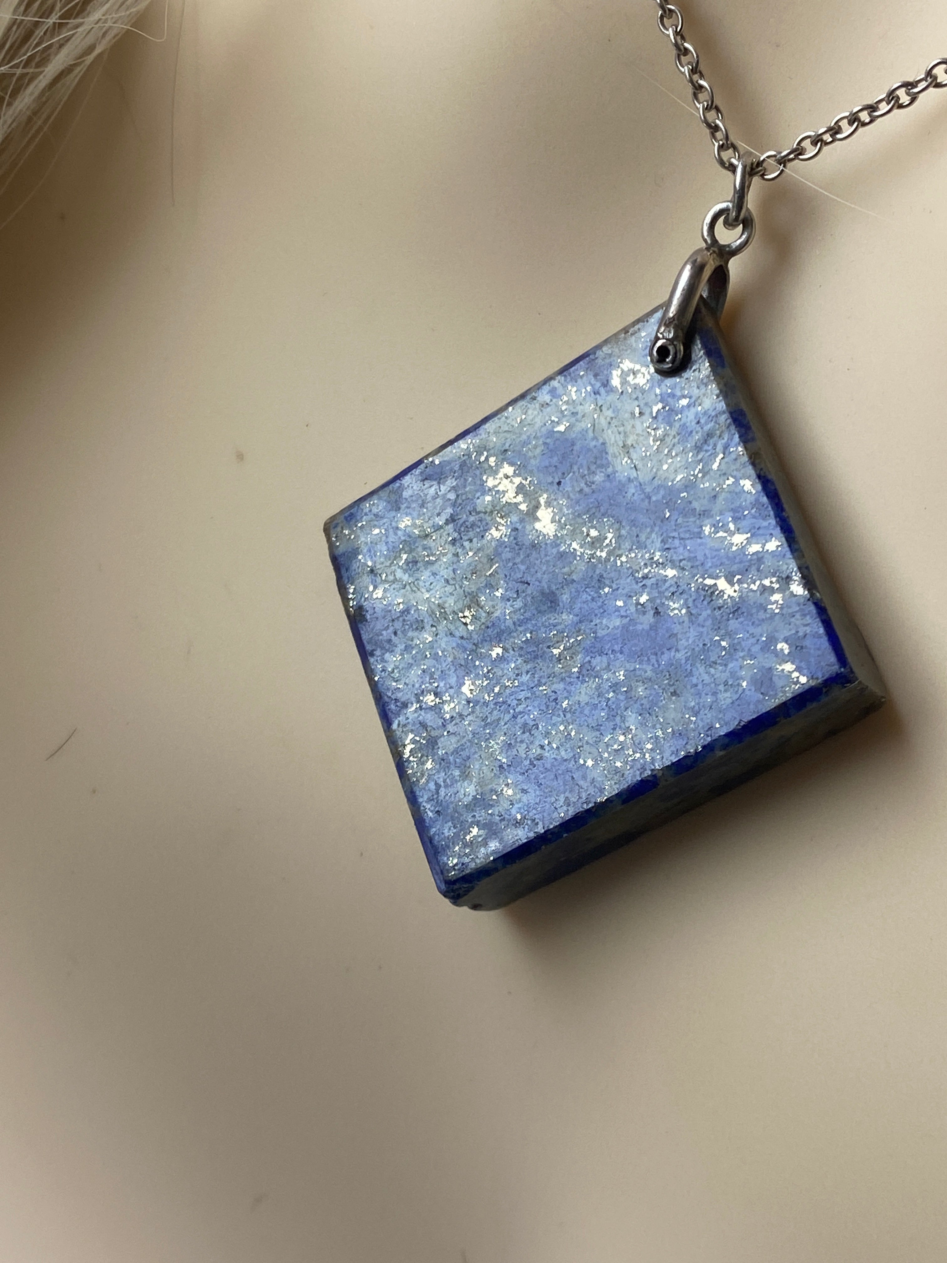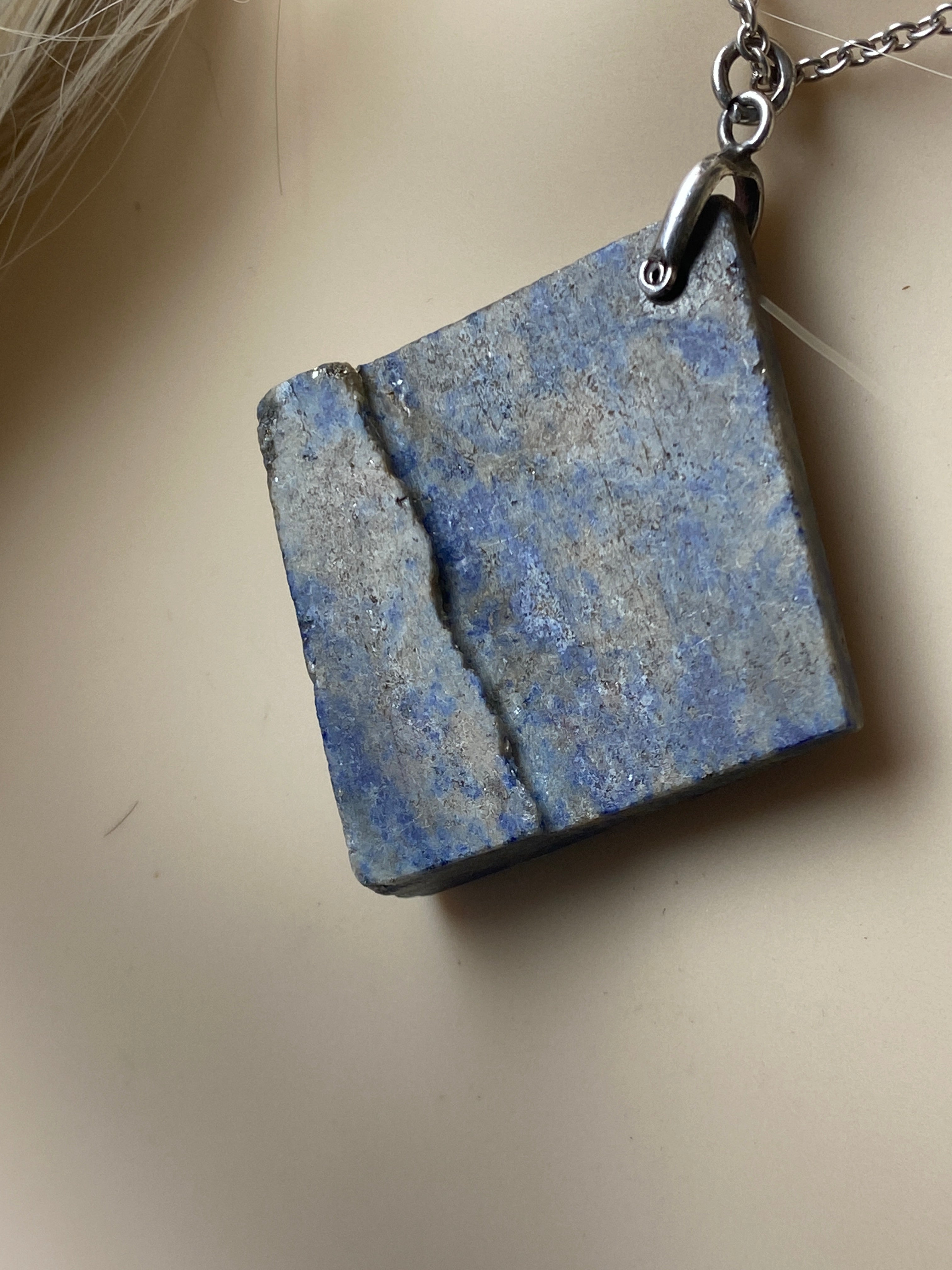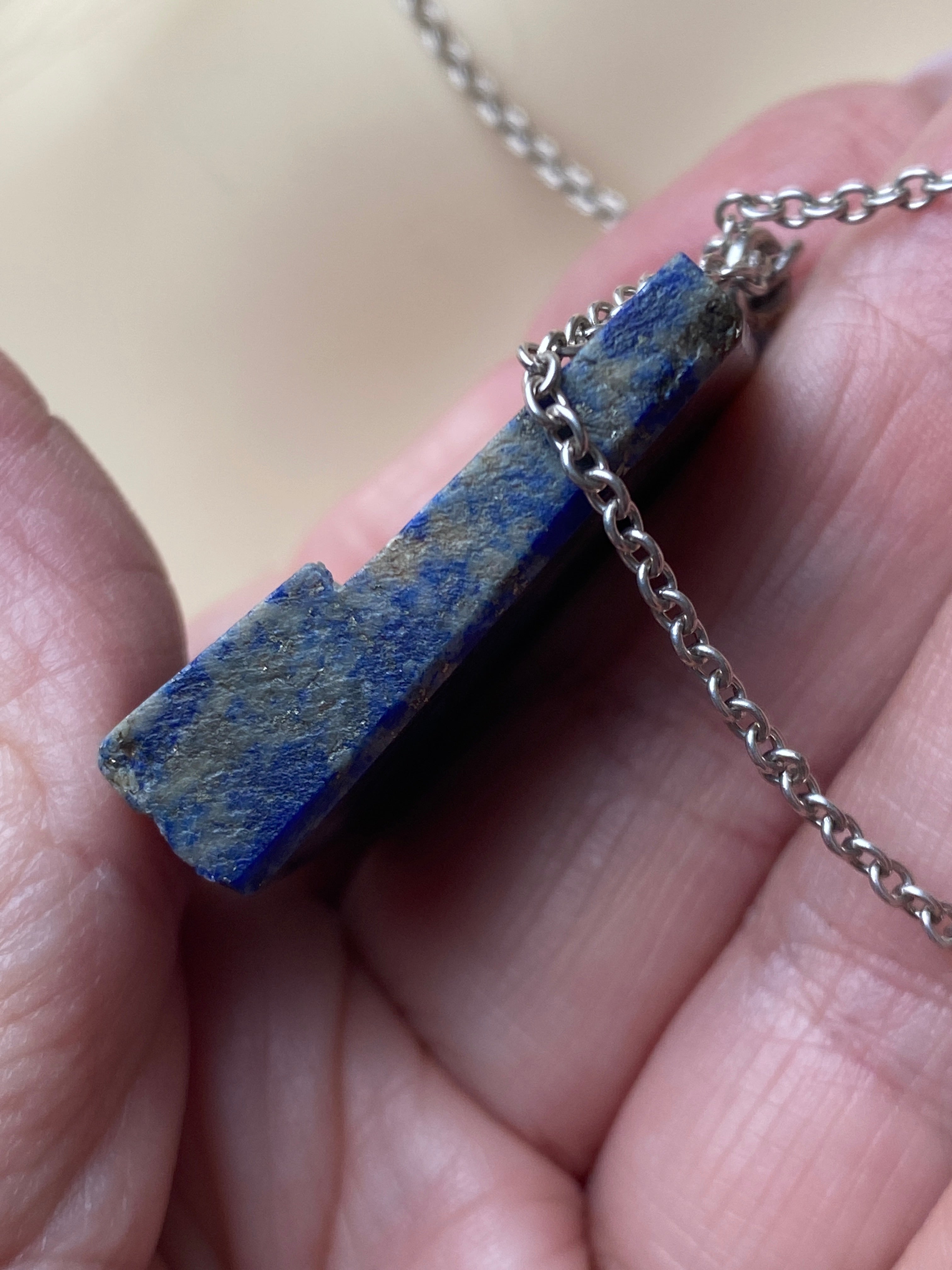 A natural chunk of semi polished Lapis Lazuli set on a hand crafted silver bale Suspended from a 20” sterling silver chain with bolt ring clasp Natural Pyrite...