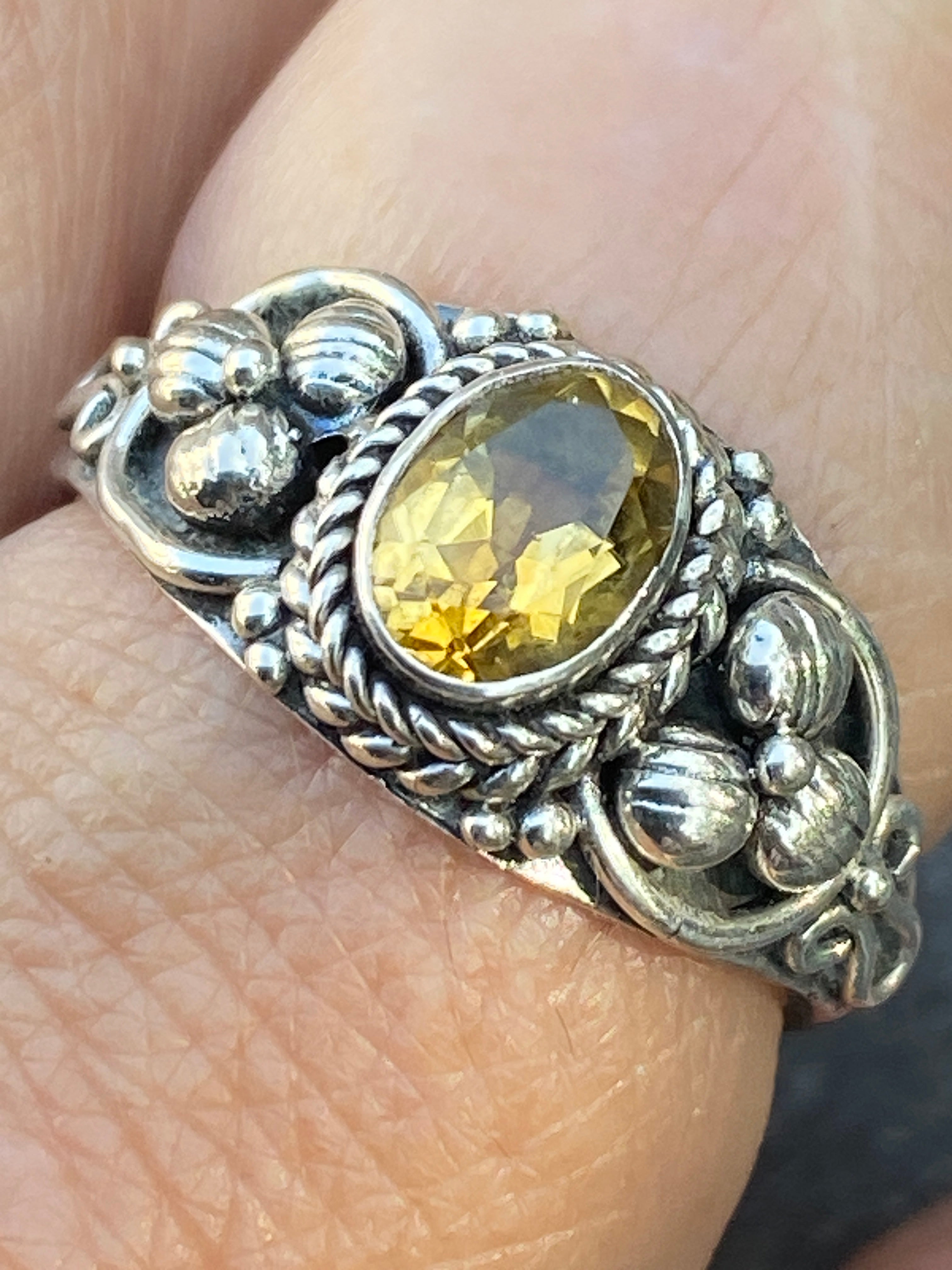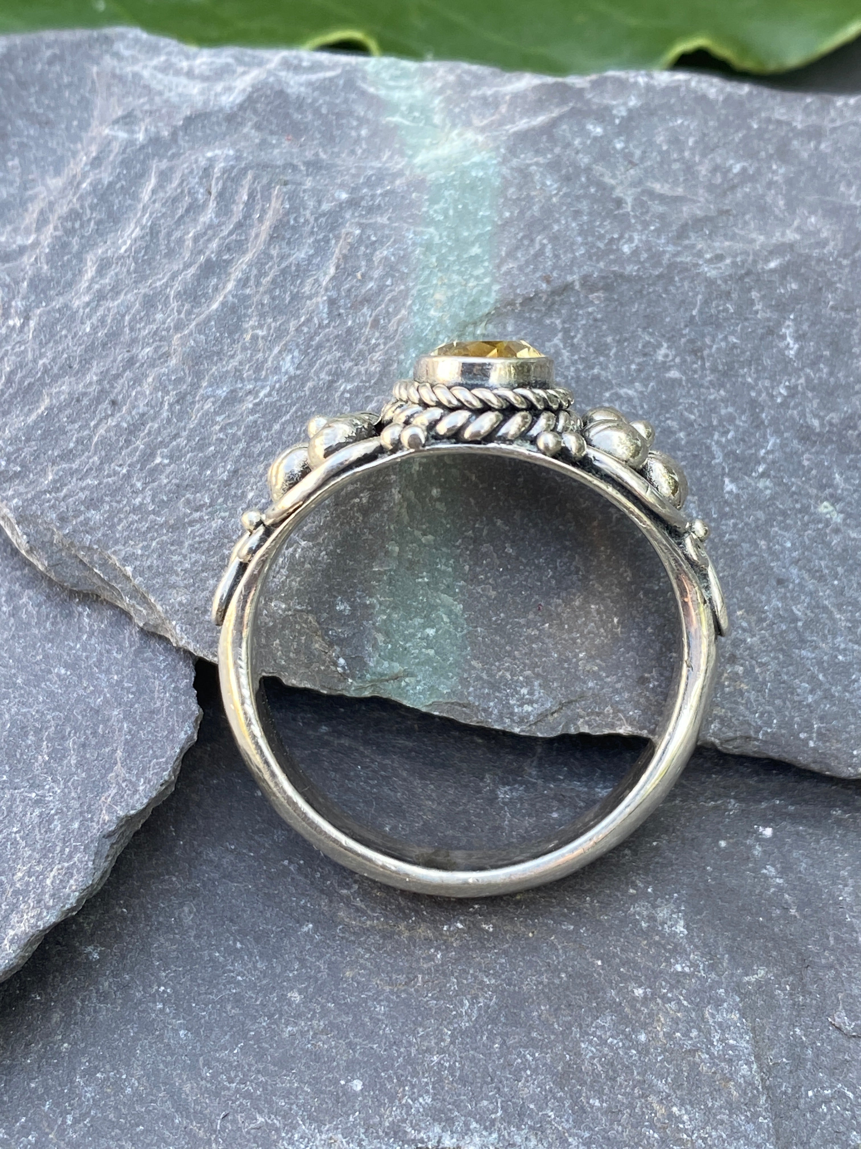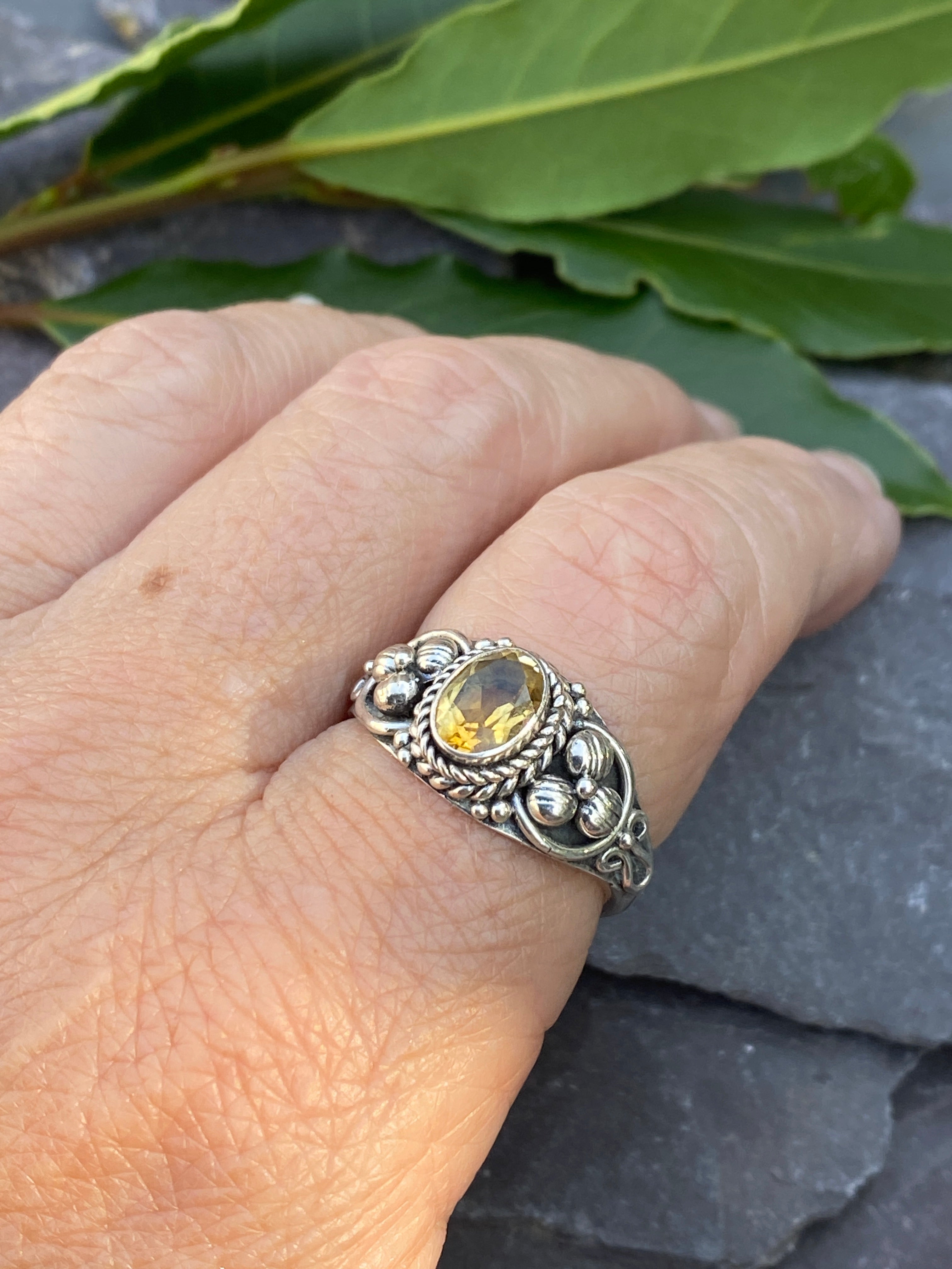 A beautiful sterling silver ring set with a yellow natural Citrine in the Arts & Crafts style