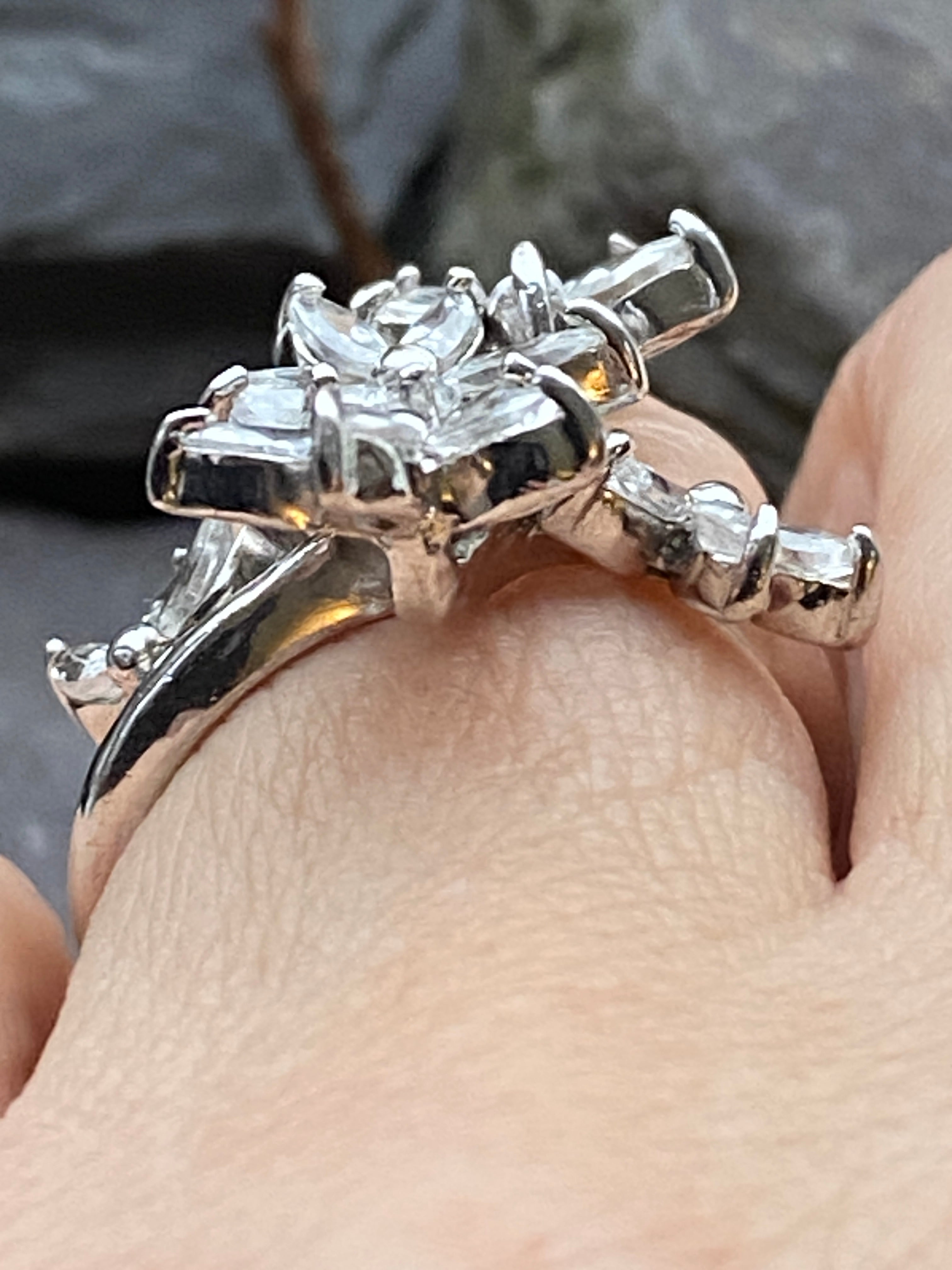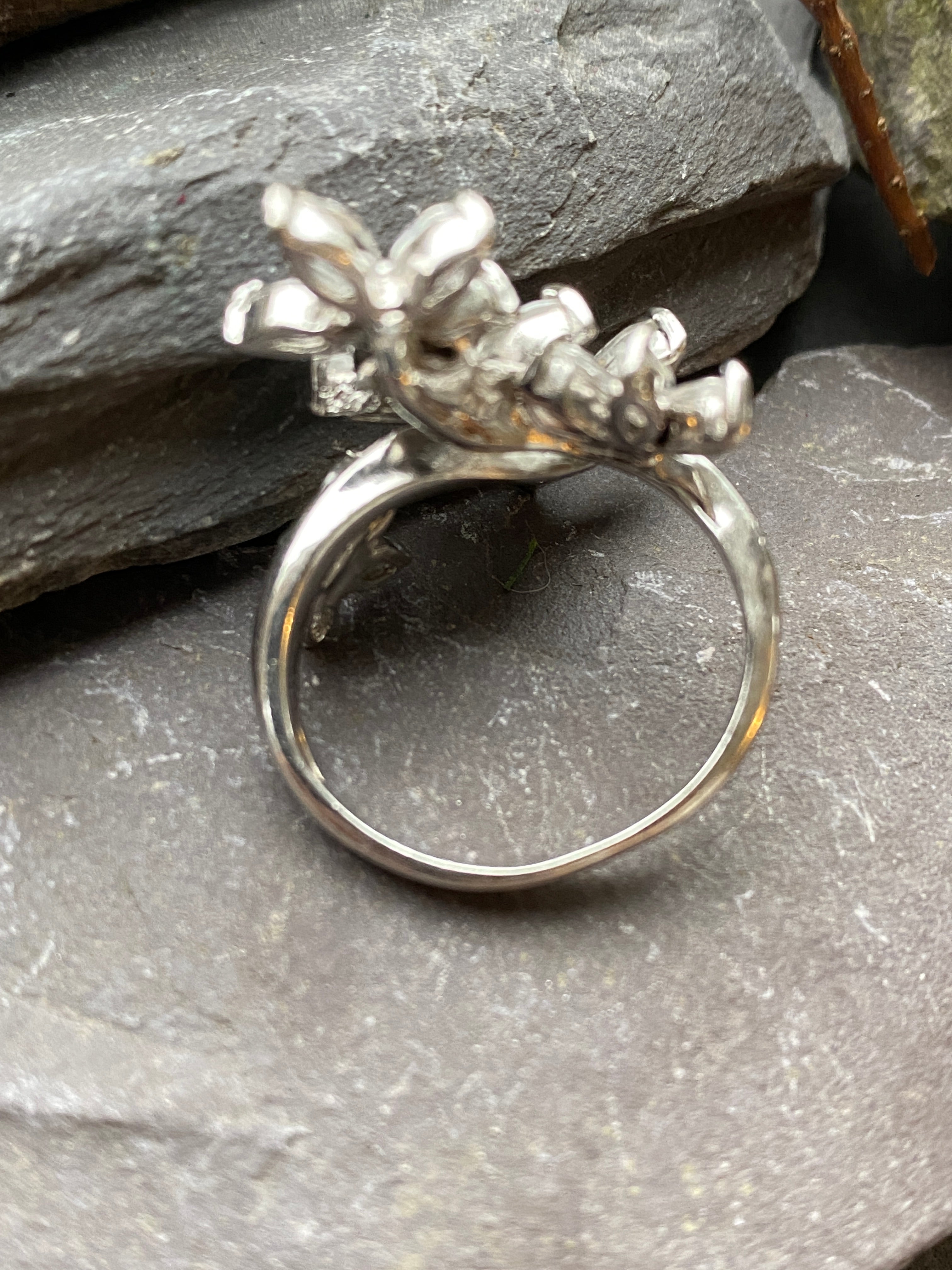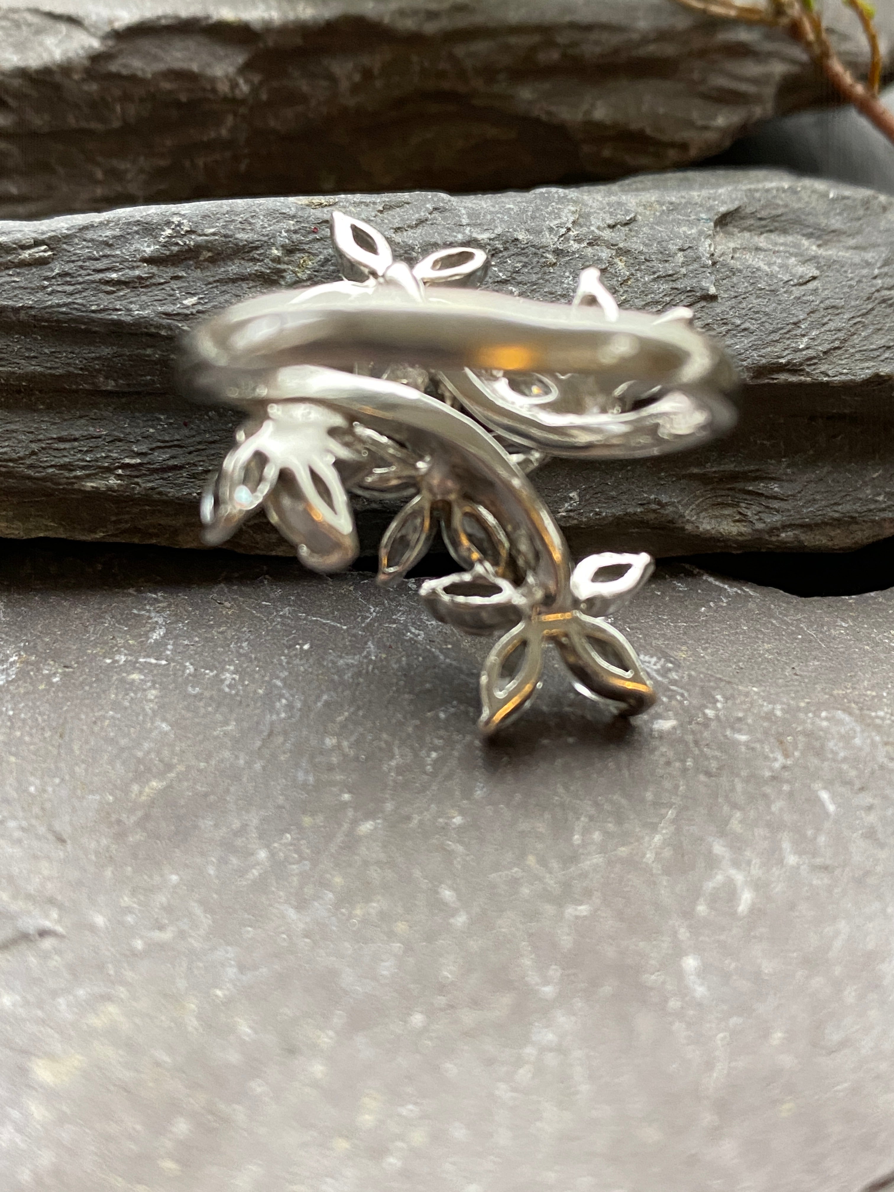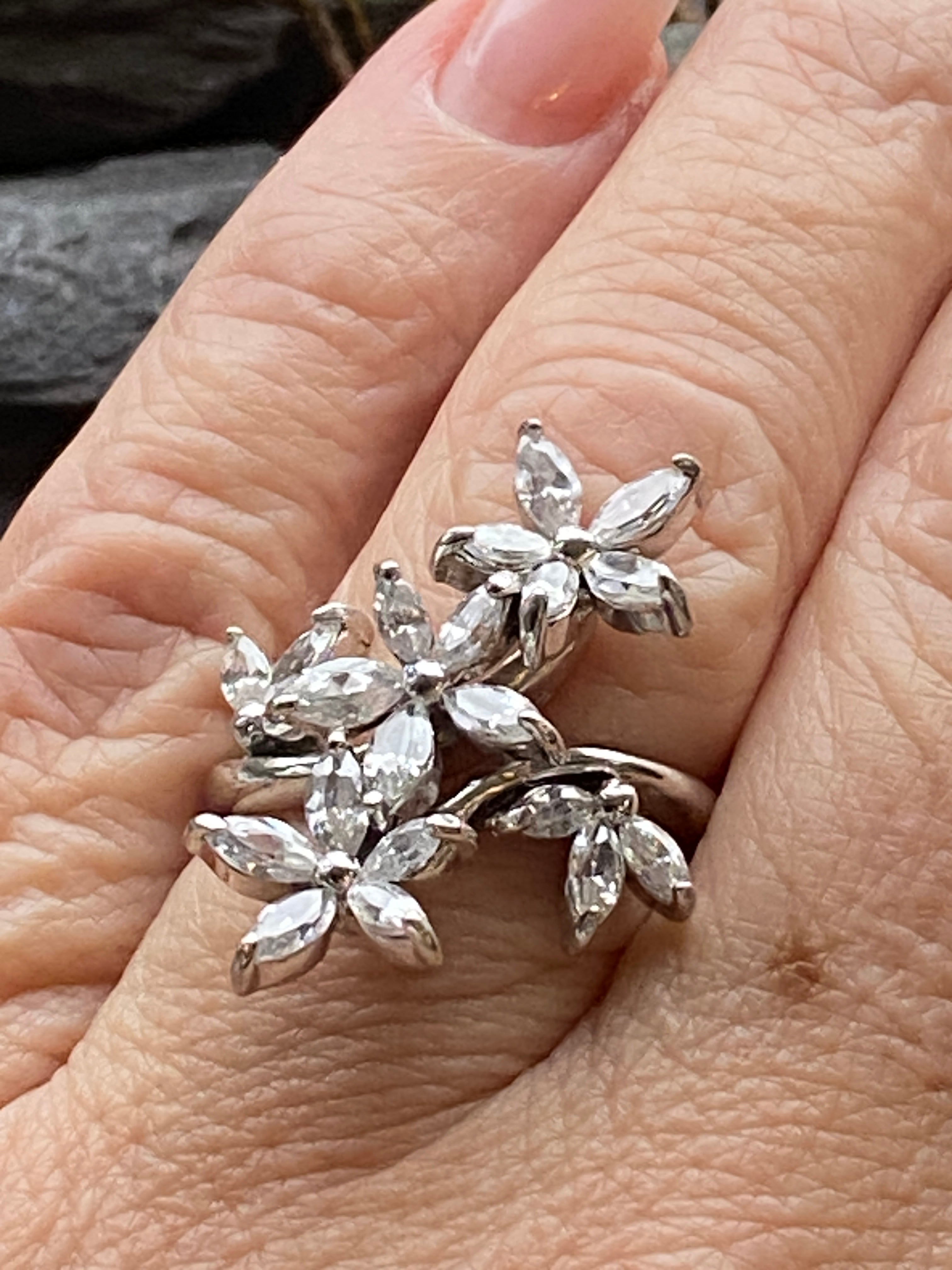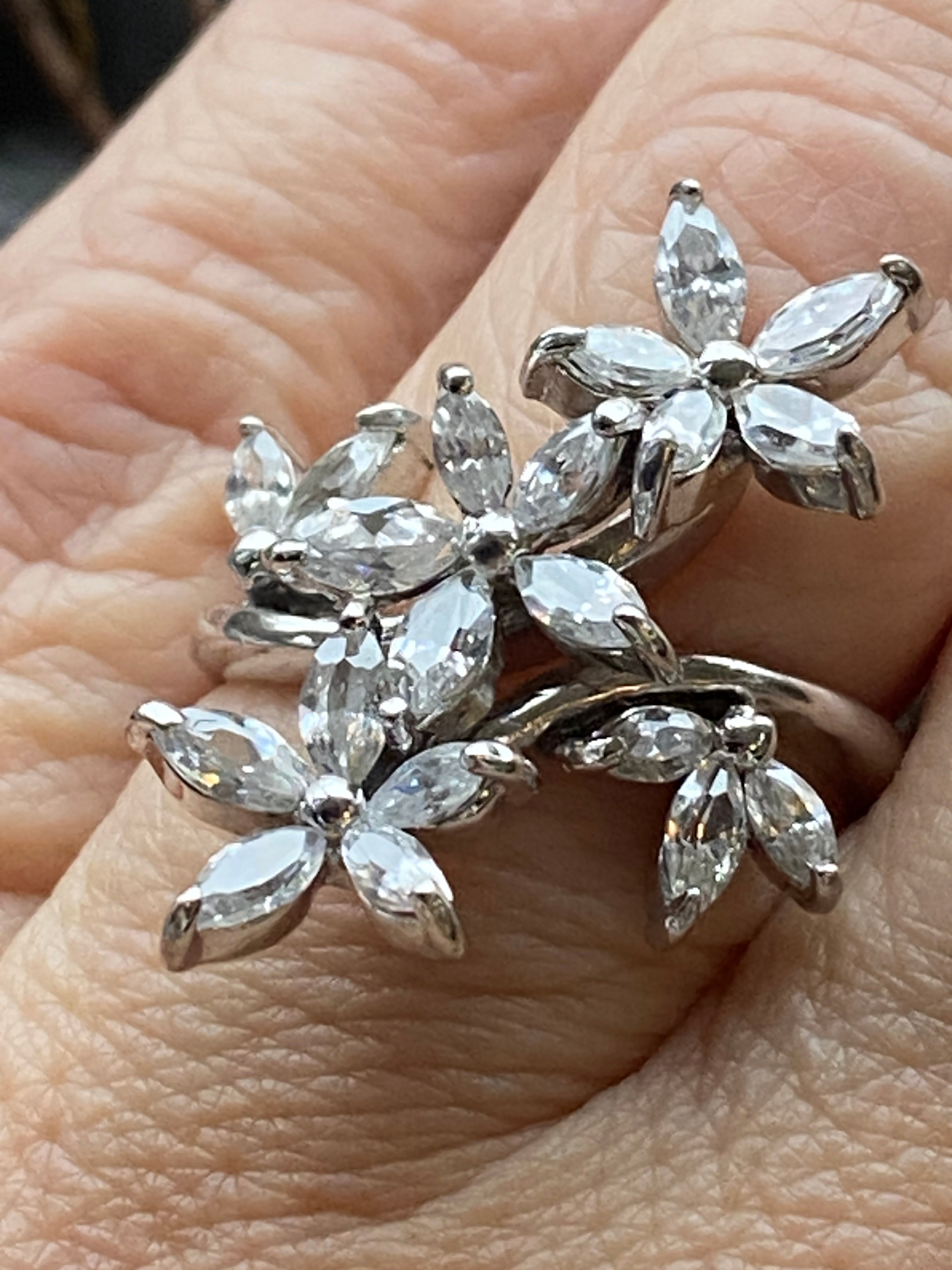 A stunning ring in sterling silver set with a spray of flowers going up the finger and set with Cubic Zirconia