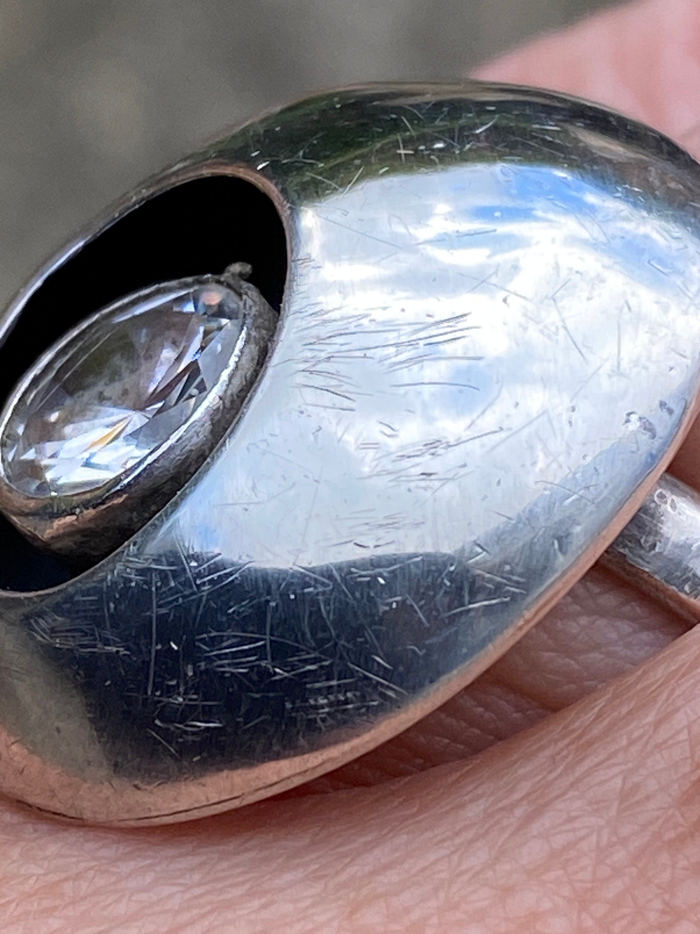 A striking ring in sterling silver set with a large Cubic Zirconia in a hollow domed setting. Polish makers marks and silver marks (indistinct) Light surface scratches Finger...
